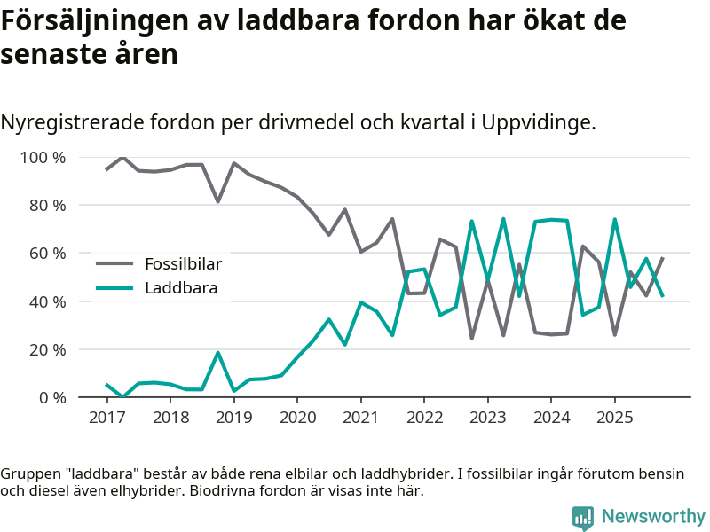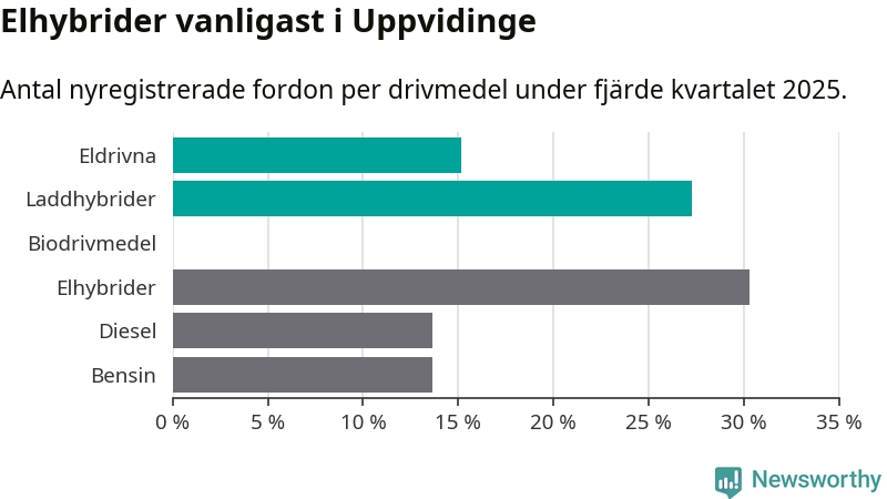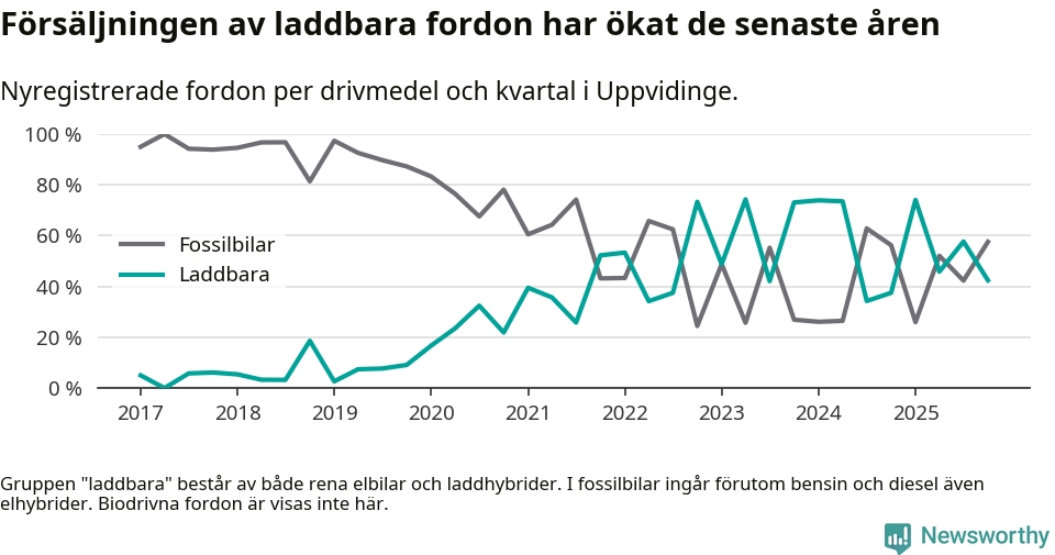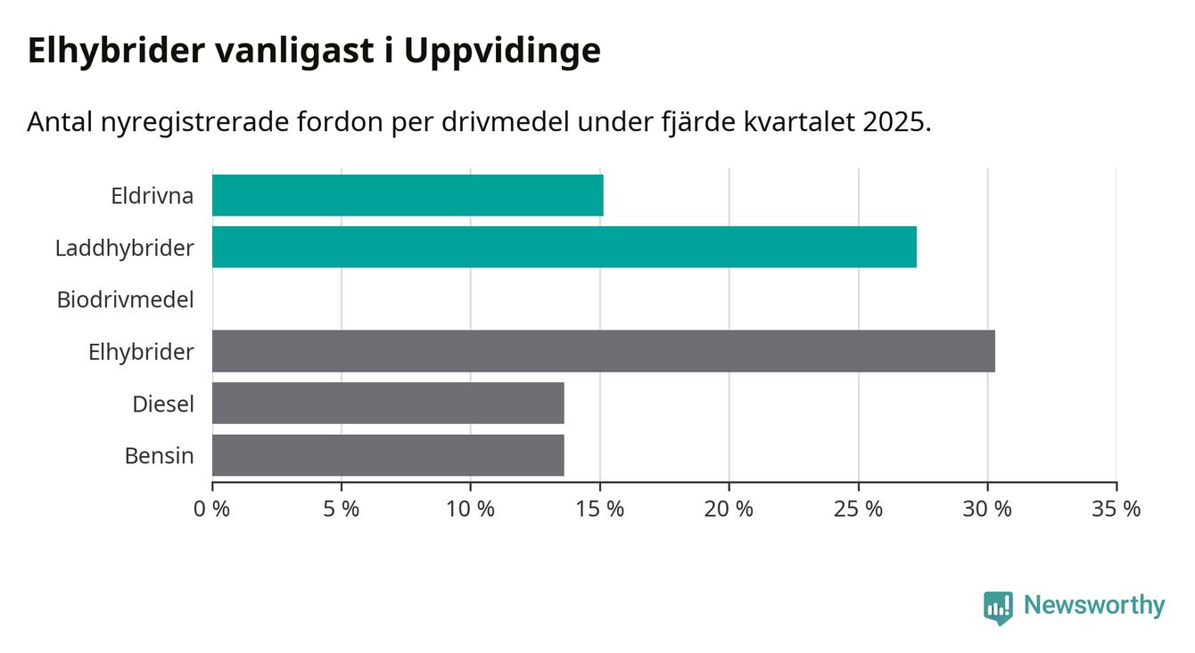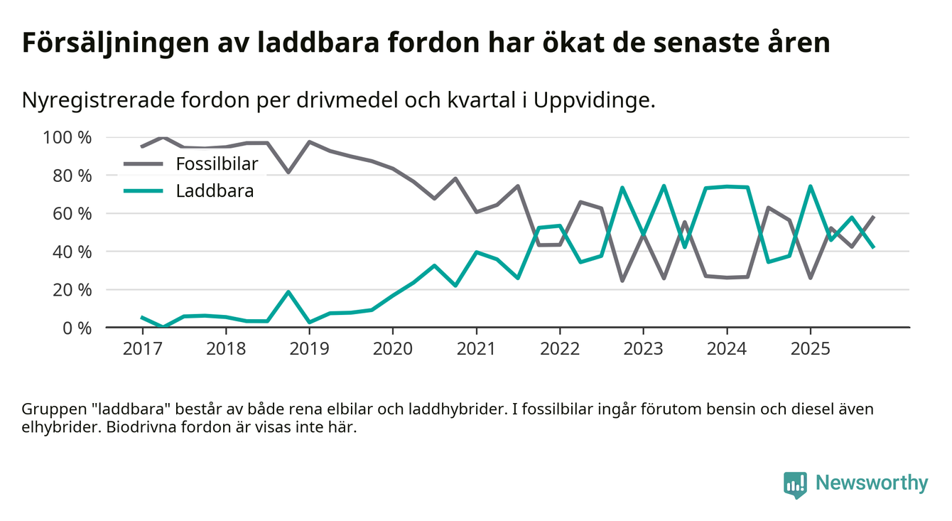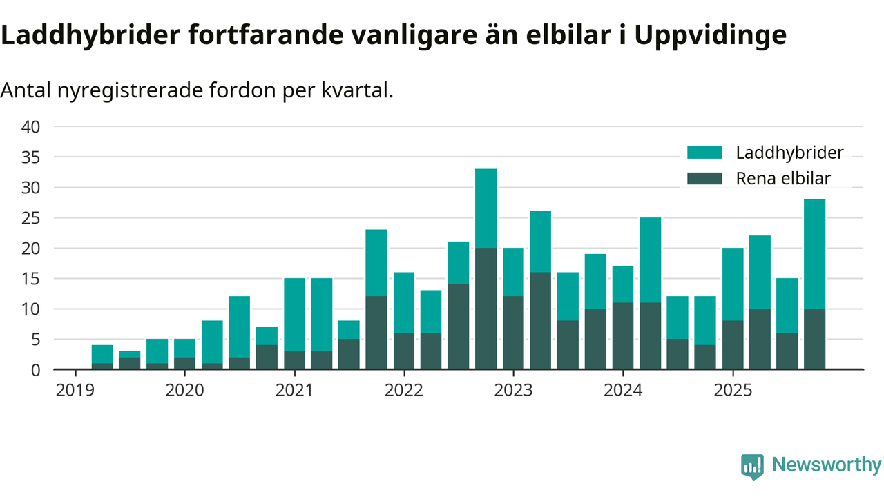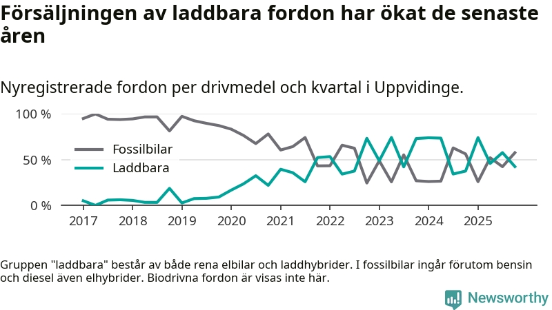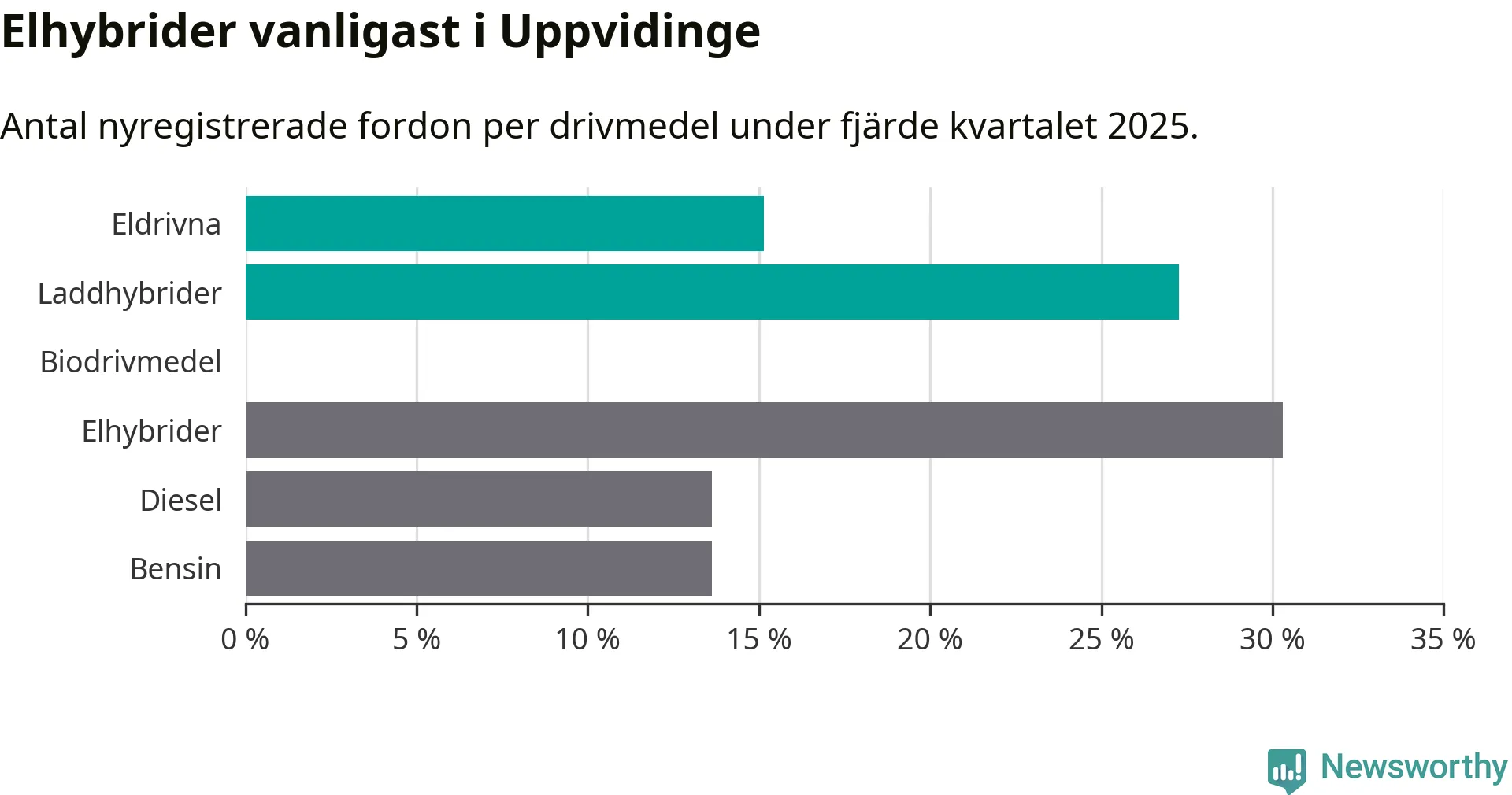 Under fjärde kvartalet 2025 var 42 procent av alla nyregistrerade personbilar i Uppvidinge laddbara (sammanlagt registrerades 66 nya bilar). Merparten av de laddbara bilarna var så kallade laddhybrider, det vill säga fordon som går att ladda och köra på el, men som även har en förbränningsmotor. 15 procent av alla nya bilar var rena elbilar.