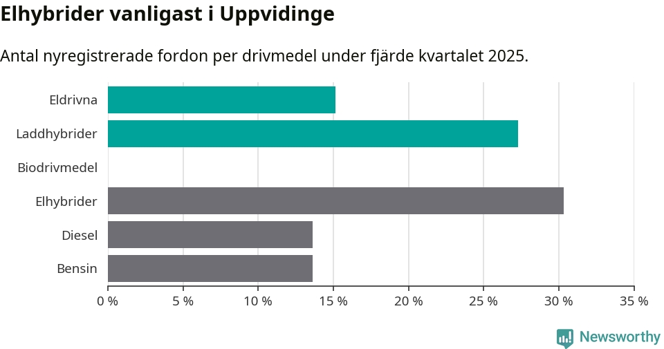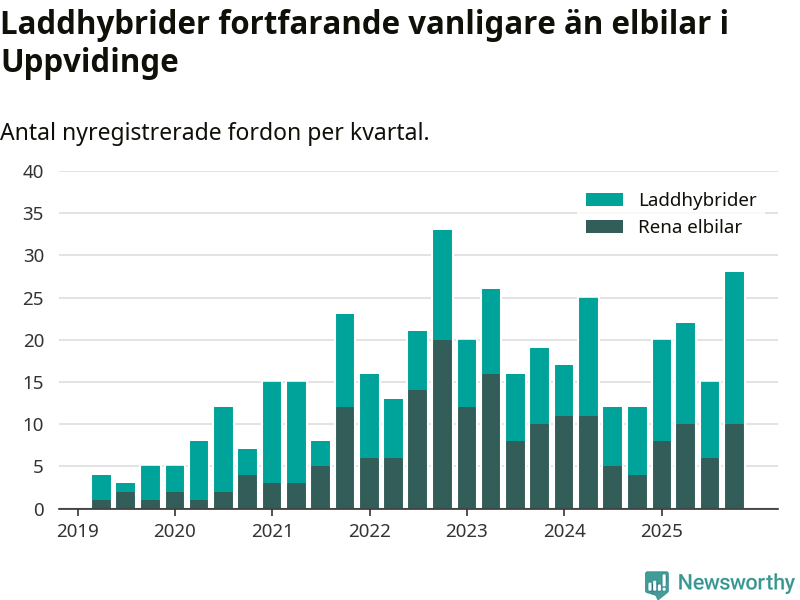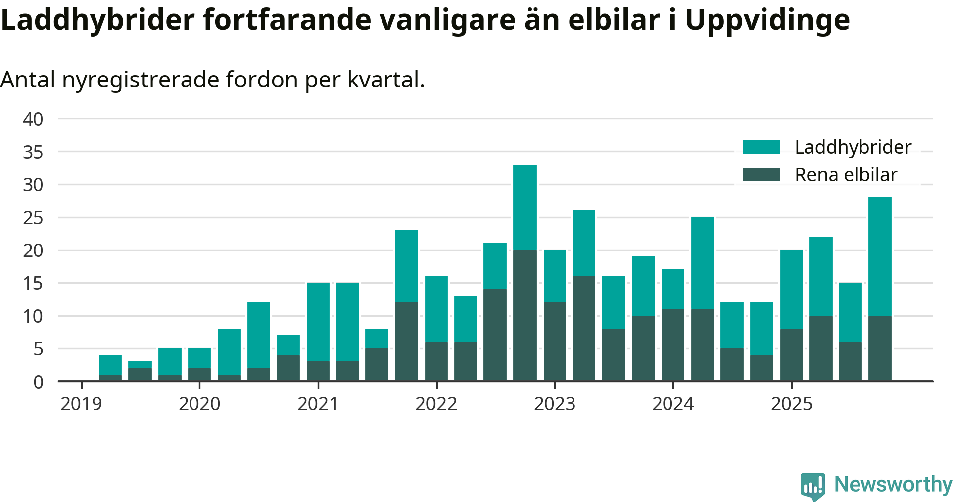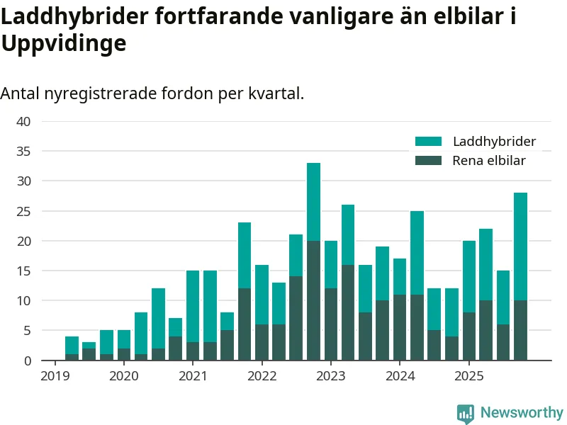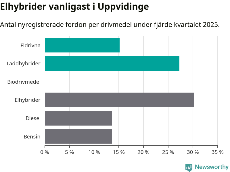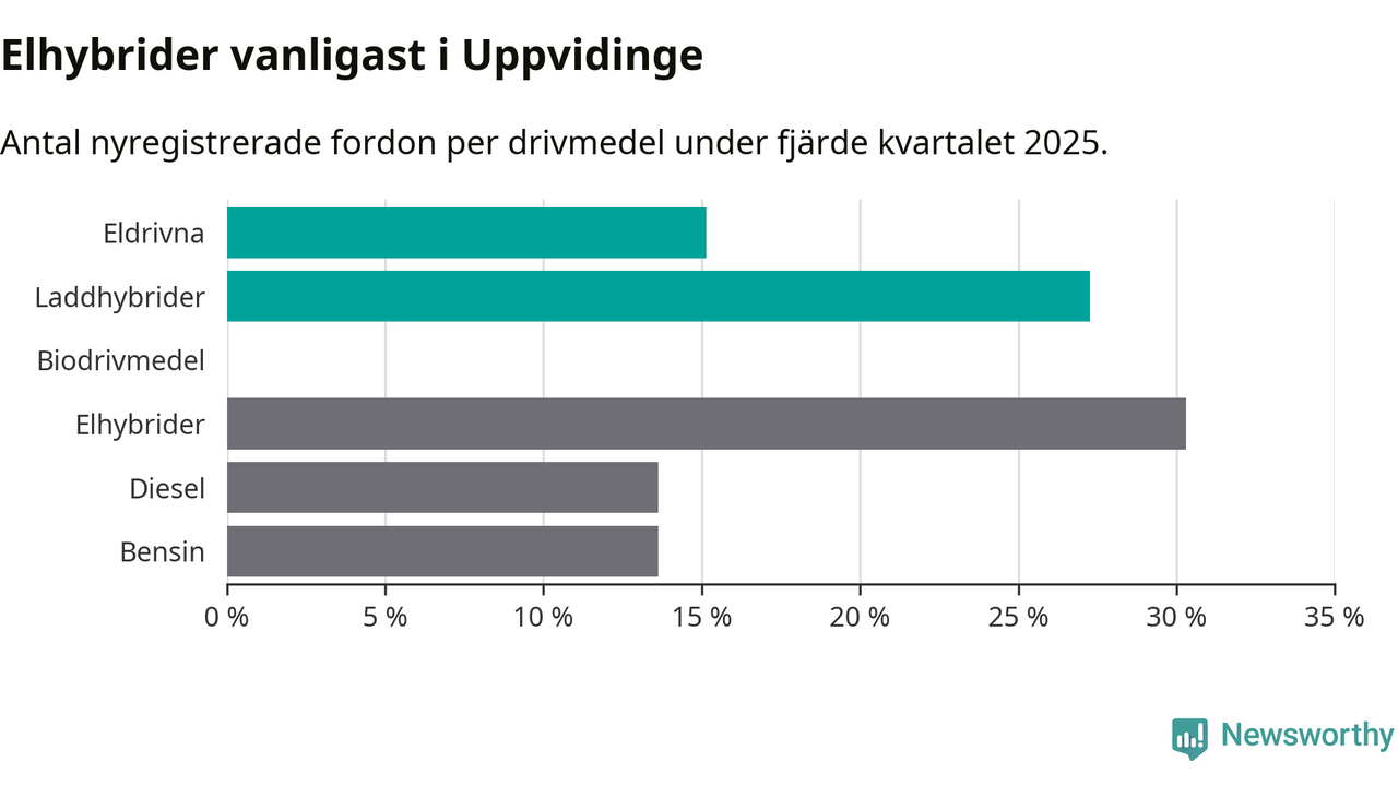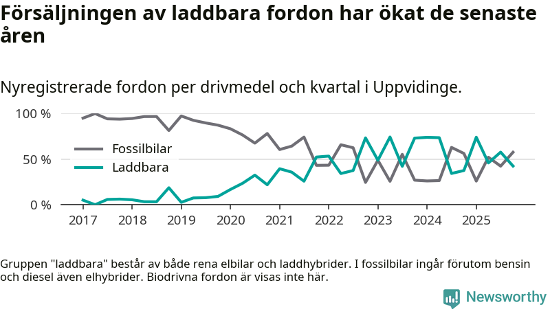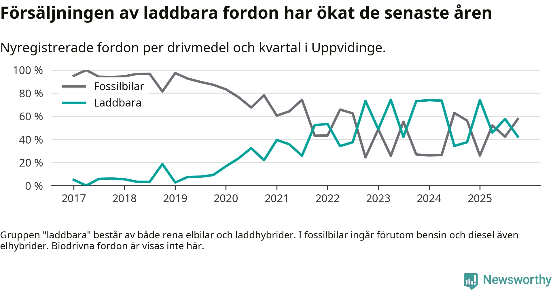 Under fjärde kvartalet 2025 var 42 procent av alla nyregistrerade personbilar i Uppvidinge laddbara (sammanlagt registrerades 66 nya bilar). Merparten av de laddbara bilarna var så kallade laddhybrider, det vill säga fordon som går att ladda och köra på el, men som även har en förbränningsmotor. 15 procent av alla nya bilar var rena elbilar.