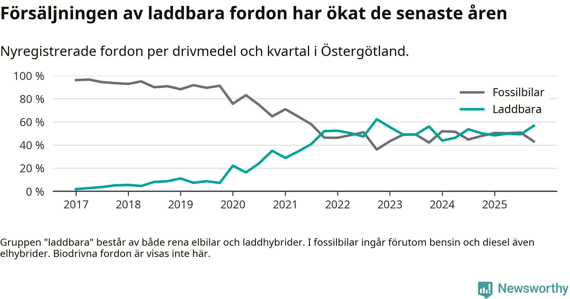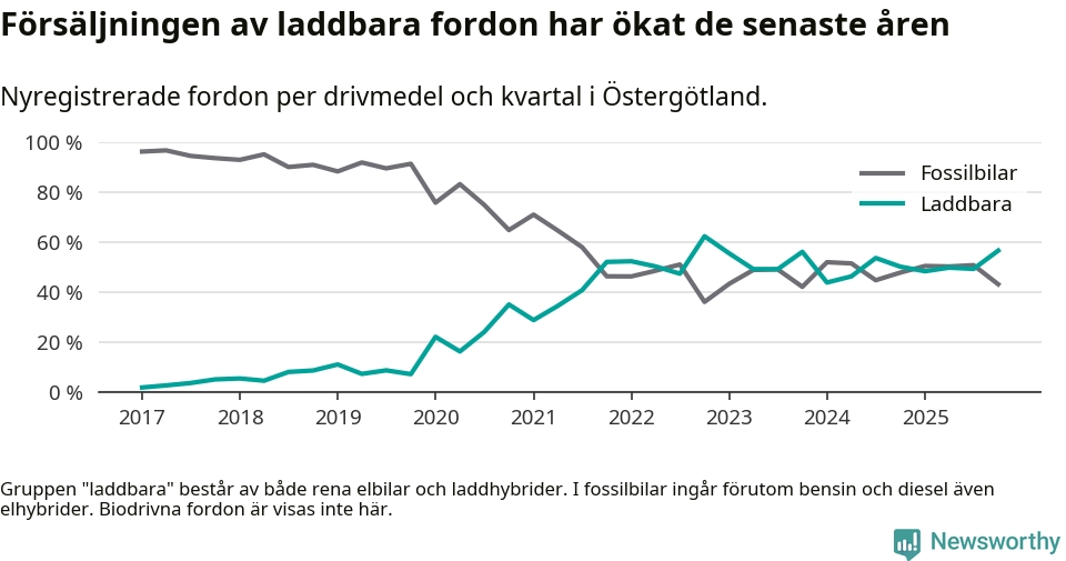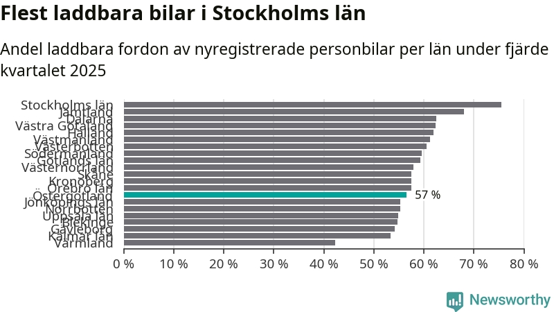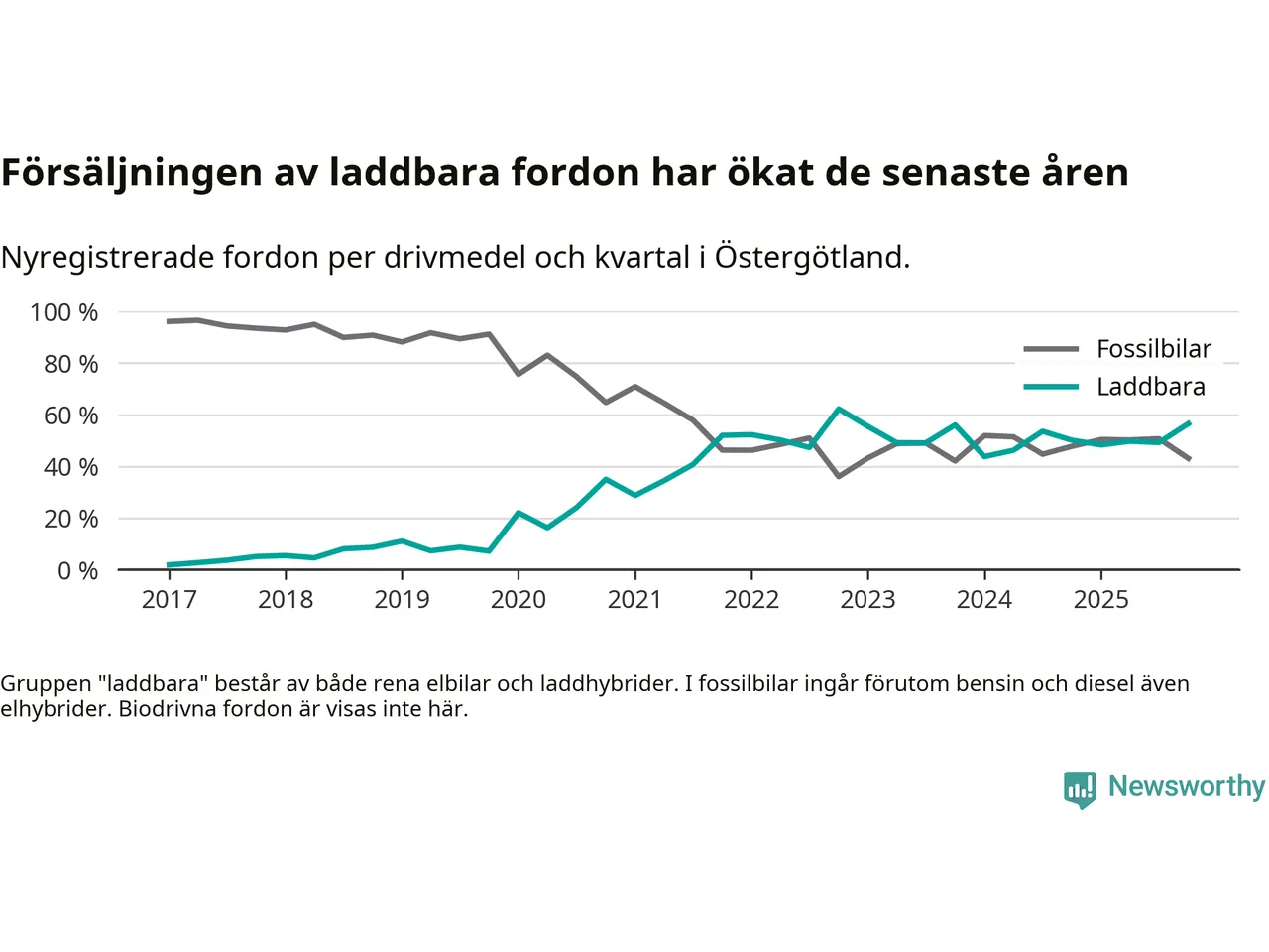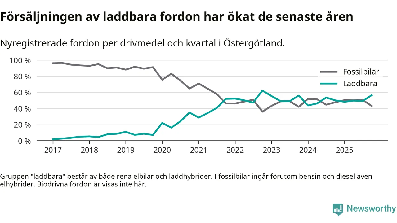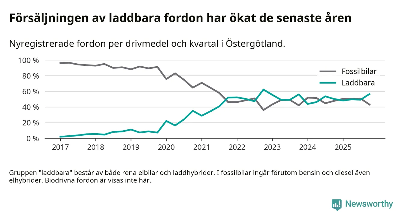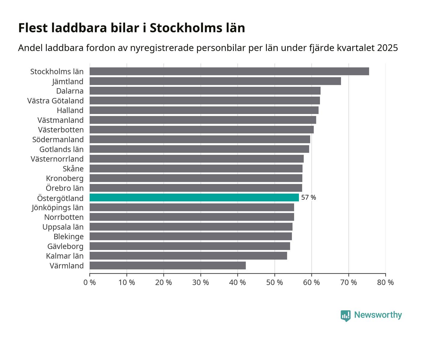 Under fjärde kvartalet 2025 var 57 procent av alla nyregistrerade personbilar i Östergötland laddbara (sammanlagt registrerades 2 322 nya bilar). Merparten av de laddbara bilarna var rena elbilar (33 procent av alla).