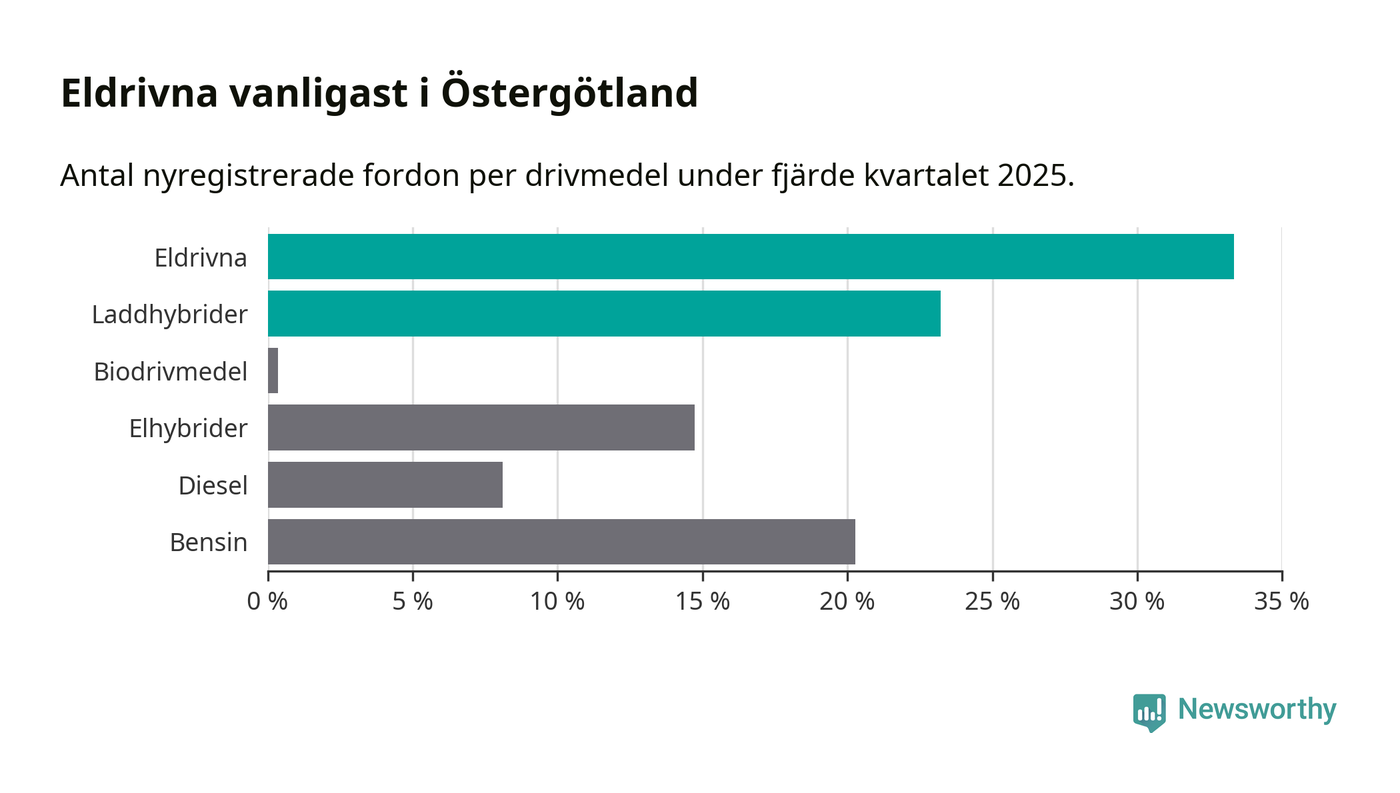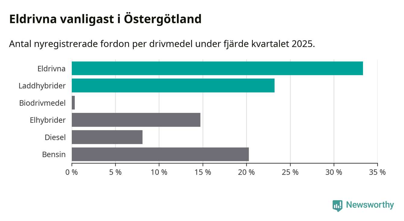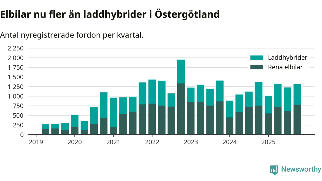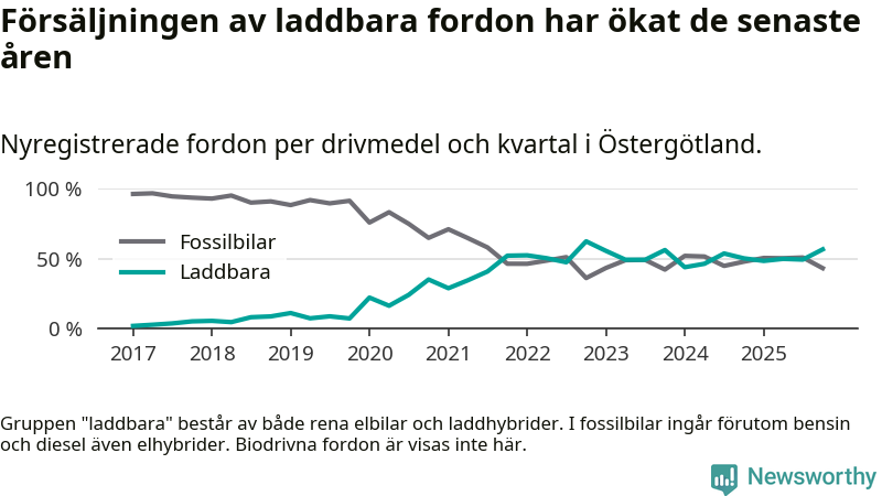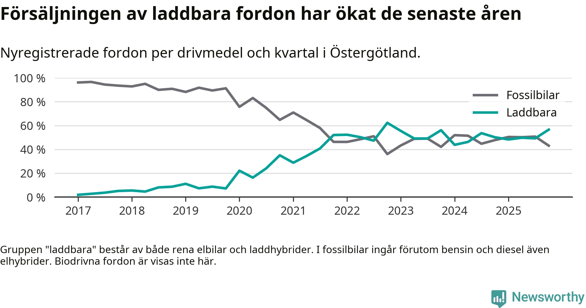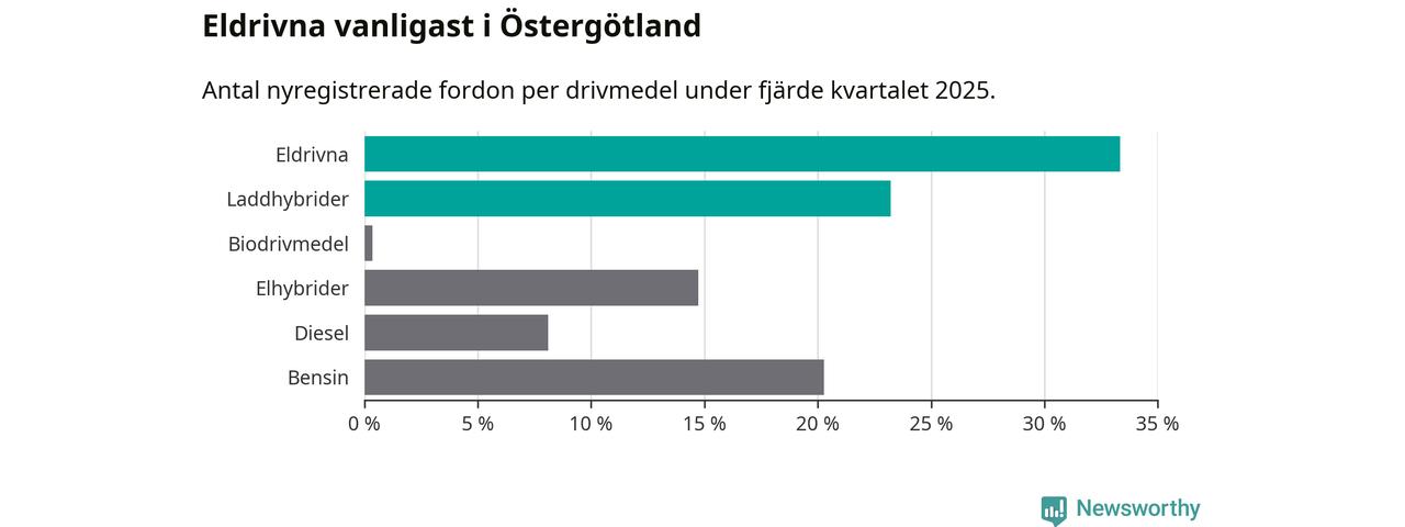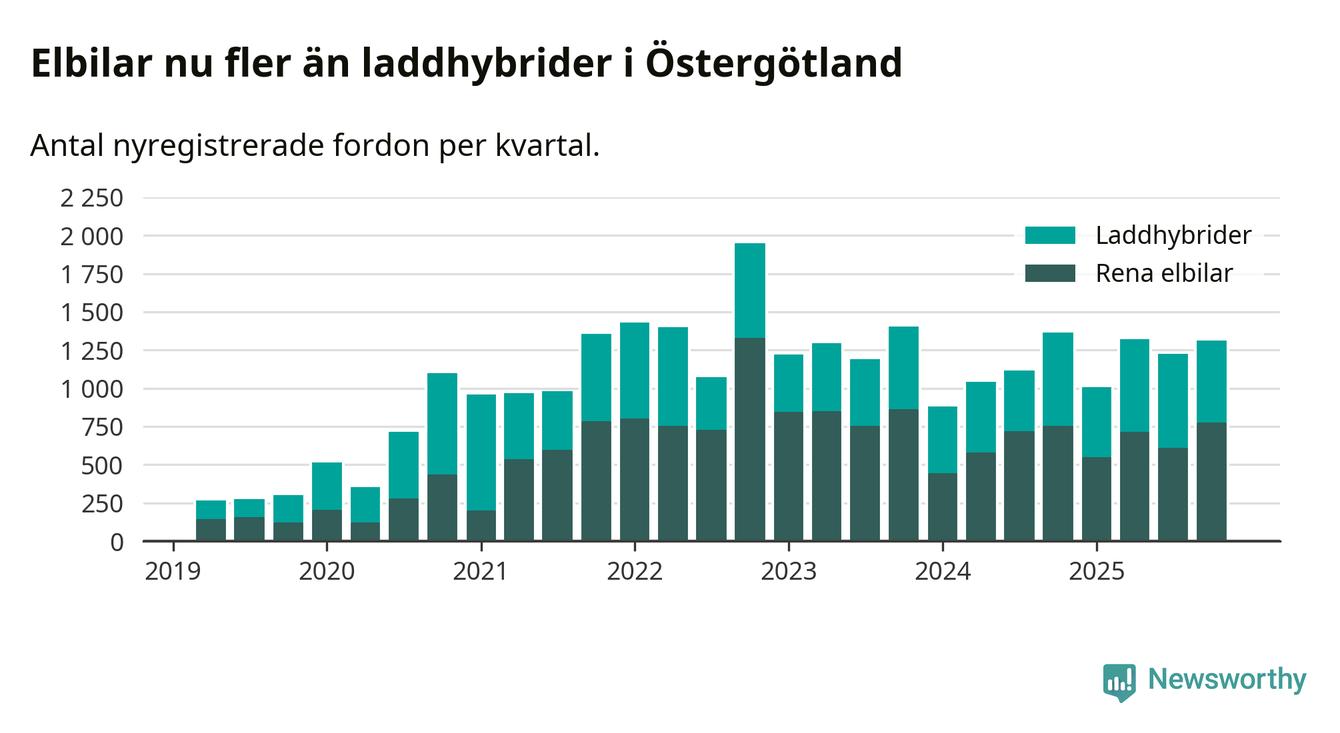 Under fjärde kvartalet 2025 var 57 procent av alla nyregistrerade personbilar i Östergötland laddbara (sammanlagt registrerades 2 322 nya bilar). Merparten av de laddbara bilarna var rena elbilar (33 procent av alla).