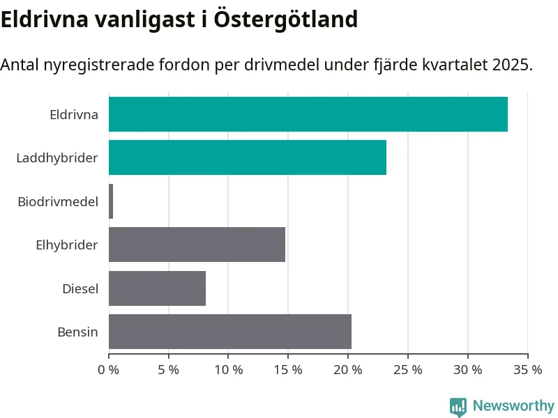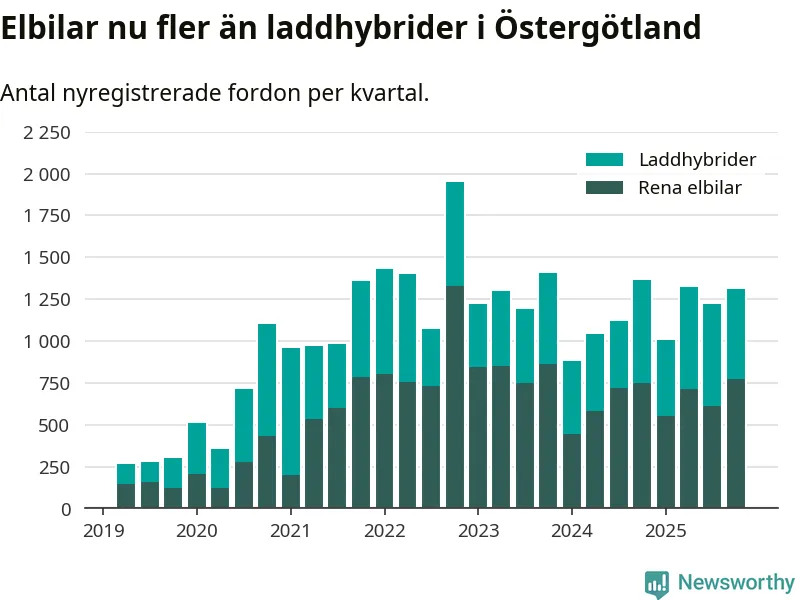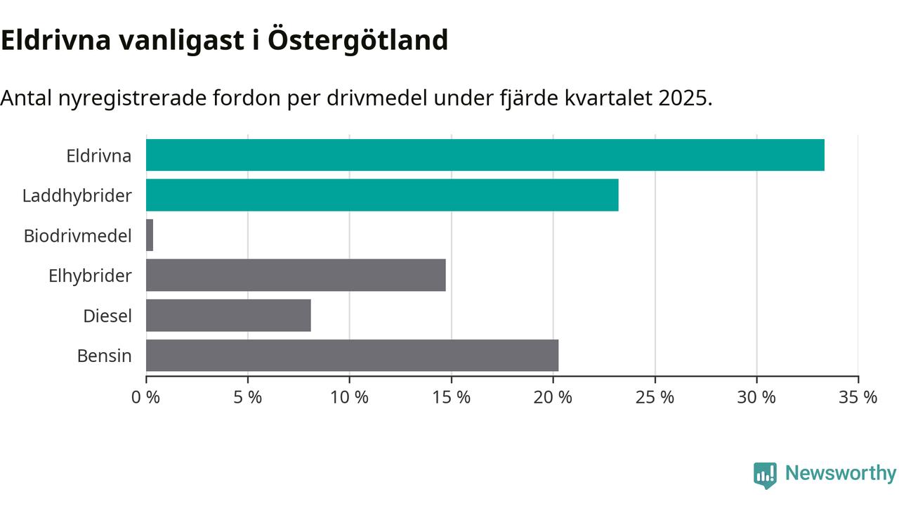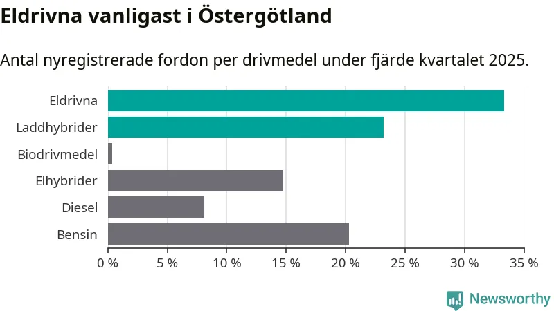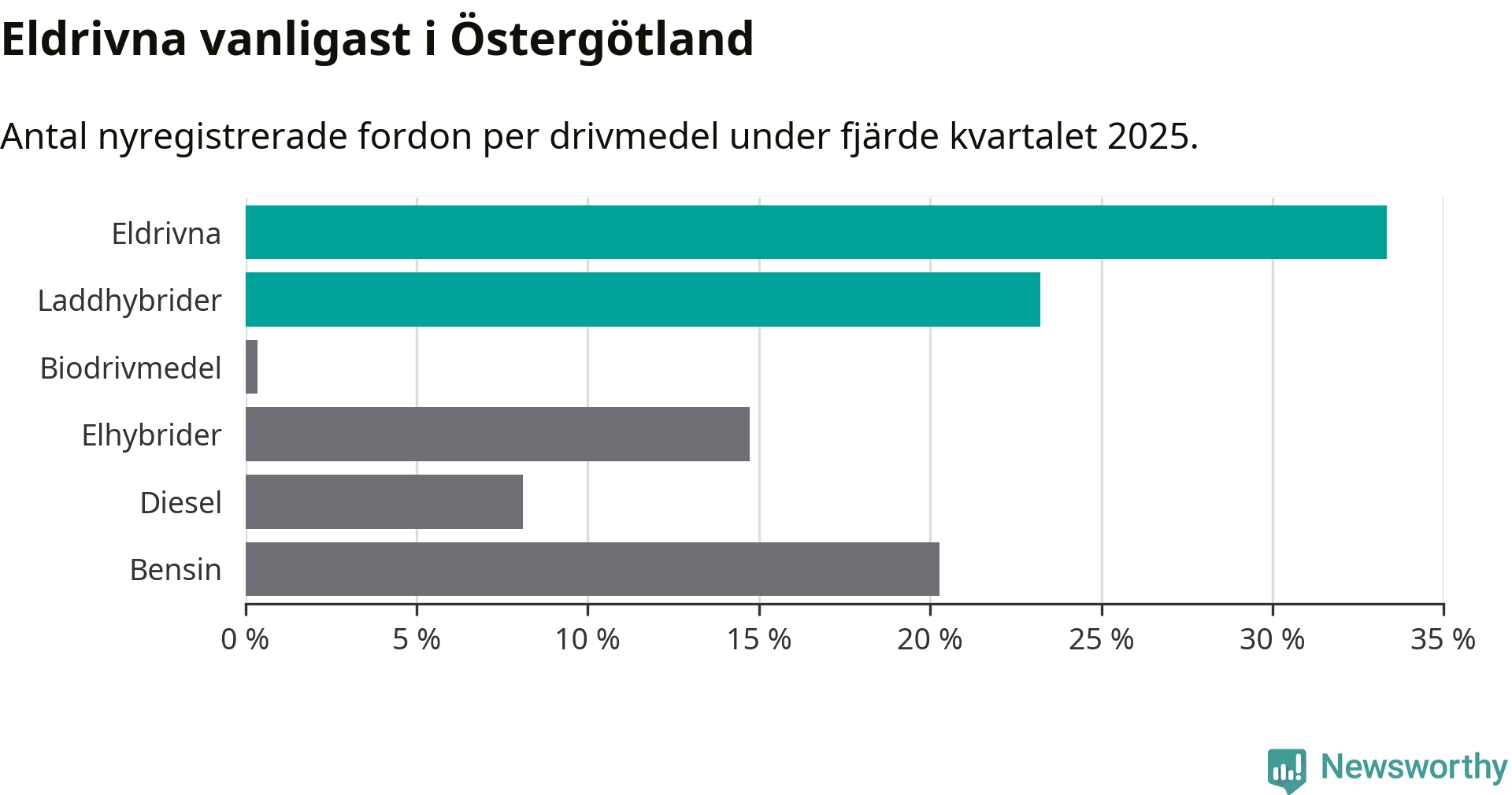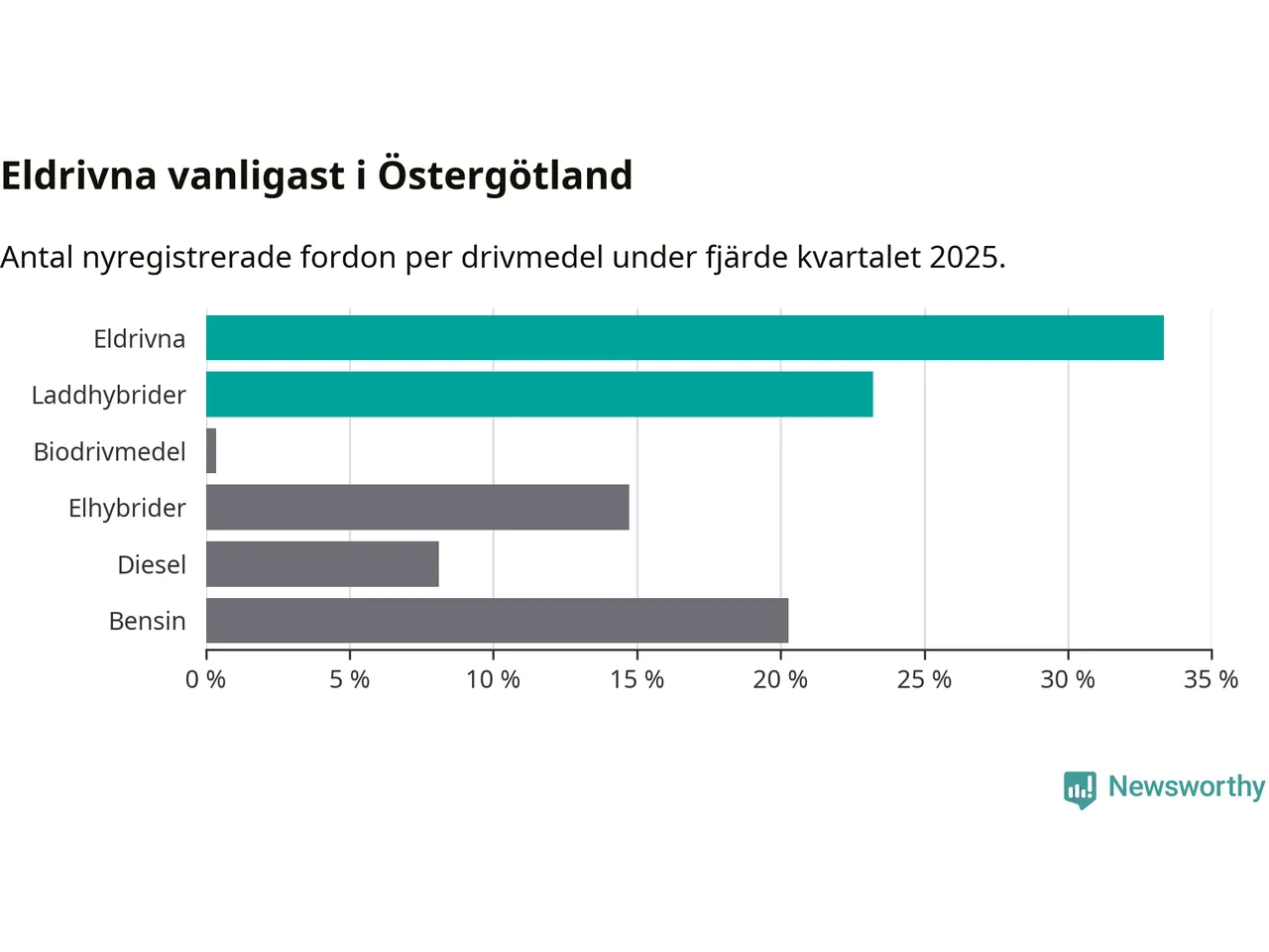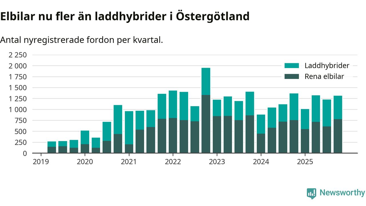 Under fjärde kvartalet 2025 var 57 procent av alla nyregistrerade personbilar i Östergötland laddbara (sammanlagt registrerades 2 322 nya bilar). Merparten av de laddbara bilarna var rena elbilar (33 procent av alla).