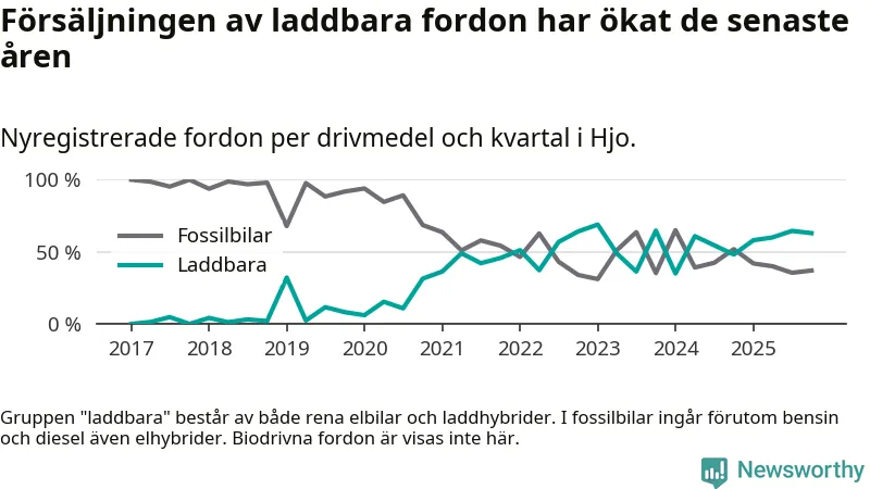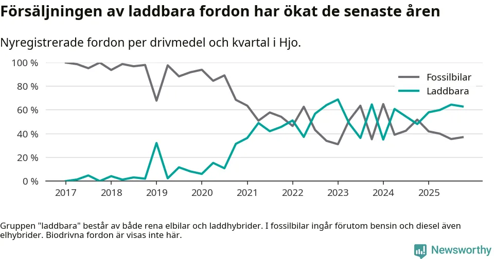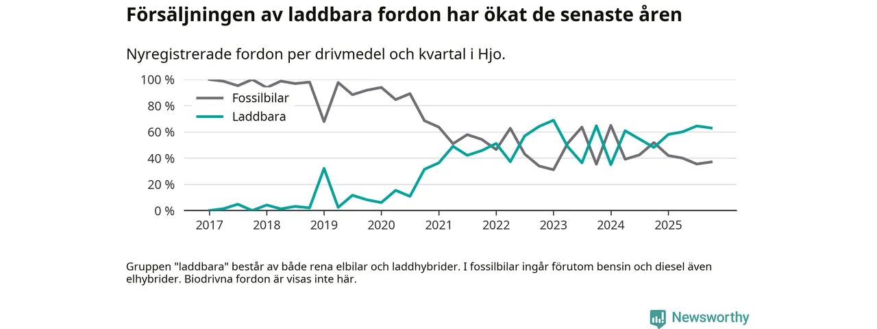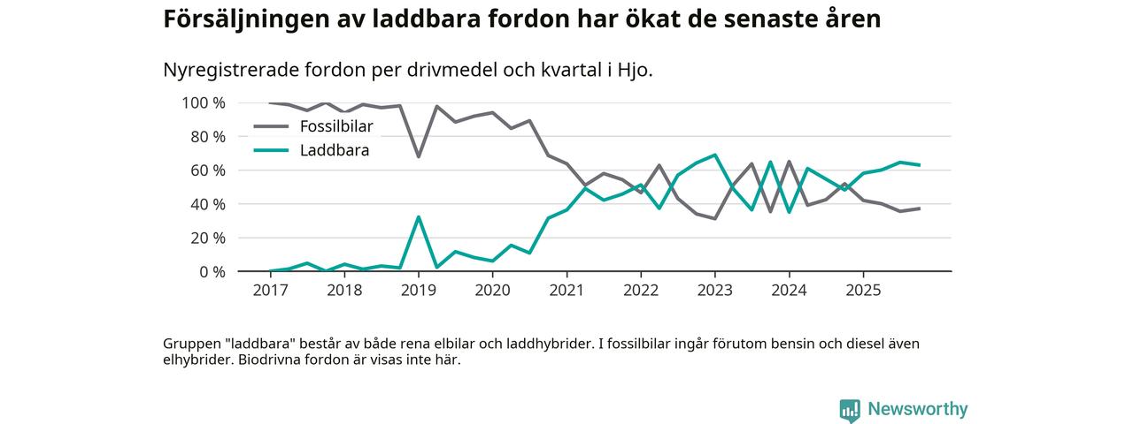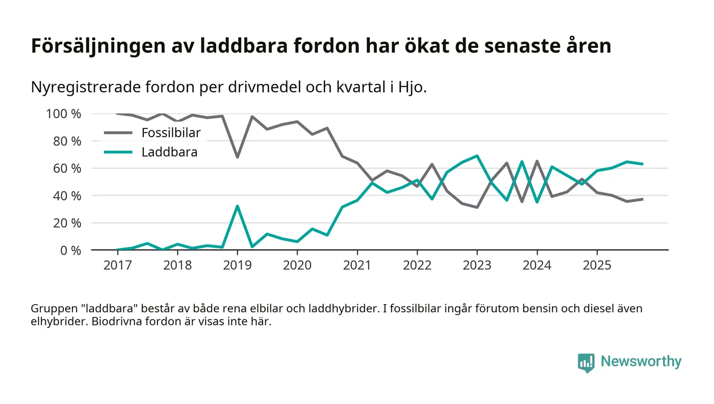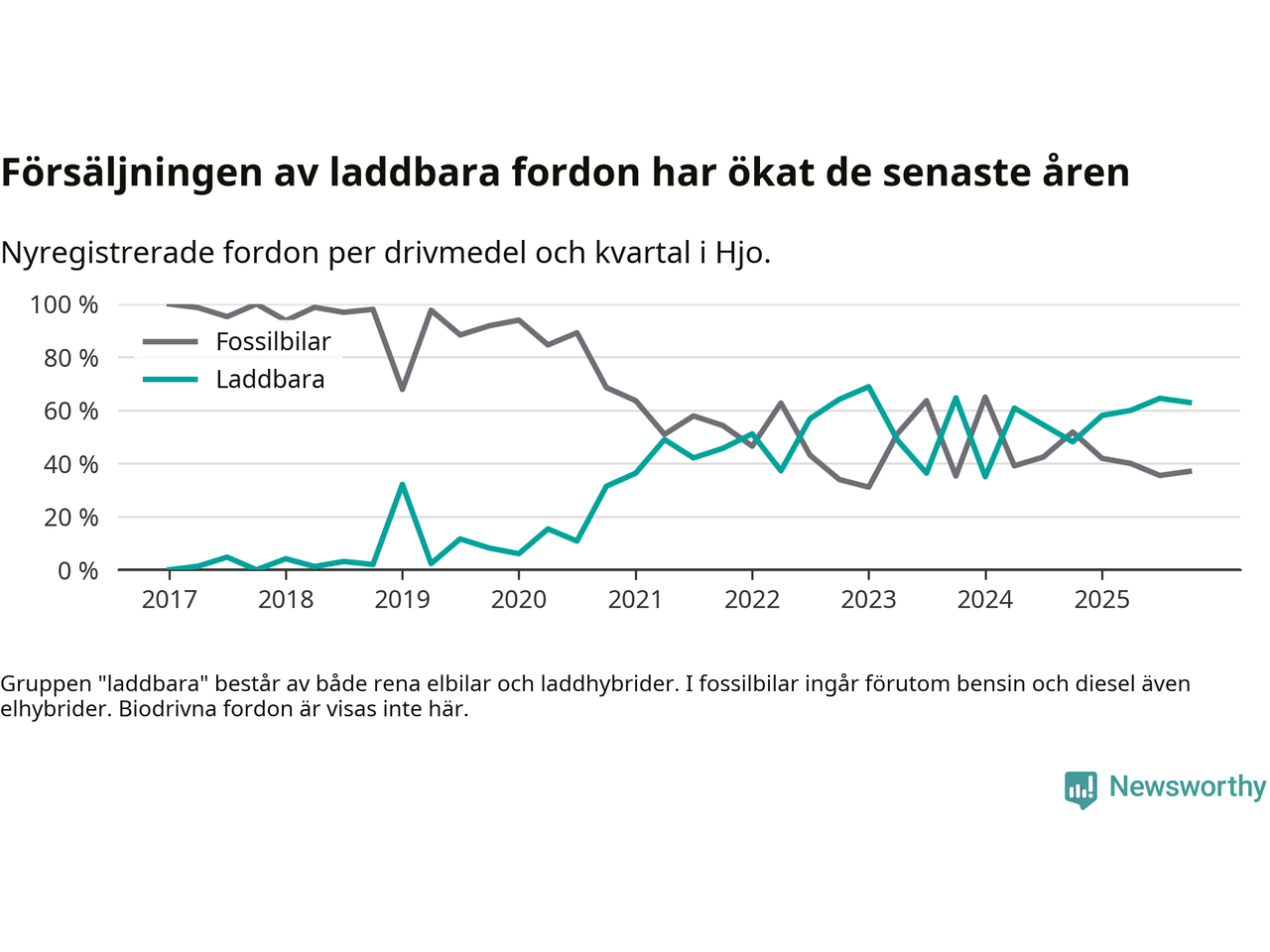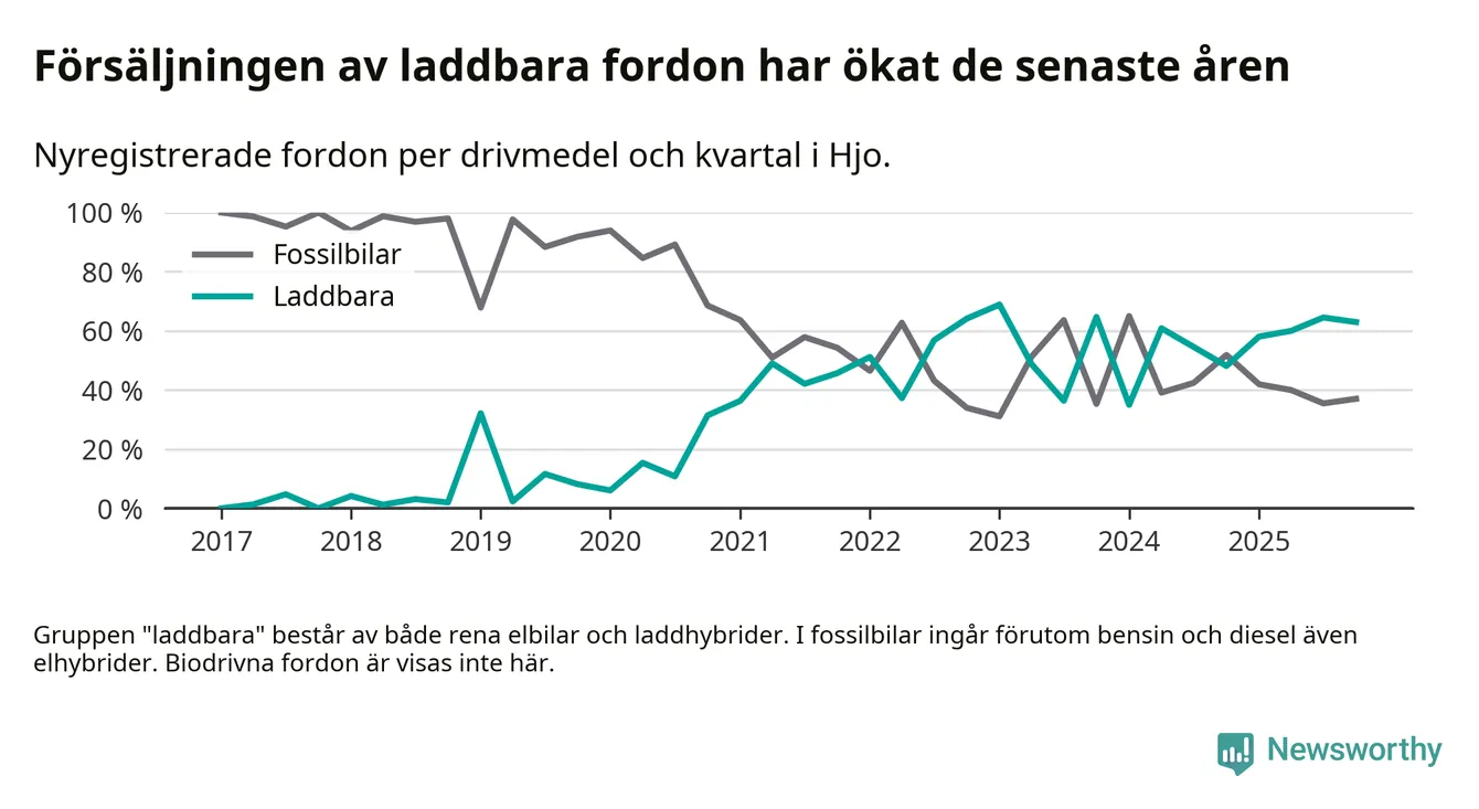 Under fjärde kvartalet 2025 var 63 procent av alla nyregistrerade personbilar i Hjo laddbara (sammanlagt registrerades 54 nya bilar). Merparten av de laddbara bilarna var rena elbilar (33 procent av alla).