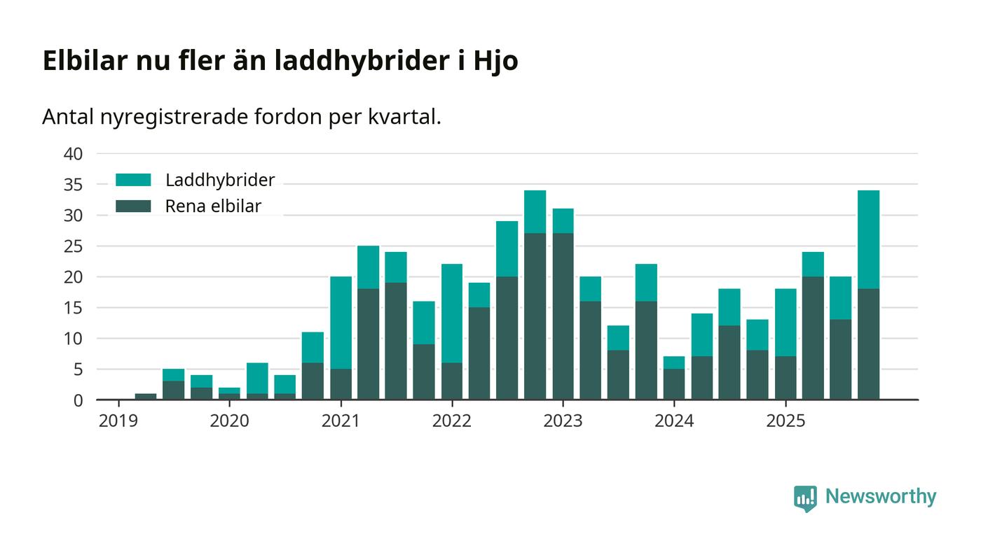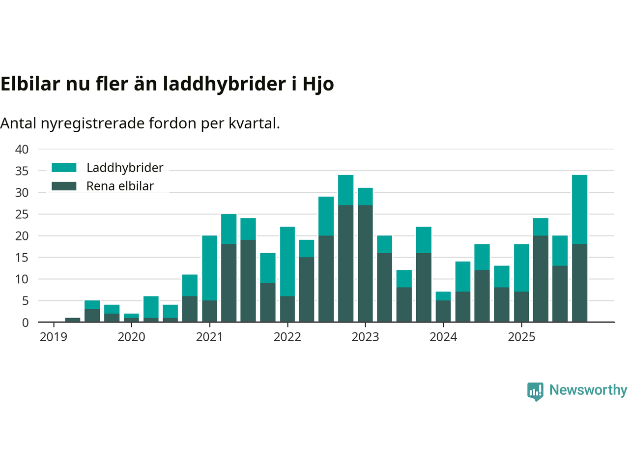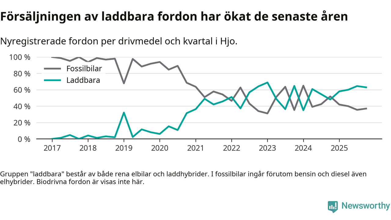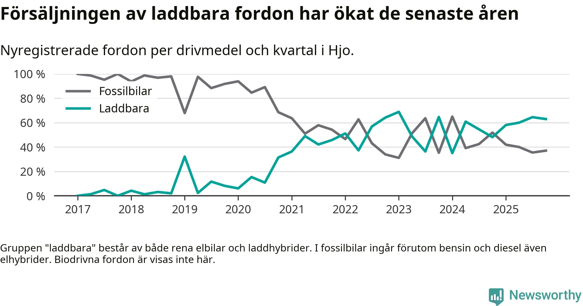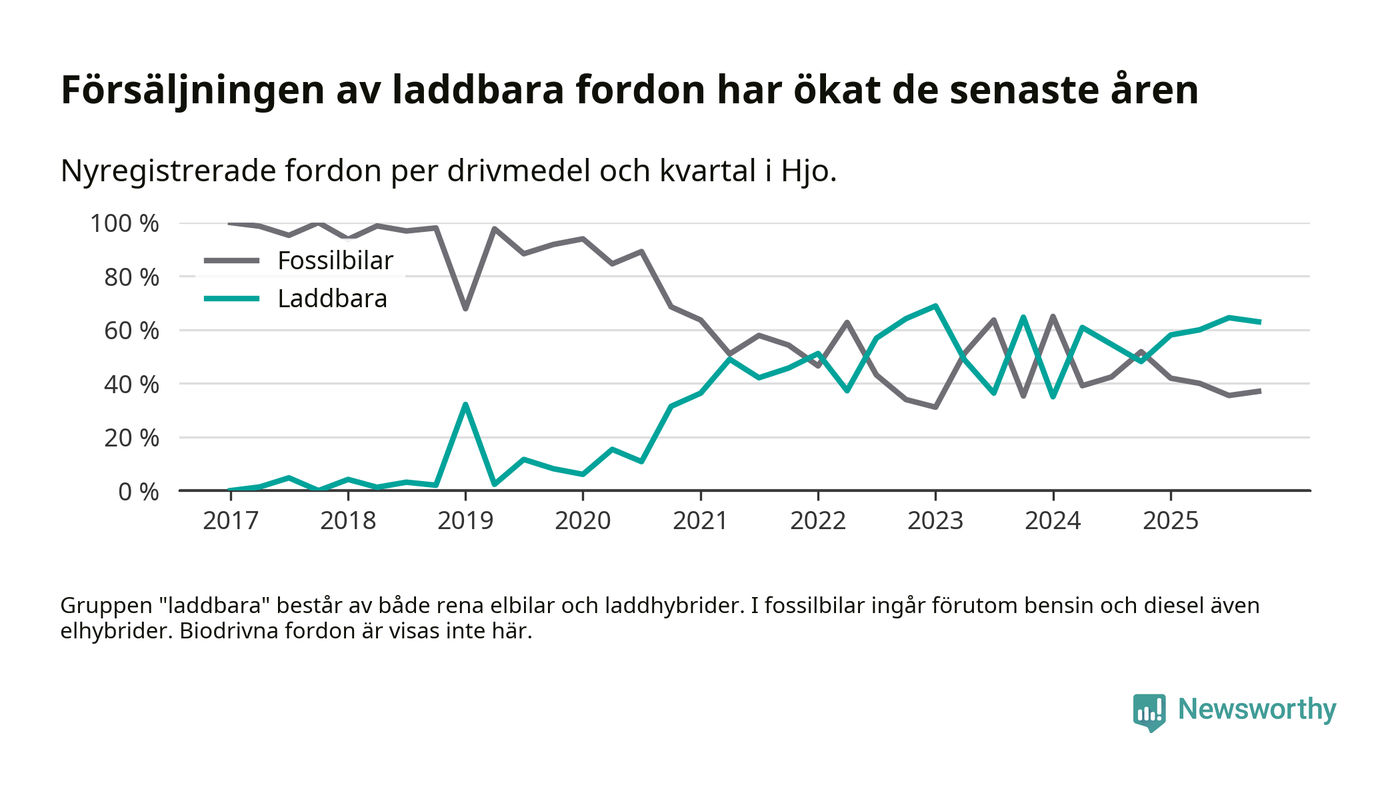 Under fjärde kvartalet 2025 var 63 procent av alla nyregistrerade personbilar i Hjo laddbara (sammanlagt registrerades 54 nya bilar). Merparten av de laddbara bilarna var rena elbilar (33 procent av alla).