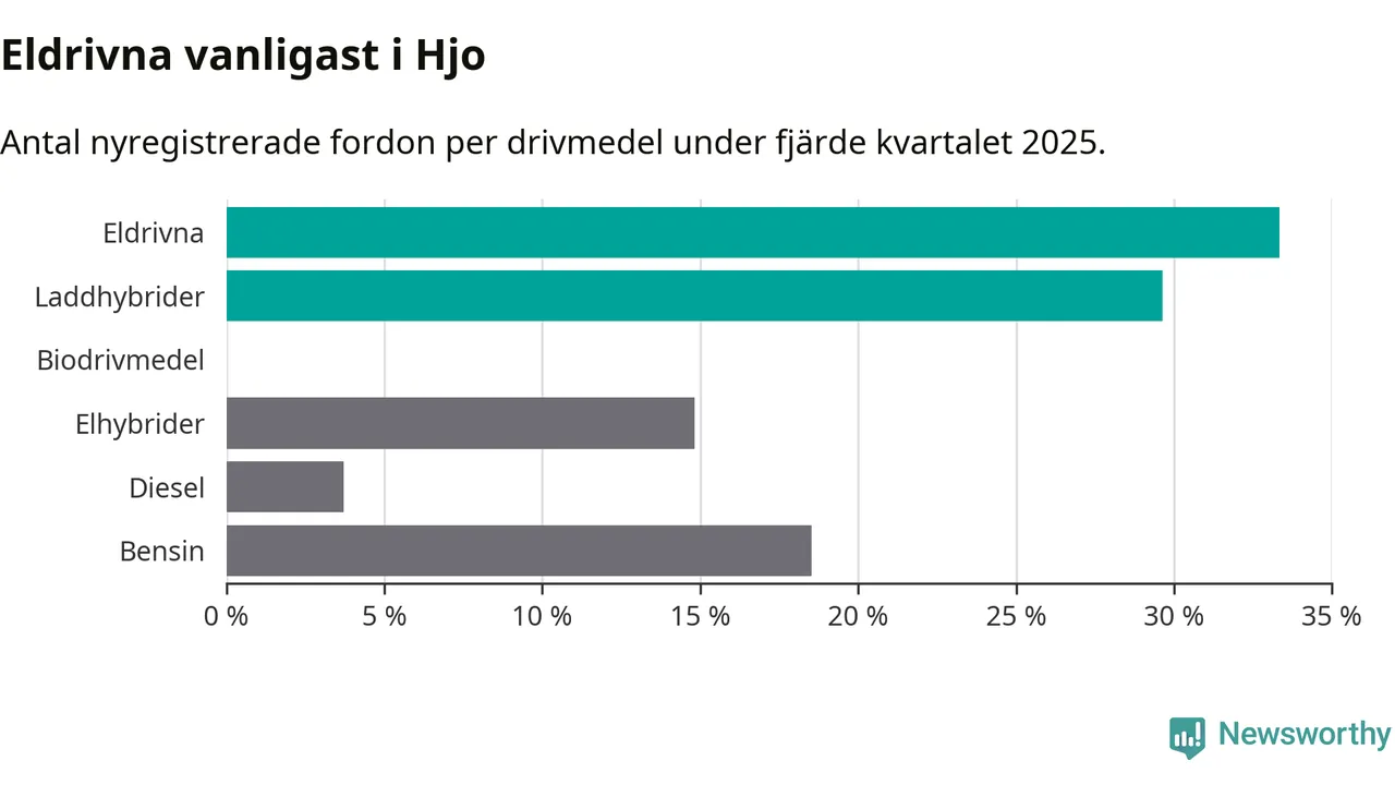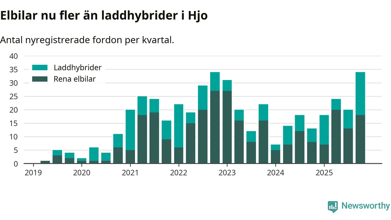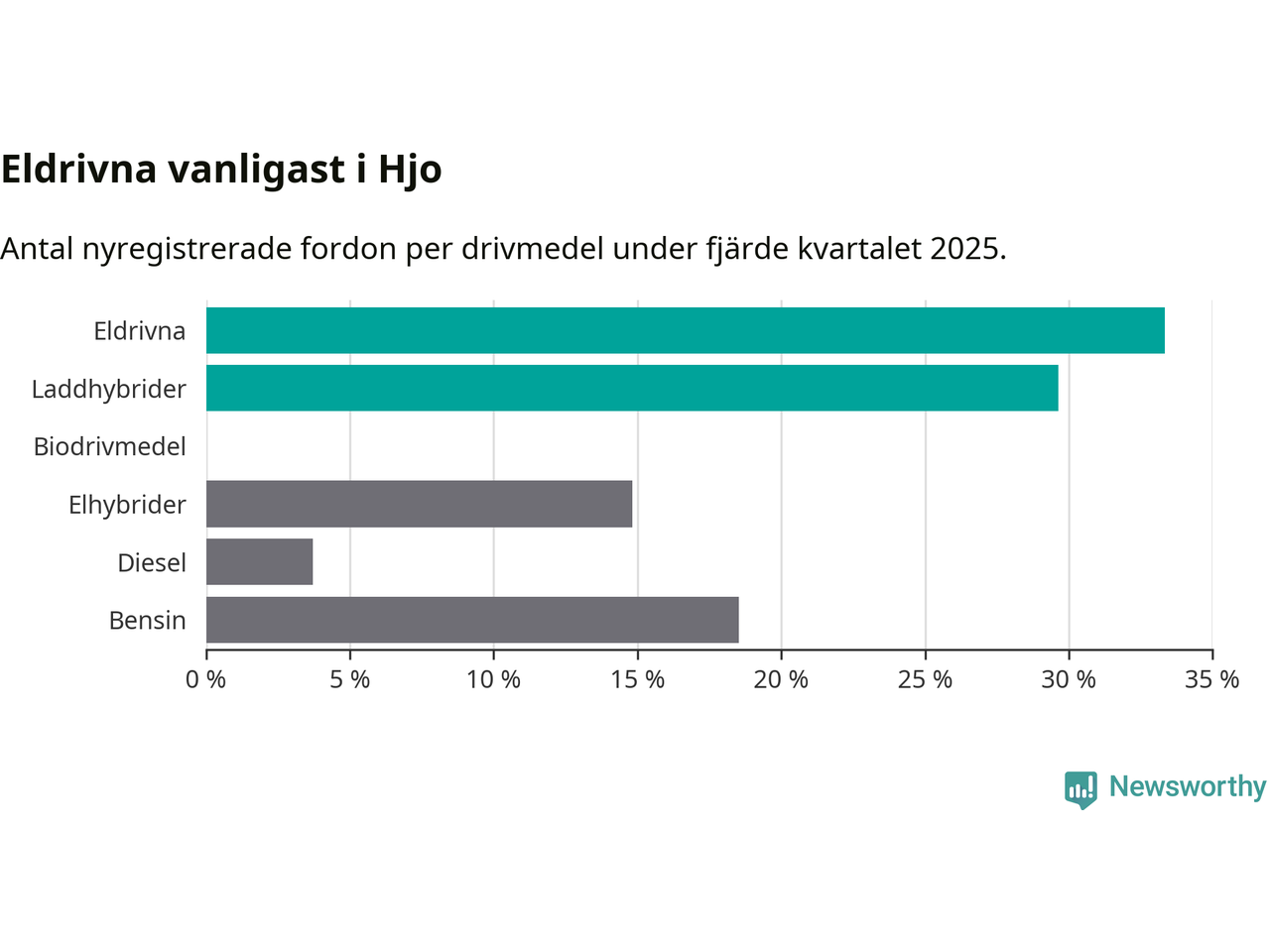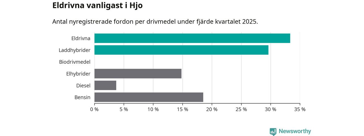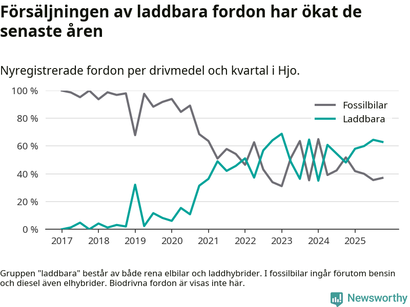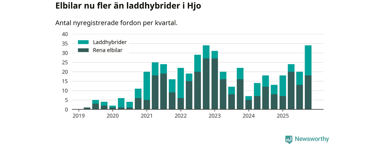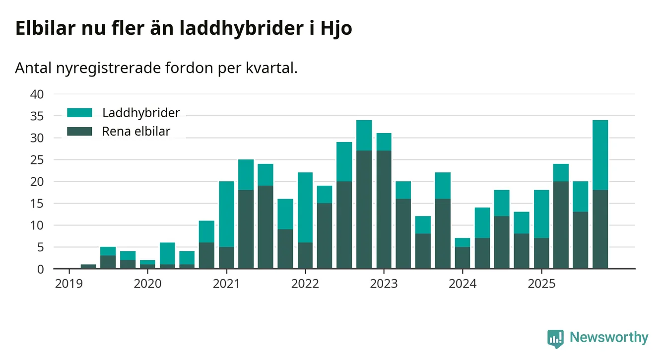 Under fjärde kvartalet 2025 var 63 procent av alla nyregistrerade personbilar i Hjo laddbara (sammanlagt registrerades 54 nya bilar). Merparten av de laddbara bilarna var rena elbilar (33 procent av alla).