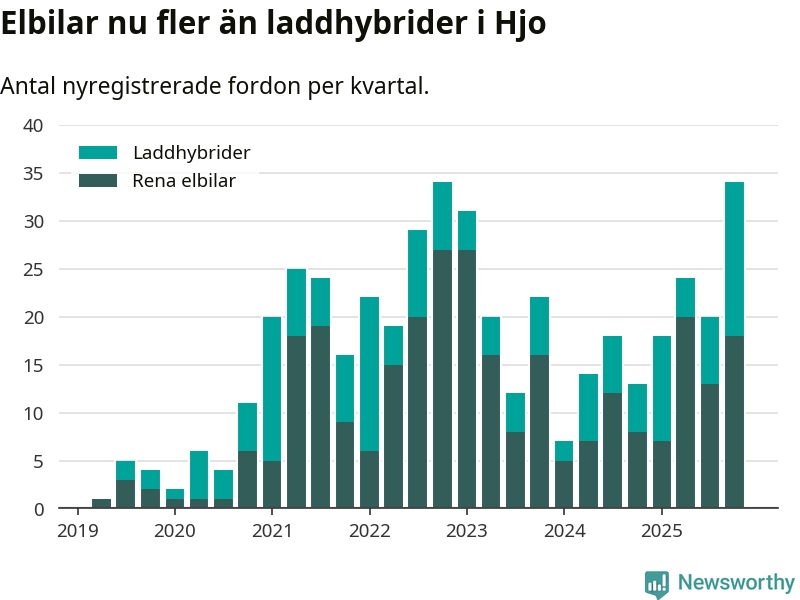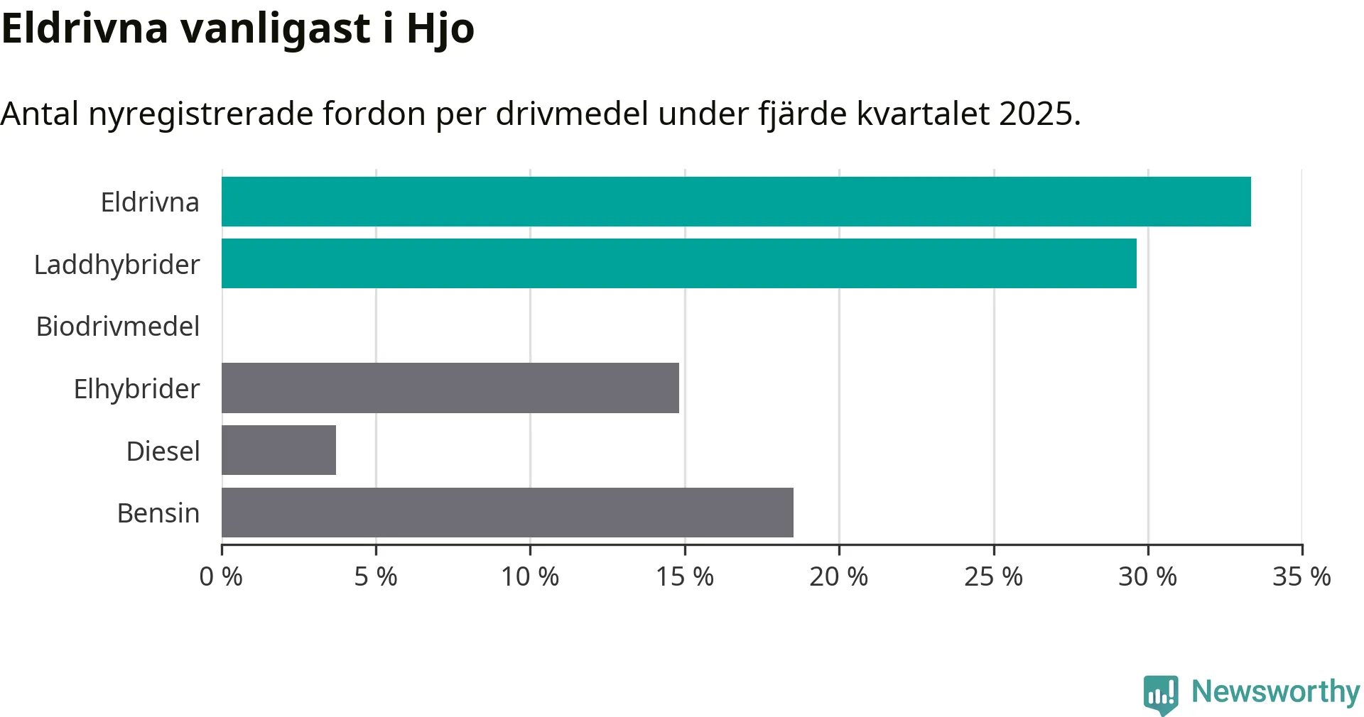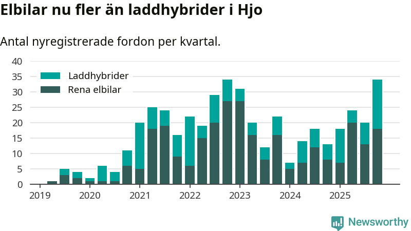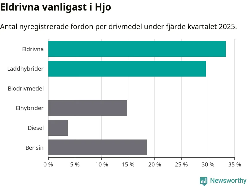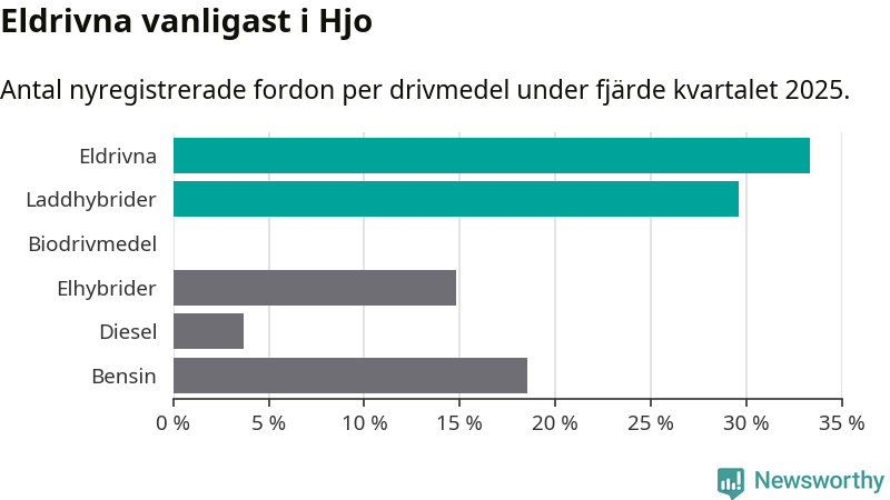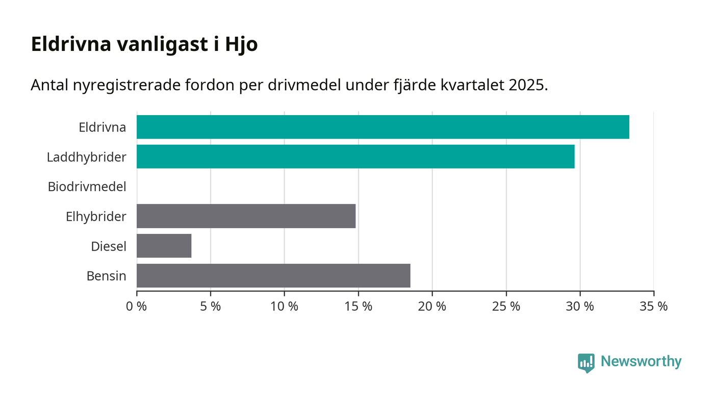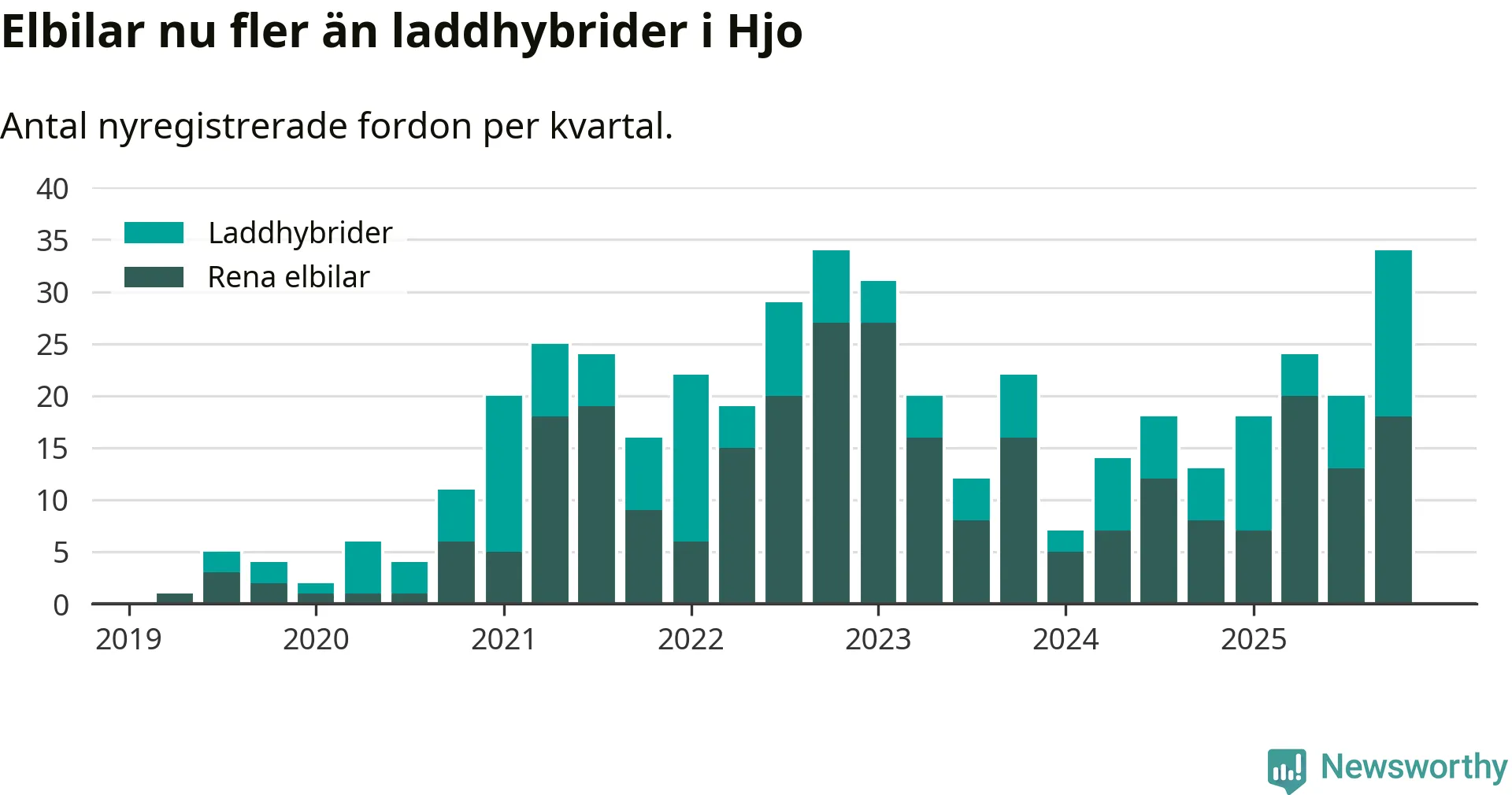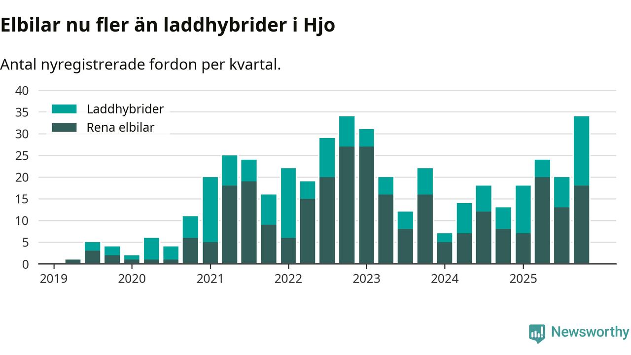 Under fjärde kvartalet 2025 var 63 procent av alla nyregistrerade personbilar i Hjo laddbara (sammanlagt registrerades 54 nya bilar). Merparten av de laddbara bilarna var rena elbilar (33 procent av alla).