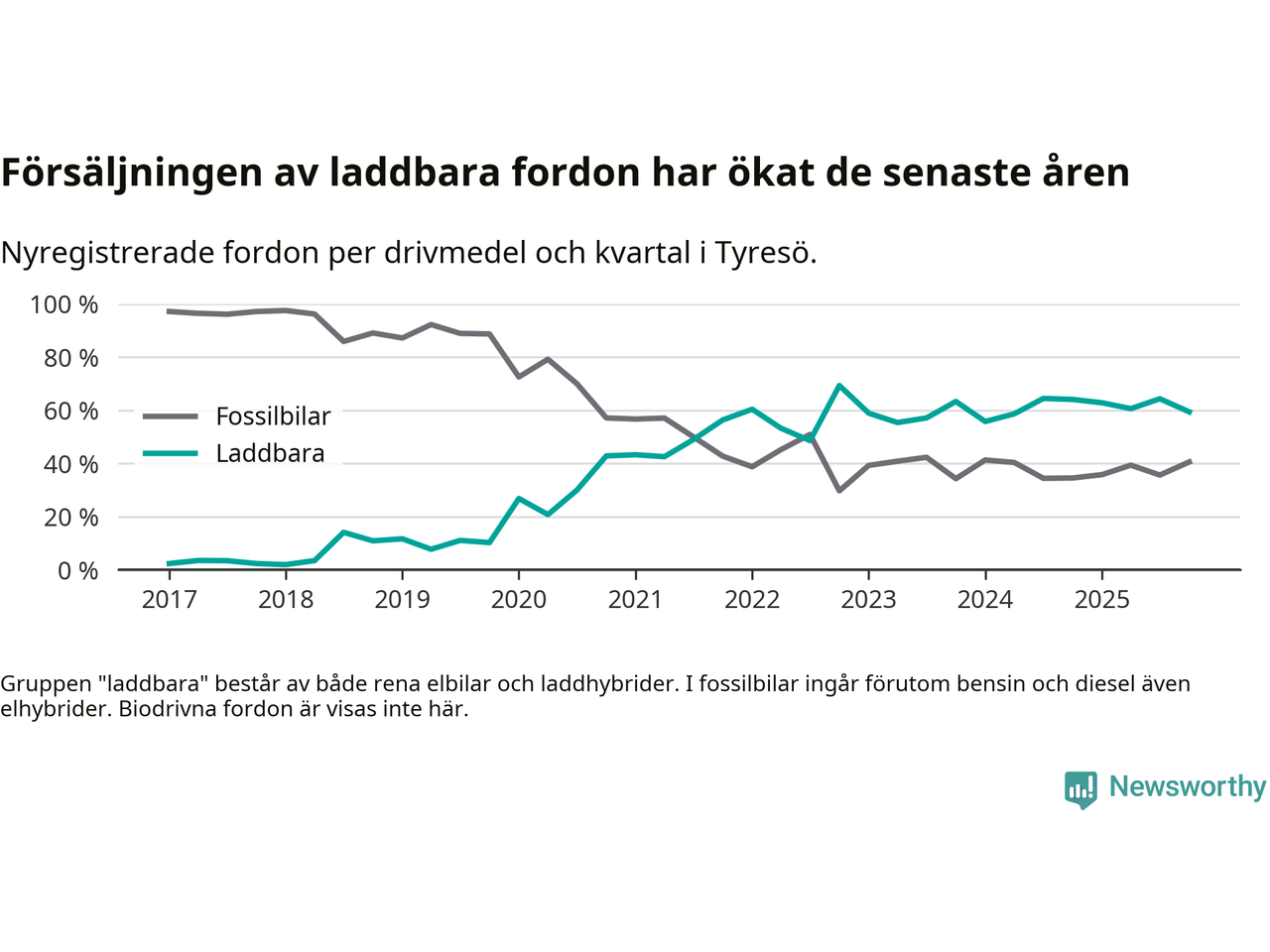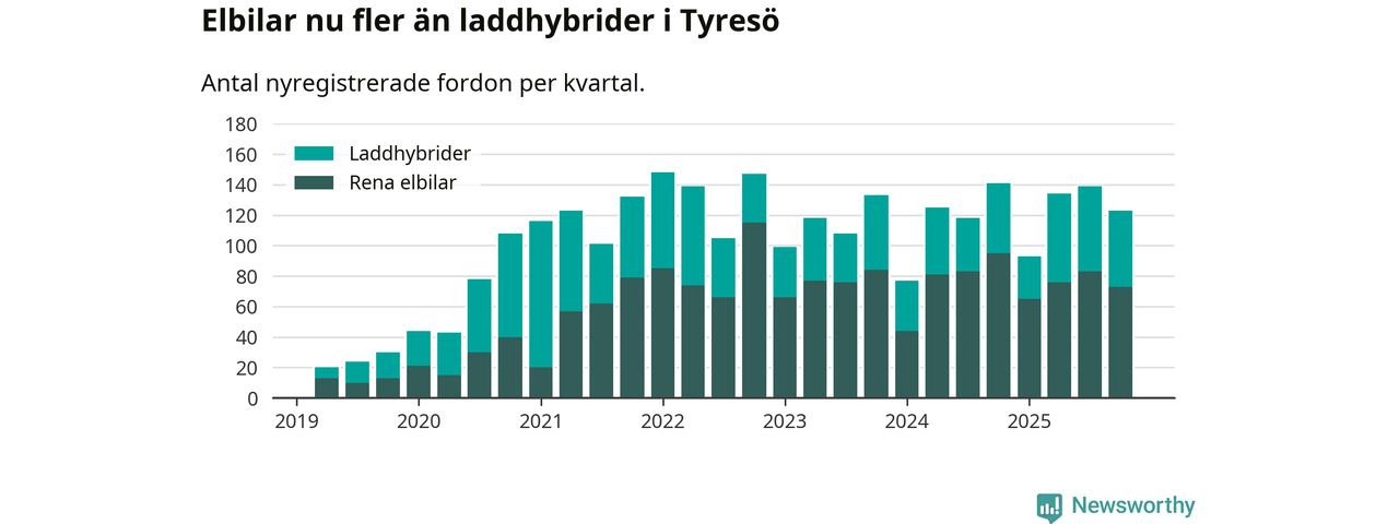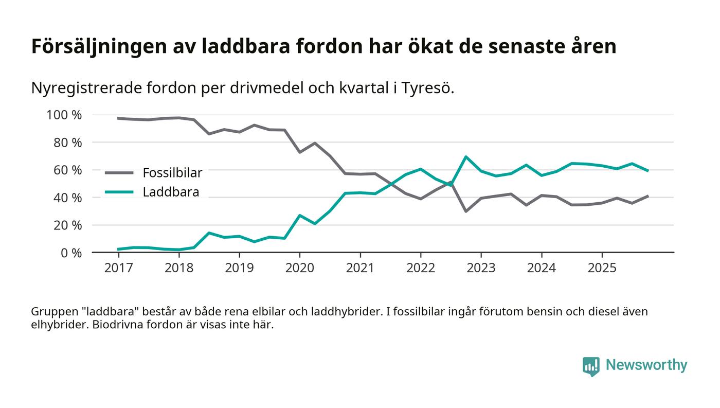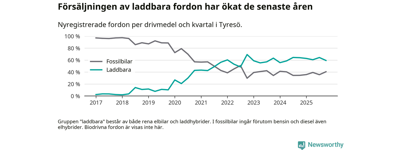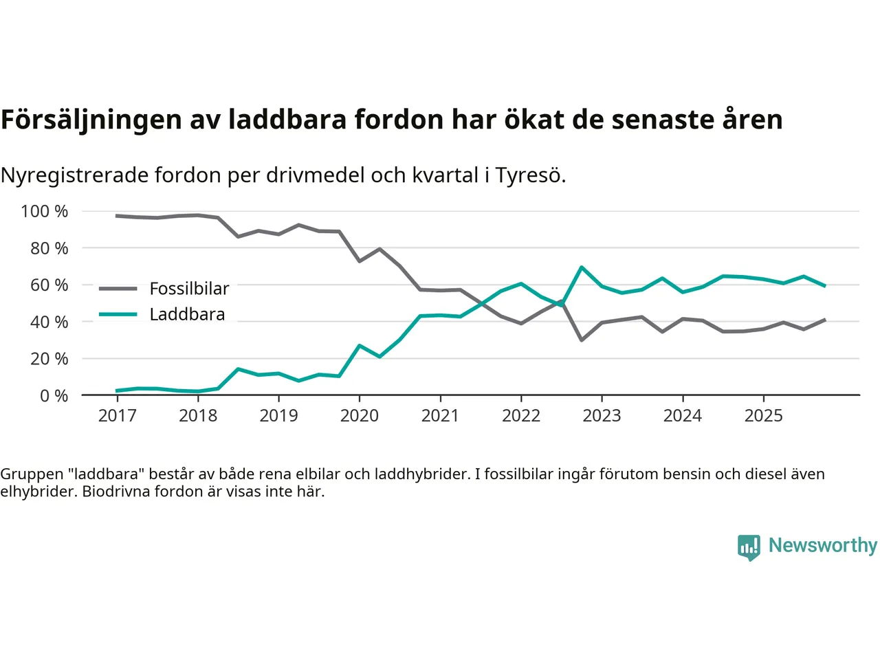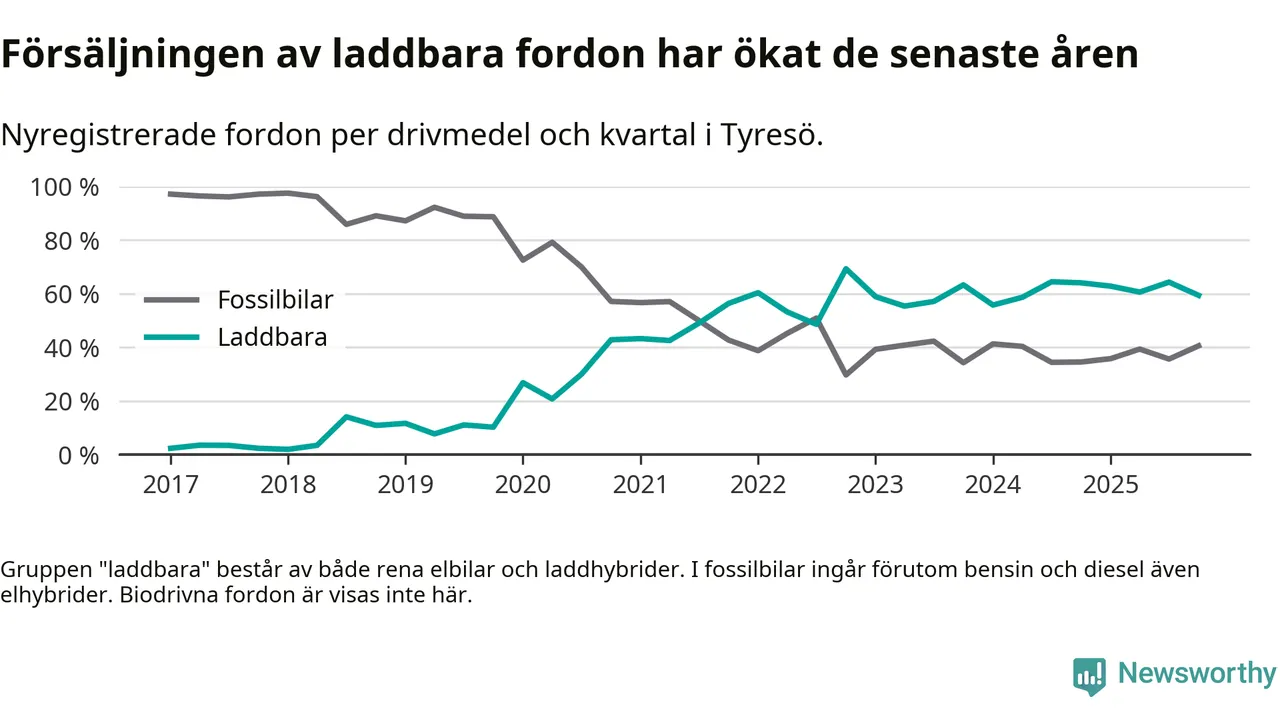 Under fjärde kvartalet 2025 var 59 procent av alla nyregistrerade personbilar i Tyresö laddbara (sammanlagt registrerades 207 nya bilar). Merparten av de laddbara bilarna var rena elbilar (35 procent av alla).
