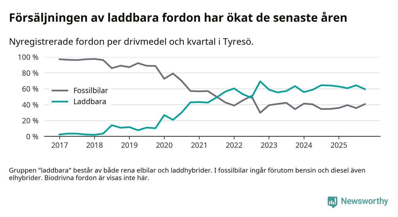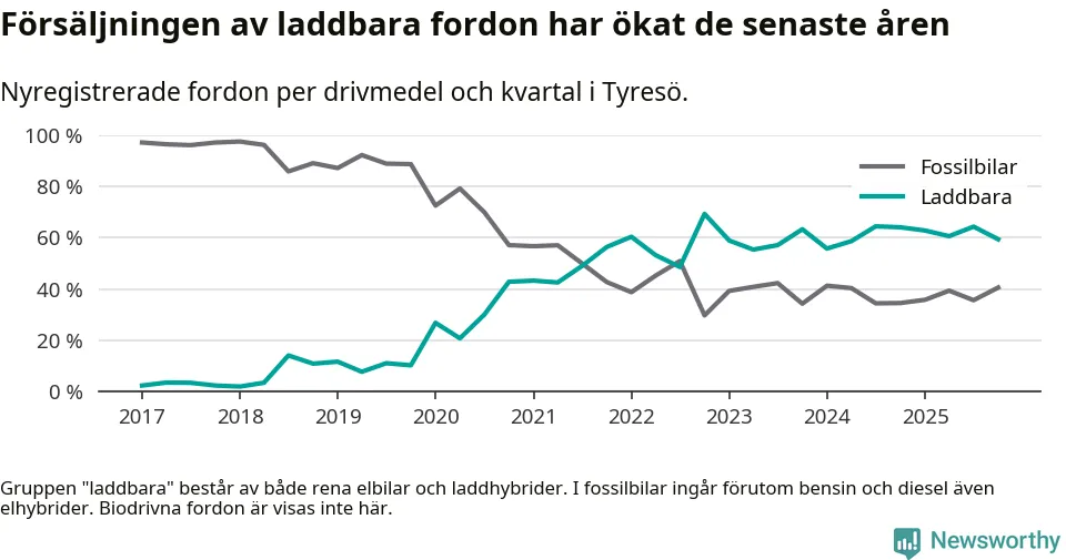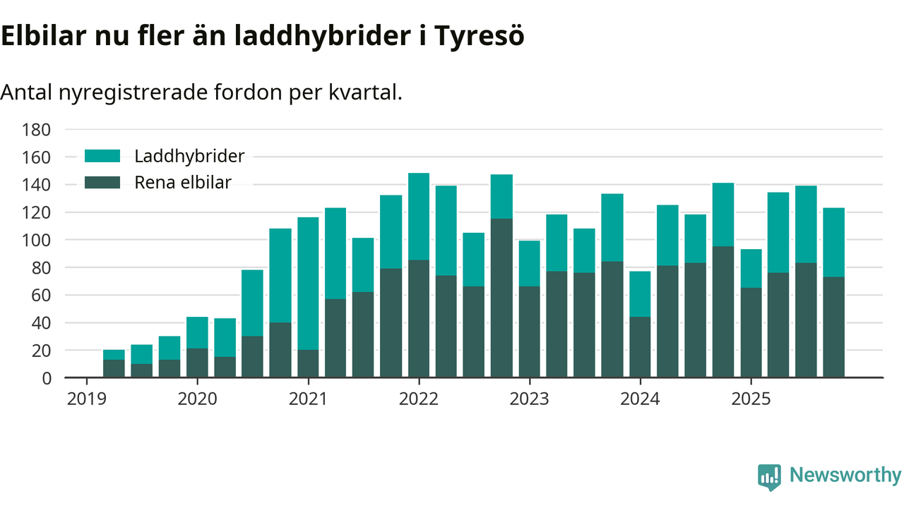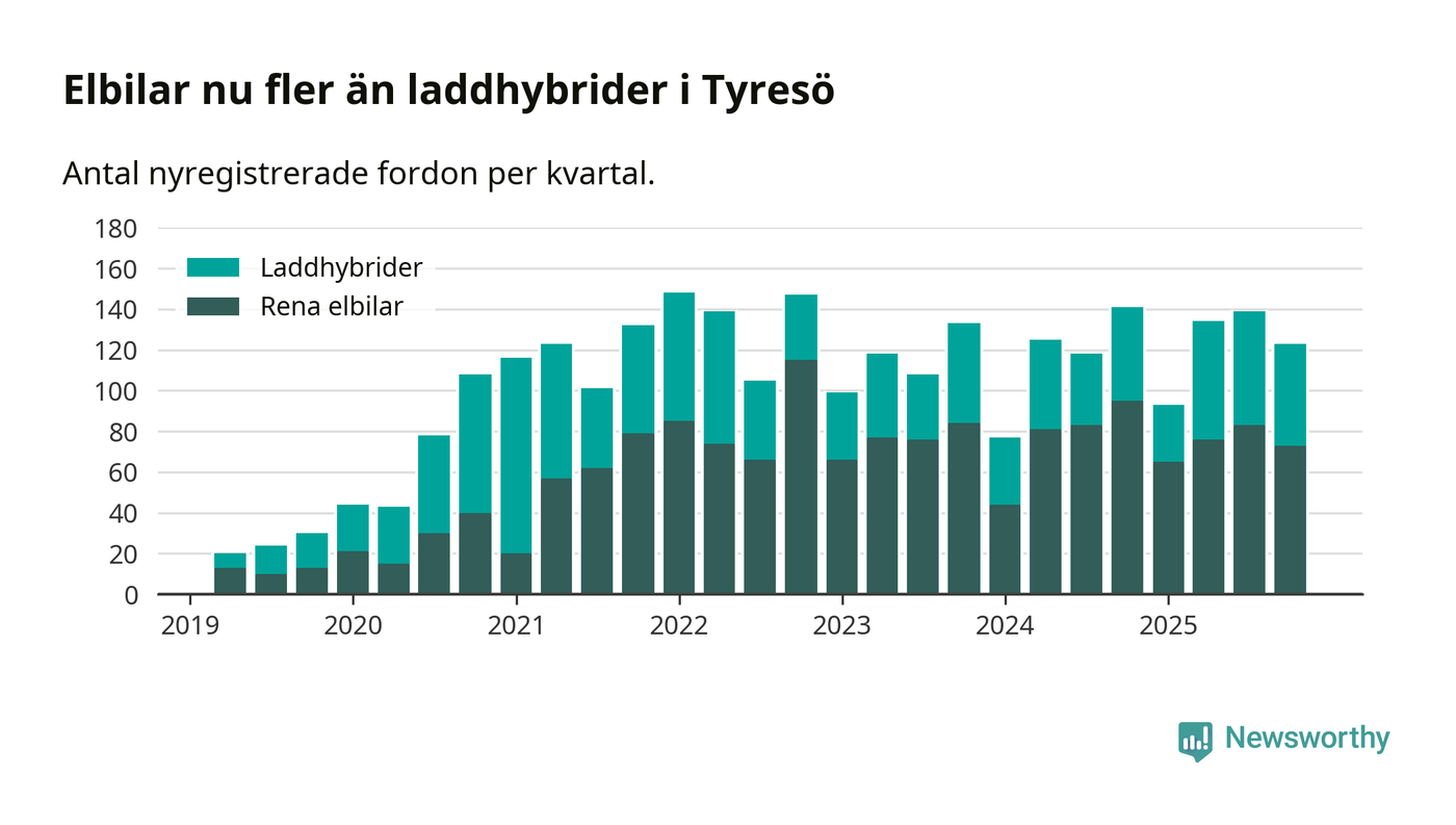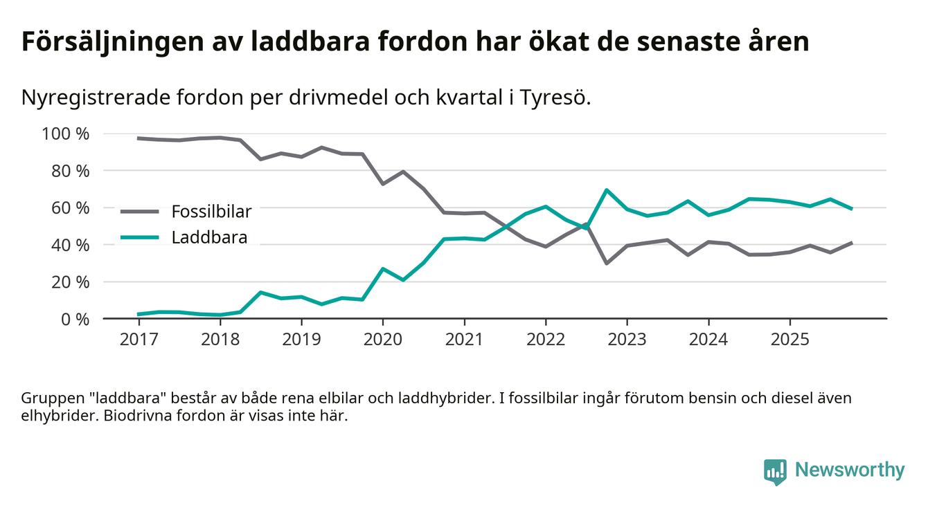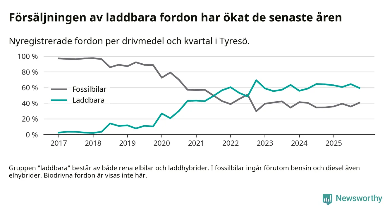 Under fjärde kvartalet 2025 var 59 procent av alla nyregistrerade personbilar i Tyresö laddbara (sammanlagt registrerades 207 nya bilar). Merparten av de laddbara bilarna var rena elbilar (35 procent av alla).