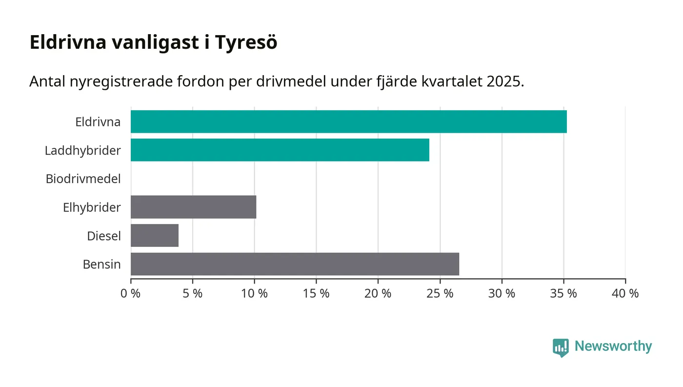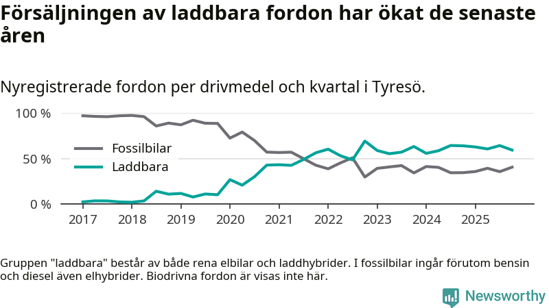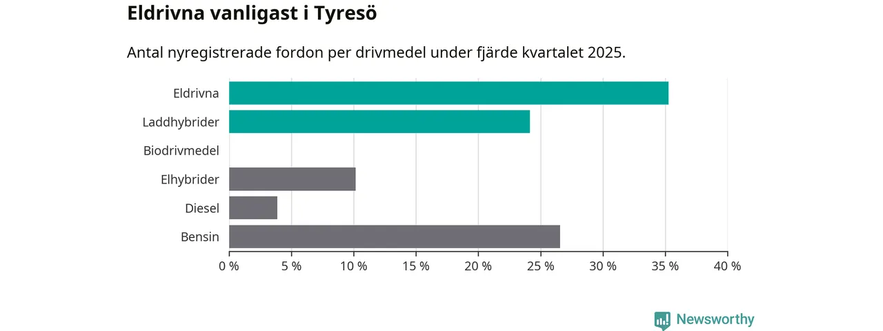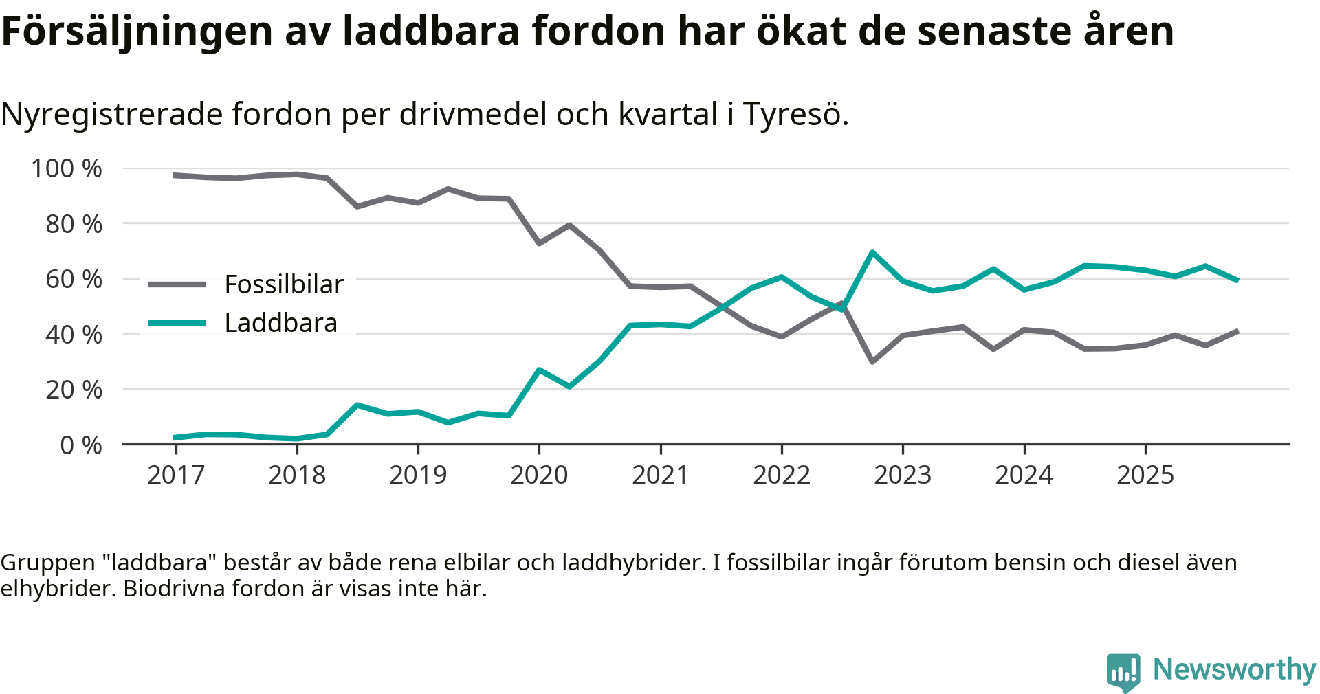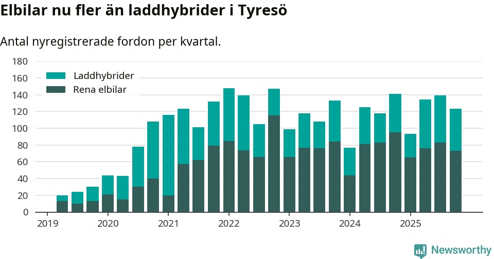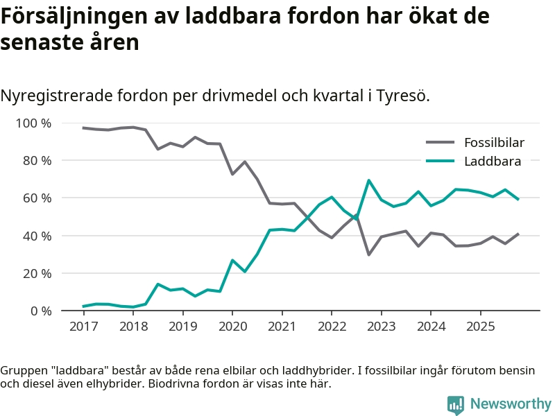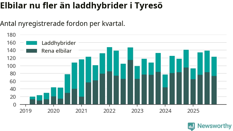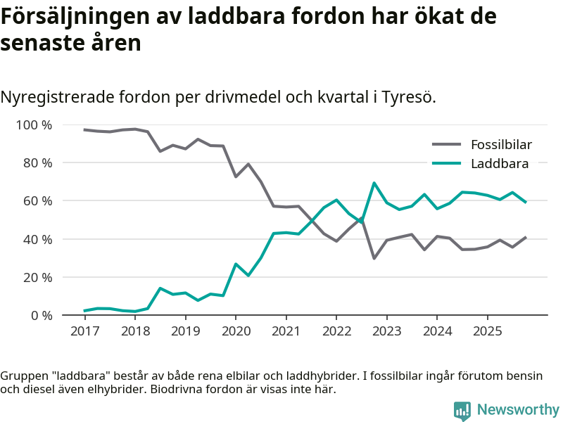 Under fjärde kvartalet 2025 var 59 procent av alla nyregistrerade personbilar i Tyresö laddbara (sammanlagt registrerades 207 nya bilar). Merparten av de laddbara bilarna var rena elbilar (35 procent av alla).