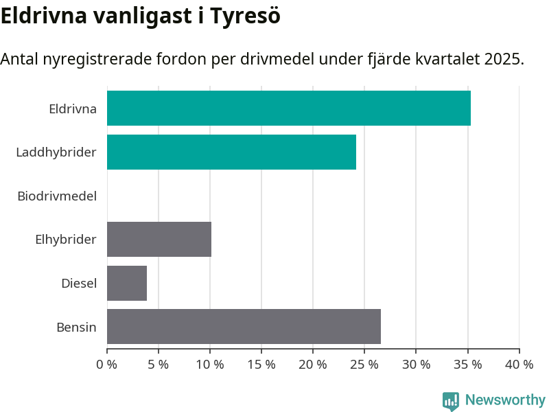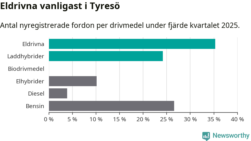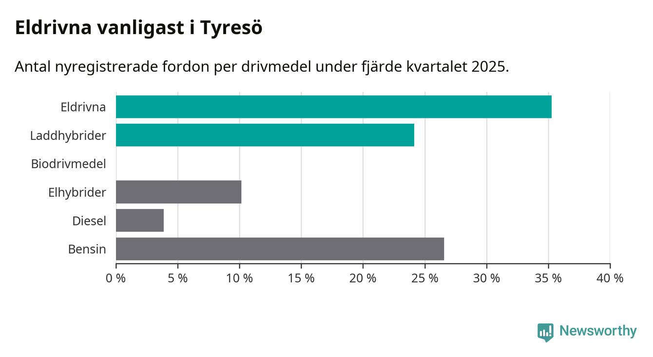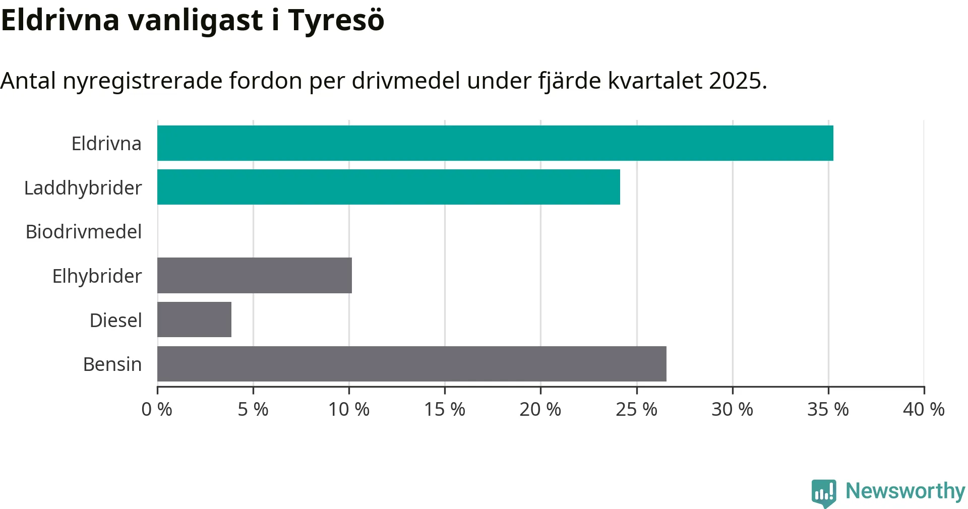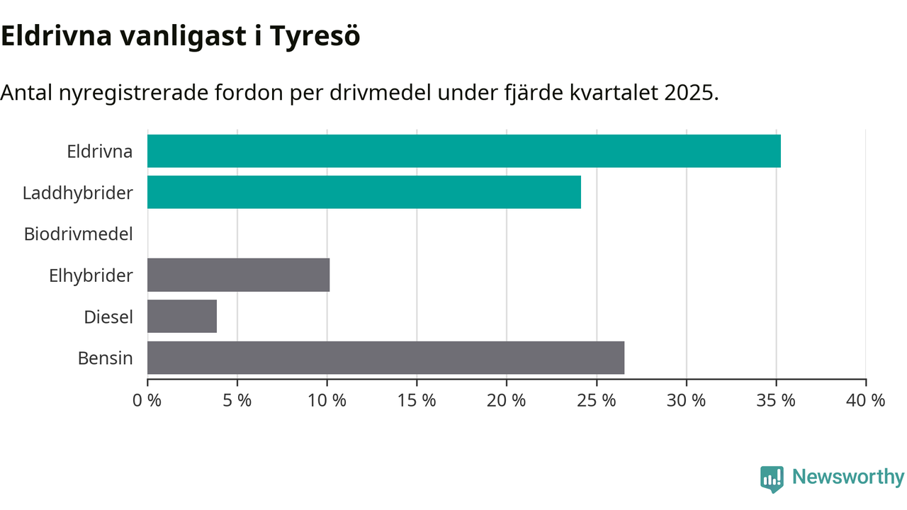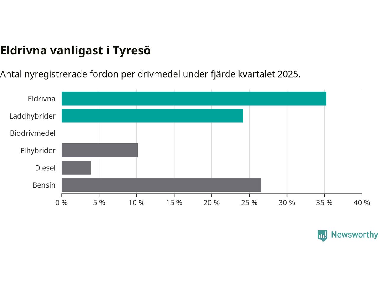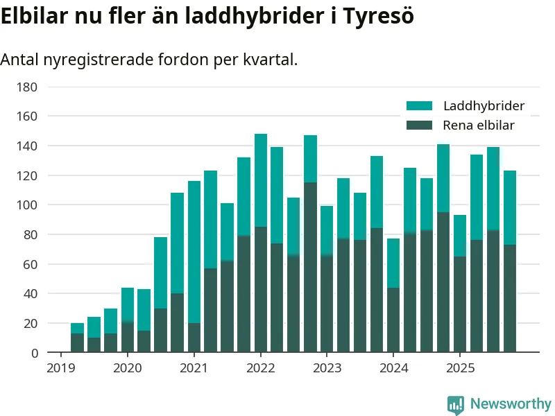 Under fjärde kvartalet 2025 var 59 procent av alla nyregistrerade personbilar i Tyresö laddbara (sammanlagt registrerades 207 nya bilar). Merparten av de laddbara bilarna var rena elbilar (35 procent av alla).