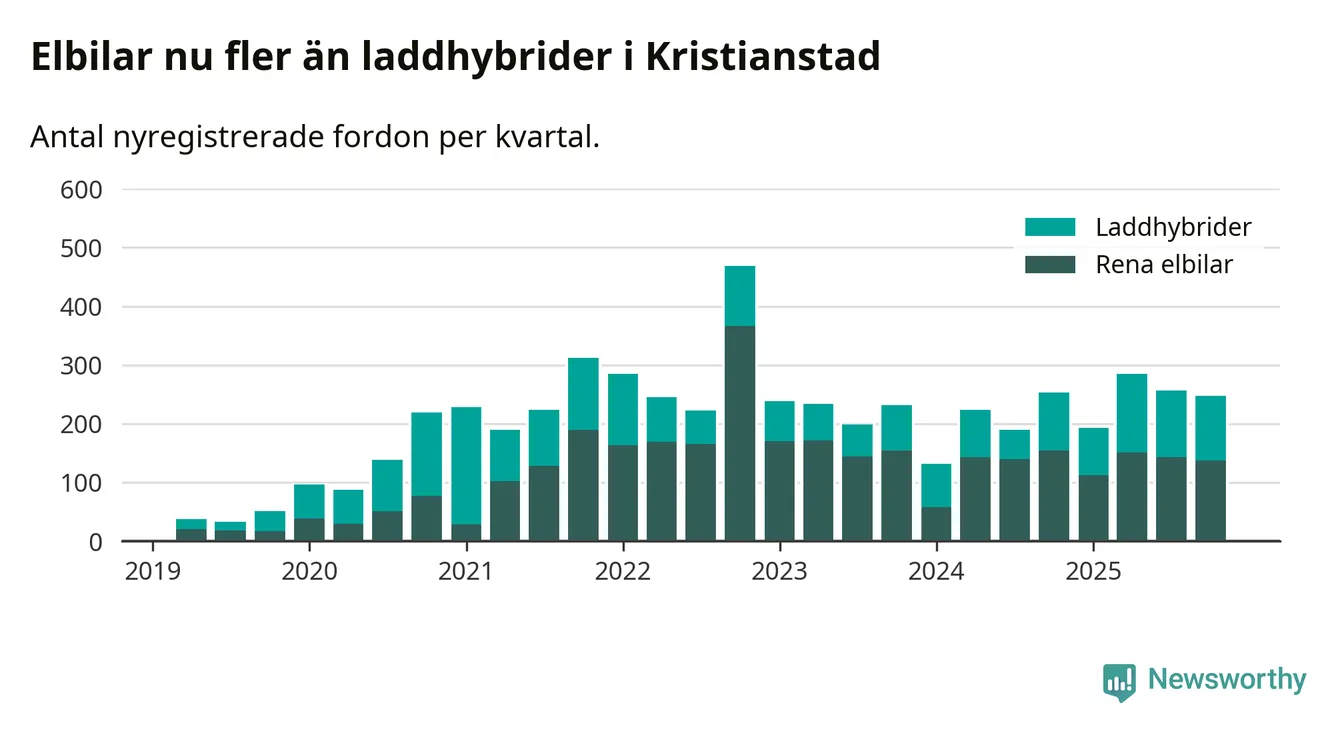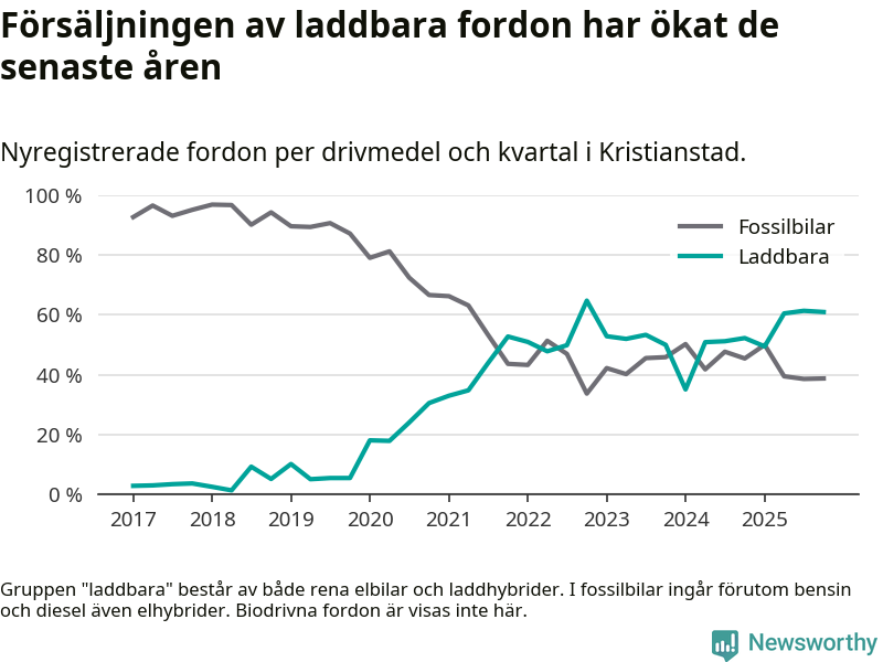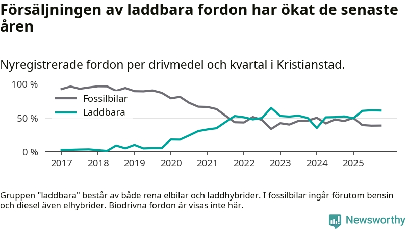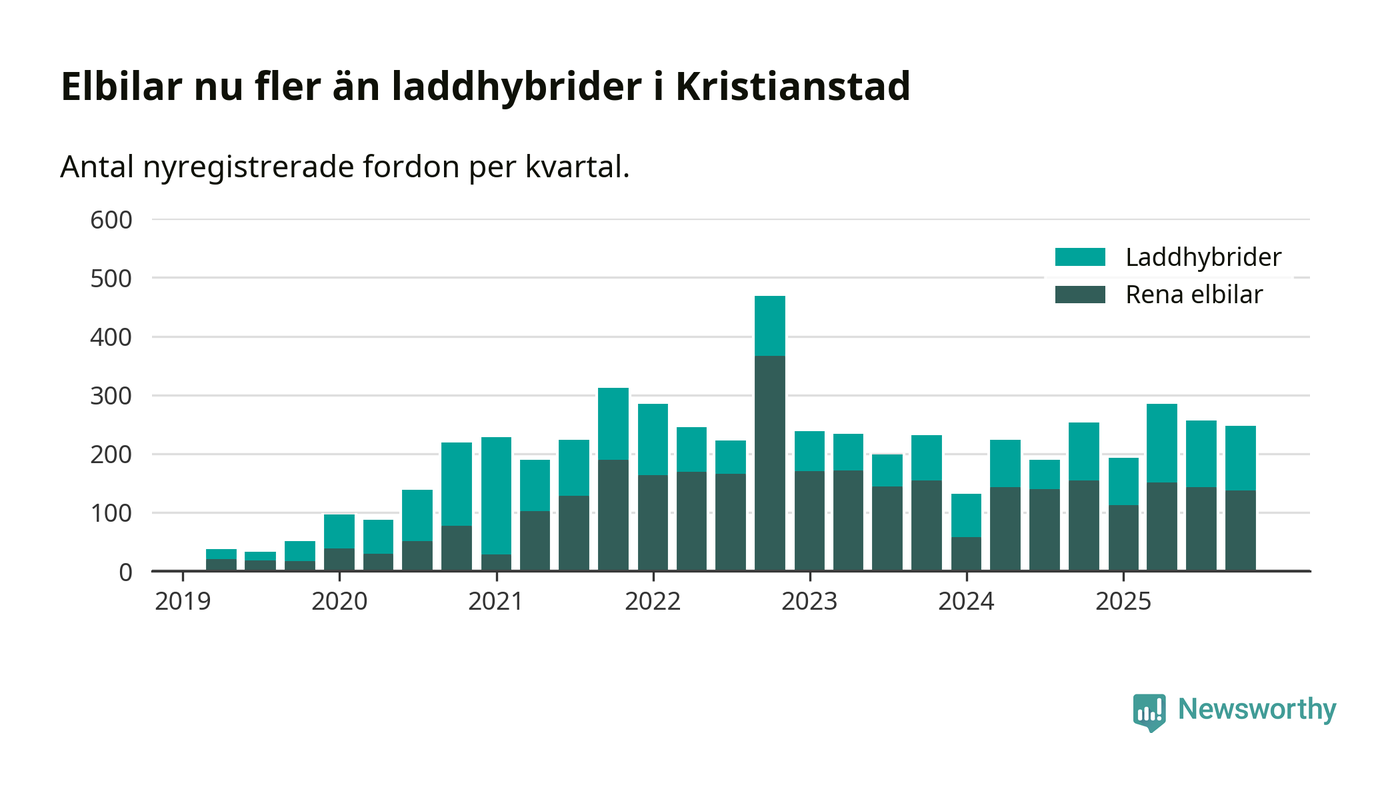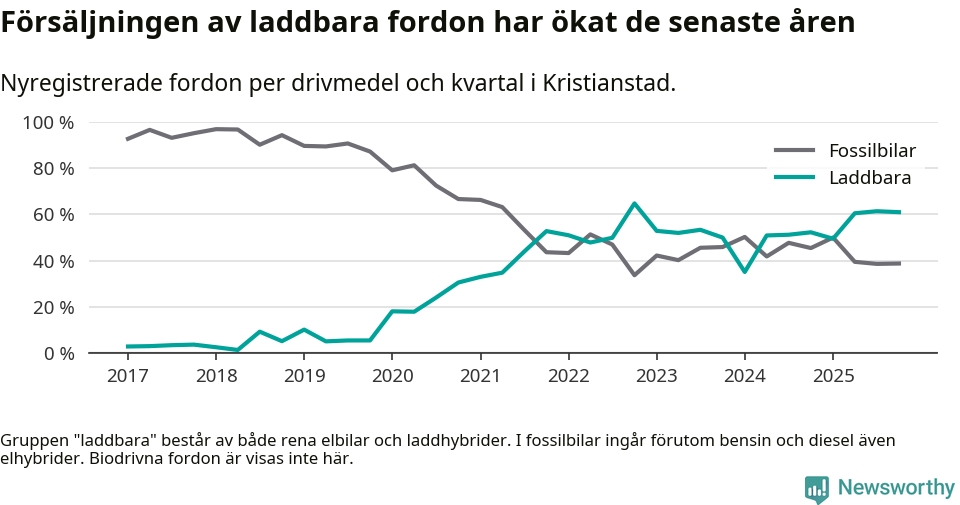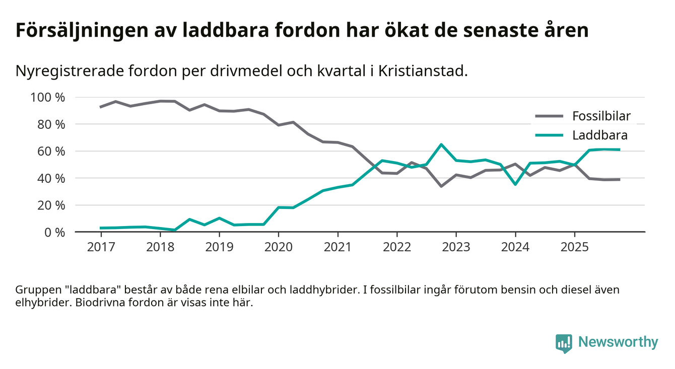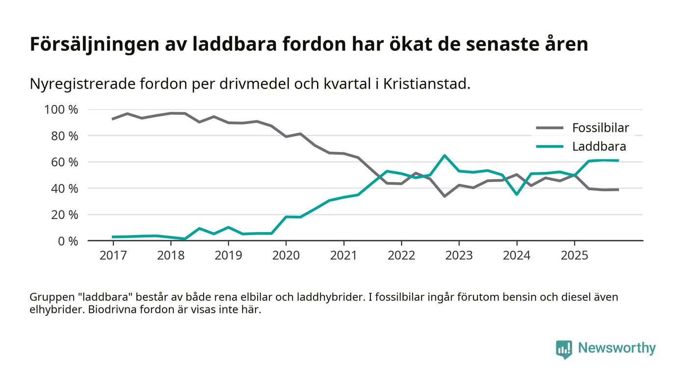 Under fjärde kvartalet 2025 var 61 procent av alla nyregistrerade personbilar i Kristianstad laddbara (sammanlagt registrerades 405 nya bilar). Merparten av de laddbara bilarna var rena elbilar (34 procent av alla).