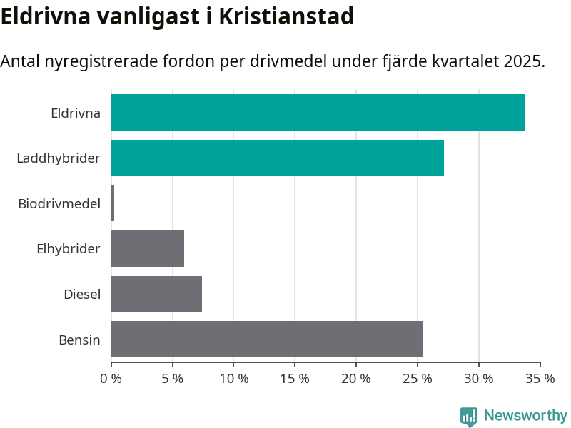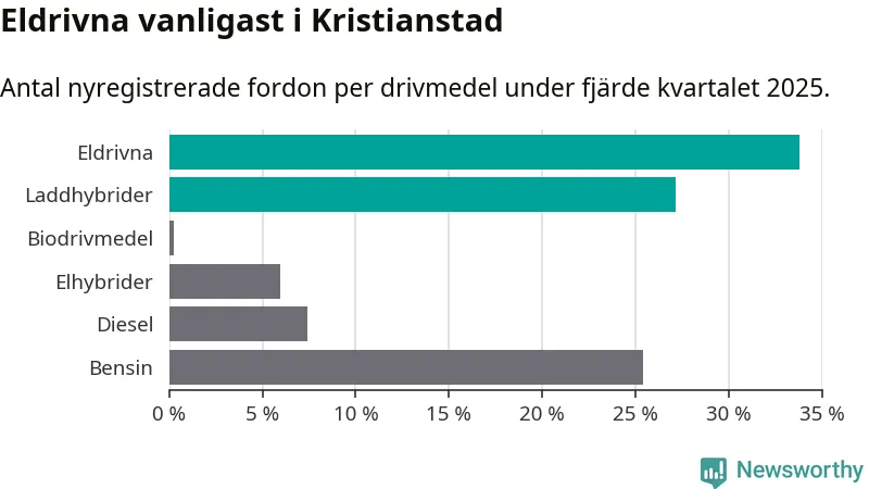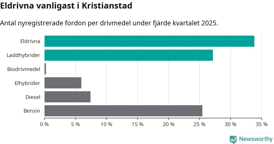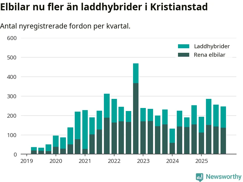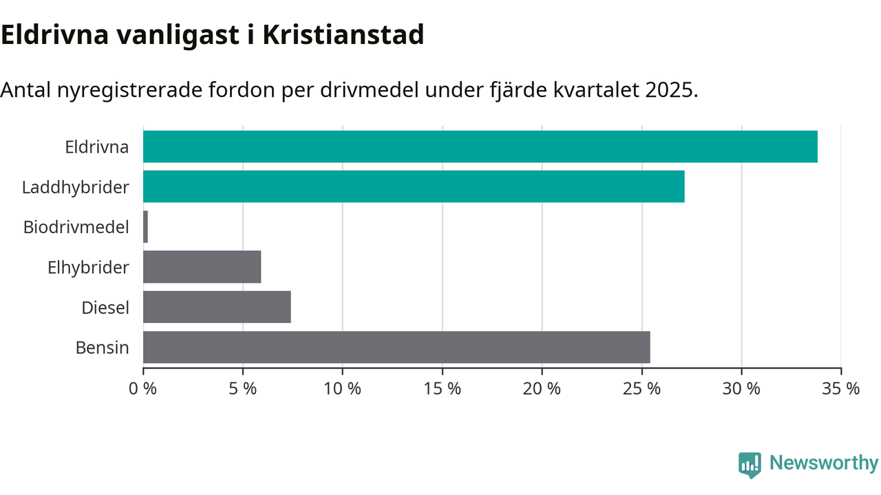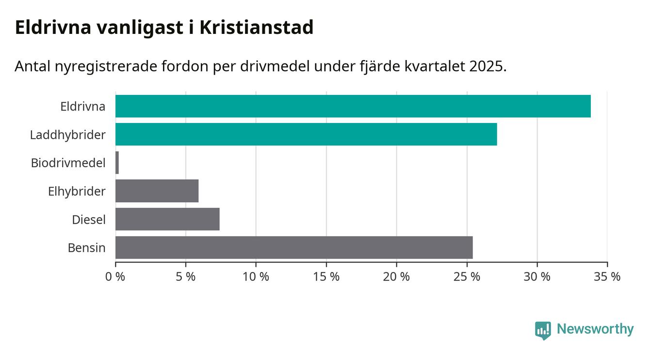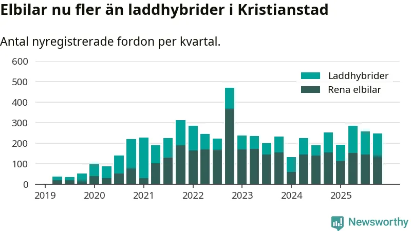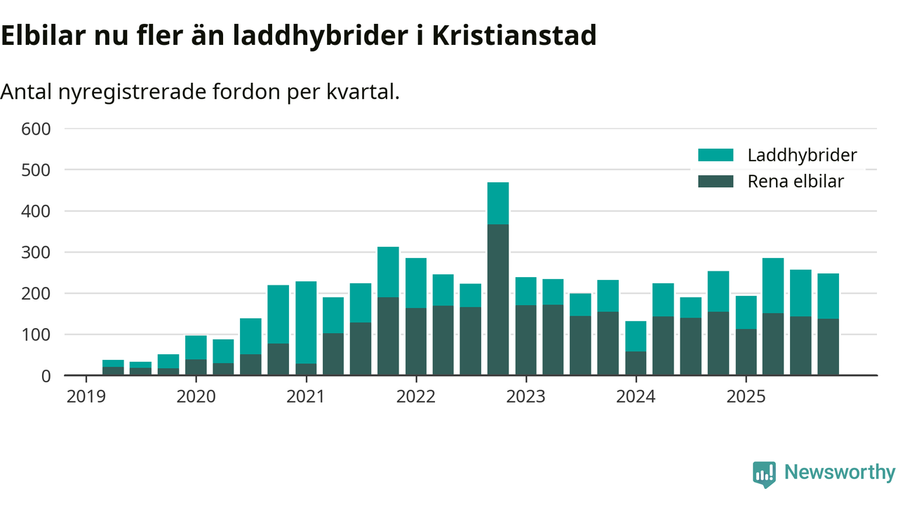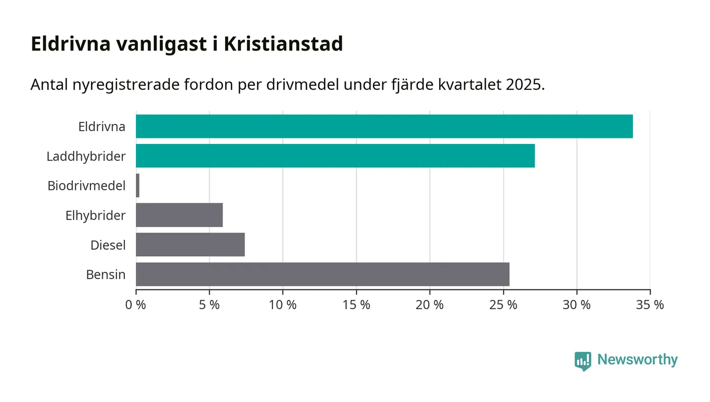 Under fjärde kvartalet 2025 var 61 procent av alla nyregistrerade personbilar i Kristianstad laddbara (sammanlagt registrerades 405 nya bilar). Merparten av de laddbara bilarna var rena elbilar (34 procent av alla).