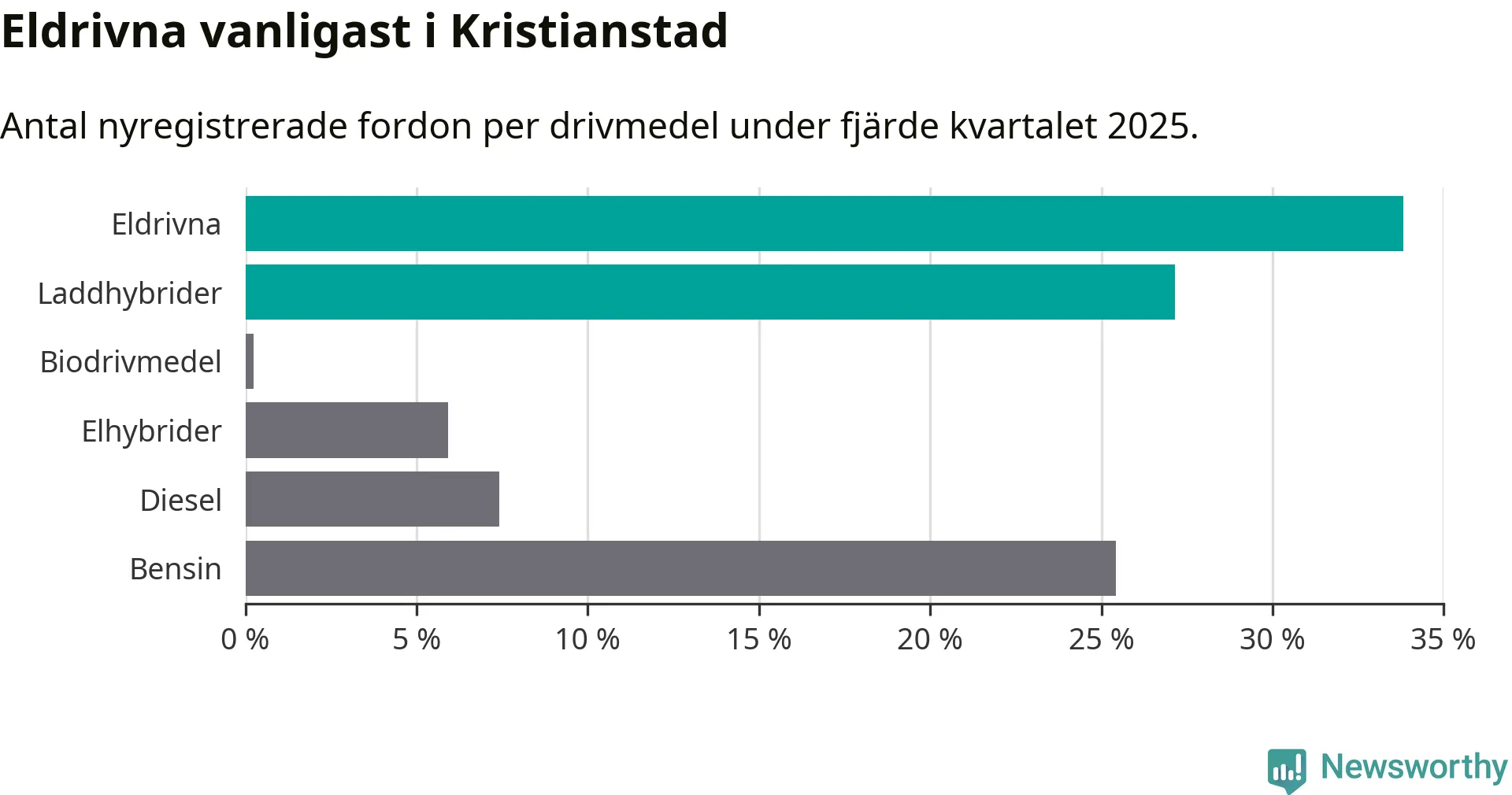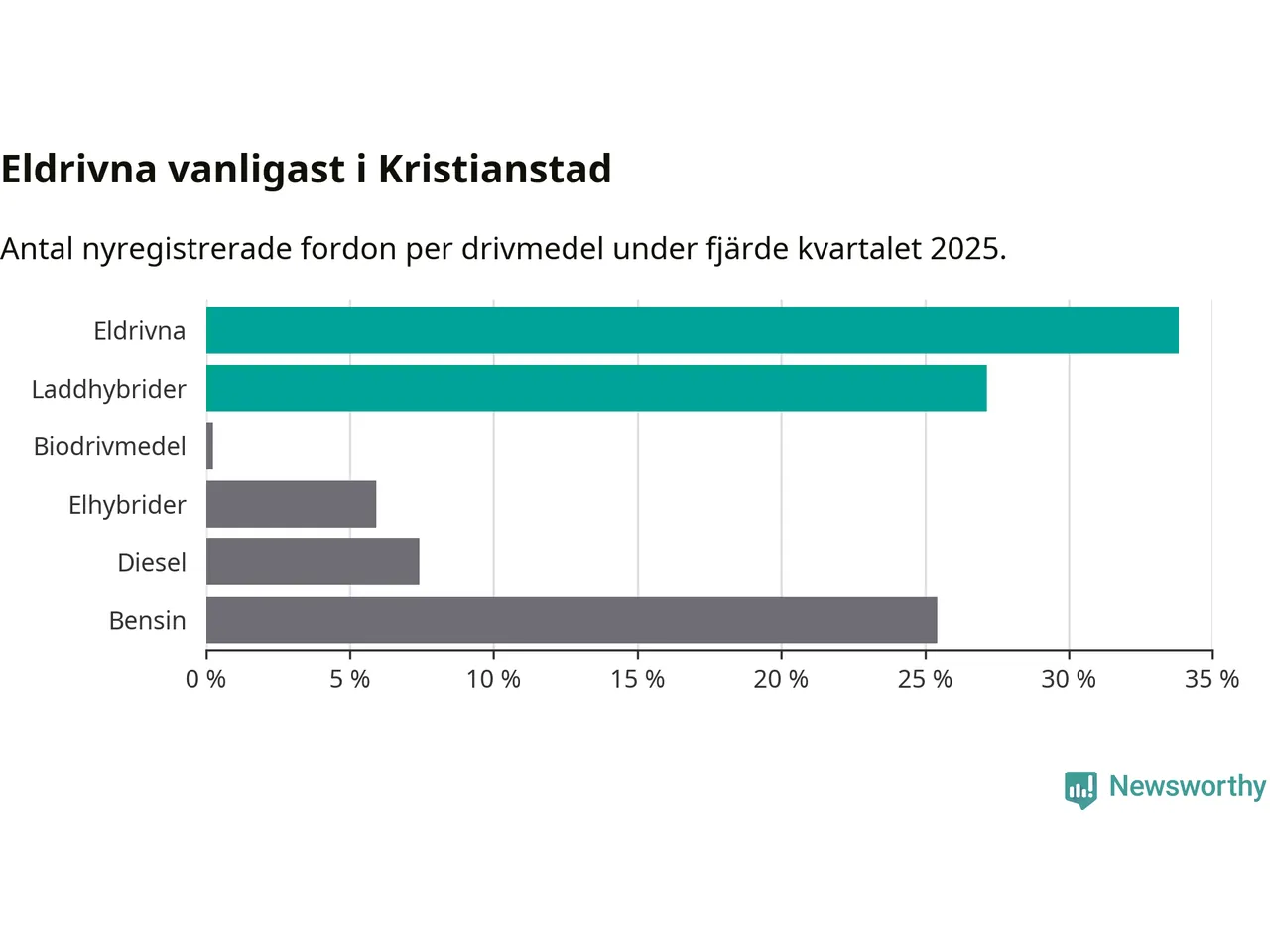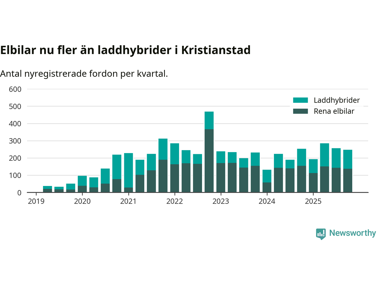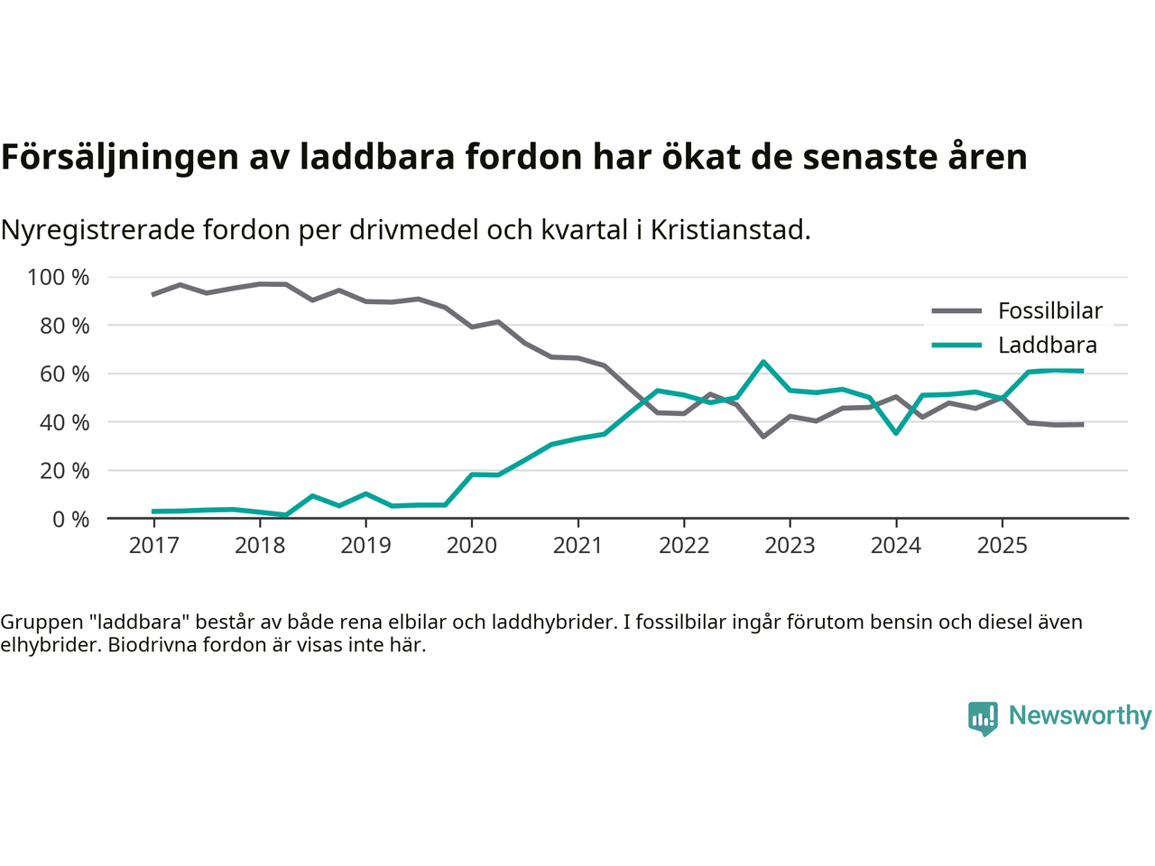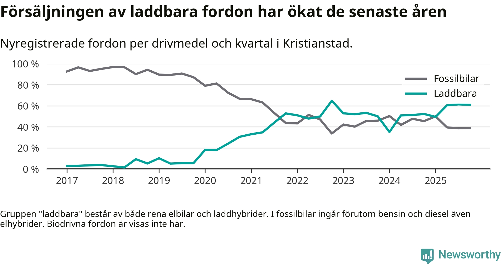 Under fjärde kvartalet 2025 var 61 procent av alla nyregistrerade personbilar i Kristianstad laddbara (sammanlagt registrerades 405 nya bilar). Merparten av de laddbara bilarna var rena elbilar (34 procent av alla).