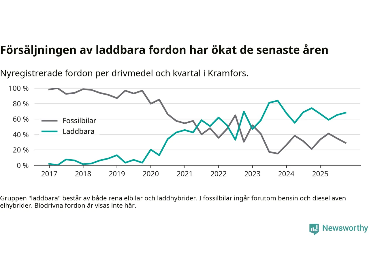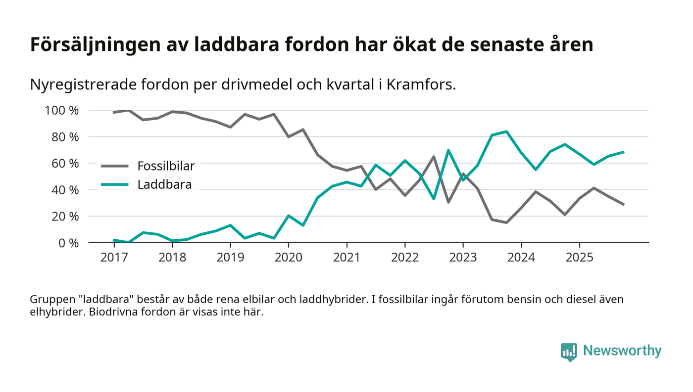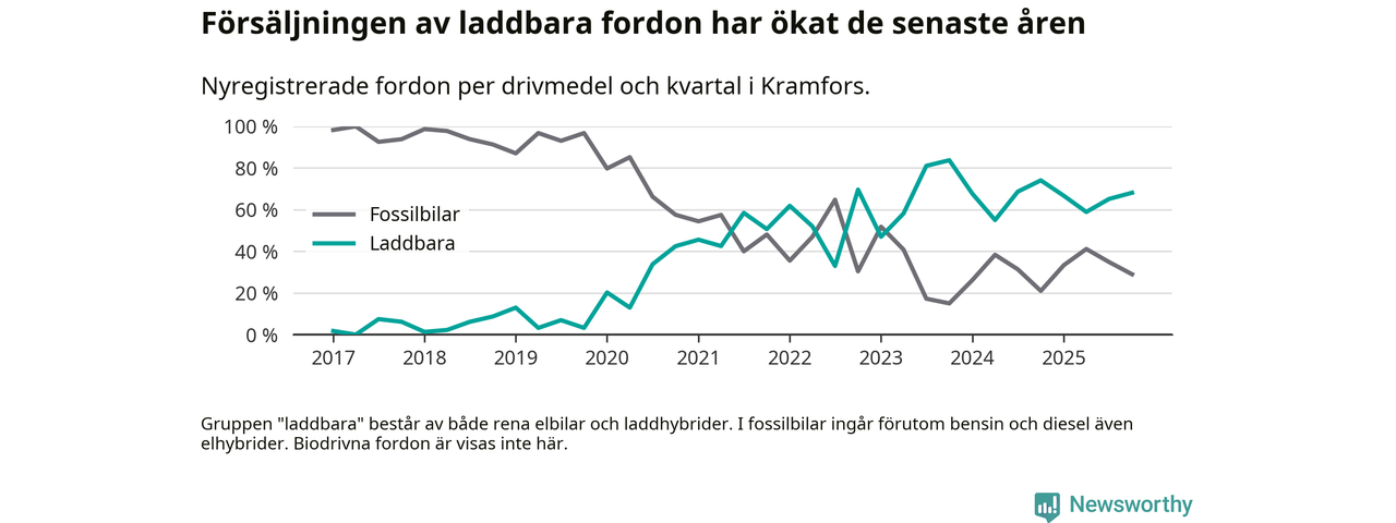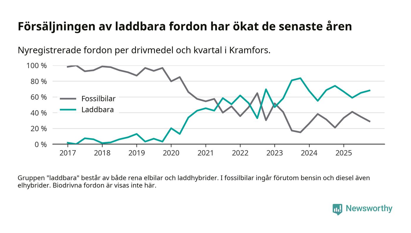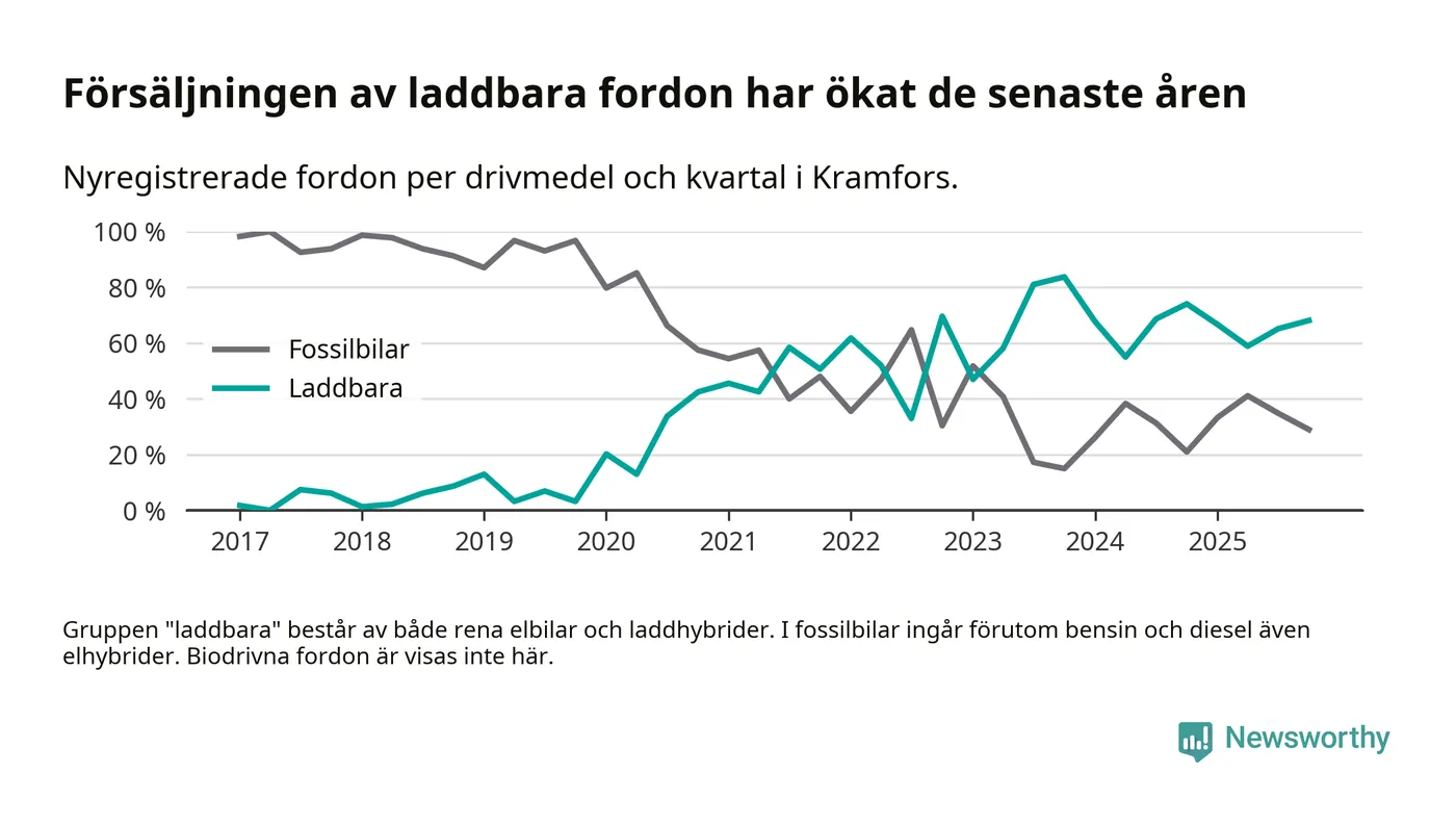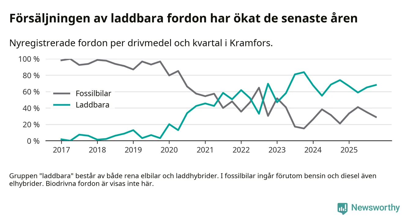 Under fjärde kvartalet 2025 var 68 procent av alla nyregistrerade personbilar i Kramfors laddbara (sammanlagt registrerades 69 nya bilar). Merparten av de laddbara bilarna var rena elbilar (41 procent av alla).