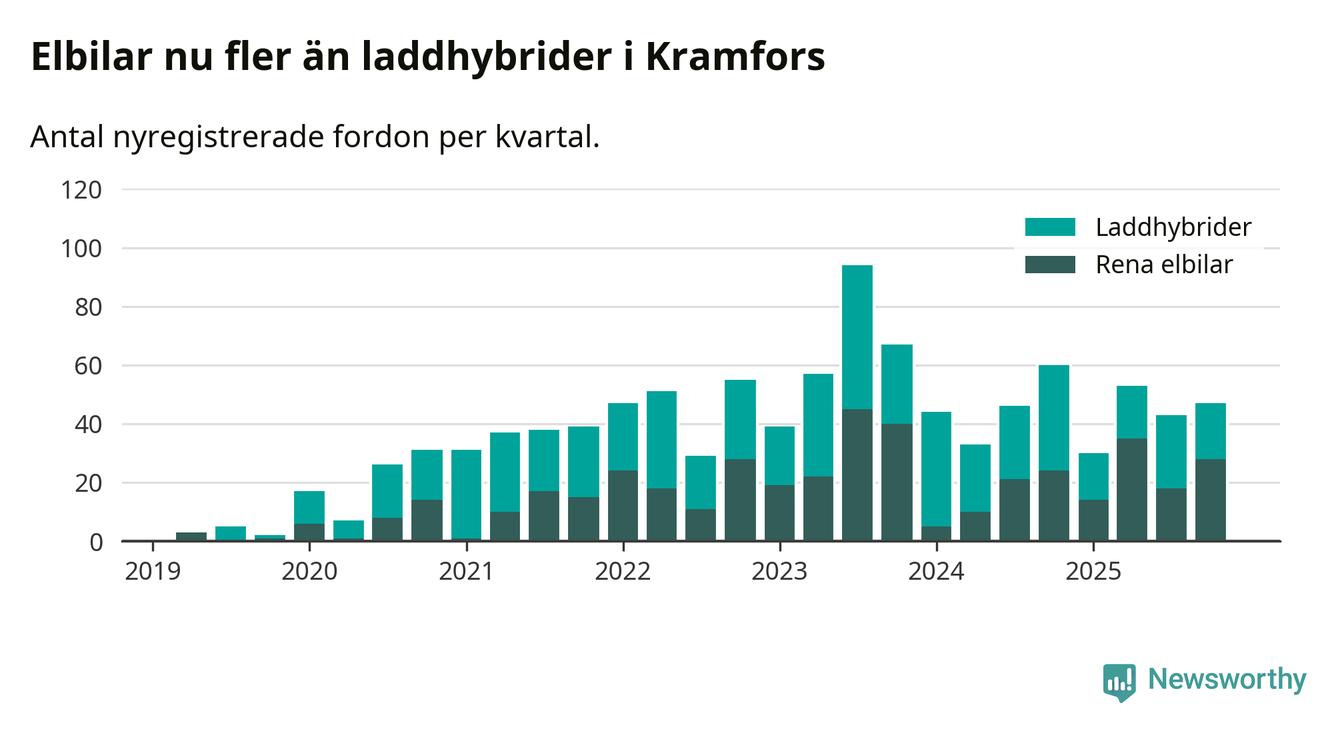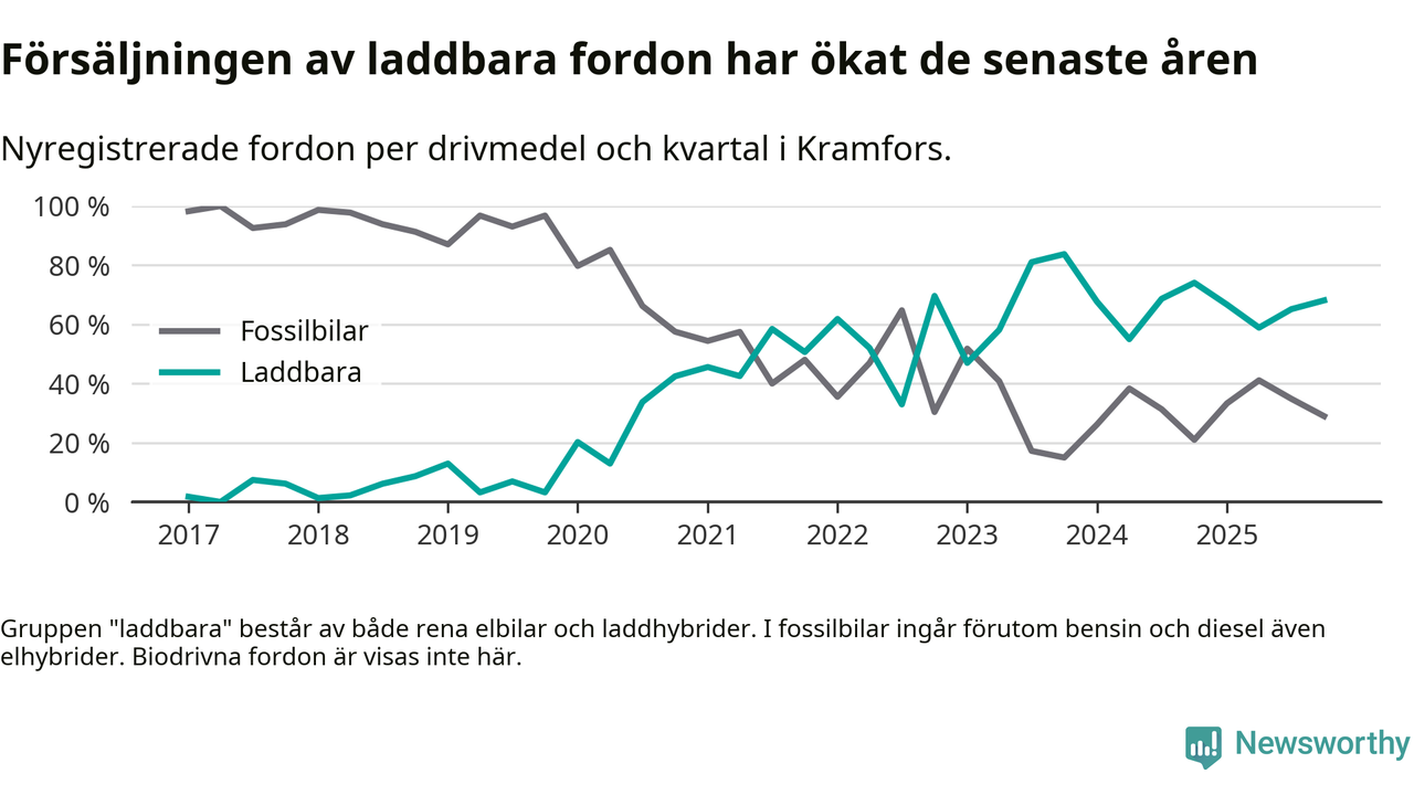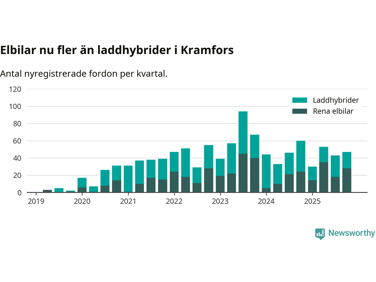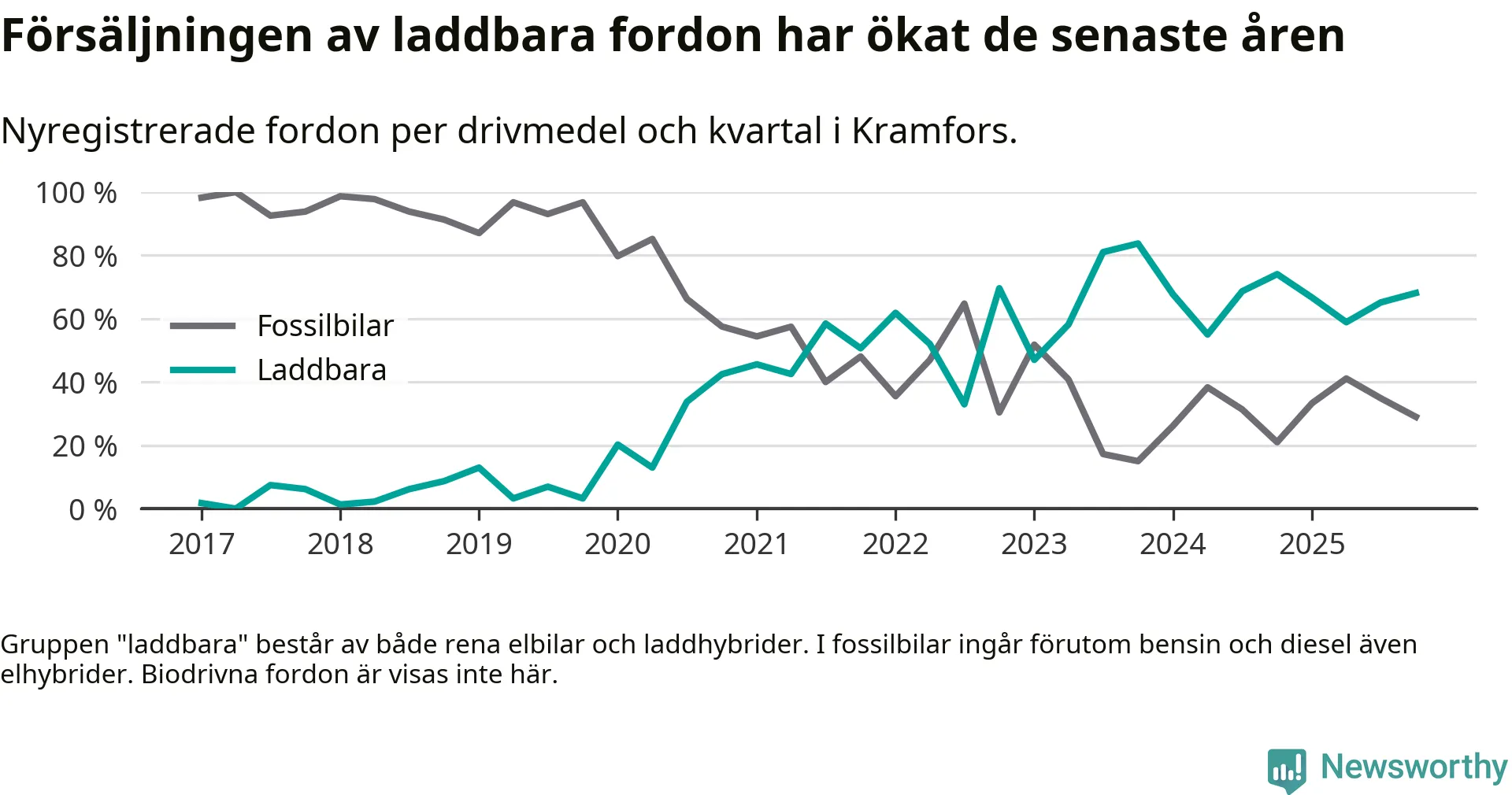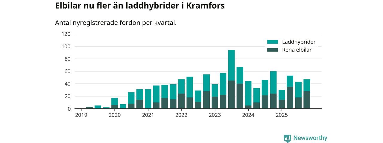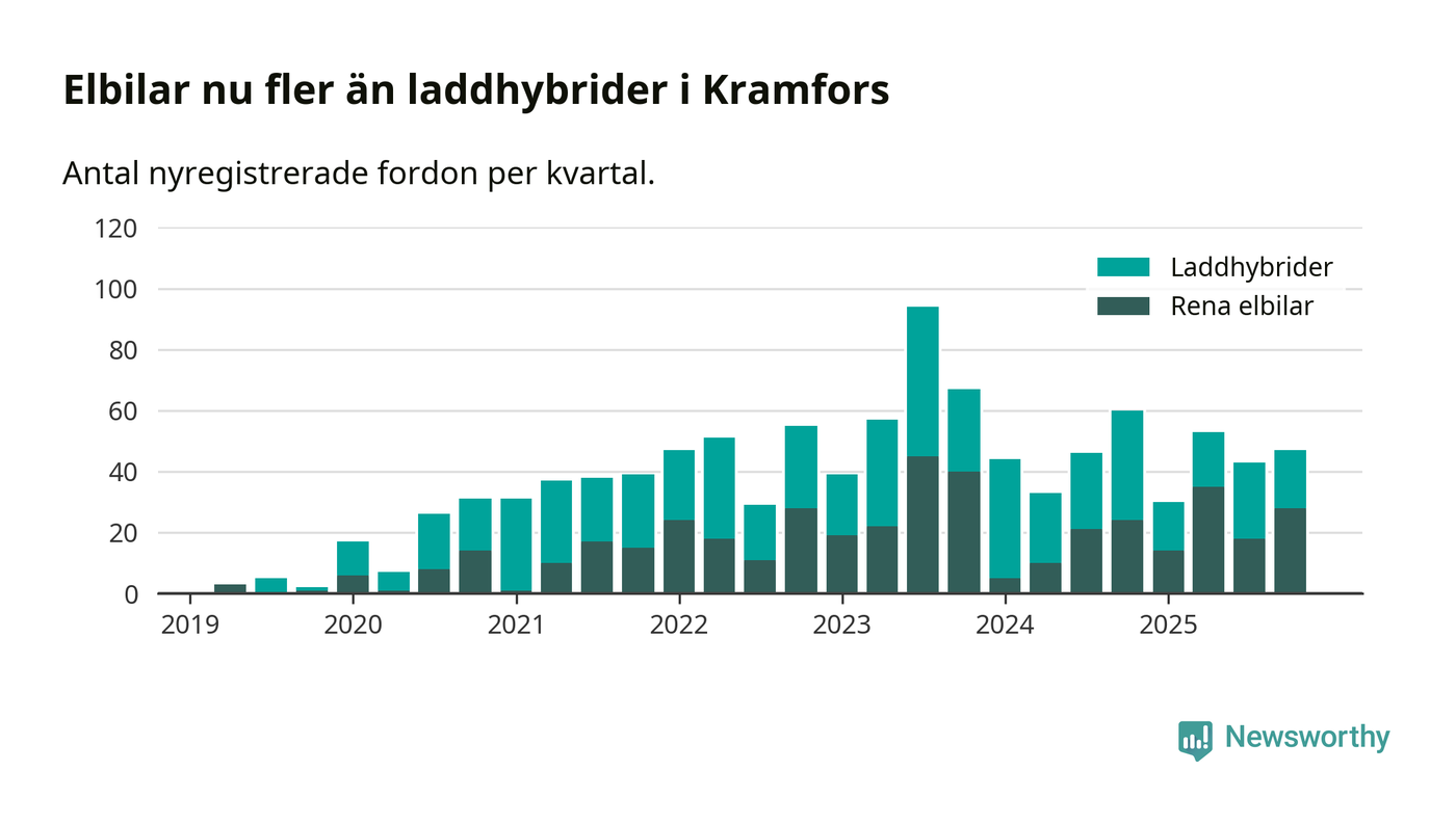 Under fjärde kvartalet 2025 var 68 procent av alla nyregistrerade personbilar i Kramfors laddbara (sammanlagt registrerades 69 nya bilar). Merparten av de laddbara bilarna var rena elbilar (41 procent av alla).