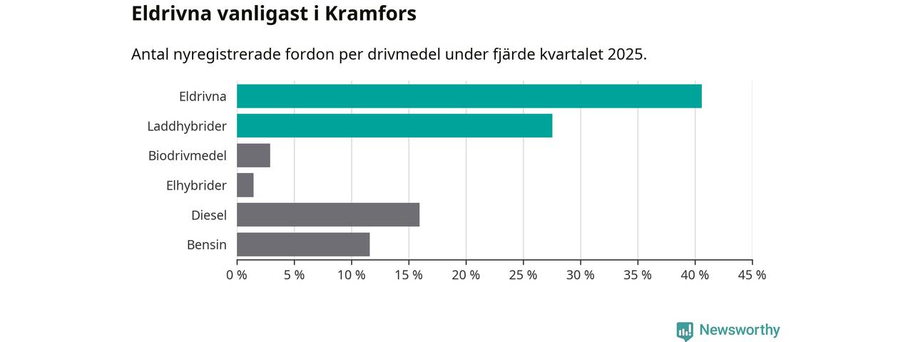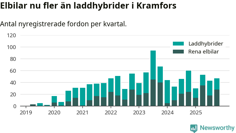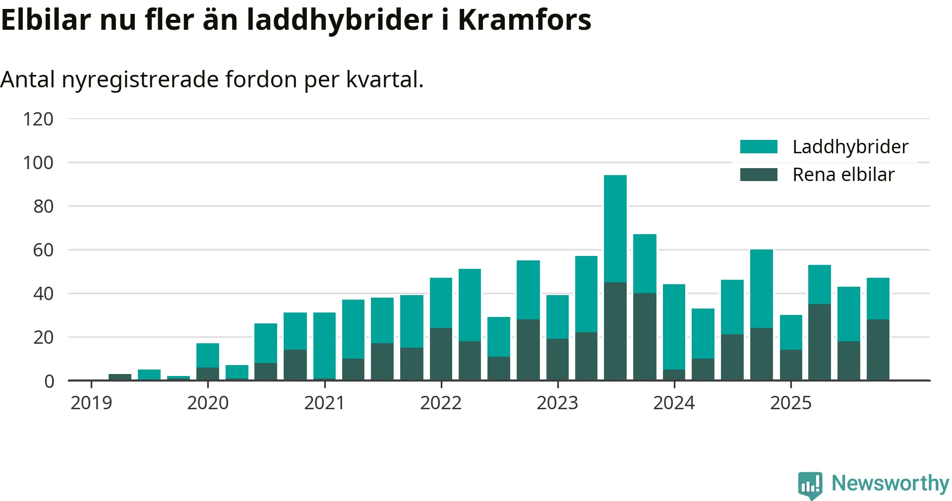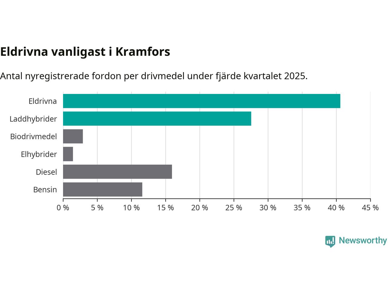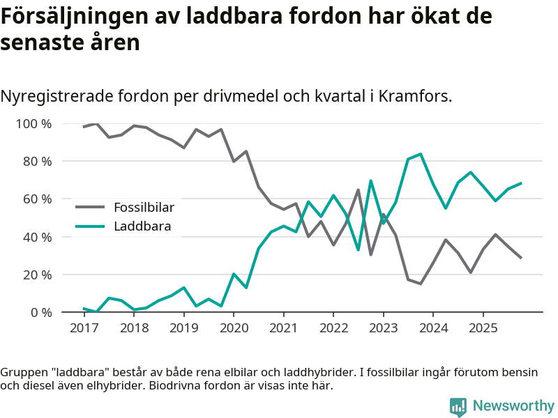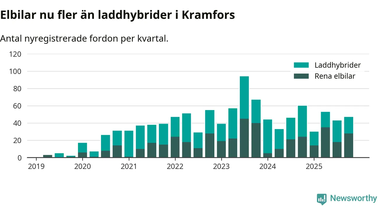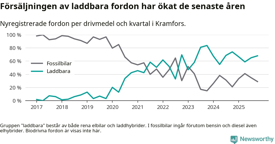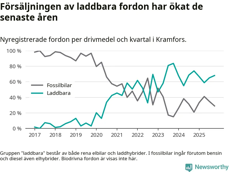 Under fjärde kvartalet 2025 var 68 procent av alla nyregistrerade personbilar i Kramfors laddbara (sammanlagt registrerades 69 nya bilar). Merparten av de laddbara bilarna var rena elbilar (41 procent av alla).