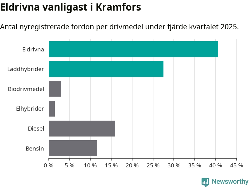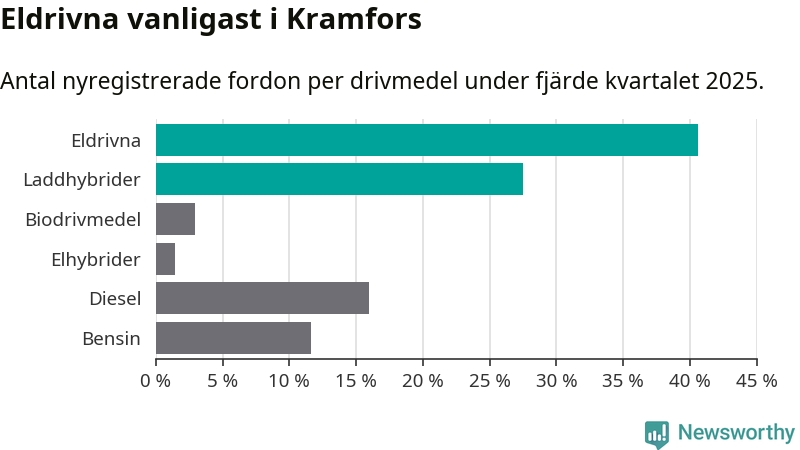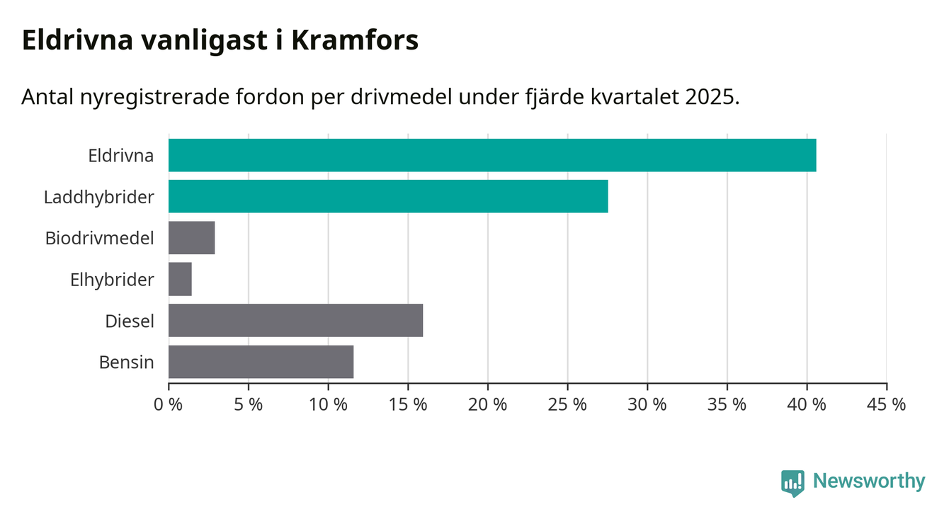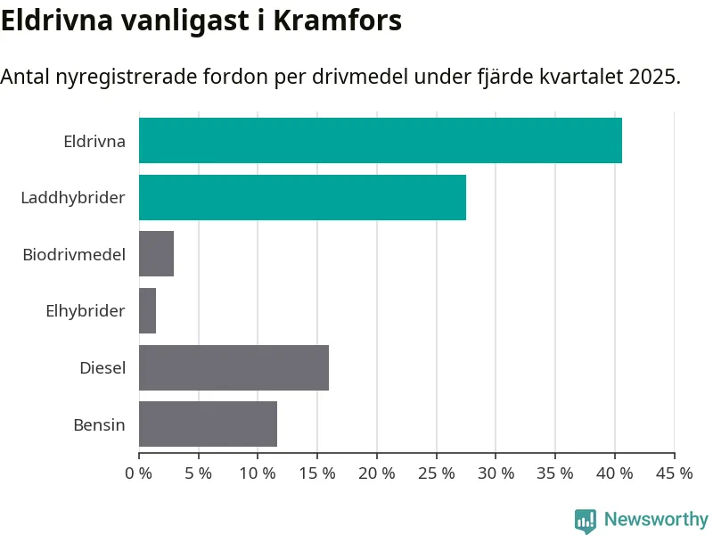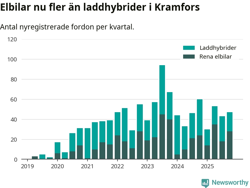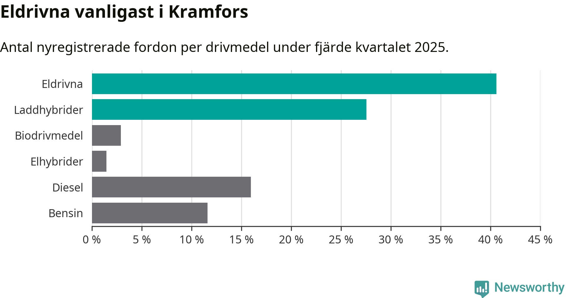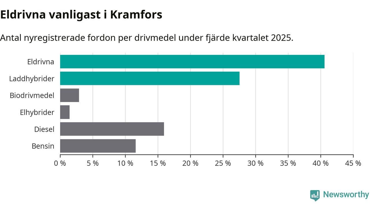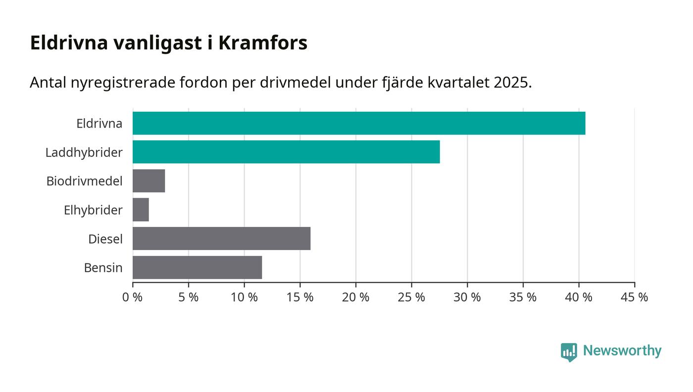 Under fjärde kvartalet 2025 var 68 procent av alla nyregistrerade personbilar i Kramfors laddbara (sammanlagt registrerades 69 nya bilar). Merparten av de laddbara bilarna var rena elbilar (41 procent av alla).