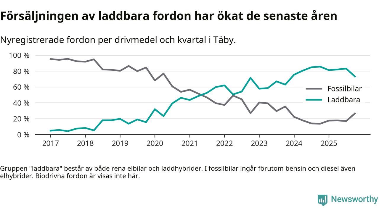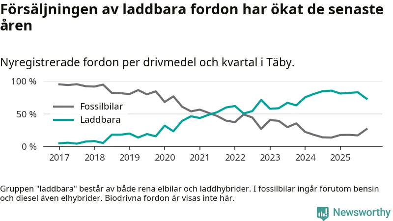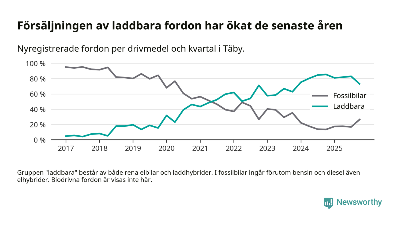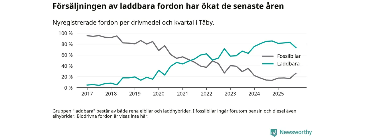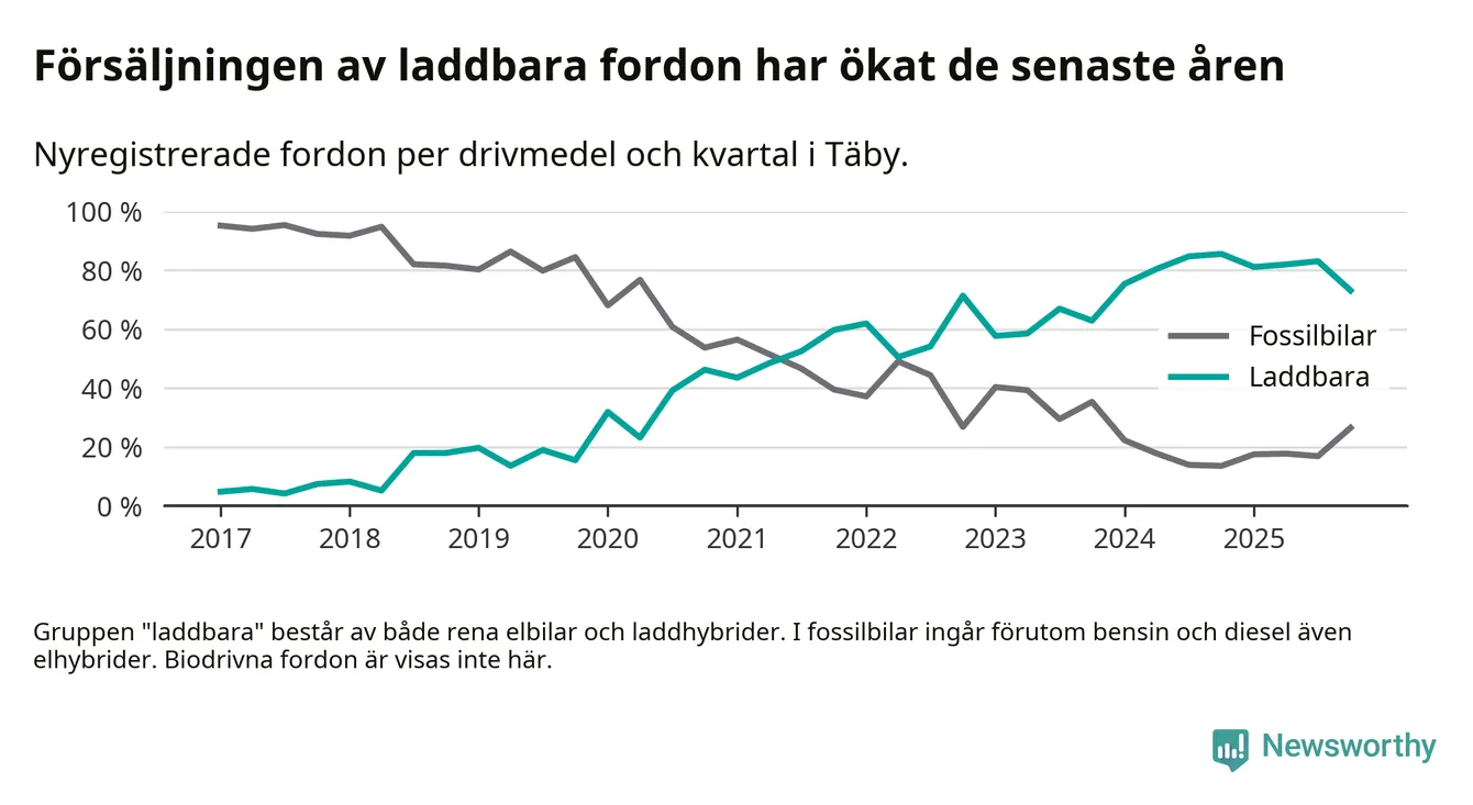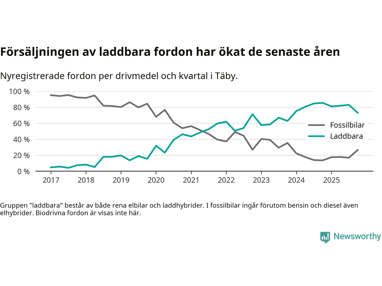 Under fjärde kvartalet 2025 var 73 procent av alla nyregistrerade personbilar i Täby laddbara (sammanlagt registrerades 641 nya bilar). Merparten av de laddbara bilarna var rena elbilar (45 procent av alla).