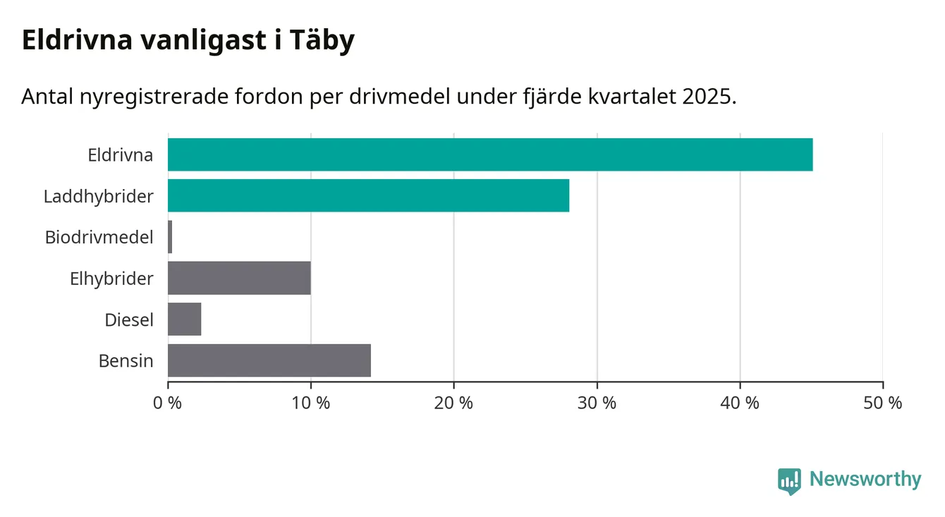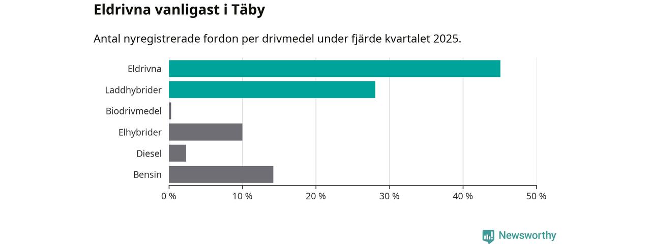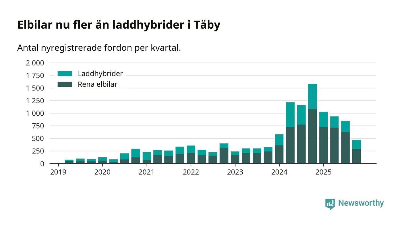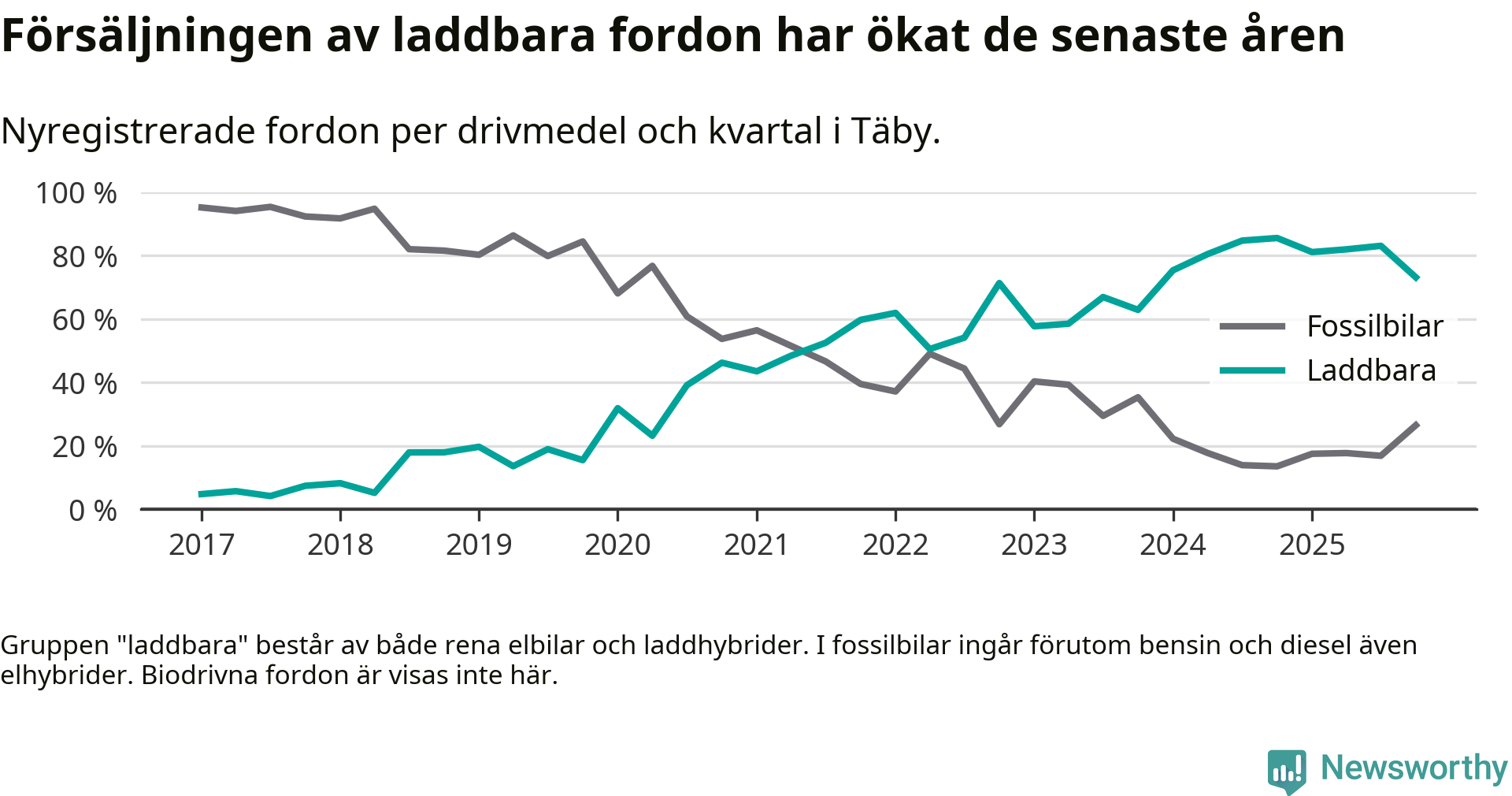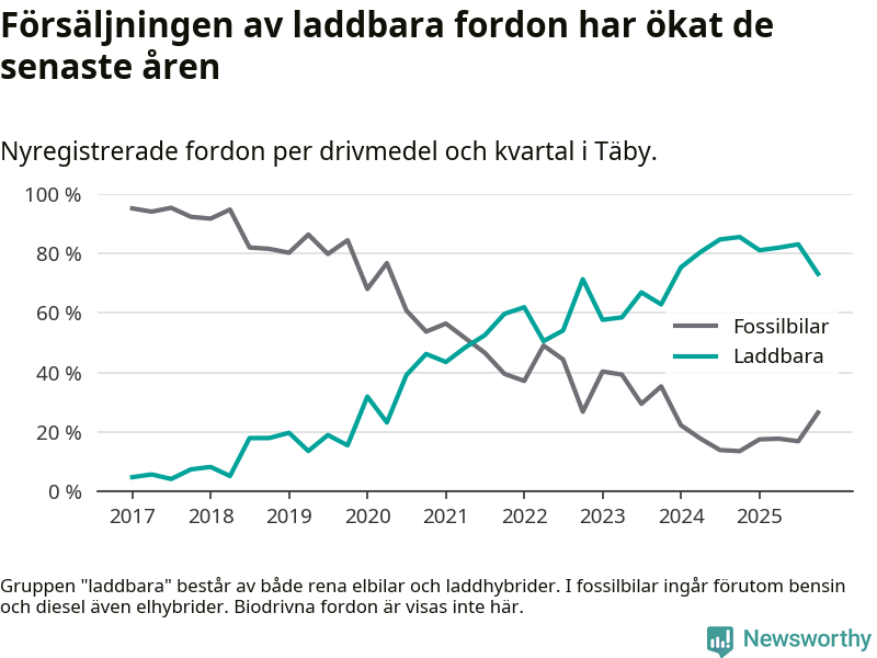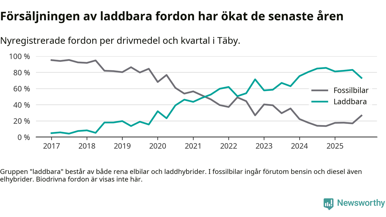 Under fjärde kvartalet 2025 var 73 procent av alla nyregistrerade personbilar i Täby laddbara (sammanlagt registrerades 641 nya bilar). Merparten av de laddbara bilarna var rena elbilar (45 procent av alla).