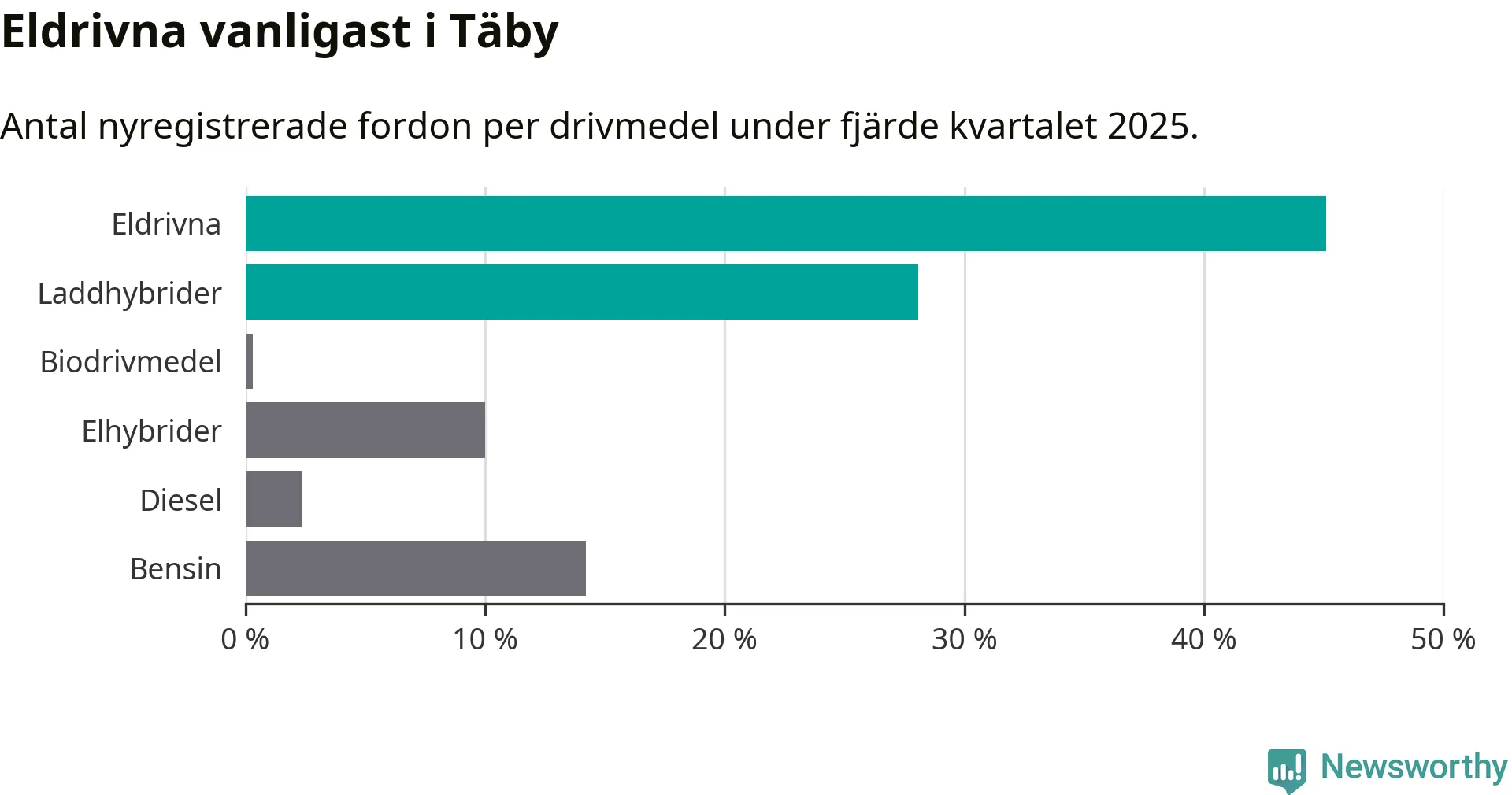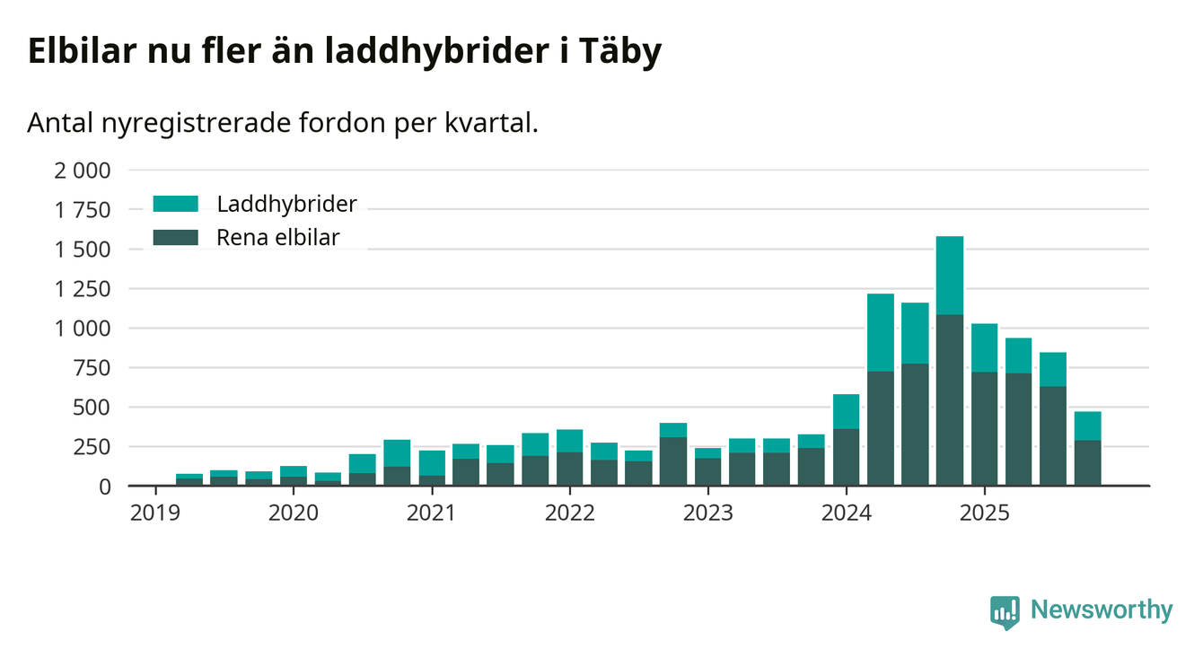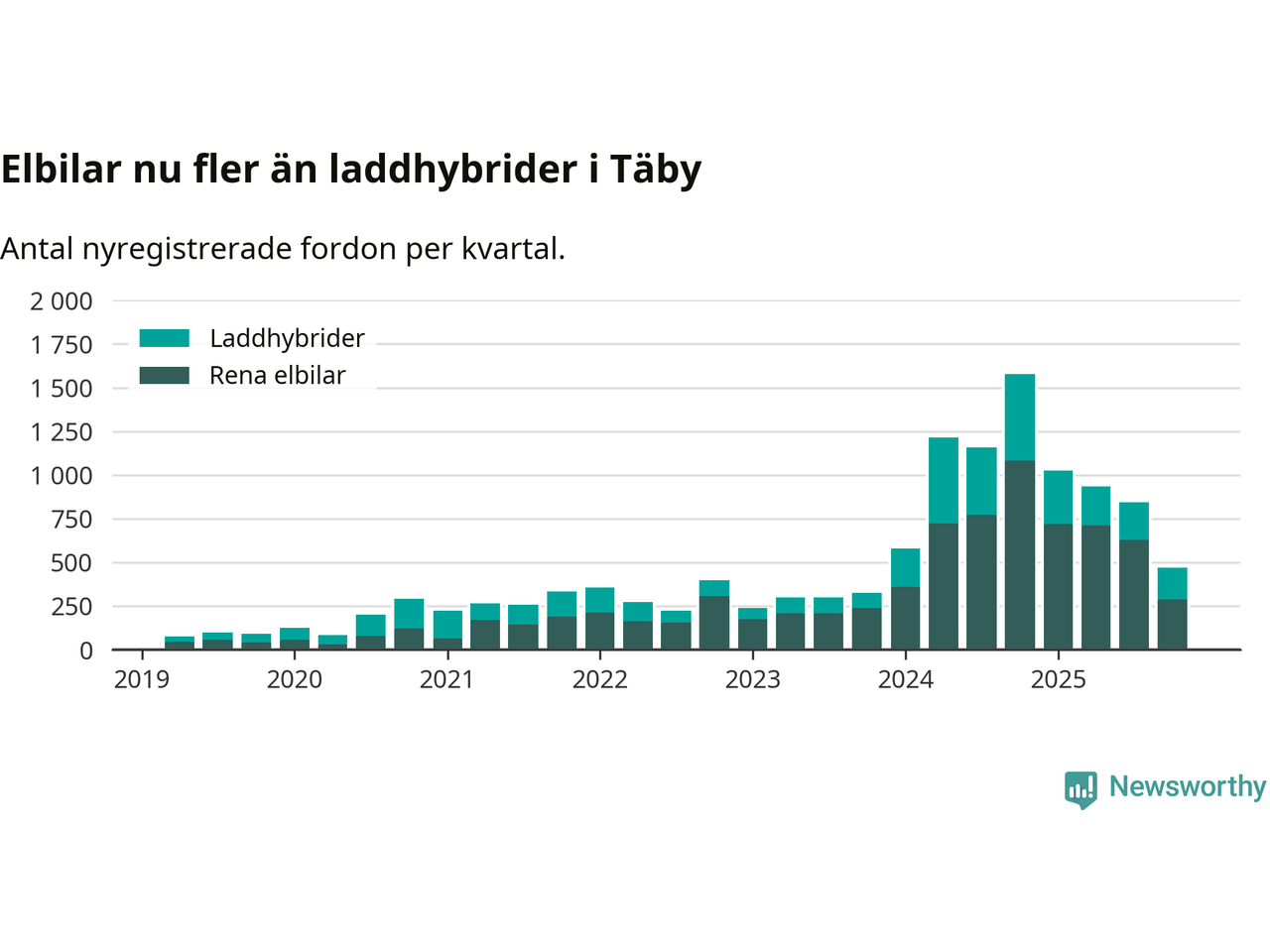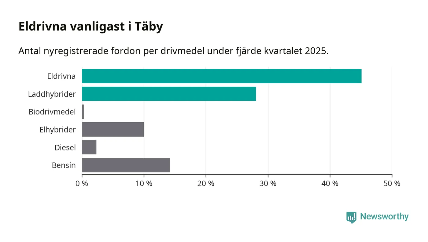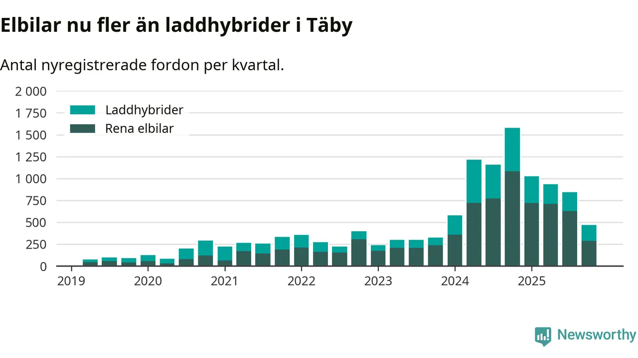 Under fjärde kvartalet 2025 var 73 procent av alla nyregistrerade personbilar i Täby laddbara (sammanlagt registrerades 641 nya bilar). Merparten av de laddbara bilarna var rena elbilar (45 procent av alla).