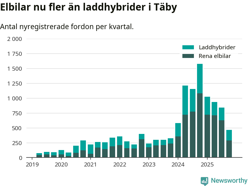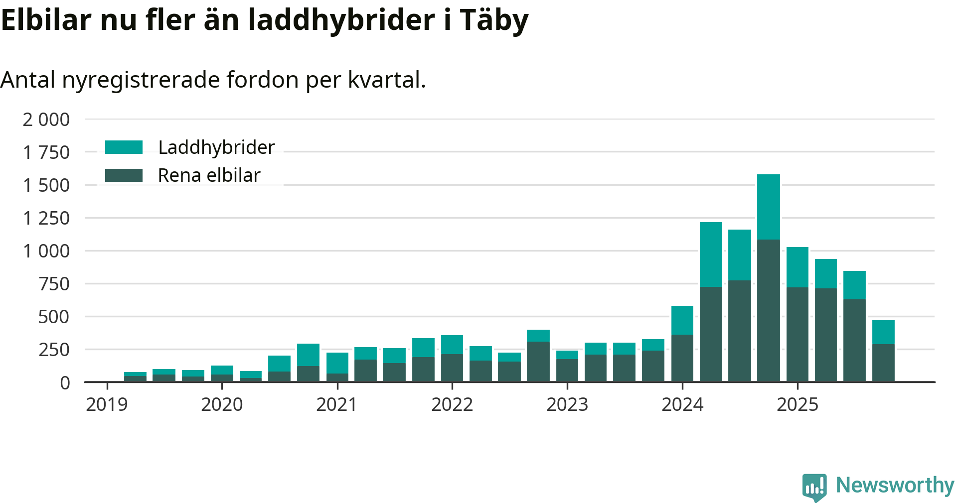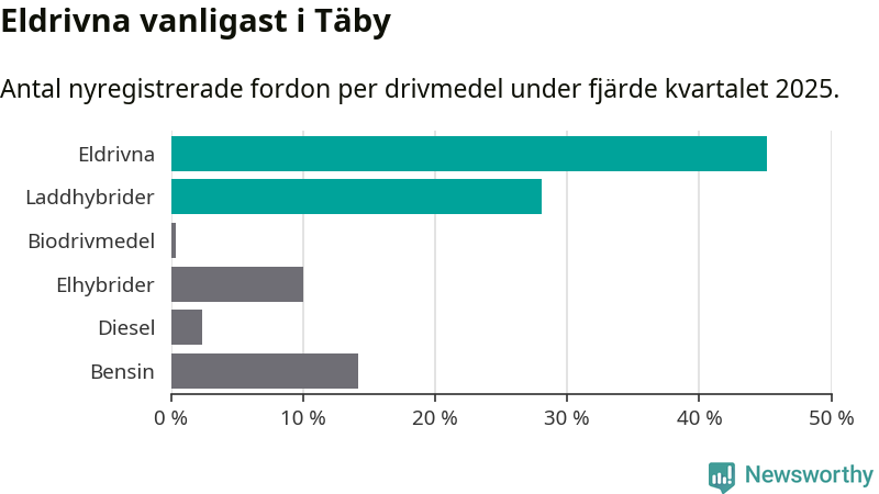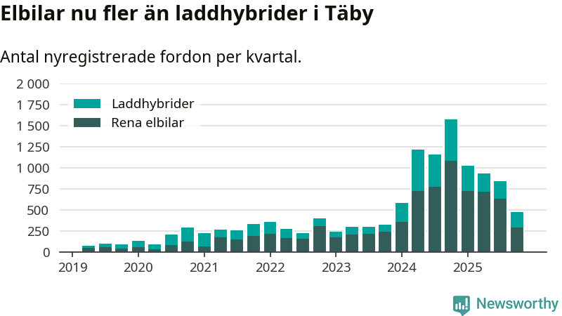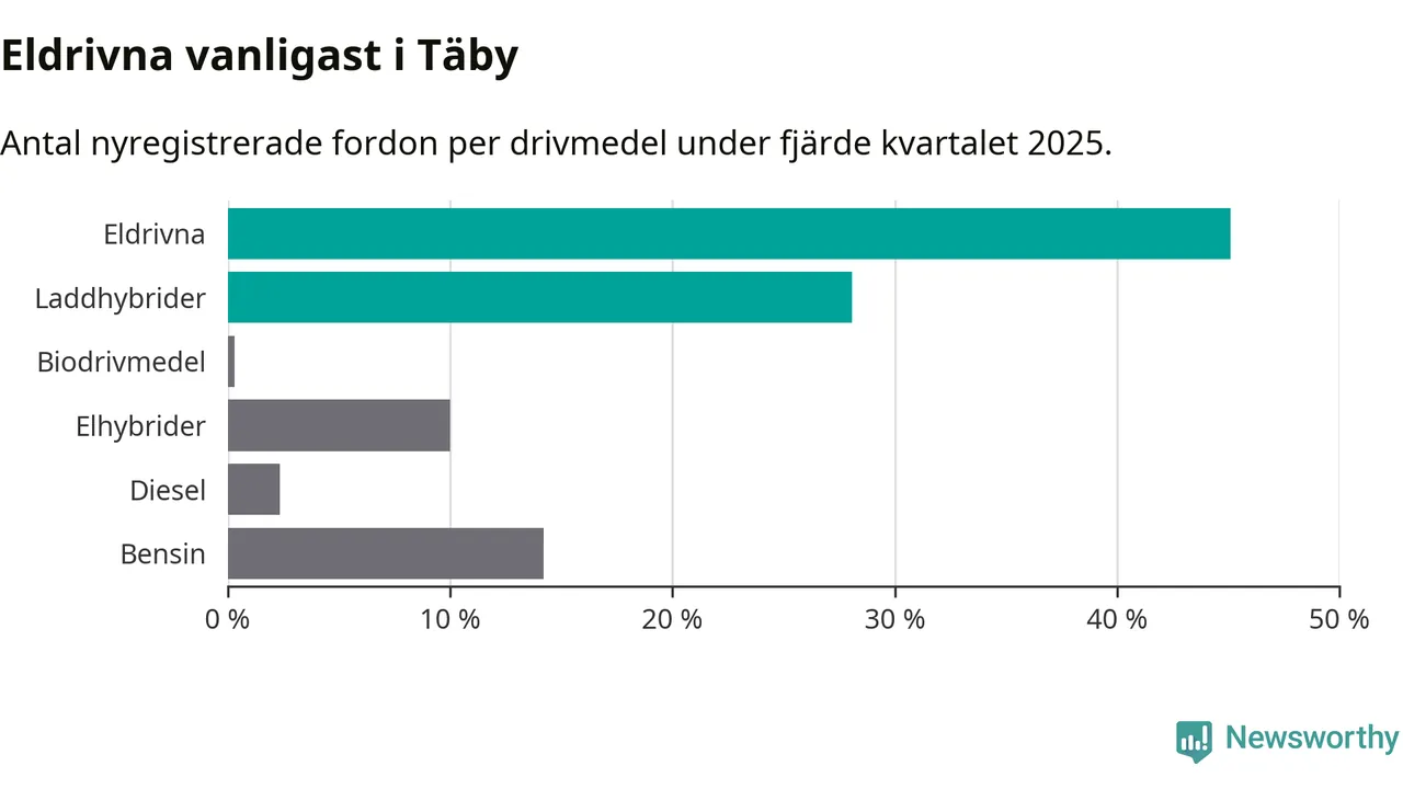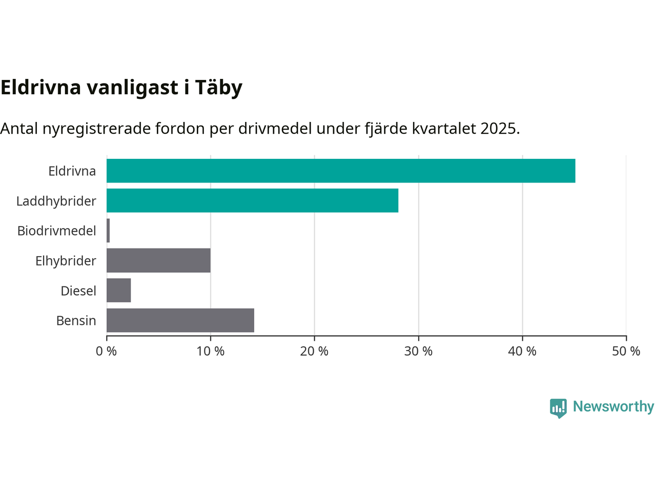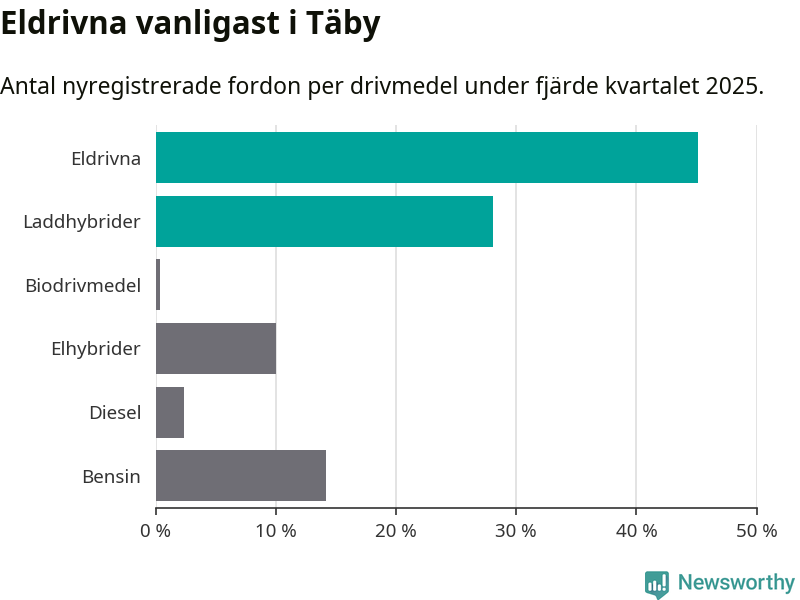 Under fjärde kvartalet 2025 var 73 procent av alla nyregistrerade personbilar i Täby laddbara (sammanlagt registrerades 641 nya bilar). Merparten av de laddbara bilarna var rena elbilar (45 procent av alla).