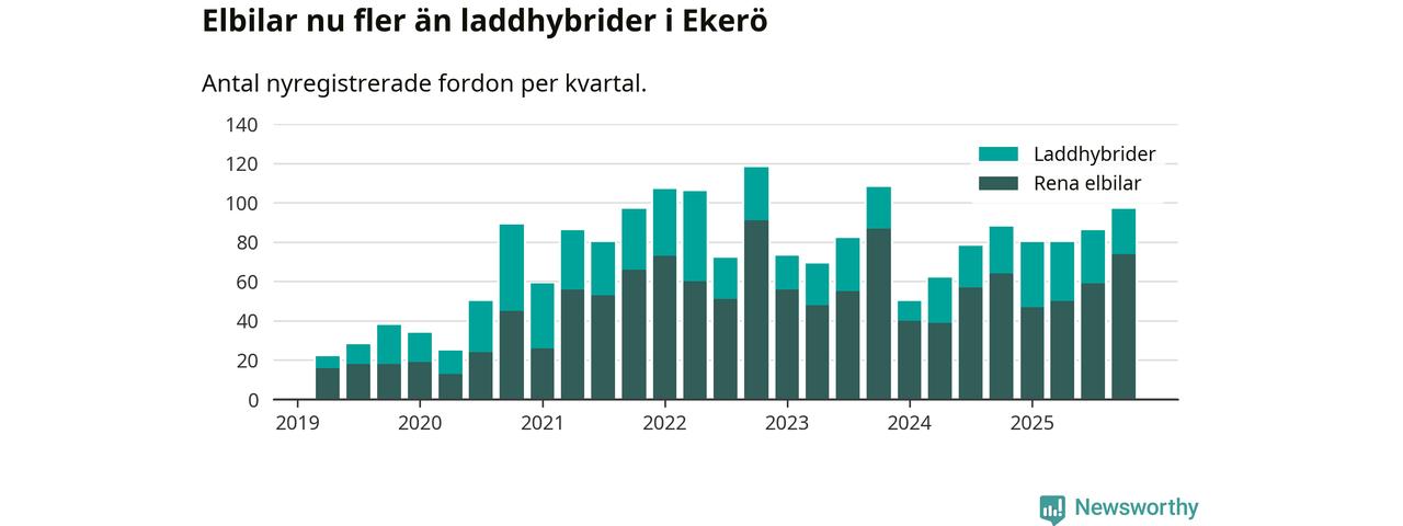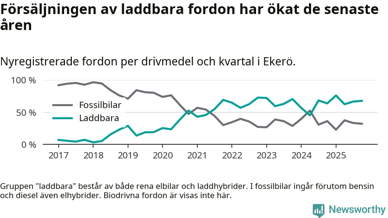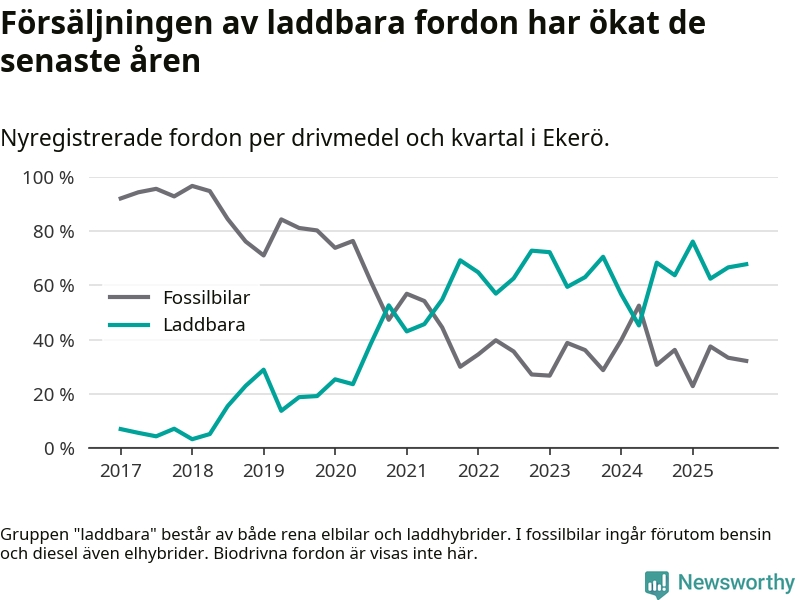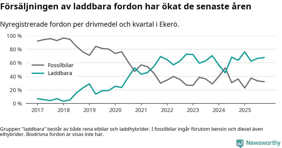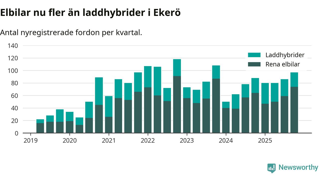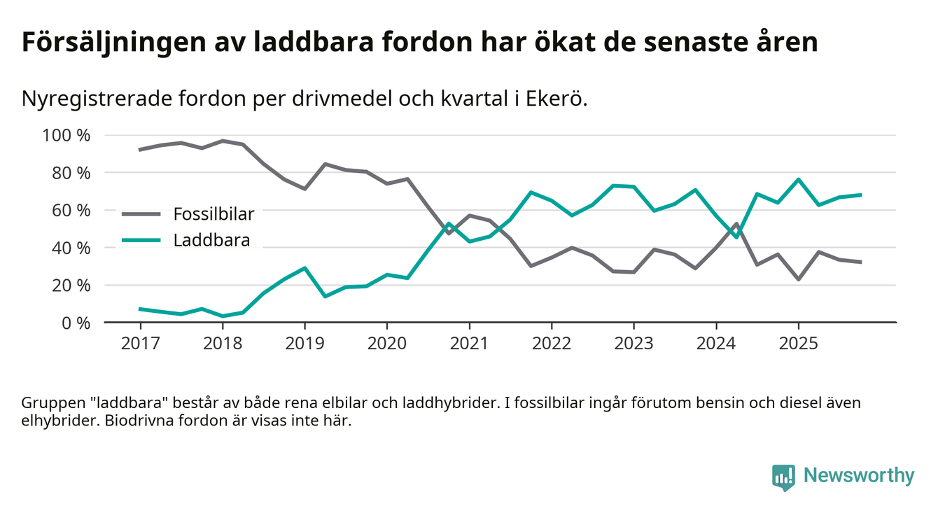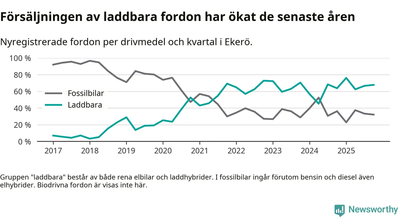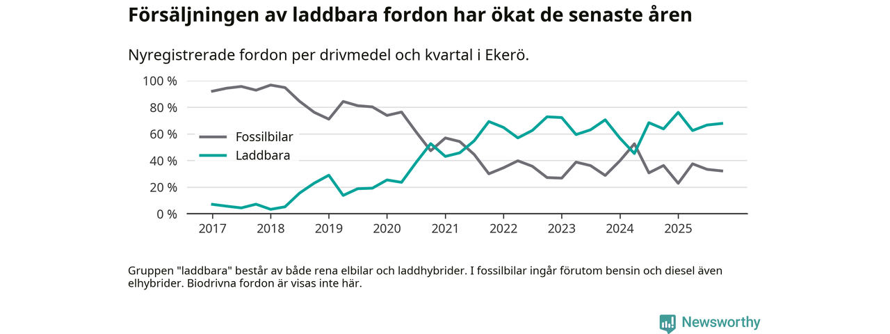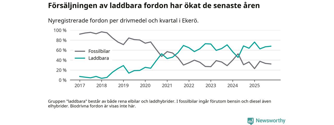 Under fjärde kvartalet 2025 var 68 procent av alla nyregistrerade personbilar i Ekerö laddbara (sammanlagt registrerades 143 nya bilar). Merparten av de laddbara bilarna var rena elbilar (52 procent av alla).