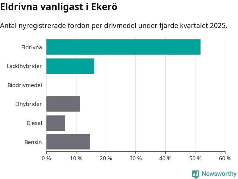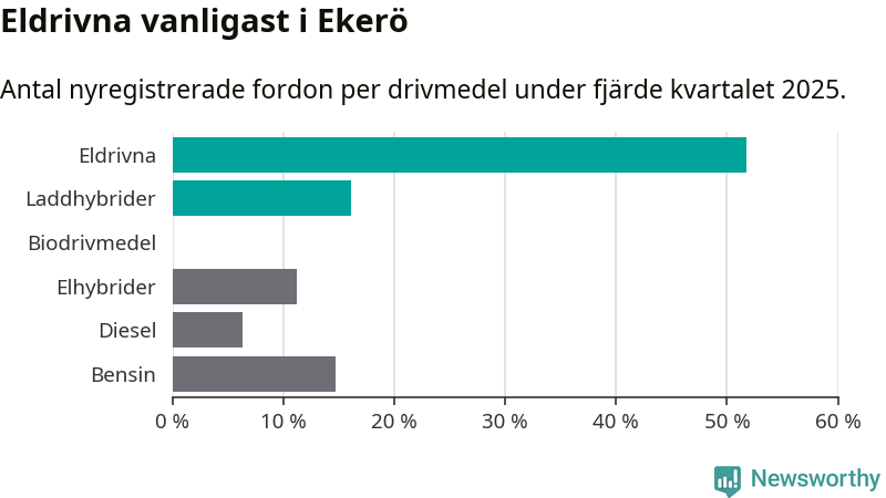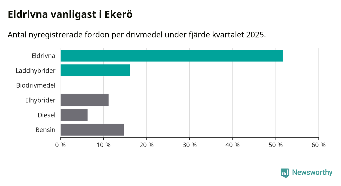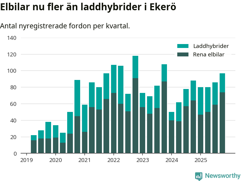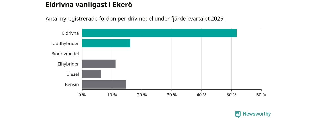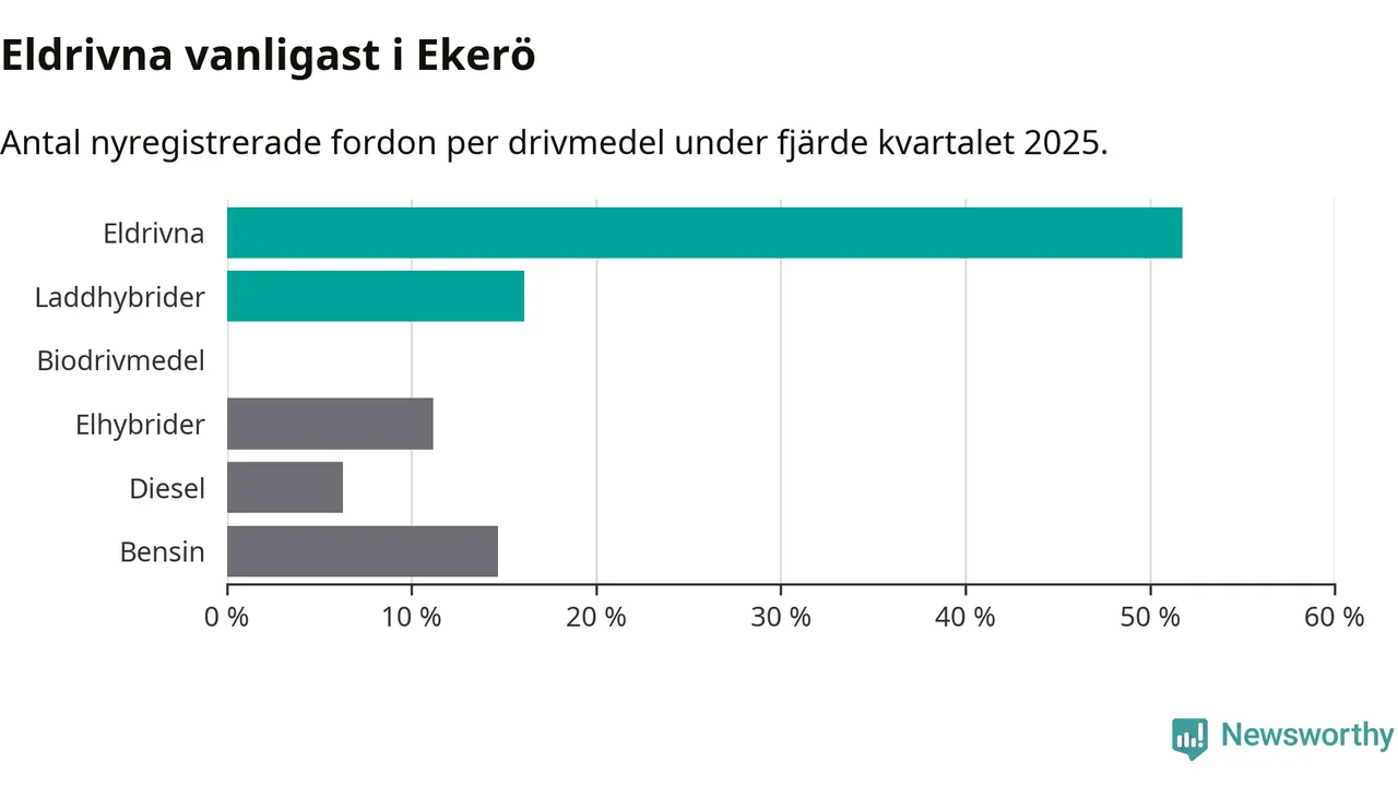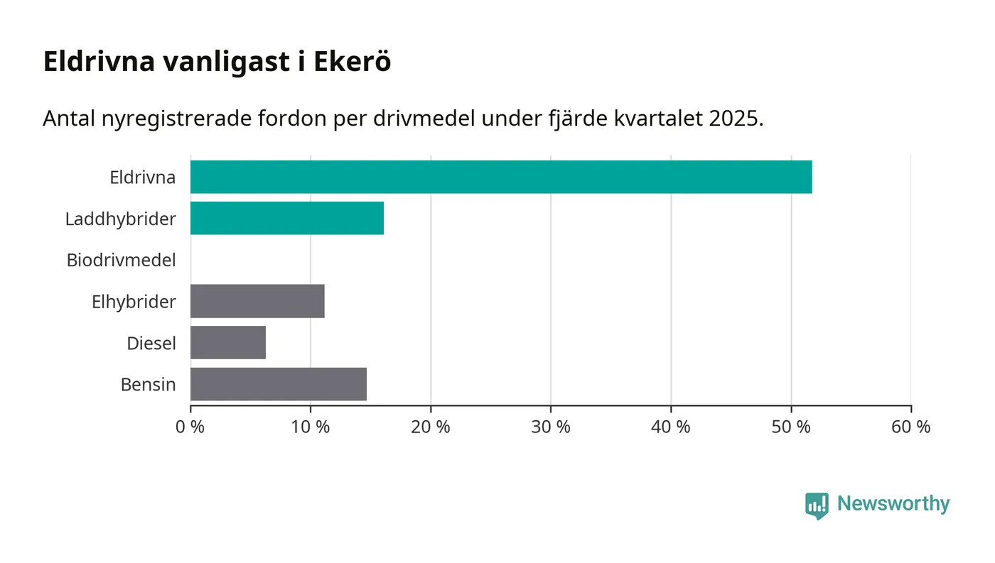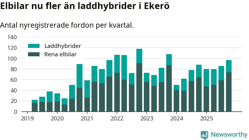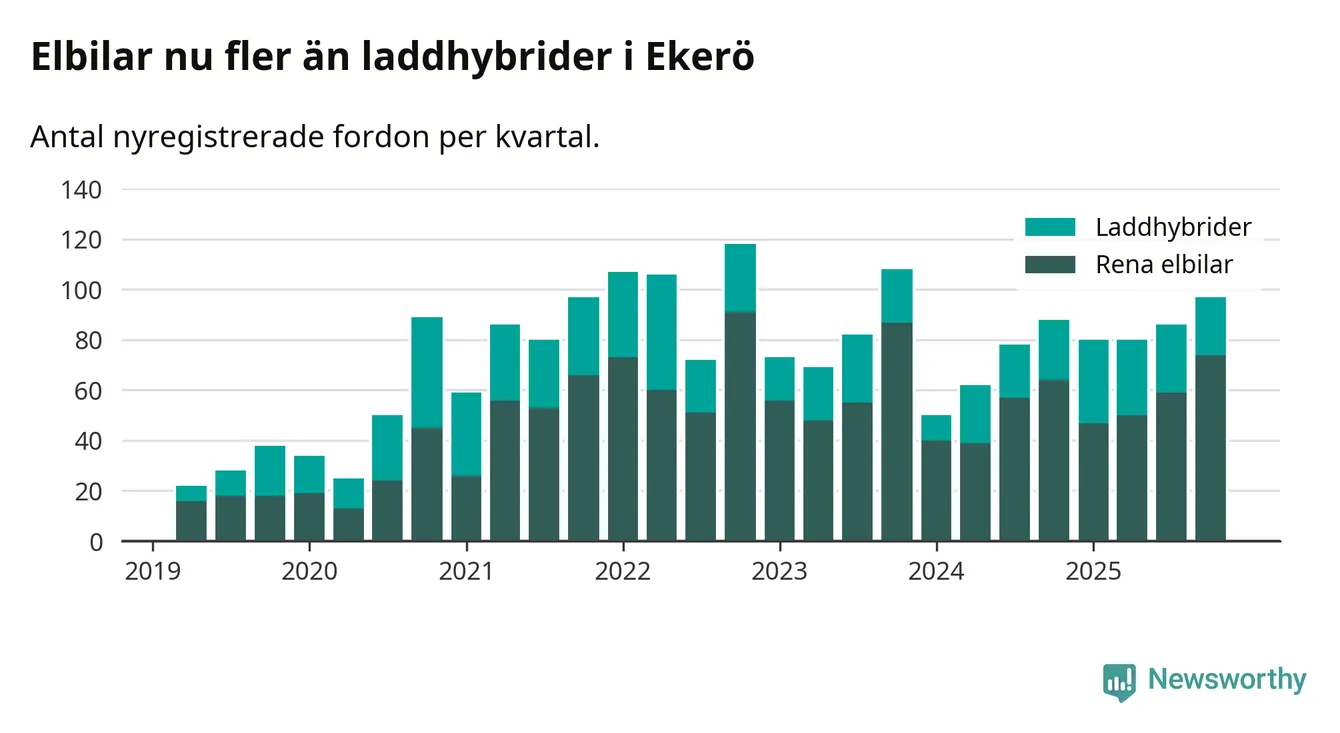 Under fjärde kvartalet 2025 var 68 procent av alla nyregistrerade personbilar i Ekerö laddbara (sammanlagt registrerades 143 nya bilar). Merparten av de laddbara bilarna var rena elbilar (52 procent av alla).