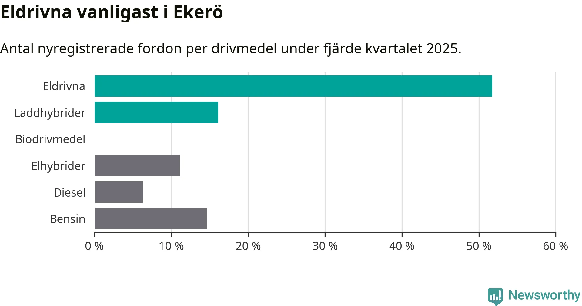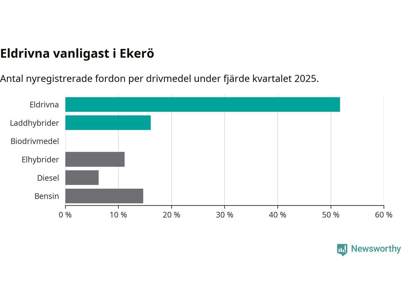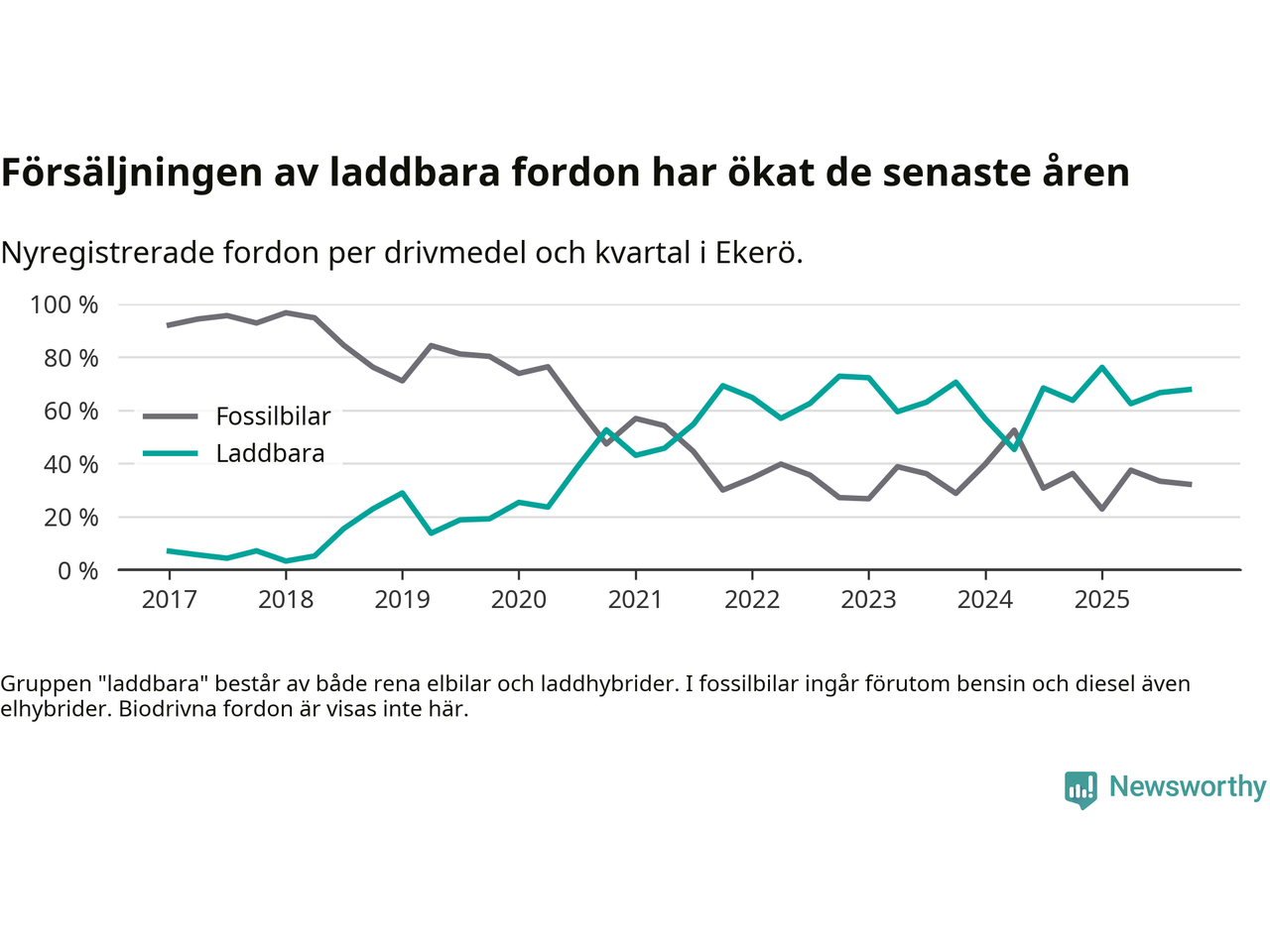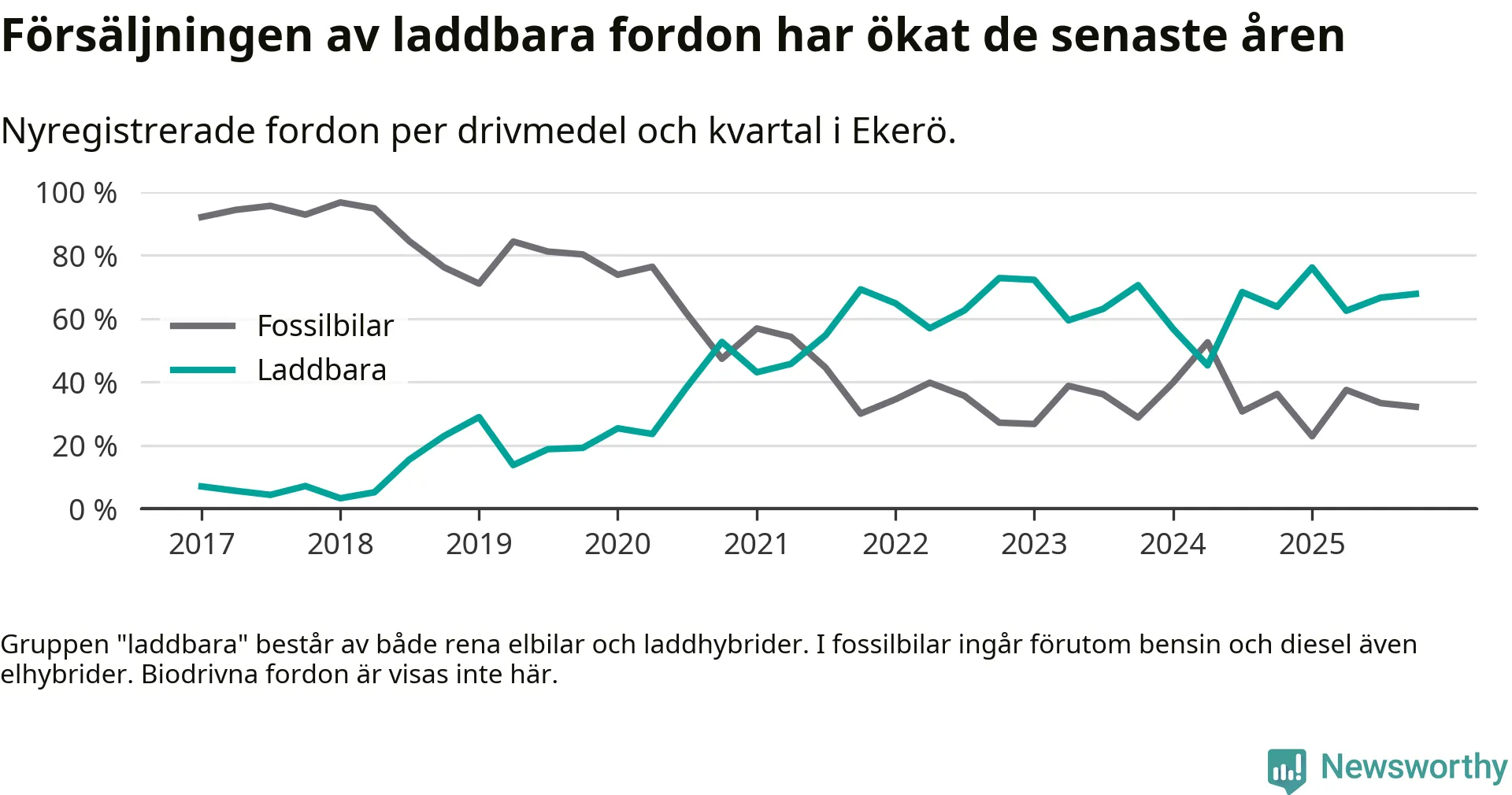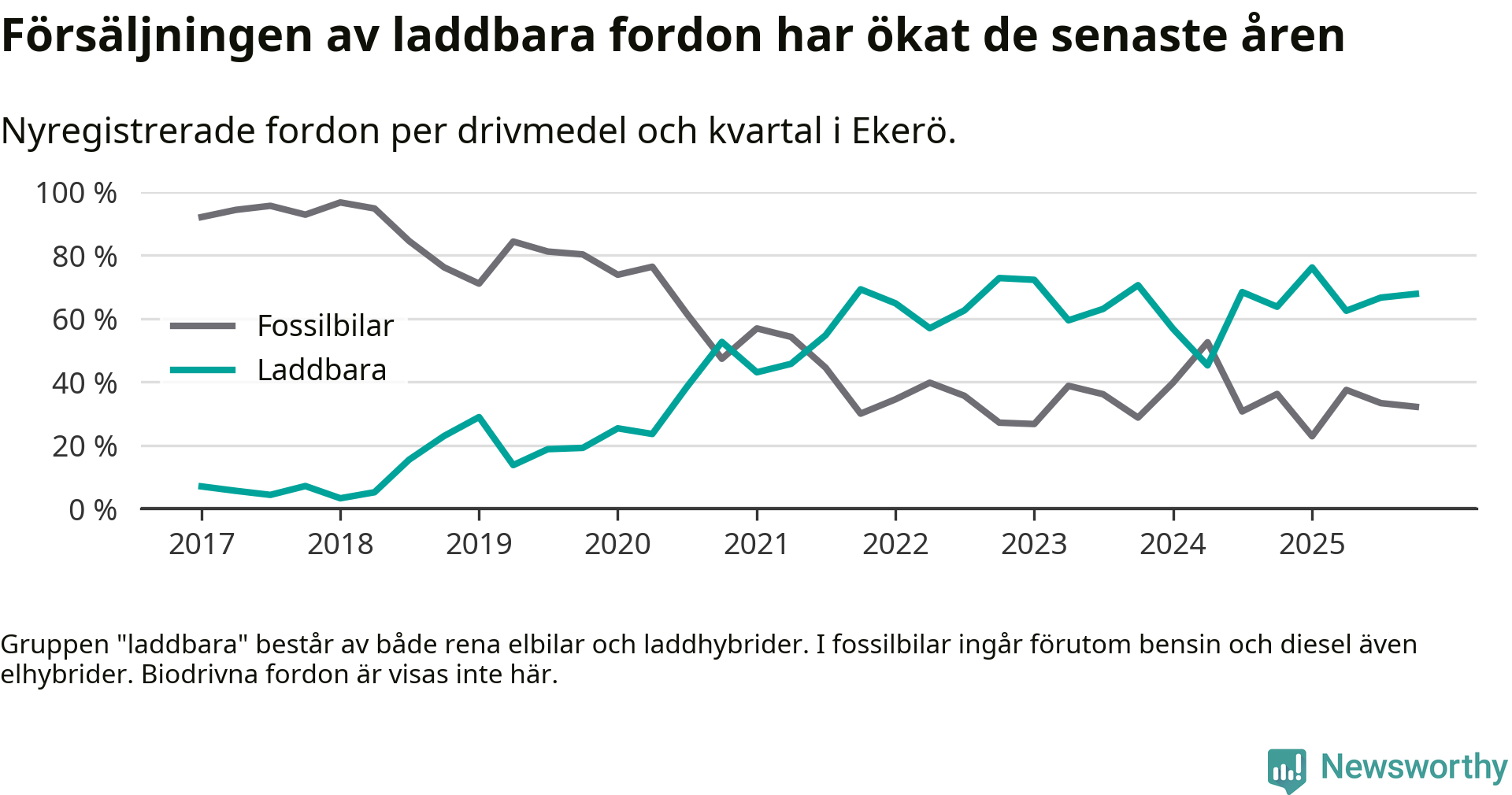 Under fjärde kvartalet 2025 var 68 procent av alla nyregistrerade personbilar i Ekerö laddbara (sammanlagt registrerades 143 nya bilar). Merparten av de laddbara bilarna var rena elbilar (52 procent av alla).