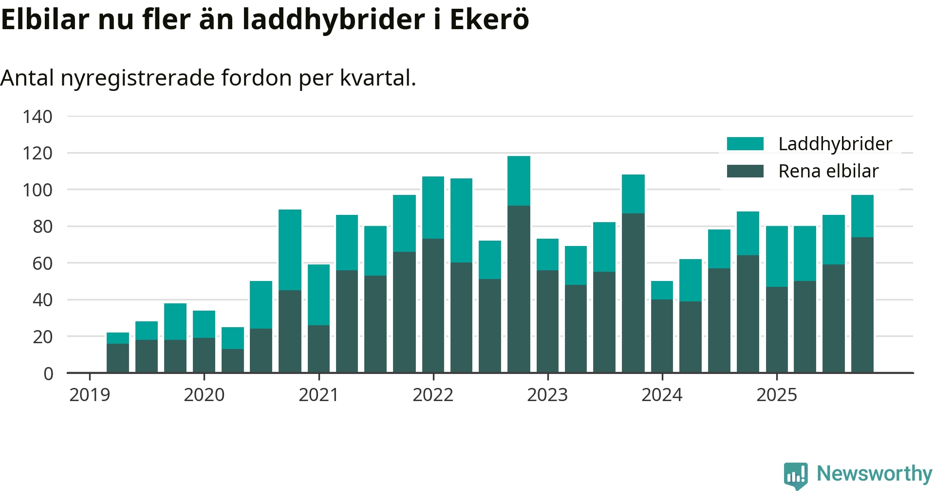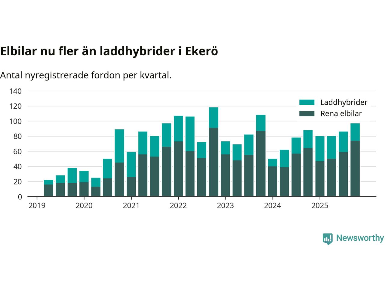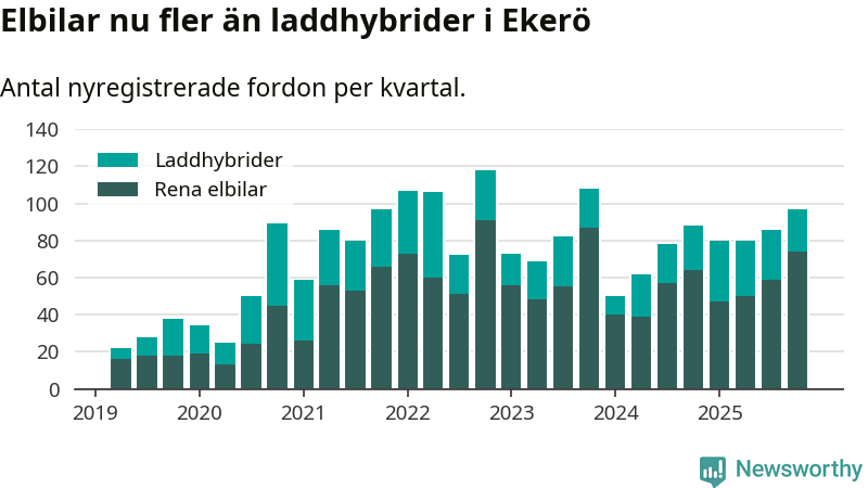 I Ekerö ökade andelen laddbara bilar under fjärde kvartalet jämfört med kvartalet innan (+1,2 procentenheter). Men elbilsregistreringen har legat ännu högre. Nyregistreringen peakade under första kvartalet 2025 då 76 procent av de nya bilarna var laddbara.