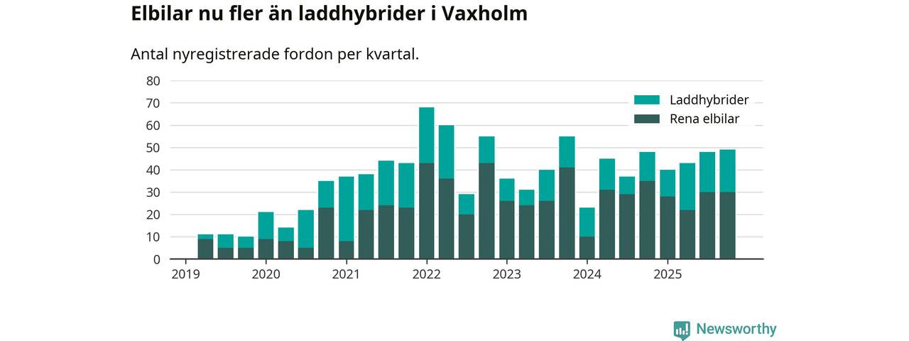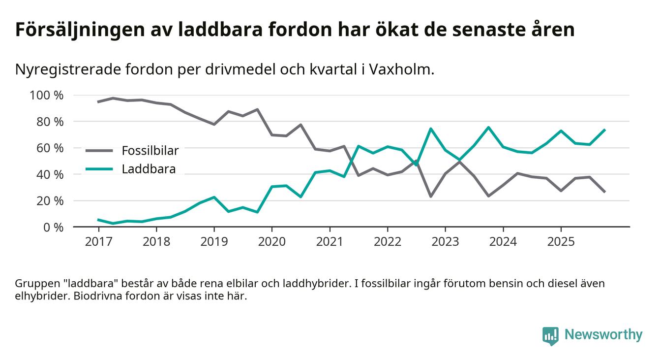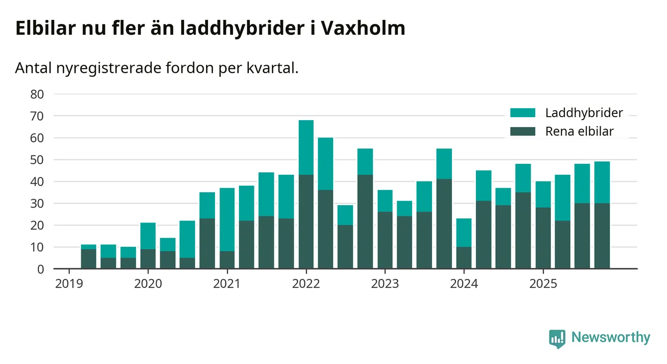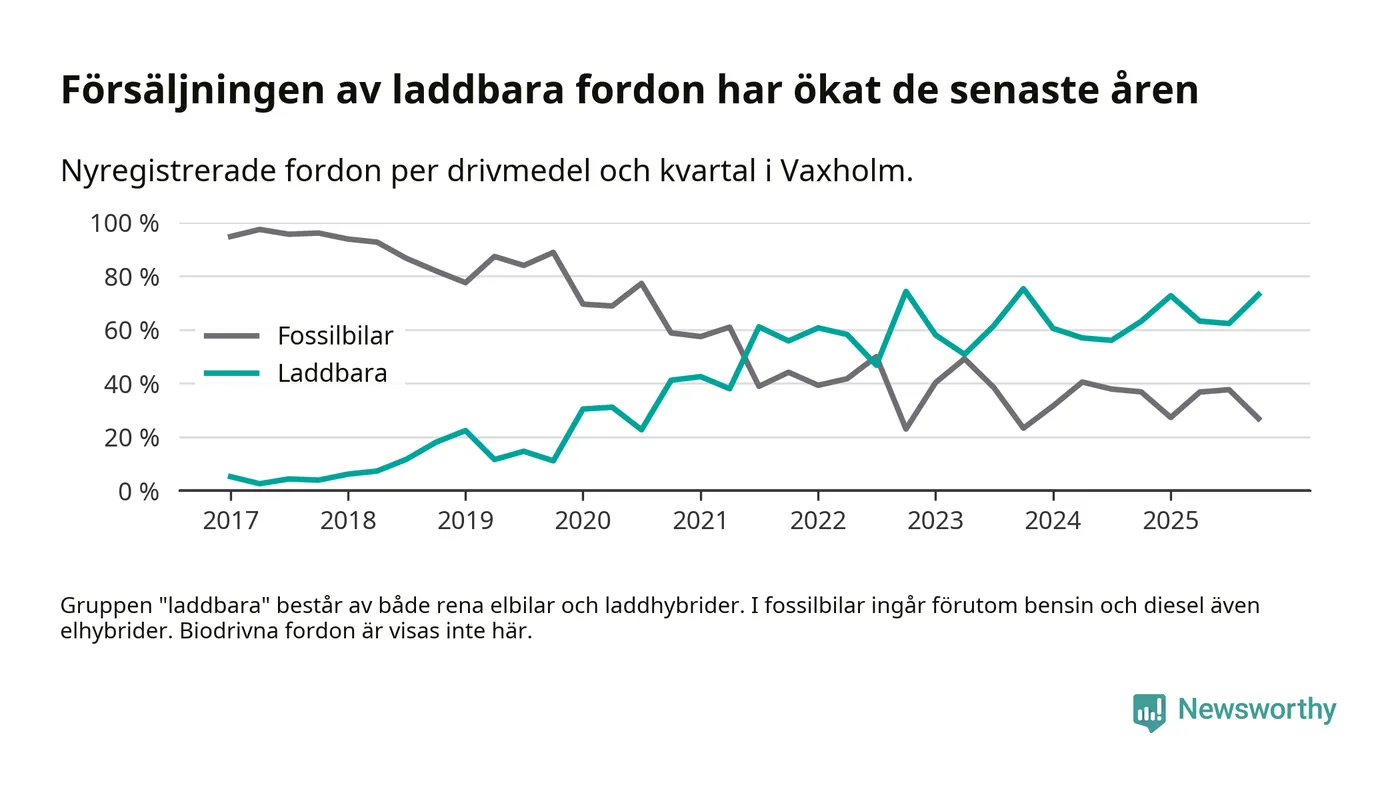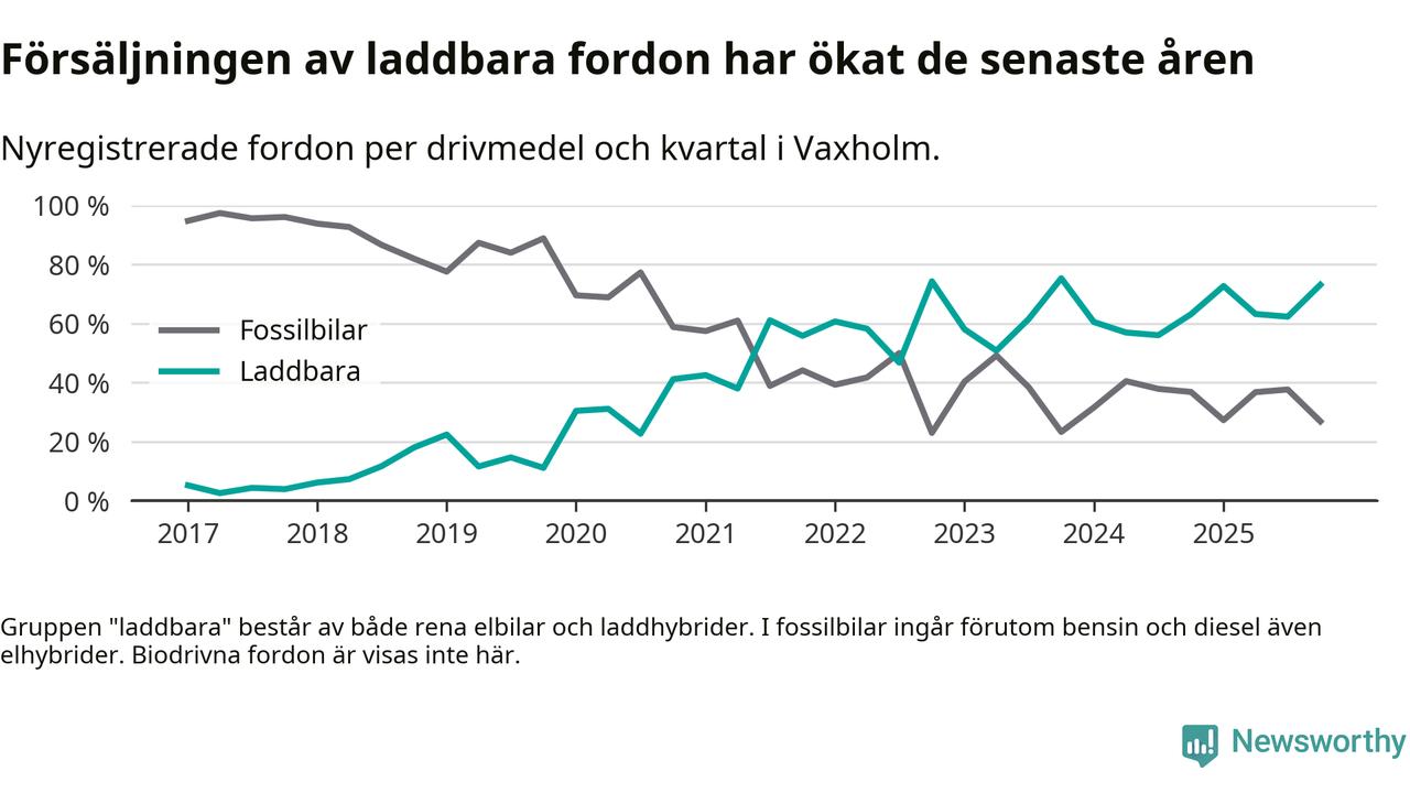 Under fjärde kvartalet 2025 var 73 procent av alla nyregistrerade personbilar i Vaxholm laddbara (sammanlagt registrerades 67 nya bilar). Merparten av de laddbara bilarna var rena elbilar (45 procent av alla).