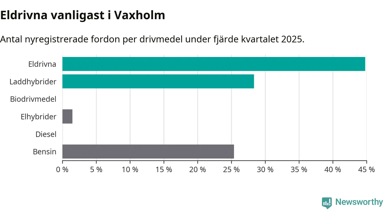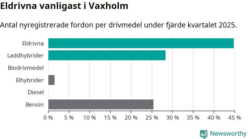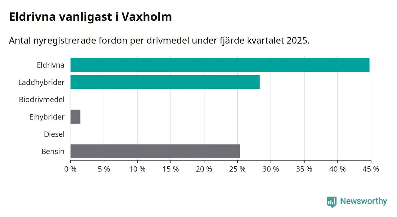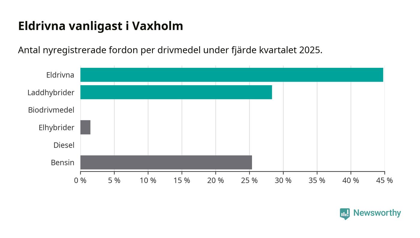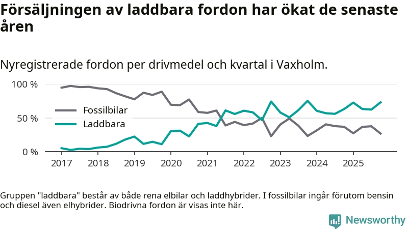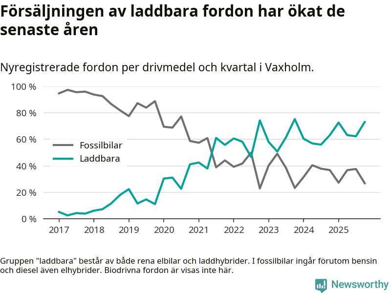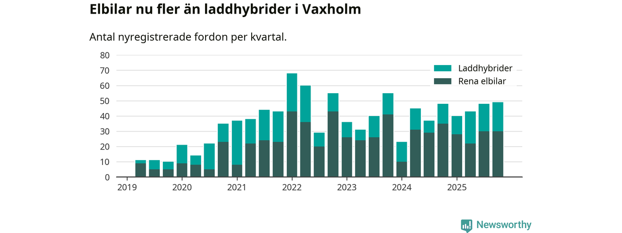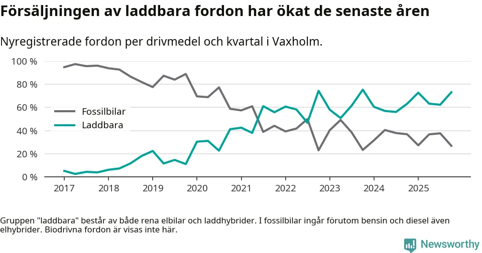 Under fjärde kvartalet 2025 var 73 procent av alla nyregistrerade personbilar i Vaxholm laddbara (sammanlagt registrerades 67 nya bilar). Merparten av de laddbara bilarna var rena elbilar (45 procent av alla).