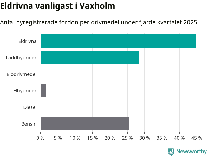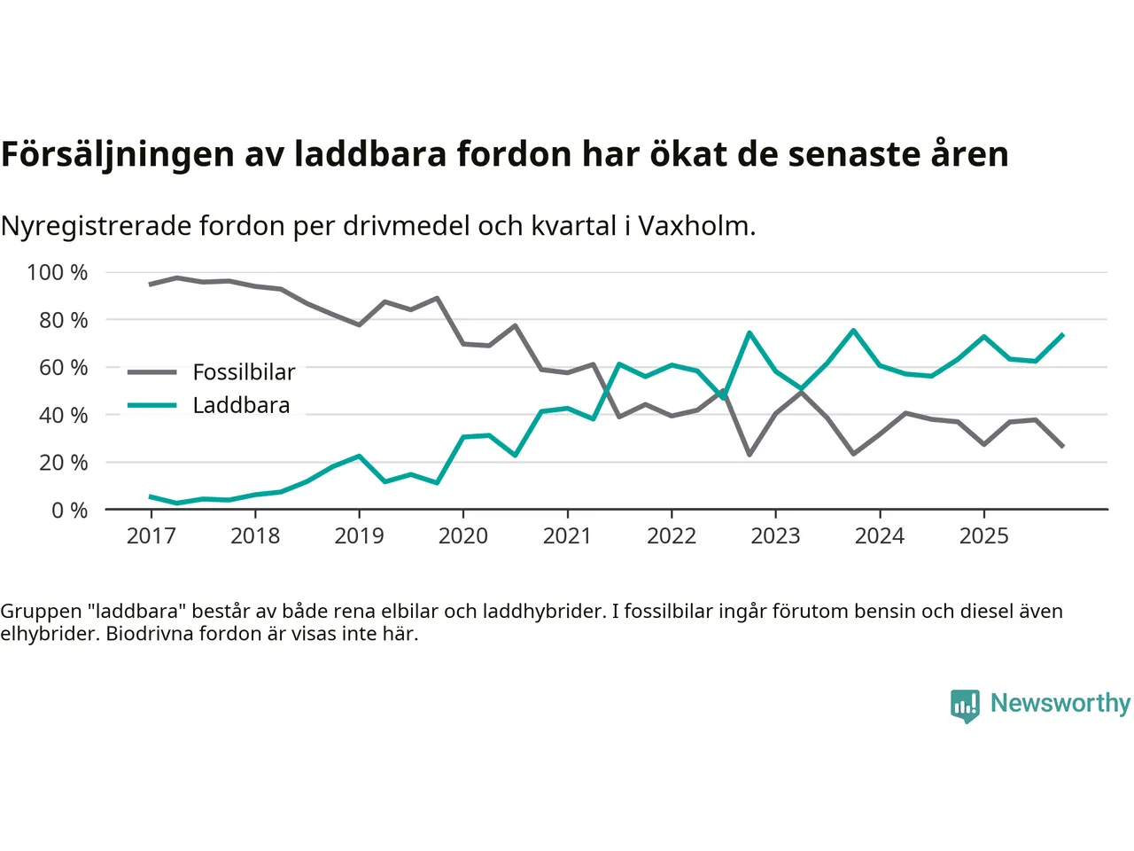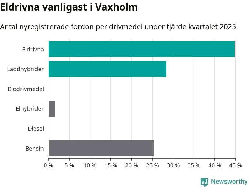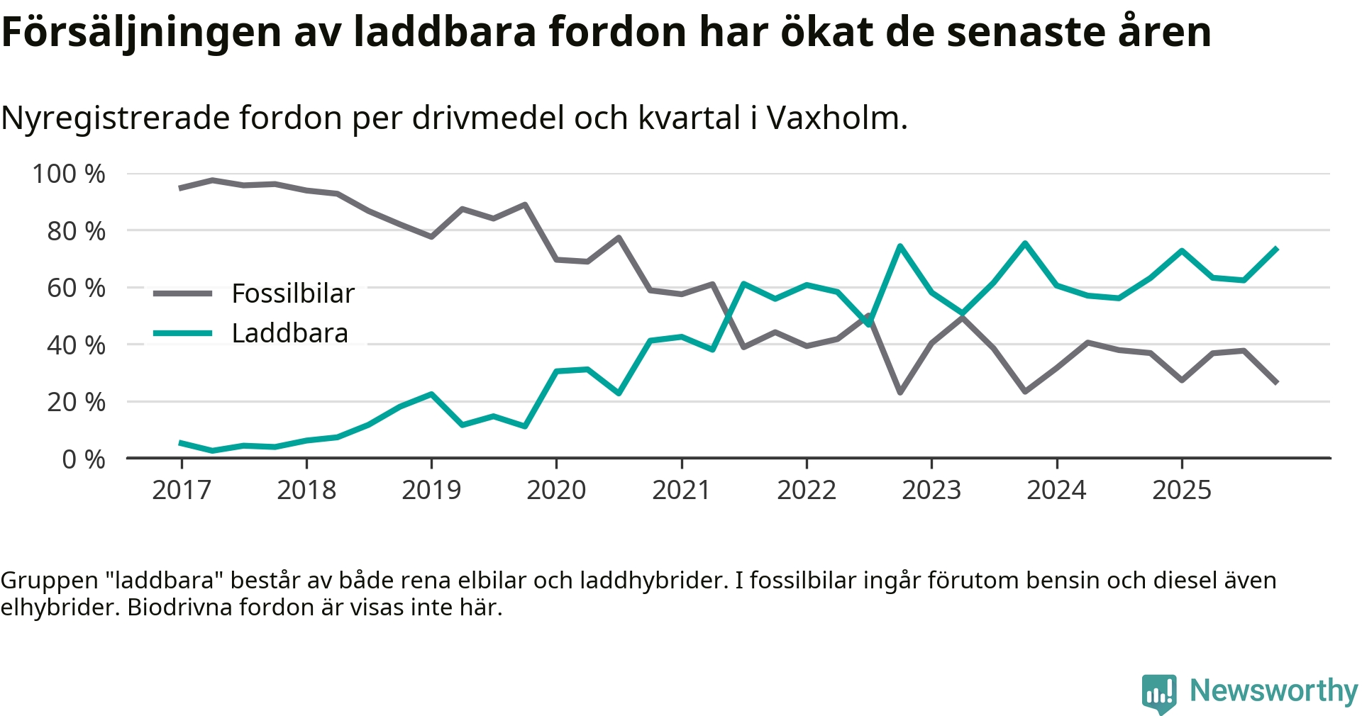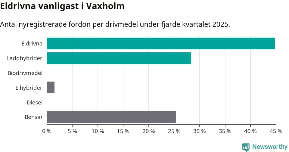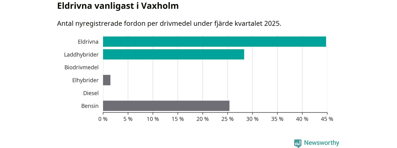 Under fjärde kvartalet 2025 var 73 procent av alla nyregistrerade personbilar i Vaxholm laddbara (sammanlagt registrerades 67 nya bilar). Merparten av de laddbara bilarna var rena elbilar (45 procent av alla).