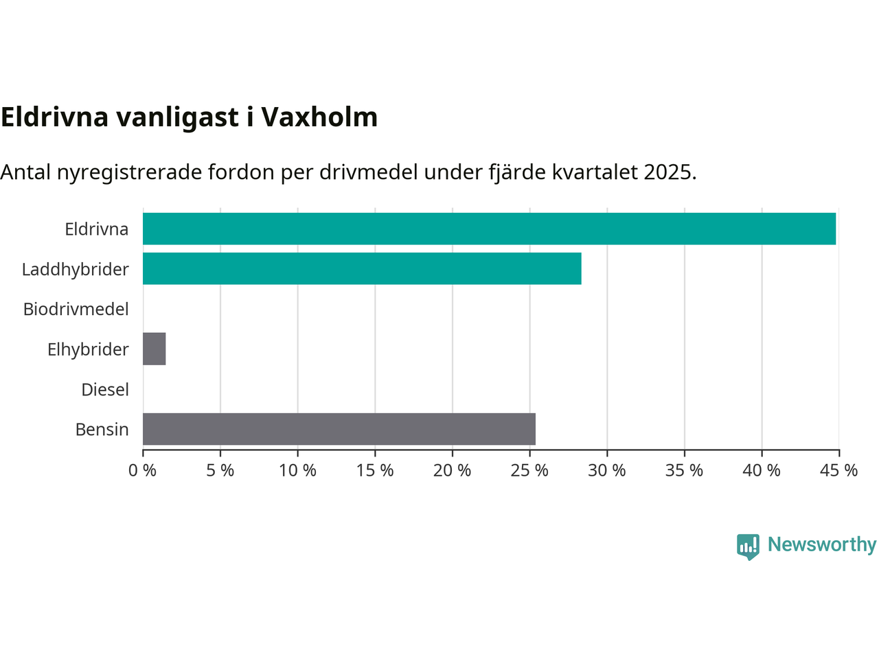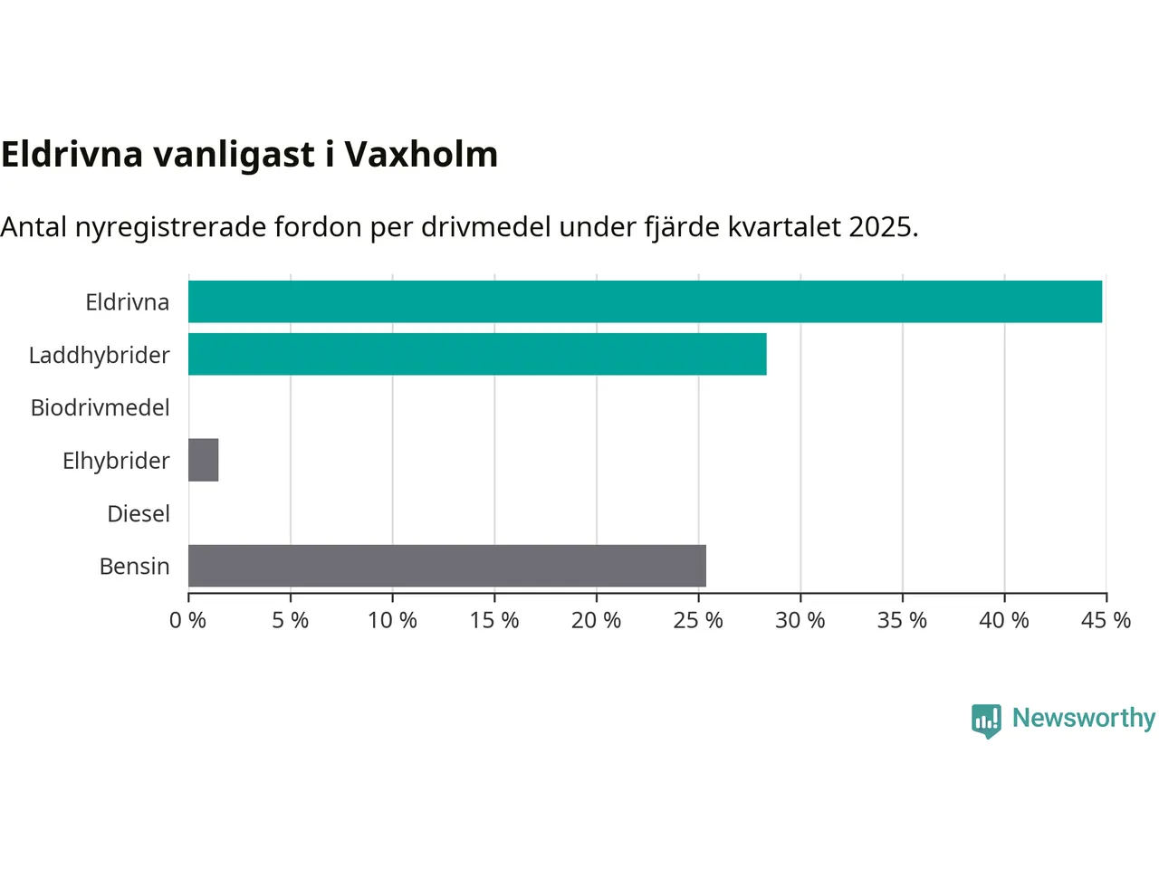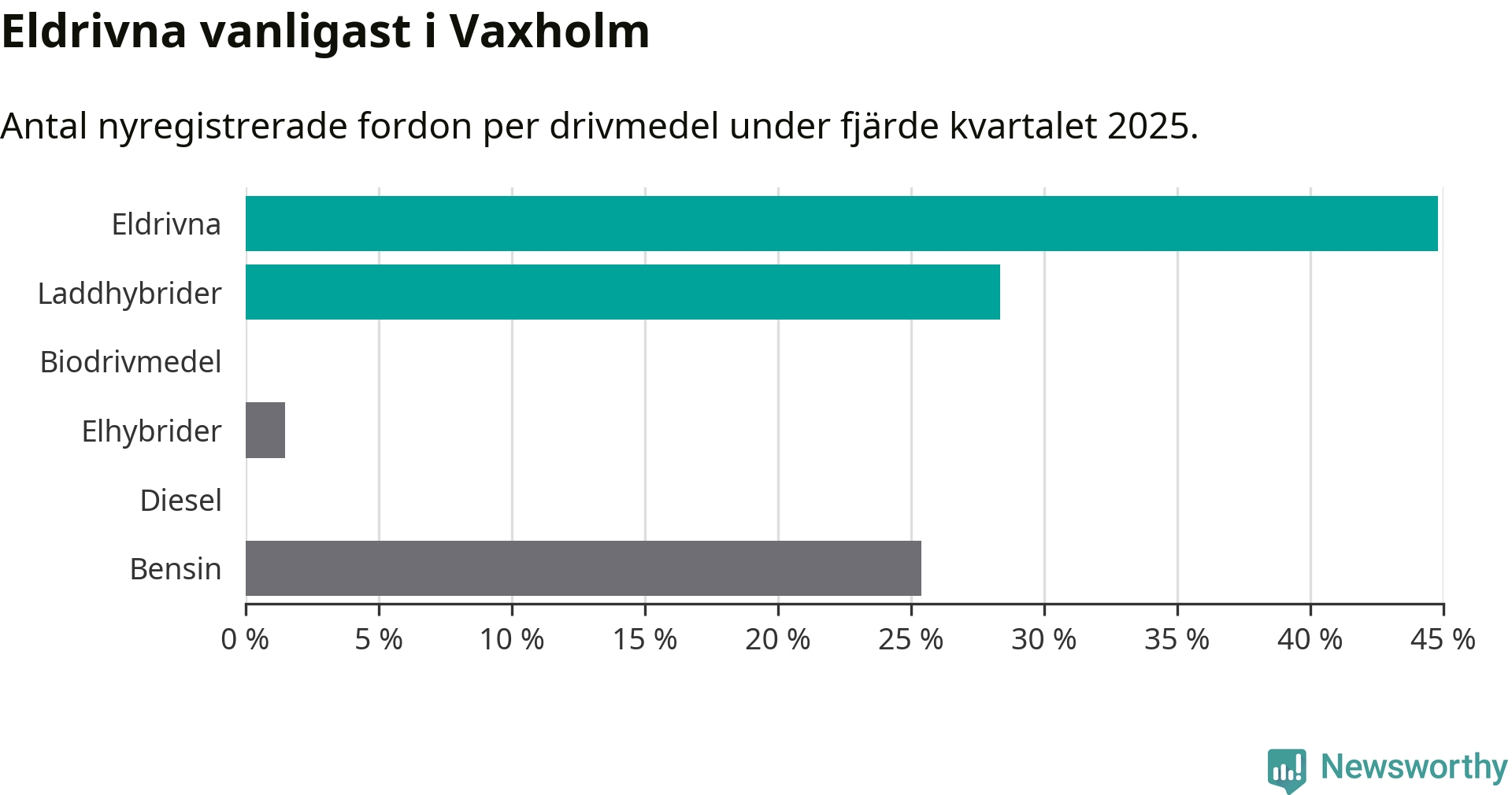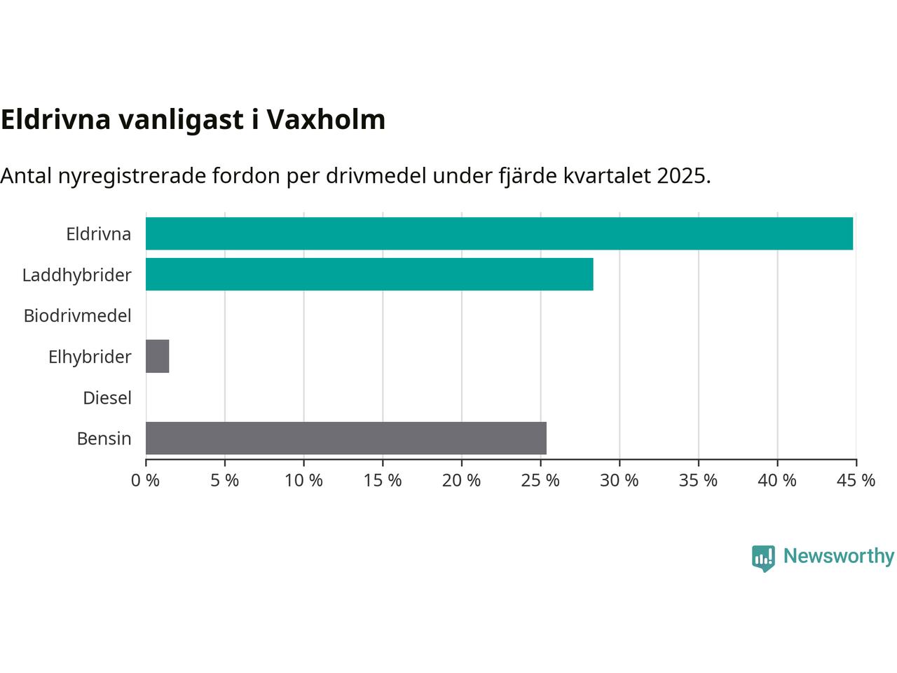 Under fjärde kvartalet 2025 var 73 procent av alla nyregistrerade personbilar i Vaxholm laddbara (sammanlagt registrerades 67 nya bilar). Merparten av de laddbara bilarna var rena elbilar (45 procent av alla).