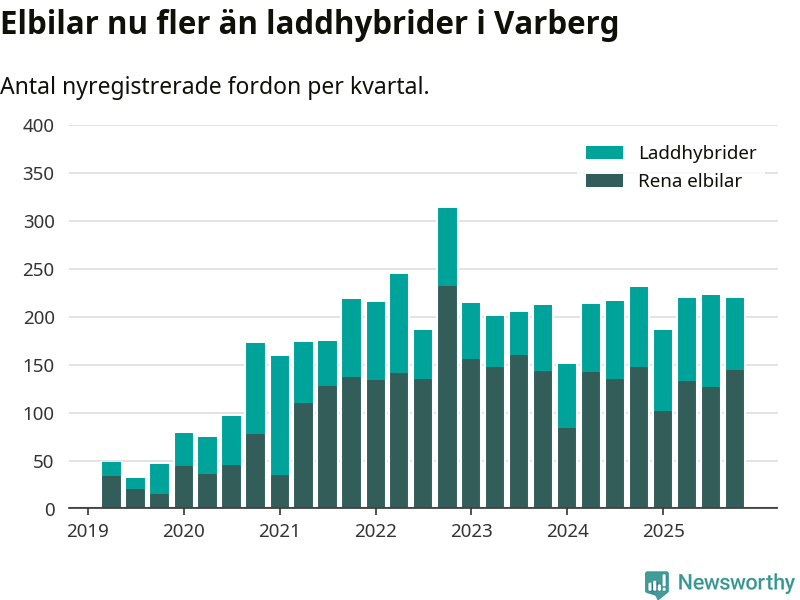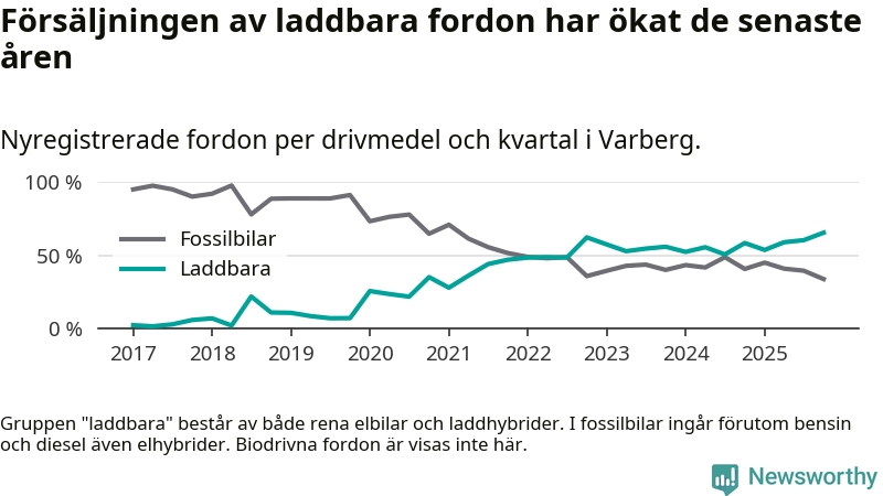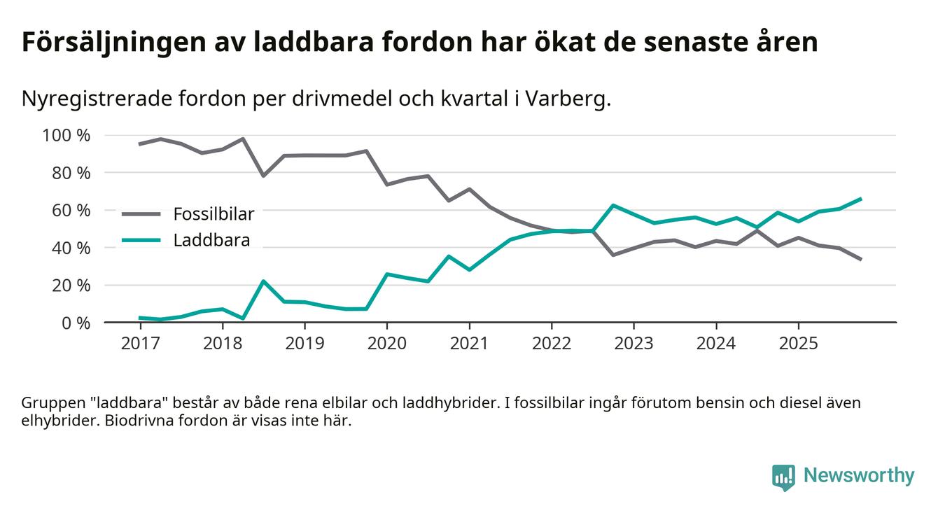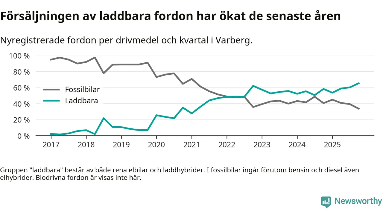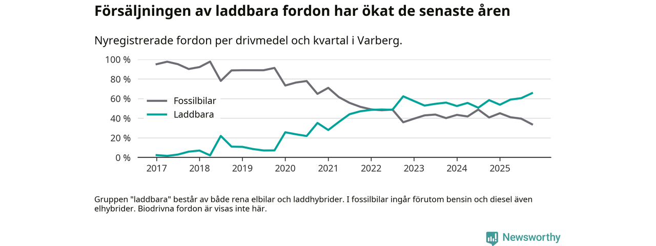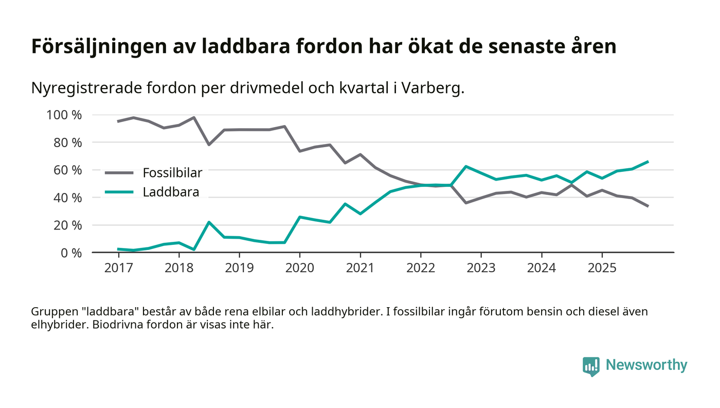Under fjärde kvartalet 2025 var 66 procent av alla nyregistrerade personbilar i Varberg laddbara (sammanlagt registrerades 334 nya bilar). Merparten av de laddbara bilarna var rena elbilar (43 procent av alla).