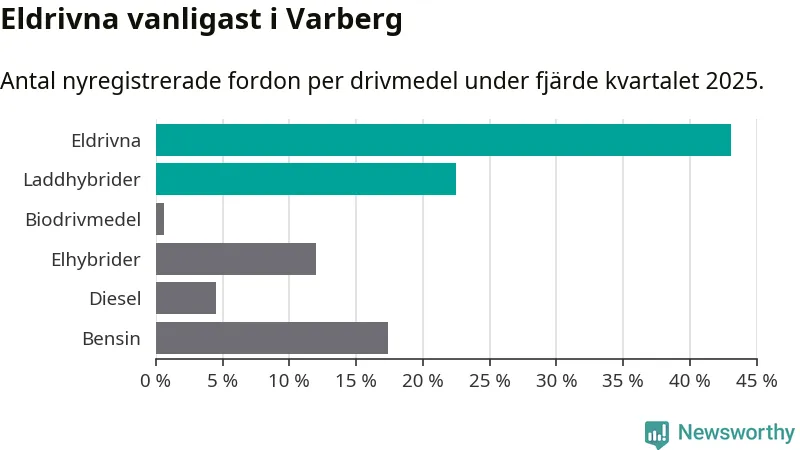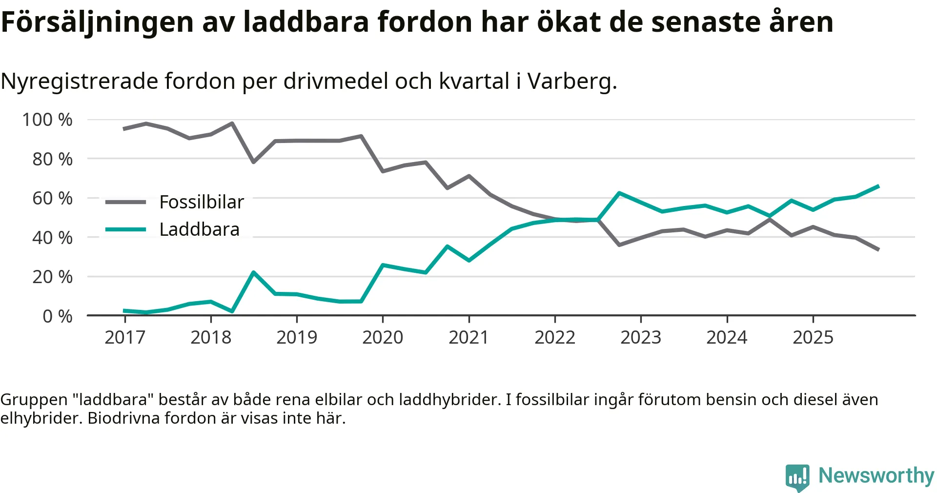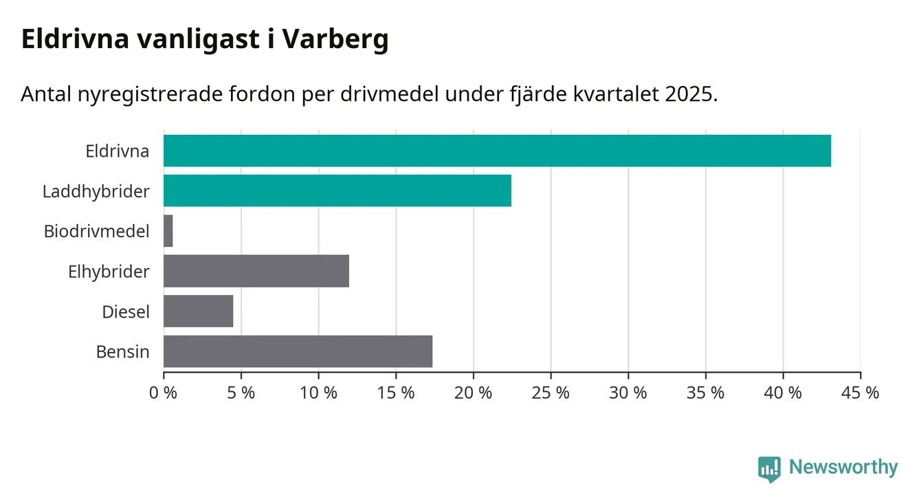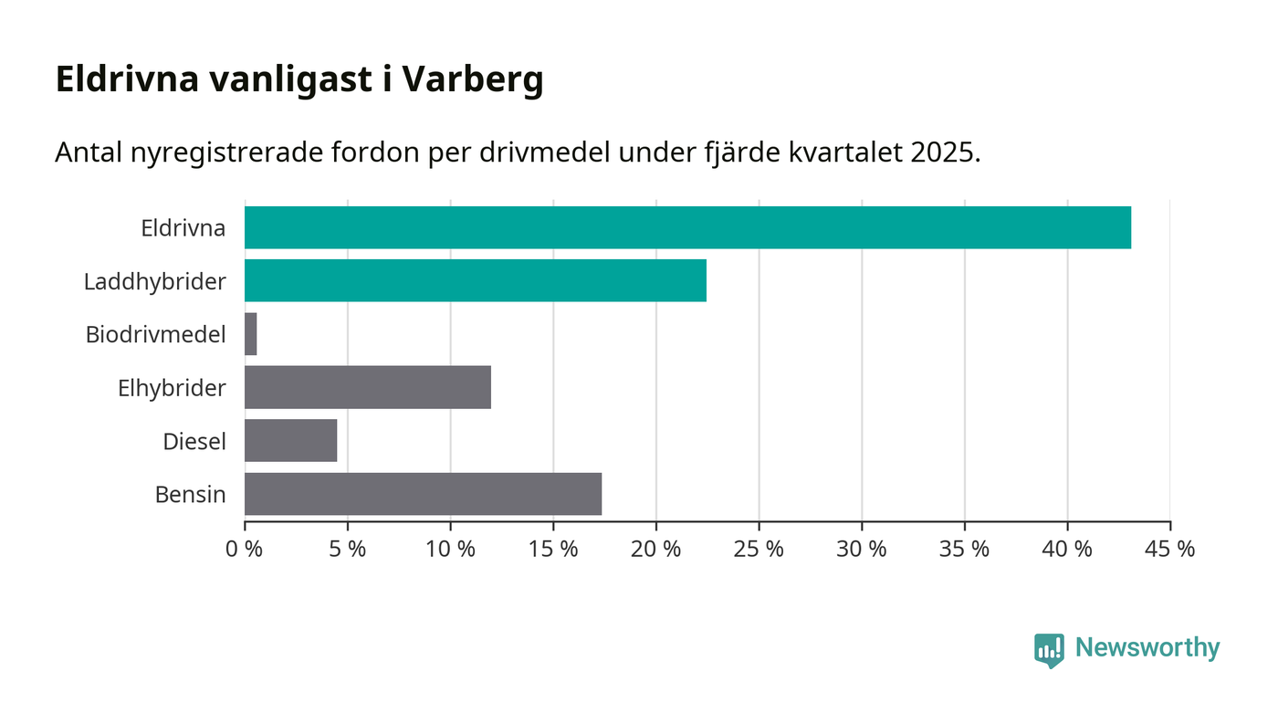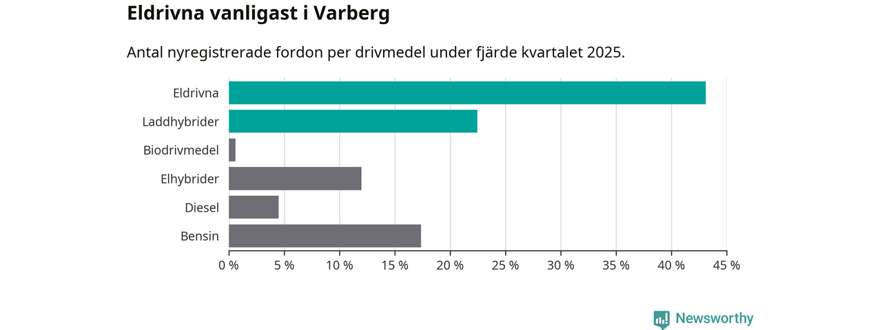 Under fjärde kvartalet 2025 var 66 procent av alla nyregistrerade personbilar i Varberg laddbara (sammanlagt registrerades 334 nya bilar). Merparten av de laddbara bilarna var rena elbilar (43 procent av alla).