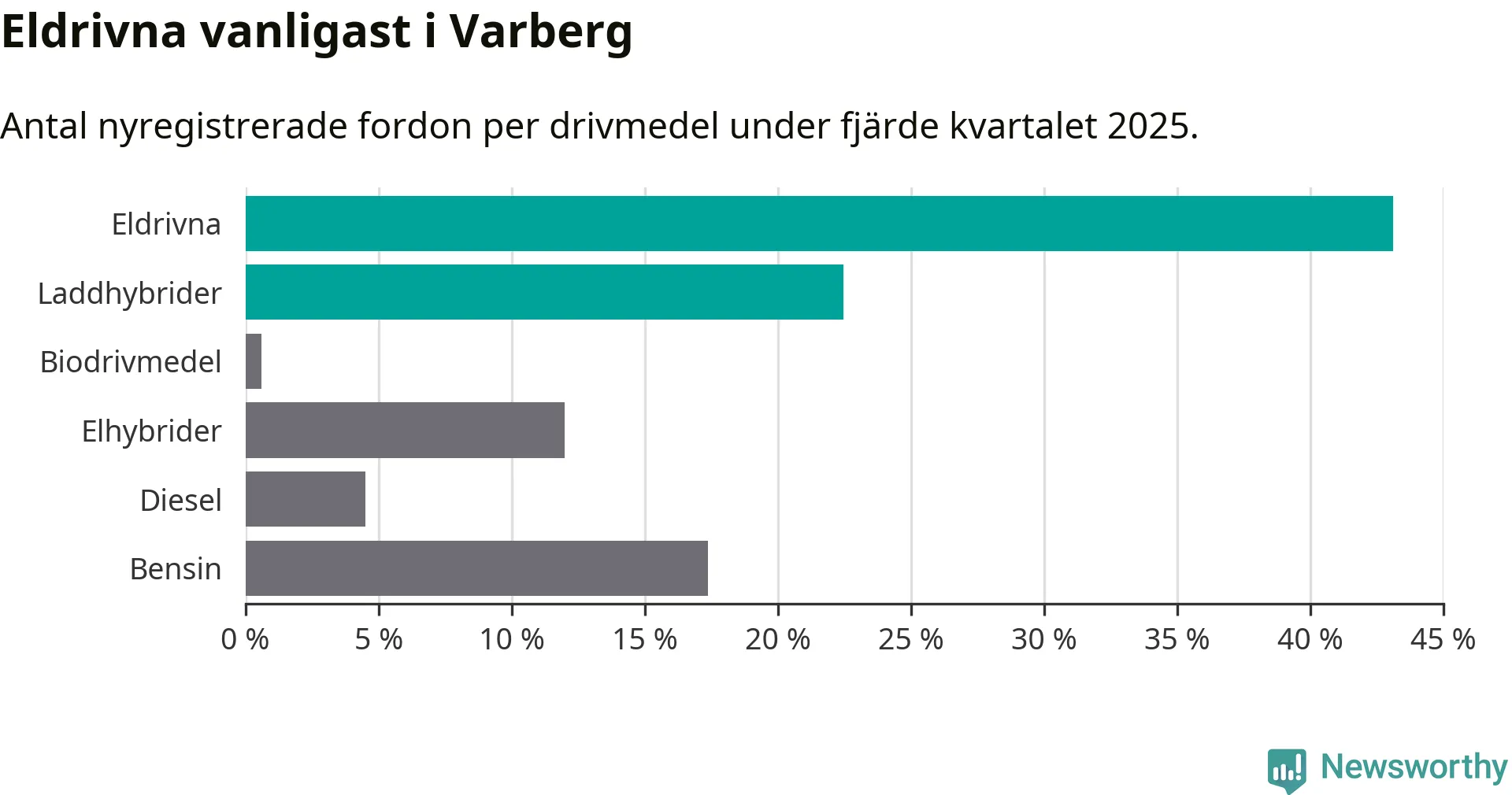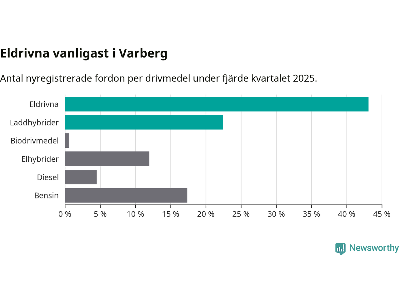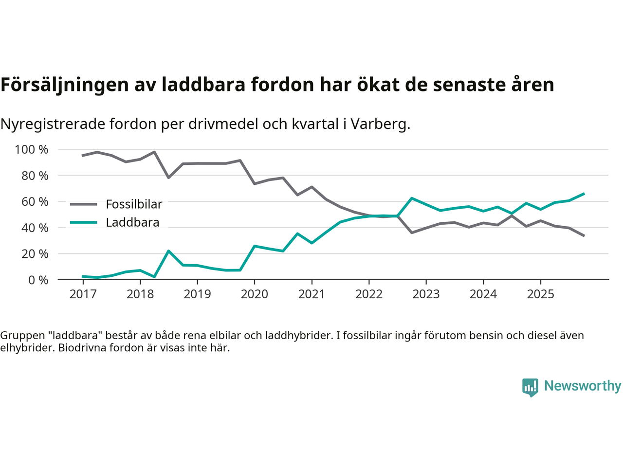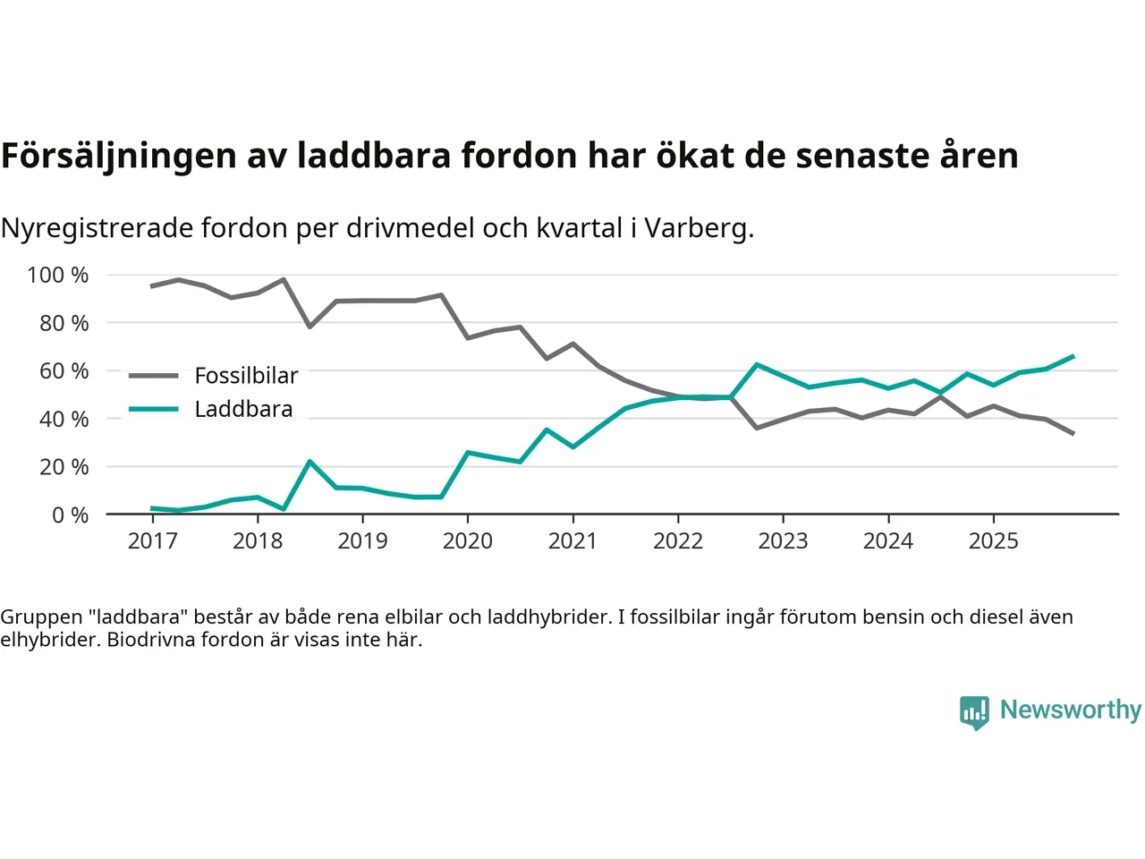 Under fjärde kvartalet 2025 var 66 procent av alla nyregistrerade personbilar i Varberg laddbara (sammanlagt registrerades 334 nya bilar). Merparten av de laddbara bilarna var rena elbilar (43 procent av alla).