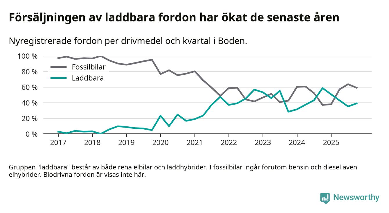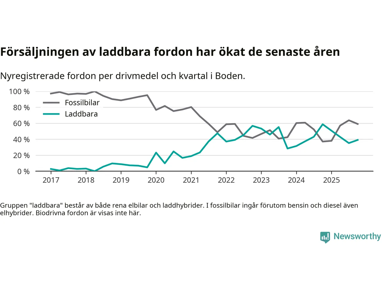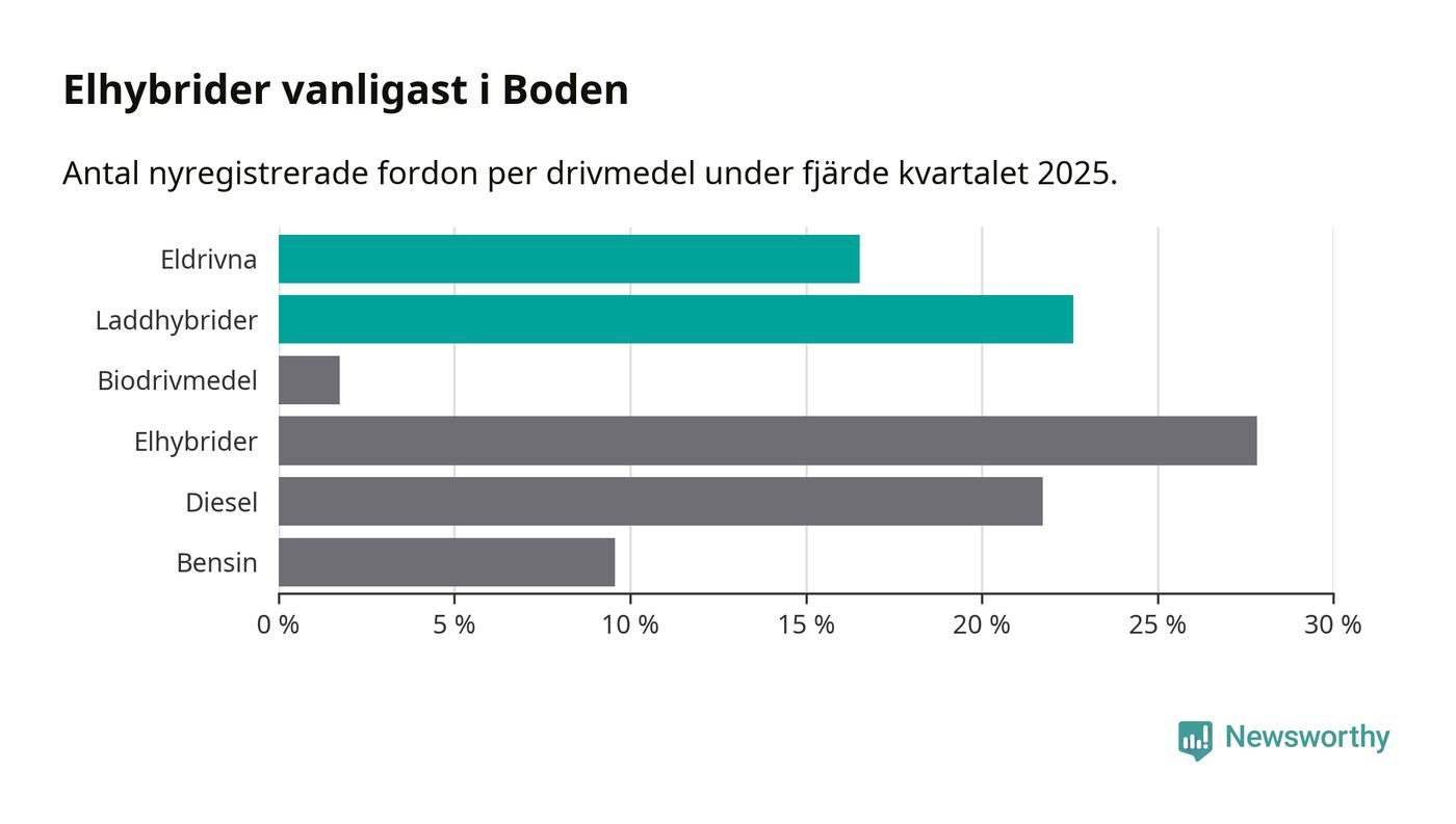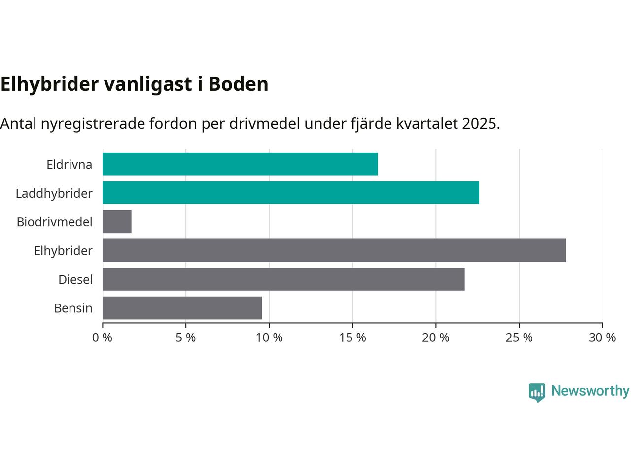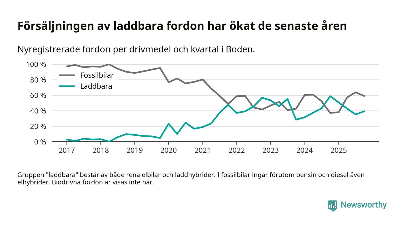 Under fjärde kvartalet 2025 var 39 procent av alla nyregistrerade personbilar i Boden laddbara (sammanlagt registrerades 115 nya bilar). Merparten av de laddbara bilarna var så kallade laddhybrider, det vill säga fordon som går att ladda och köra på el, men som även har en förbränningsmotor. 17 procent av alla nya bilar var rena elbilar.