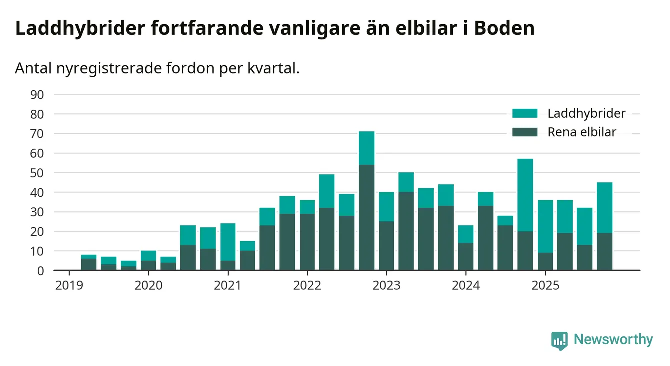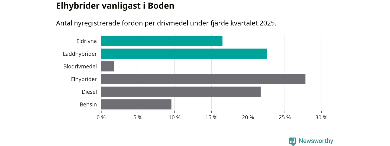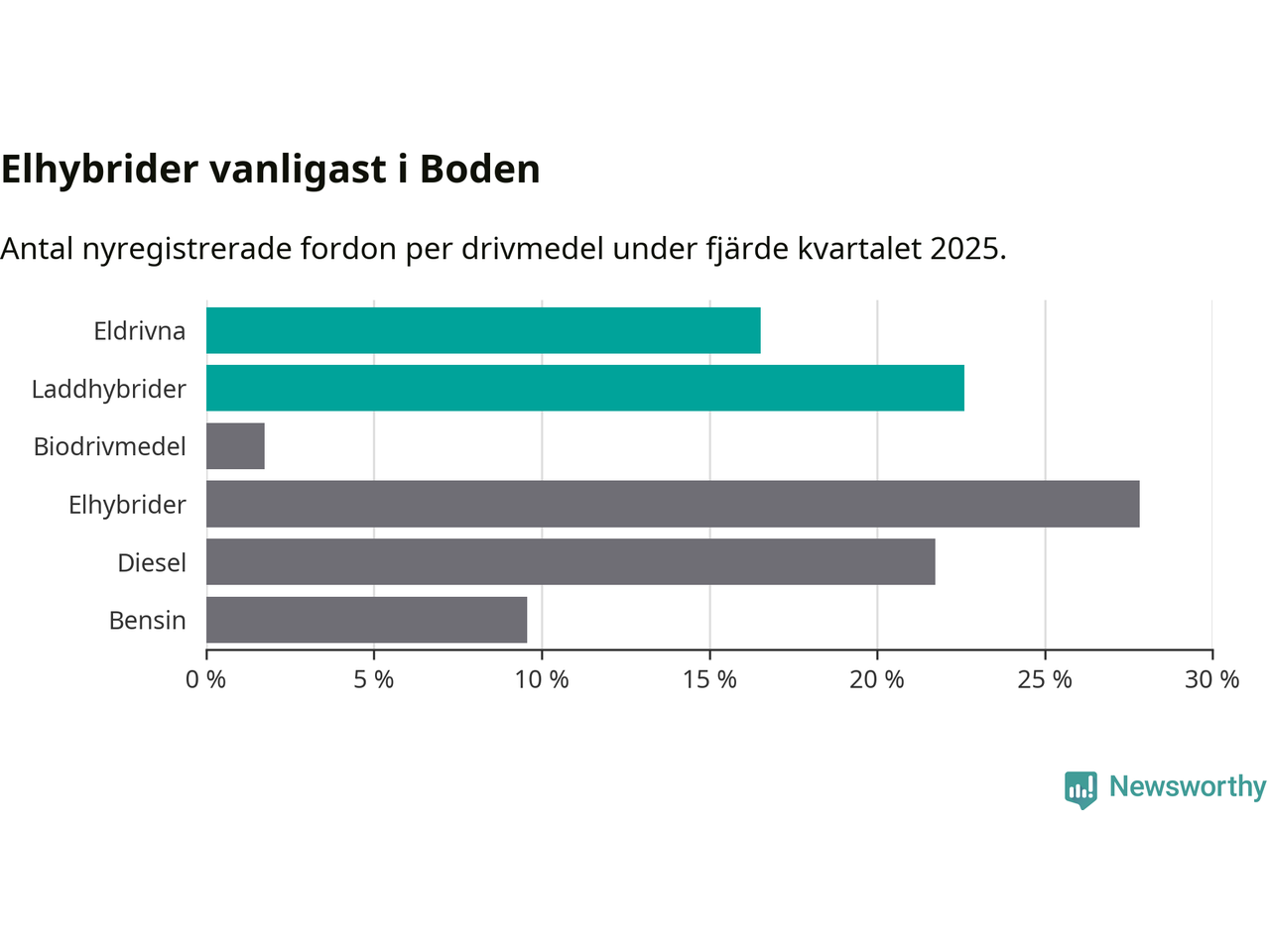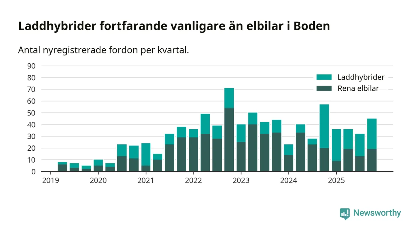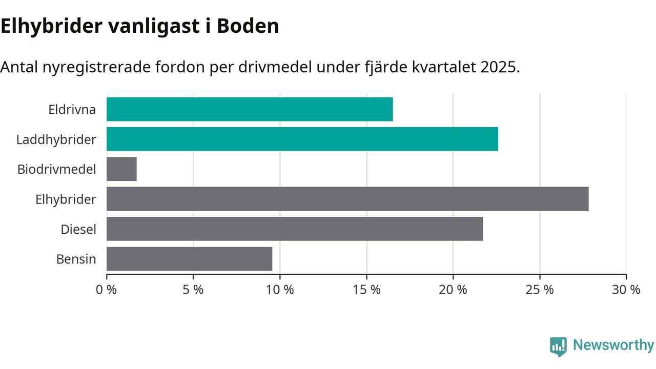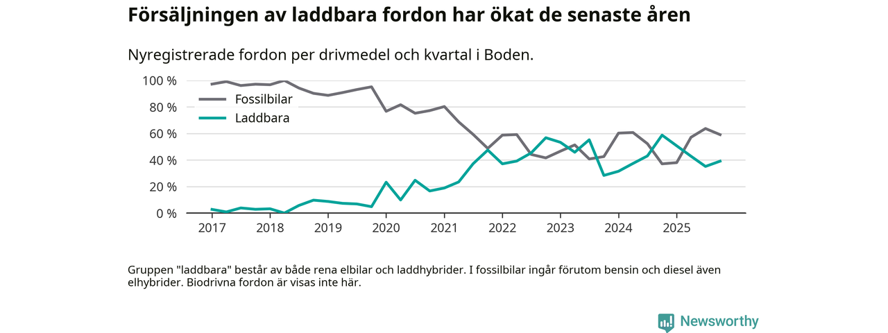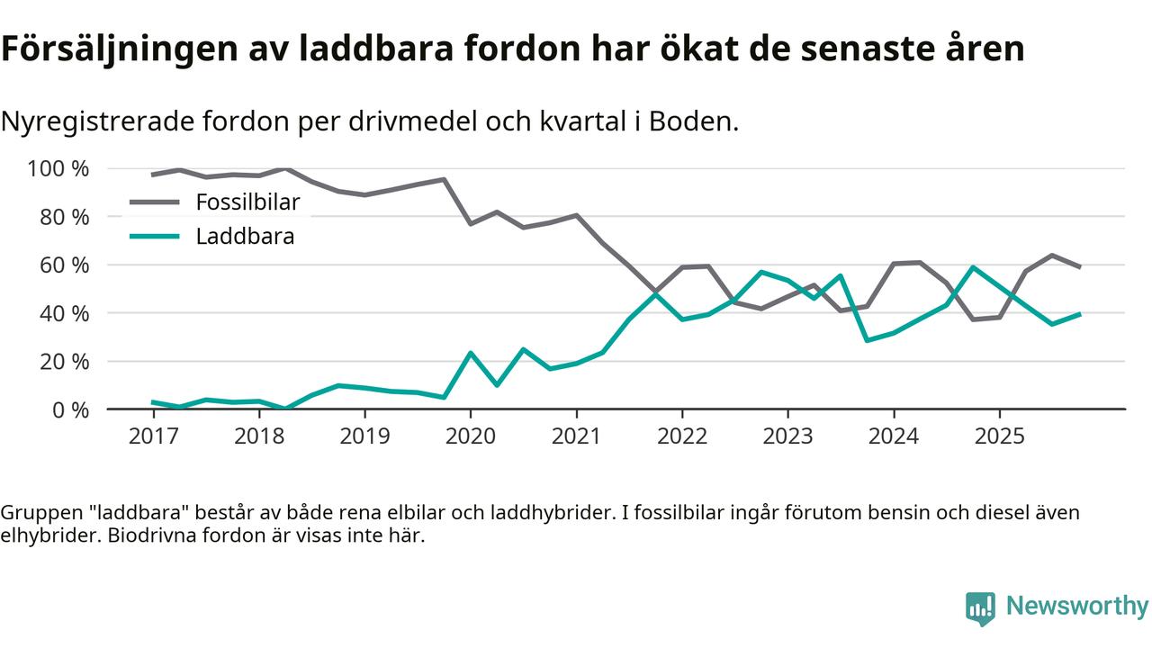 Under fjärde kvartalet 2025 var 39 procent av alla nyregistrerade personbilar i Boden laddbara (sammanlagt registrerades 115 nya bilar). Merparten av de laddbara bilarna var så kallade laddhybrider, det vill säga fordon som går att ladda och köra på el, men som även har en förbränningsmotor. 17 procent av alla nya bilar var rena elbilar.