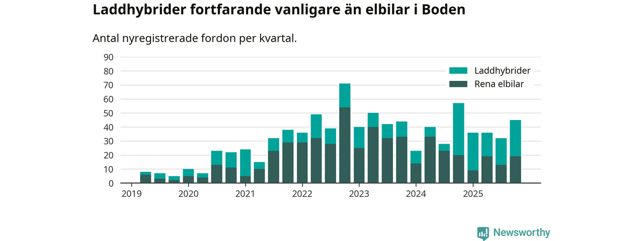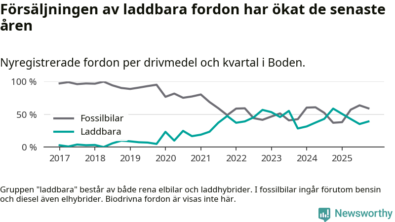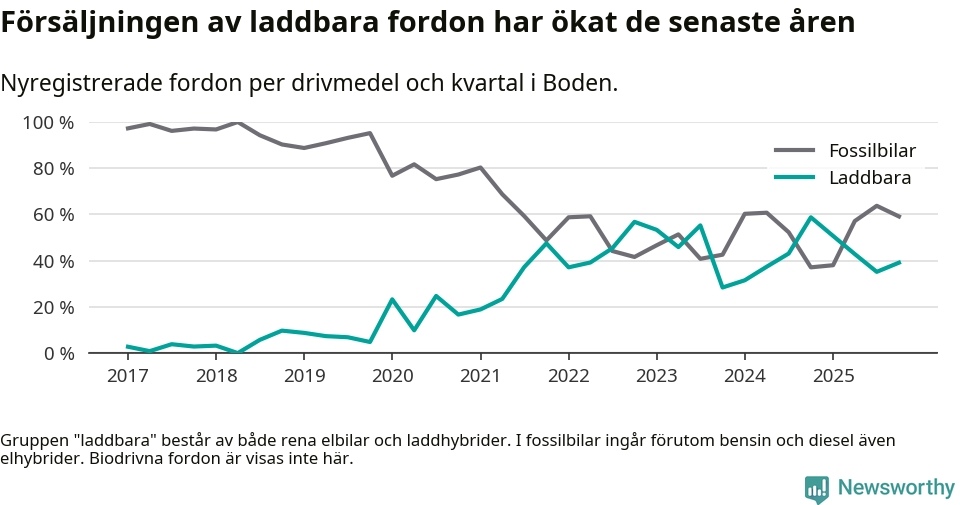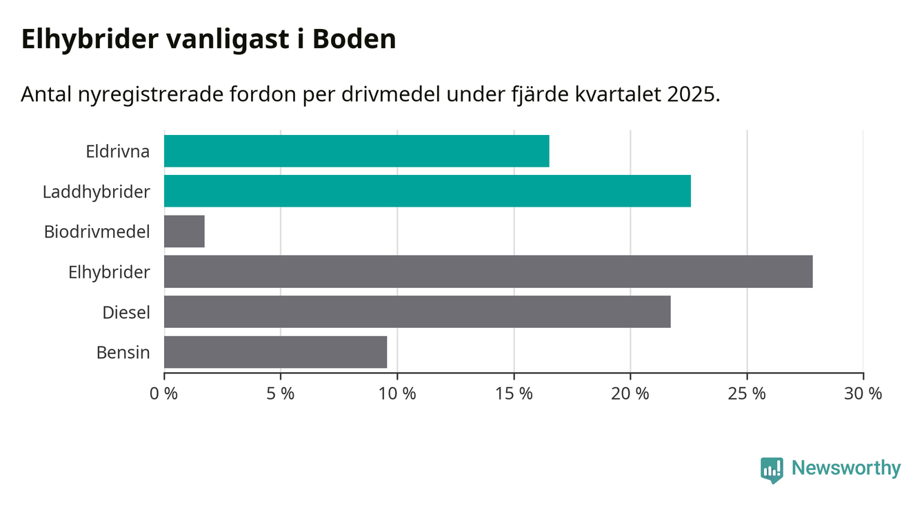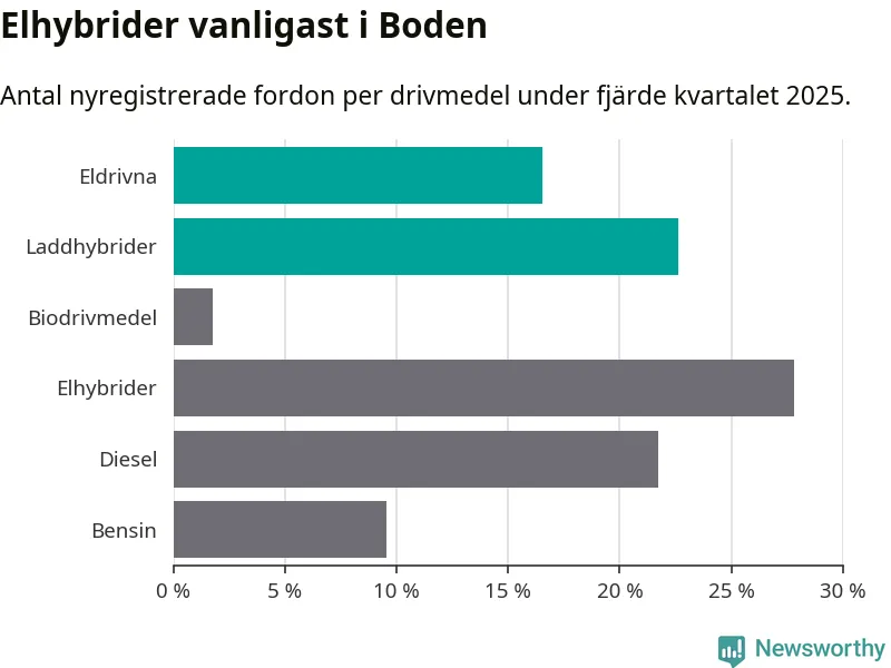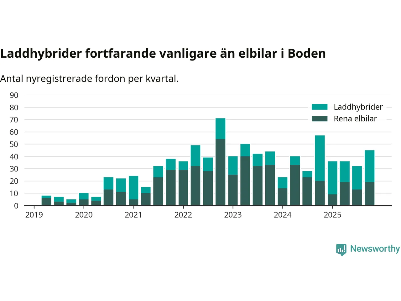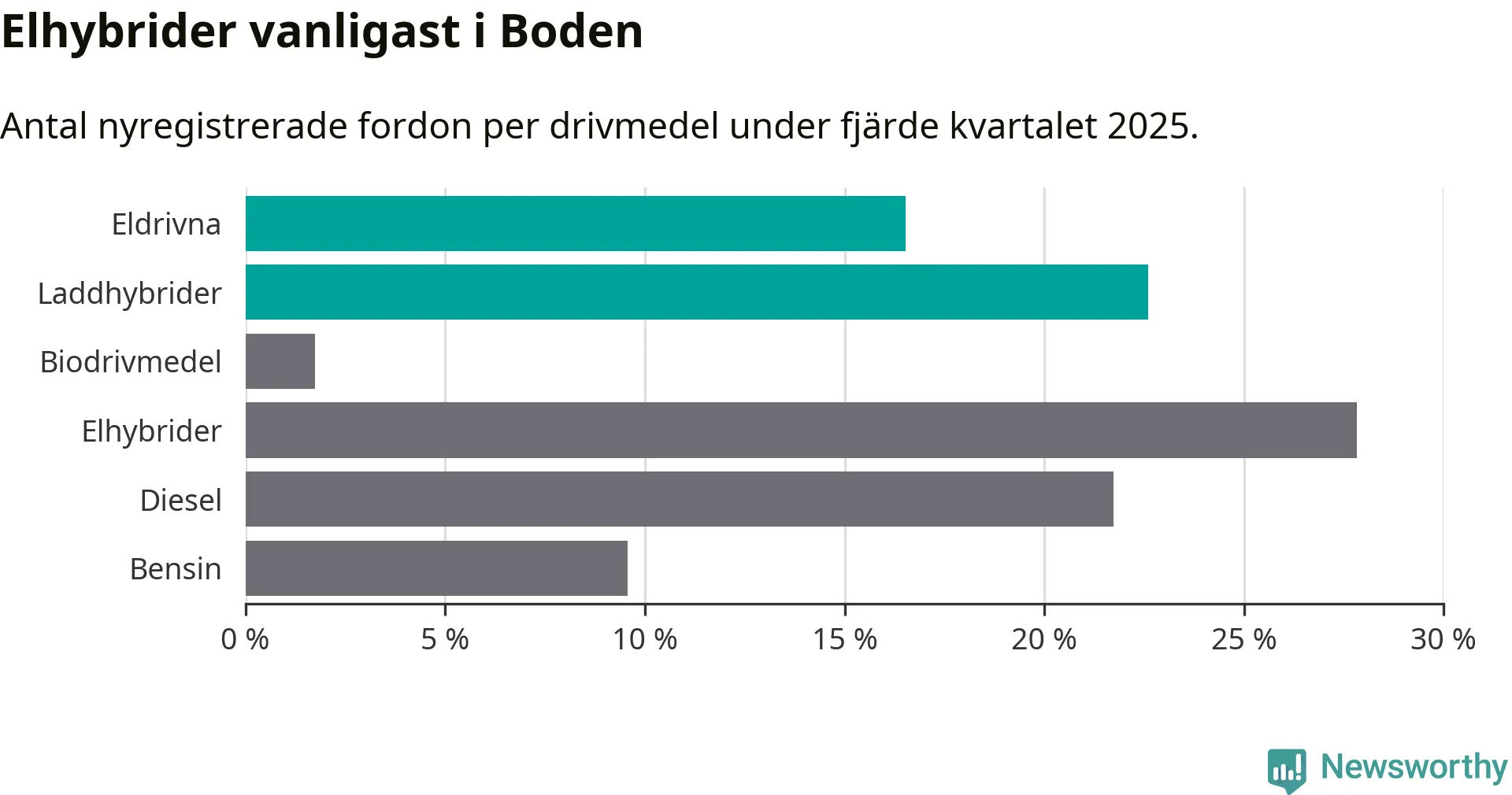 Under fjärde kvartalet 2025 var 39 procent av alla nyregistrerade personbilar i Boden laddbara (sammanlagt registrerades 115 nya bilar). Merparten av de laddbara bilarna var så kallade laddhybrider, det vill säga fordon som går att ladda och köra på el, men som även har en förbränningsmotor. 17 procent av alla nya bilar var rena elbilar.