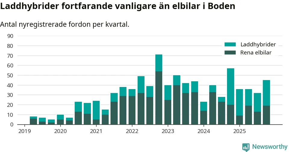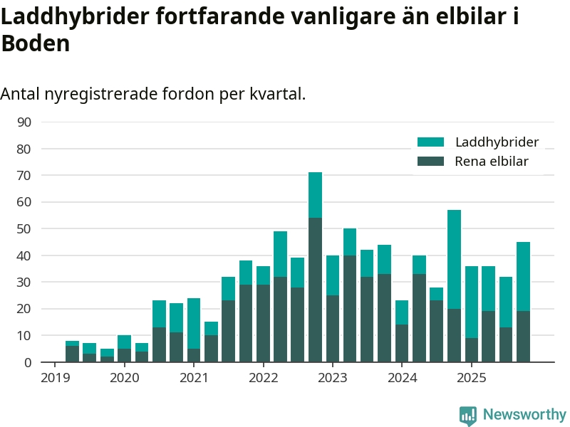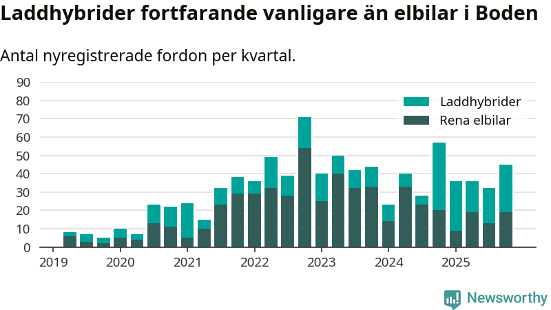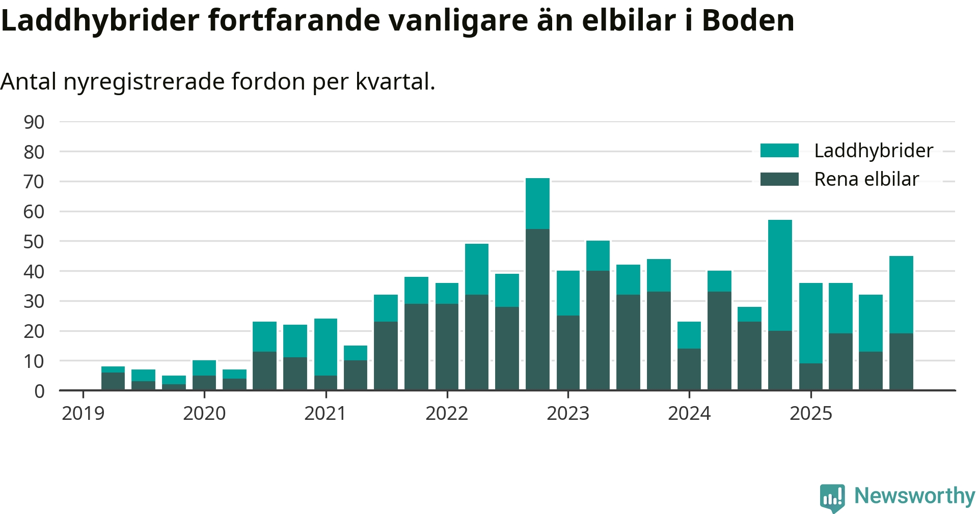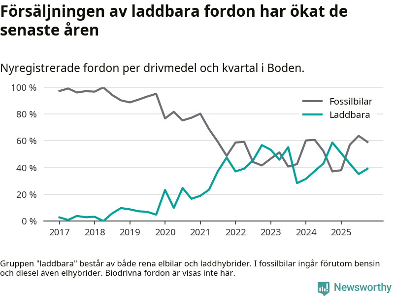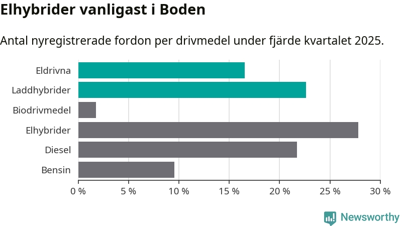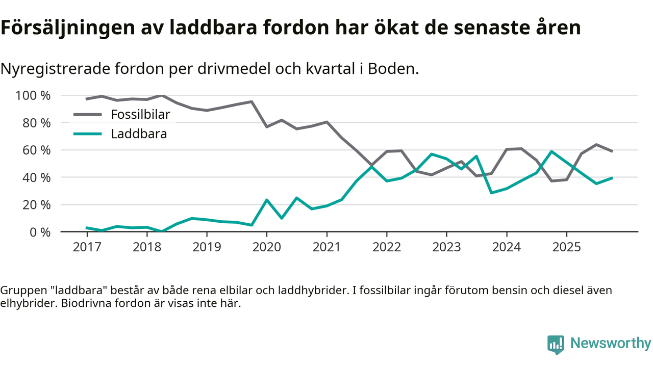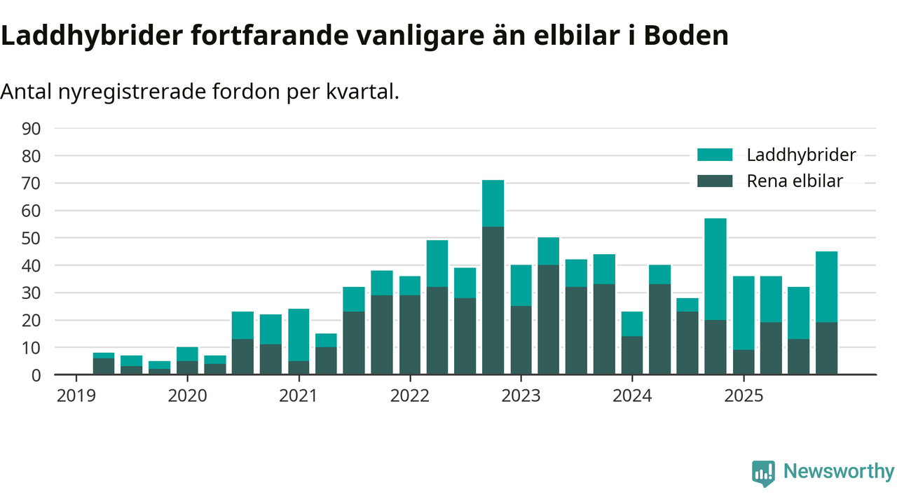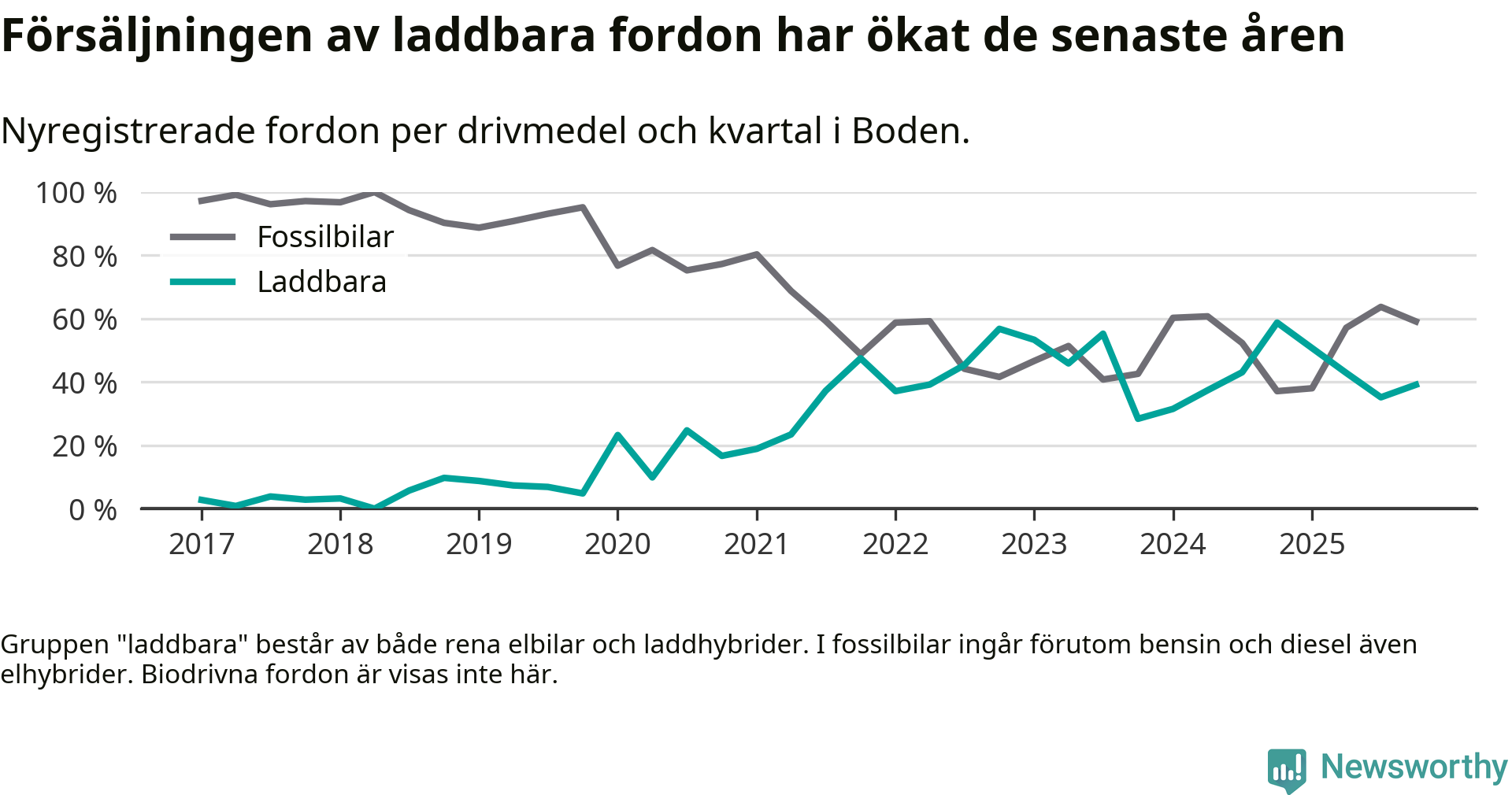 Under fjärde kvartalet 2025 var 39 procent av alla nyregistrerade personbilar i Boden laddbara (sammanlagt registrerades 115 nya bilar). Merparten av de laddbara bilarna var så kallade laddhybrider, det vill säga fordon som går att ladda och köra på el, men som även har en förbränningsmotor. 17 procent av alla nya bilar var rena elbilar.