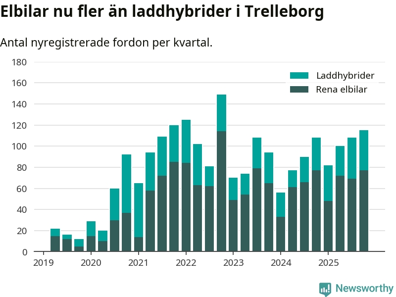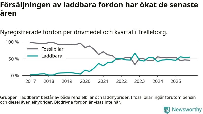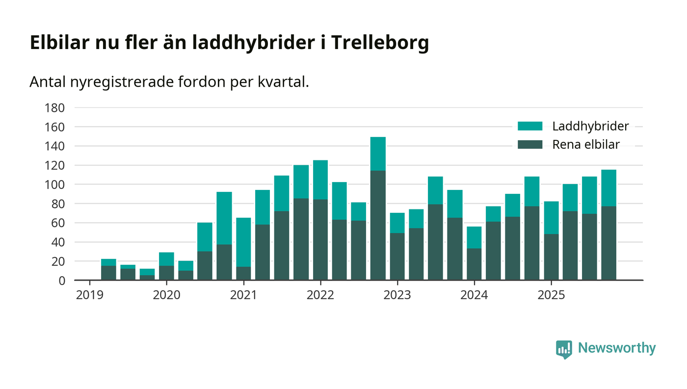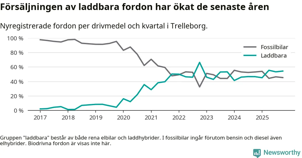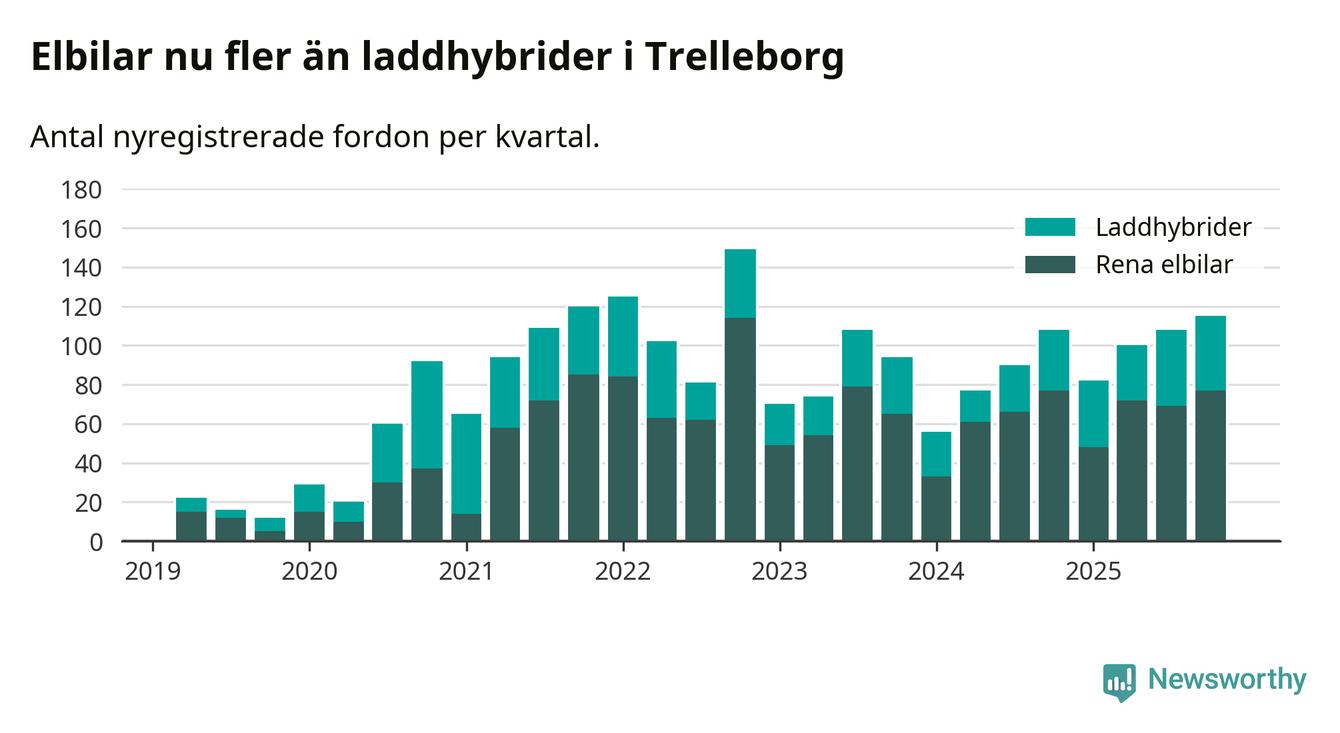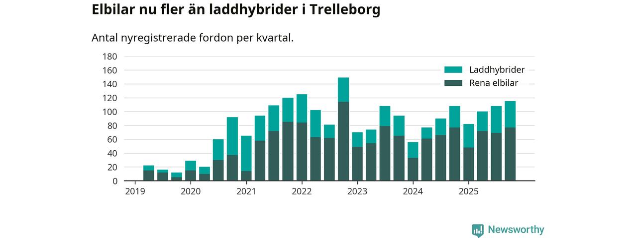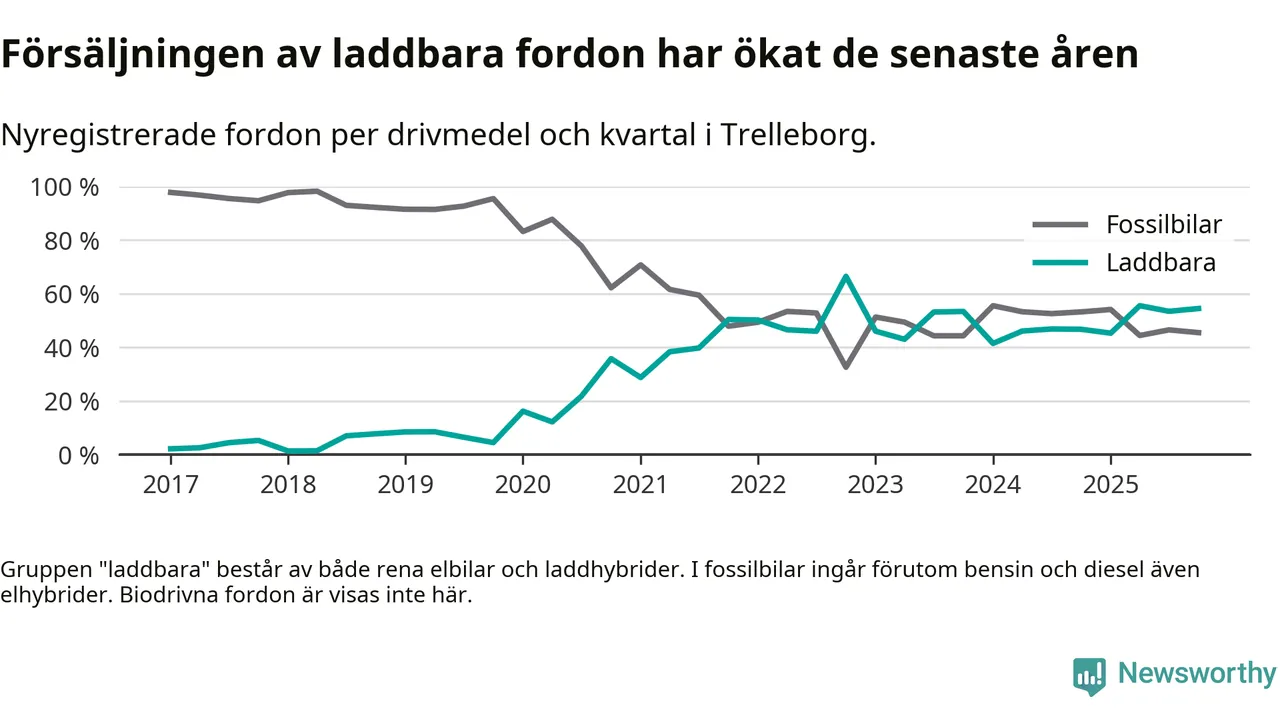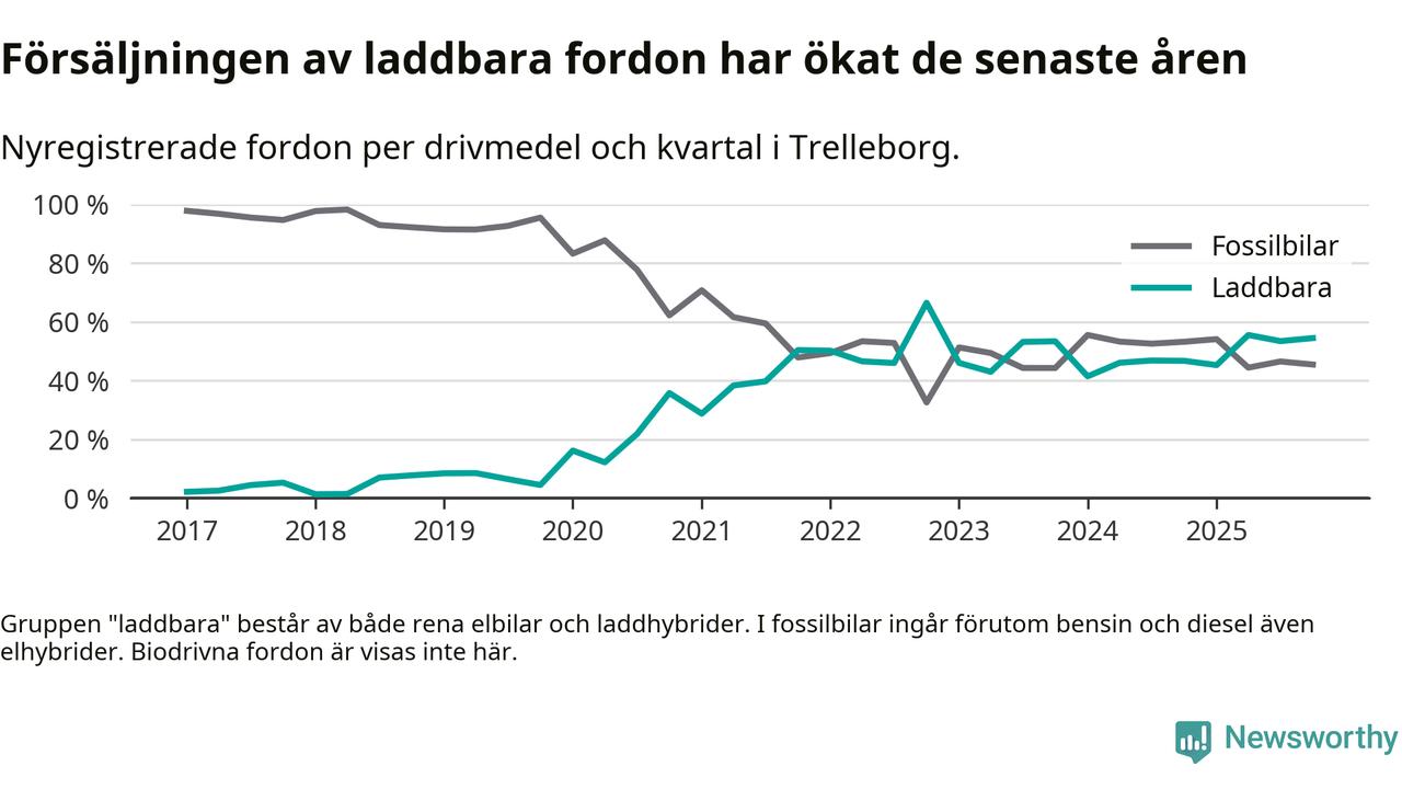 Under fjärde kvartalet 2025 var 55 procent av alla nyregistrerade personbilar i Trelleborg laddbara (sammanlagt registrerades 211 nya bilar). Merparten av de laddbara bilarna var rena elbilar (36 procent av alla).