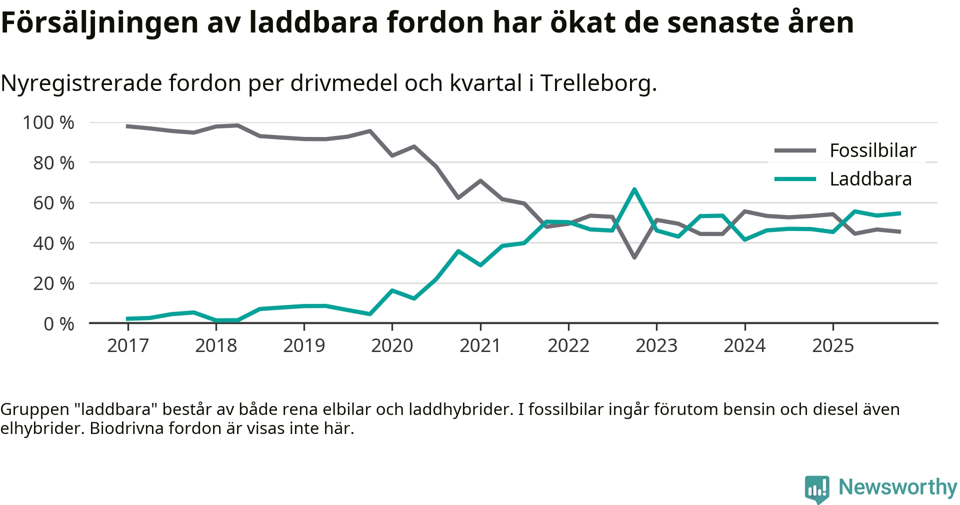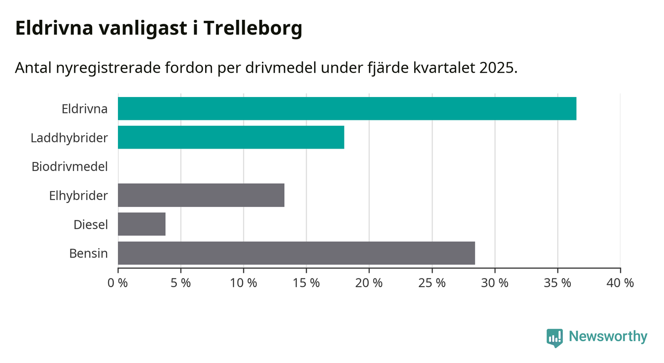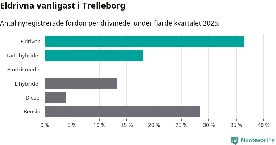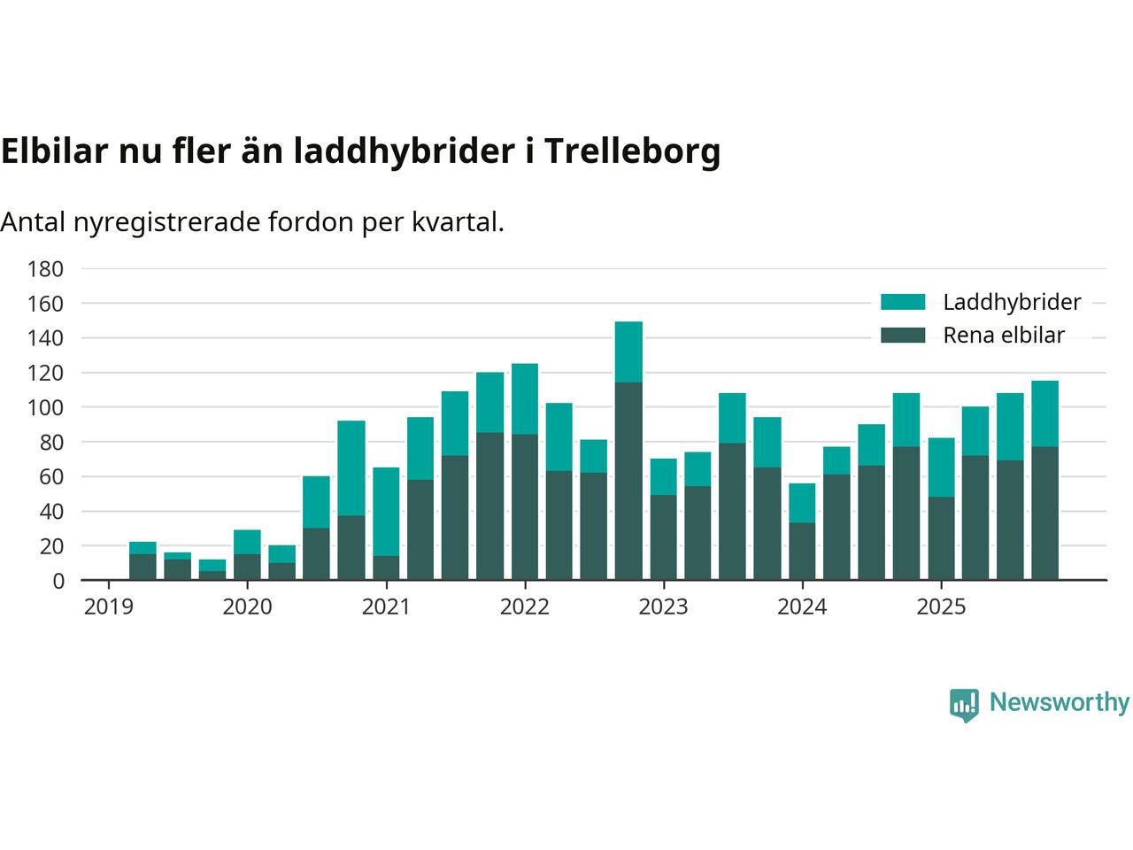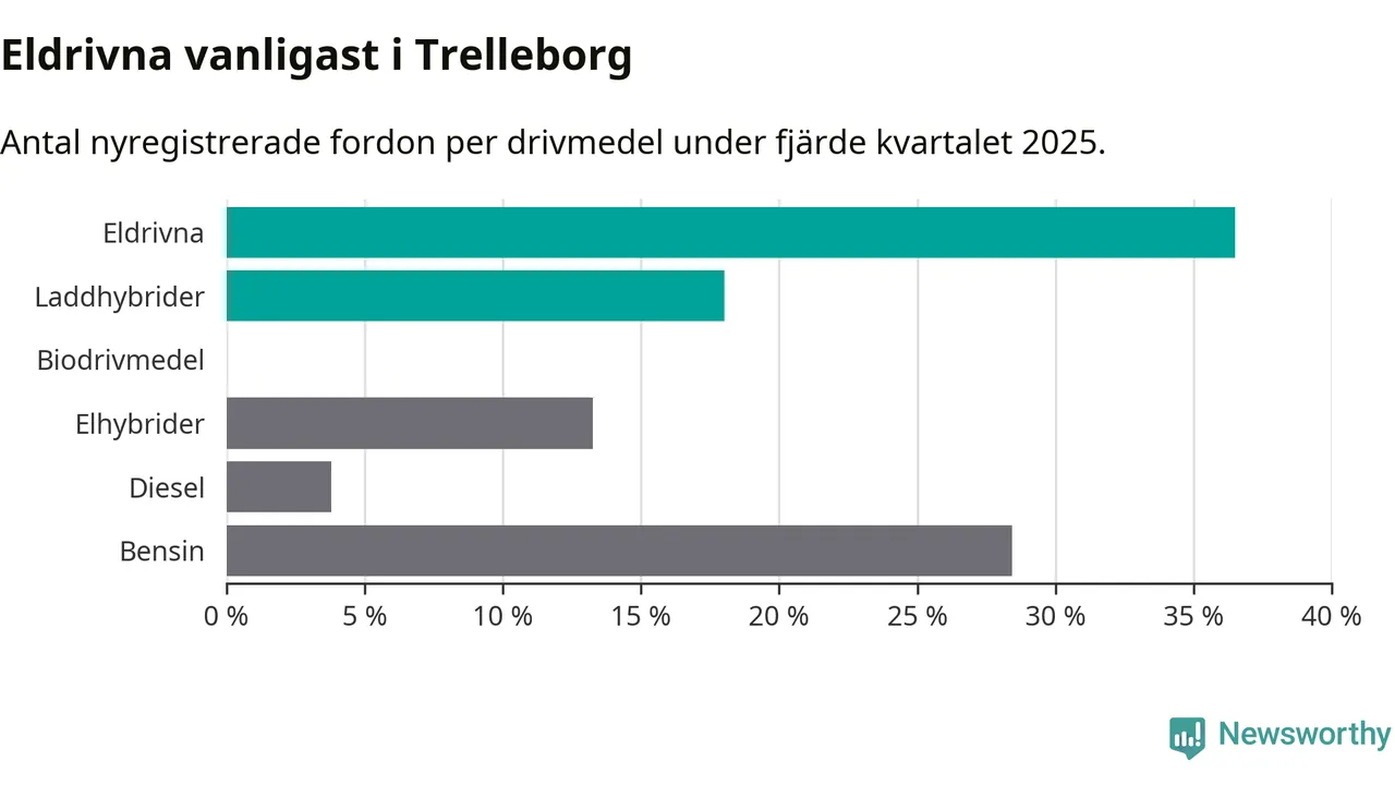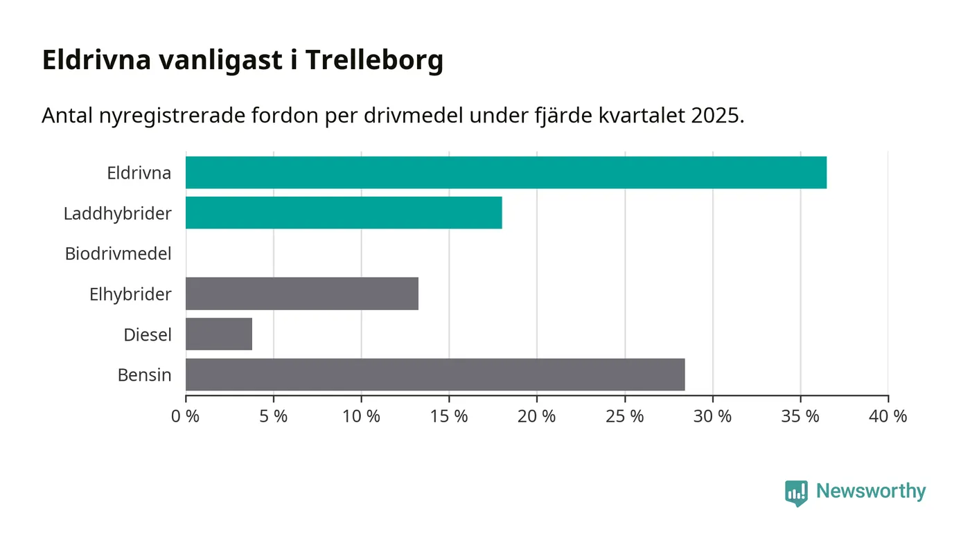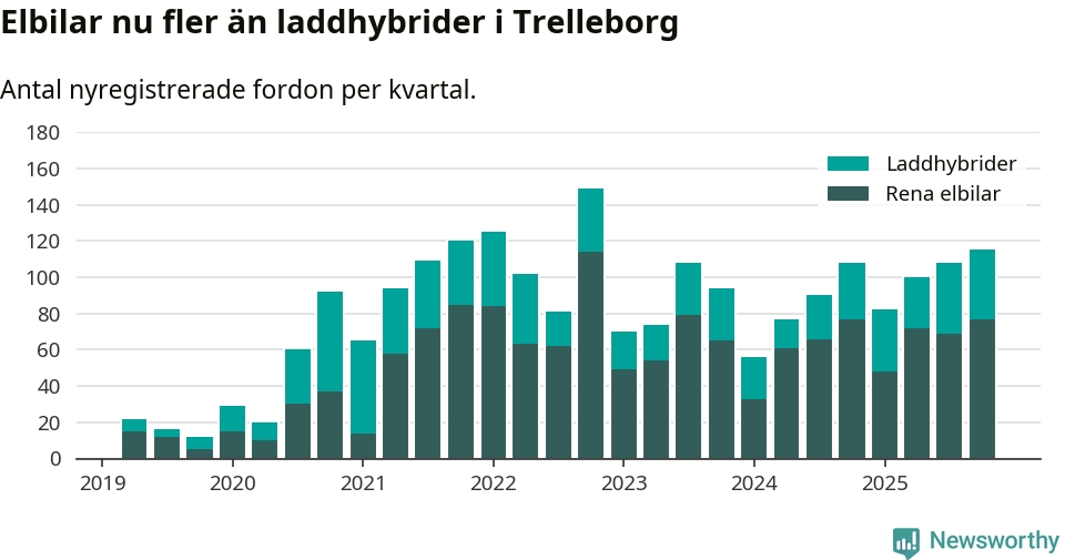 Under fjärde kvartalet 2025 var 55 procent av alla nyregistrerade personbilar i Trelleborg laddbara (sammanlagt registrerades 211 nya bilar). Merparten av de laddbara bilarna var rena elbilar (36 procent av alla).