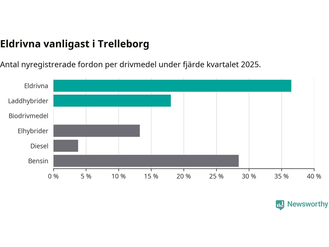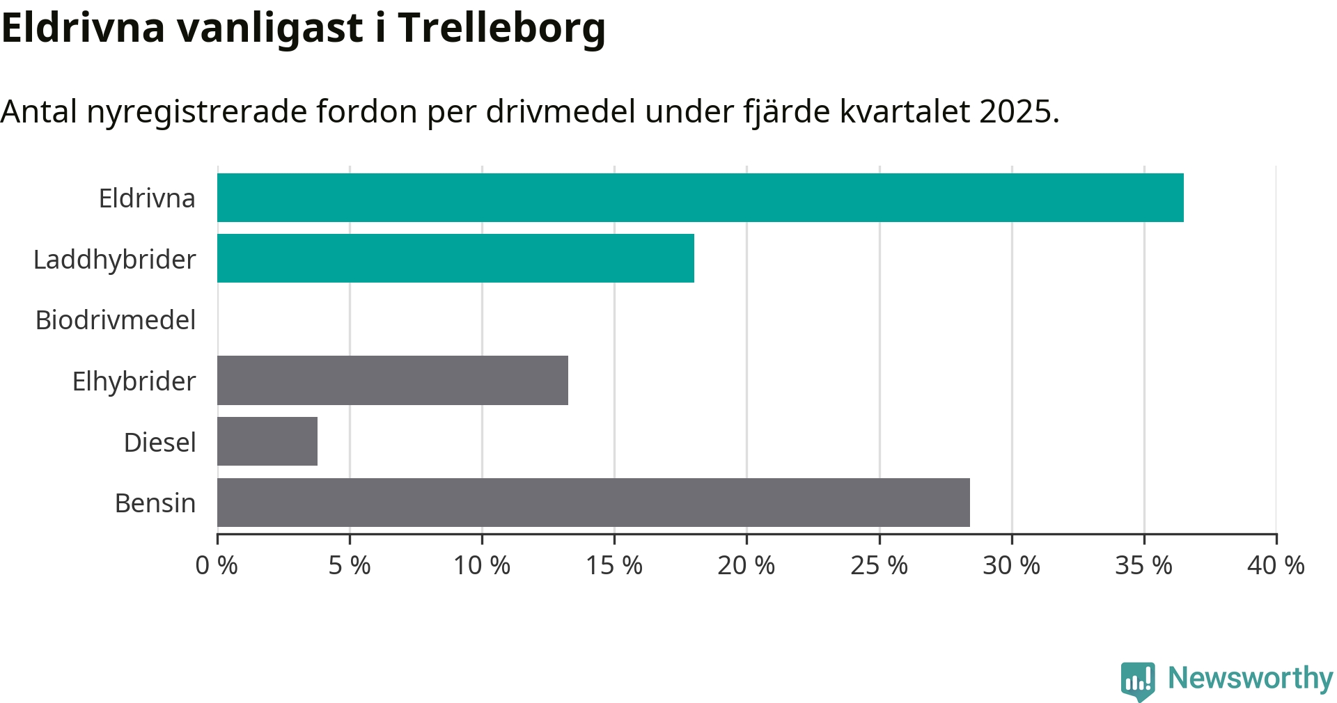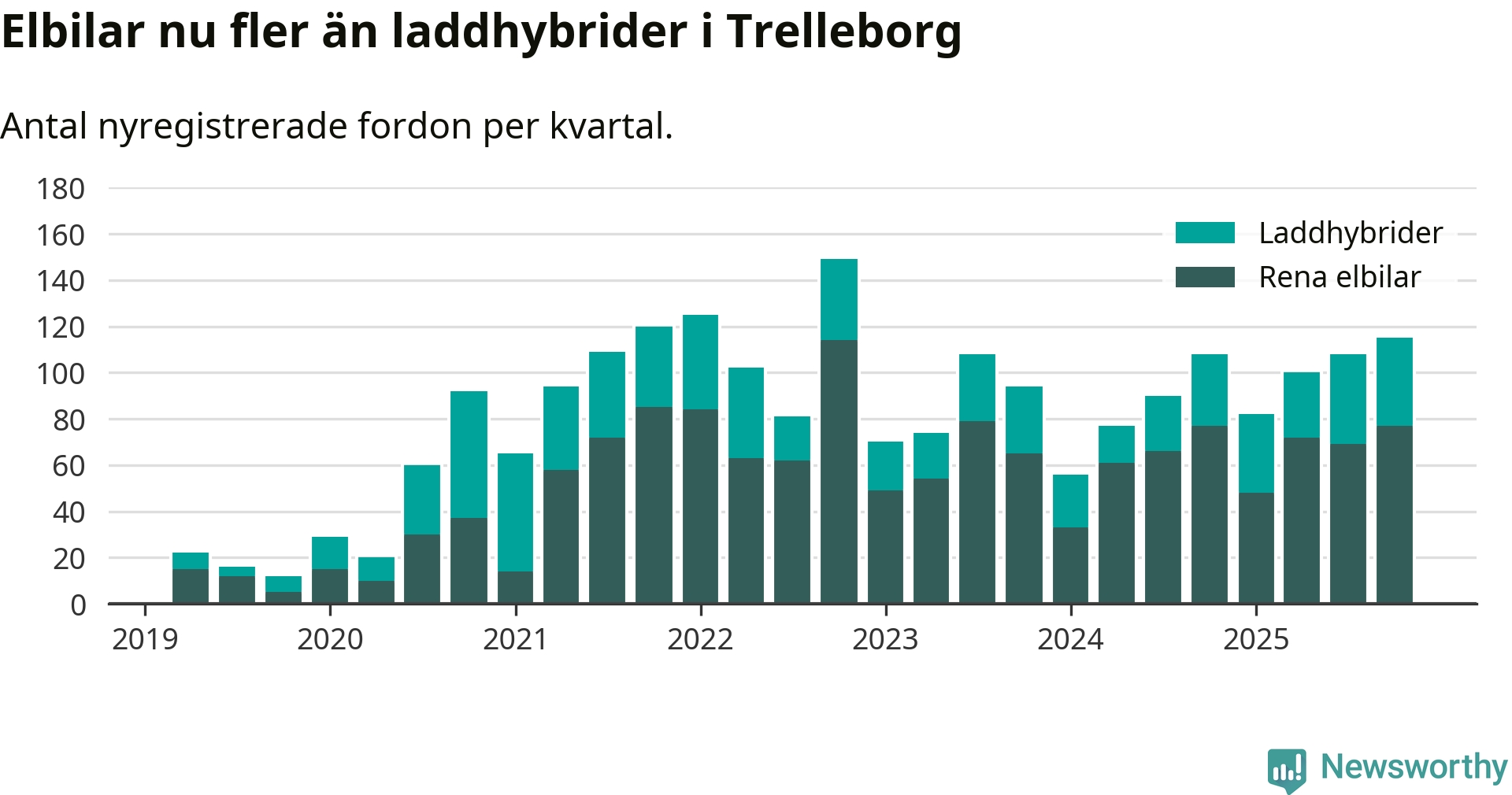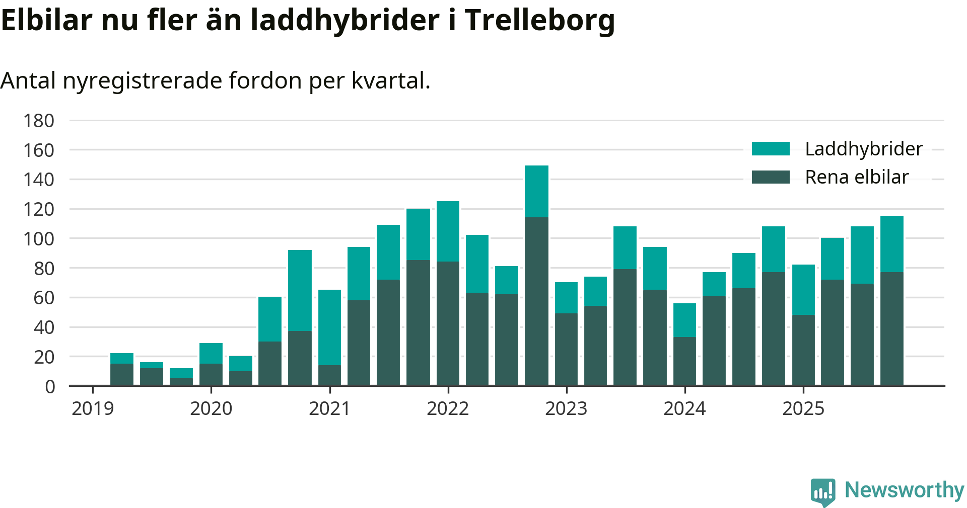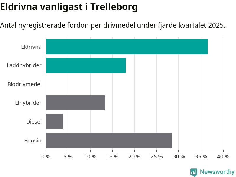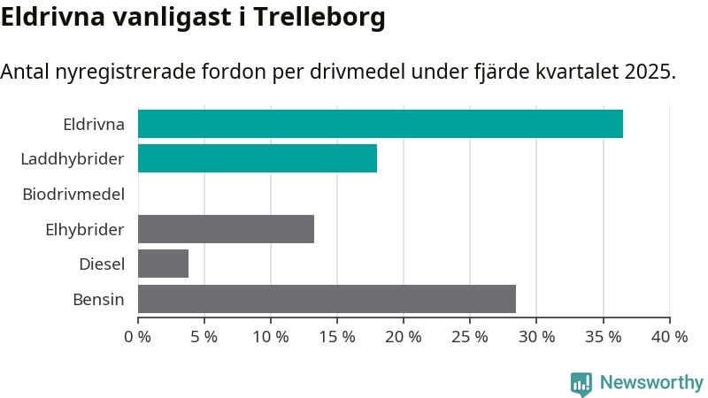 Under fjärde kvartalet 2025 var 55 procent av alla nyregistrerade personbilar i Trelleborg laddbara (sammanlagt registrerades 211 nya bilar). Merparten av de laddbara bilarna var rena elbilar (36 procent av alla).