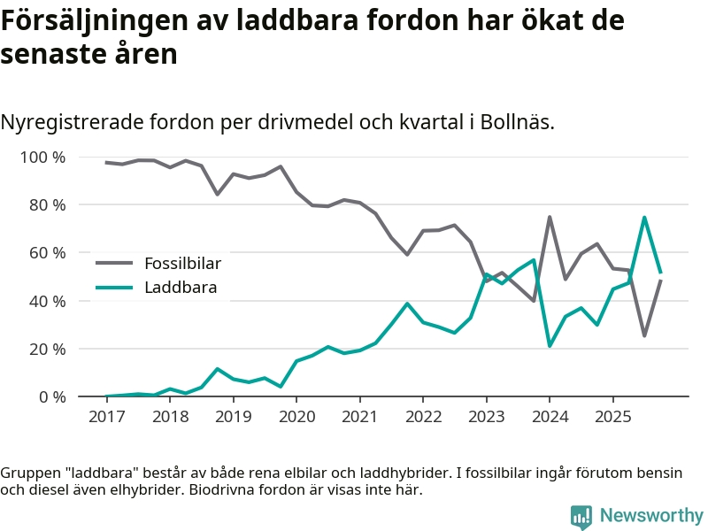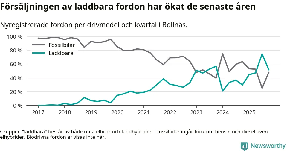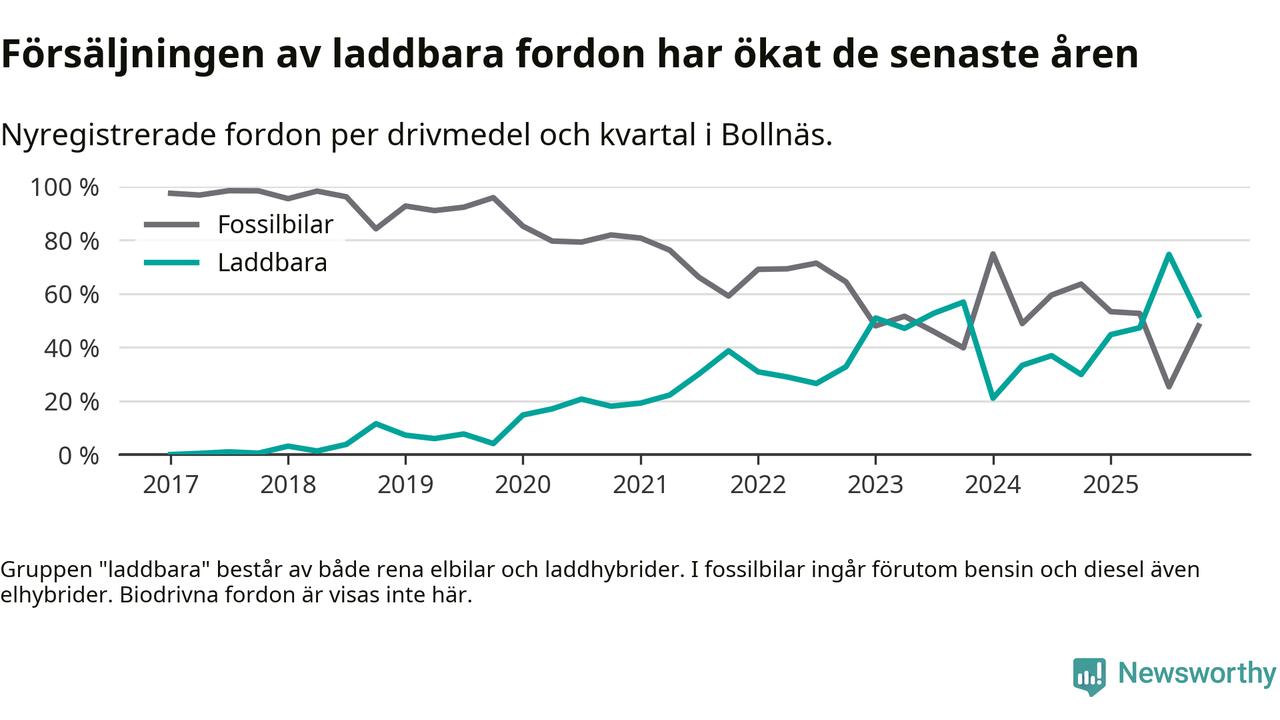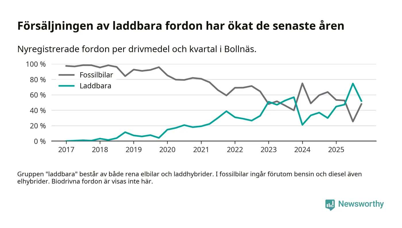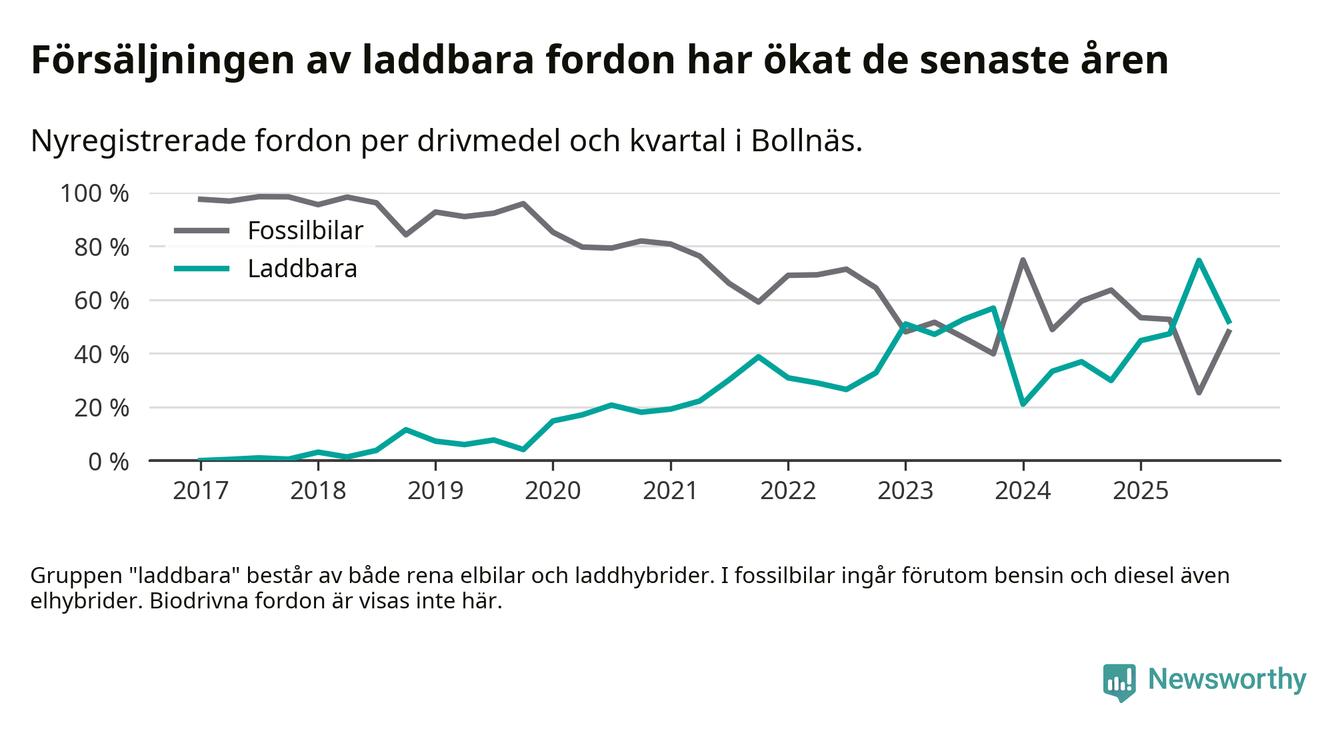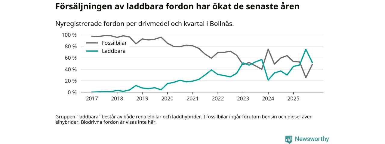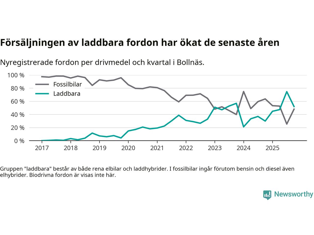 I Bollnäs minskade andelen laddbara bilar under fjärde kvartalet jämfört med kvartalet innan (−22,7 procentenheter). Nyregistreringen peakade under tredje kvartalet 2025 då 75 procent av de nya bilarna var laddbara.