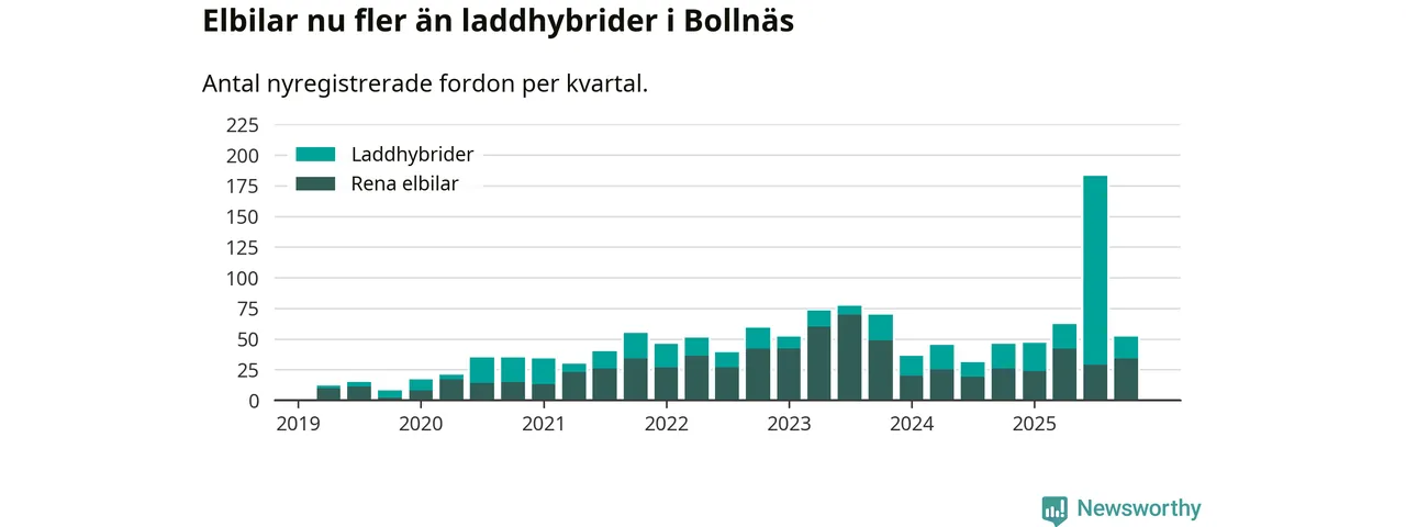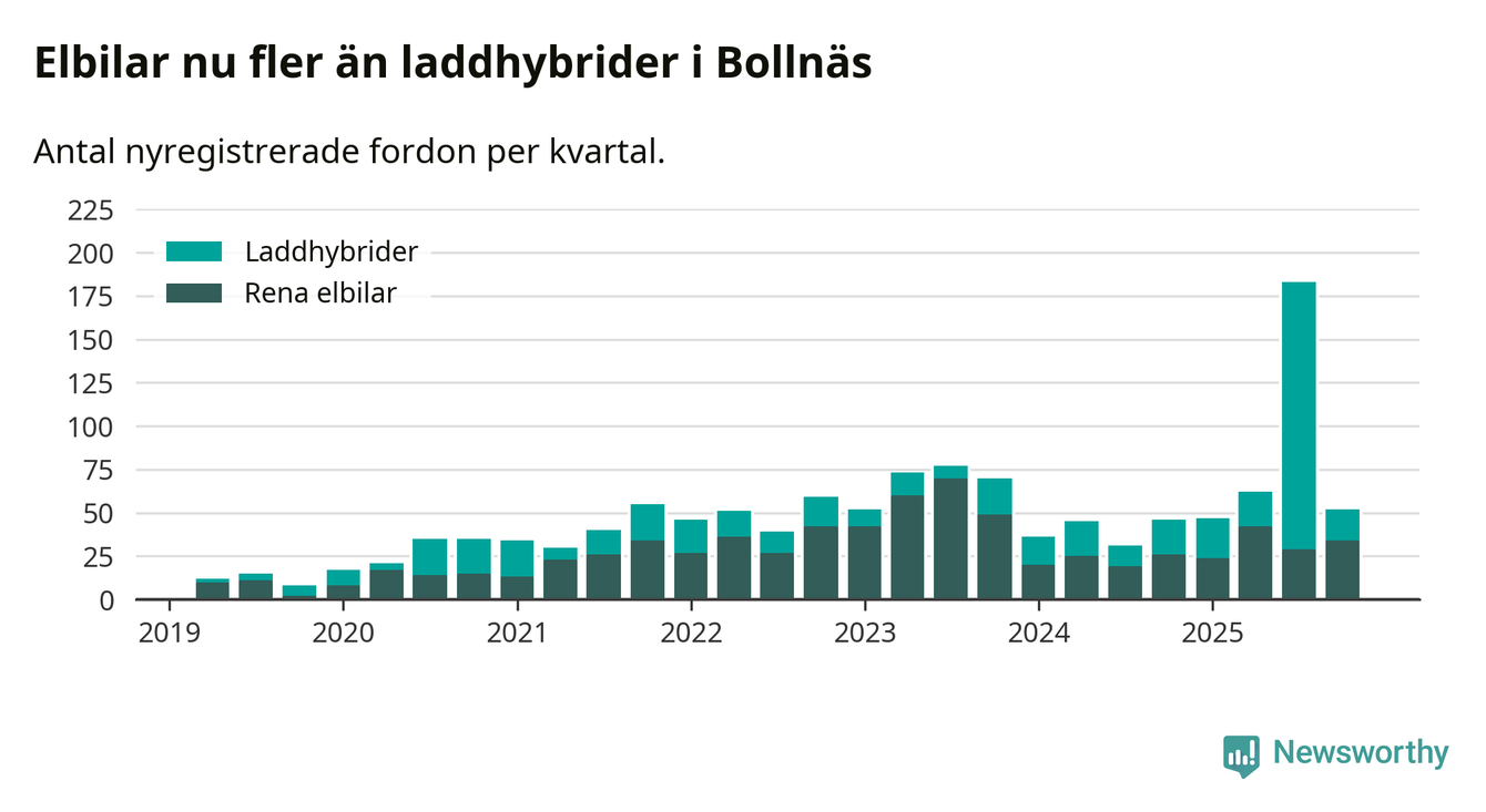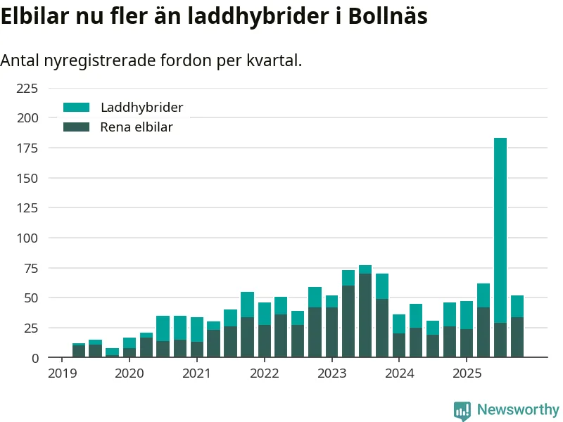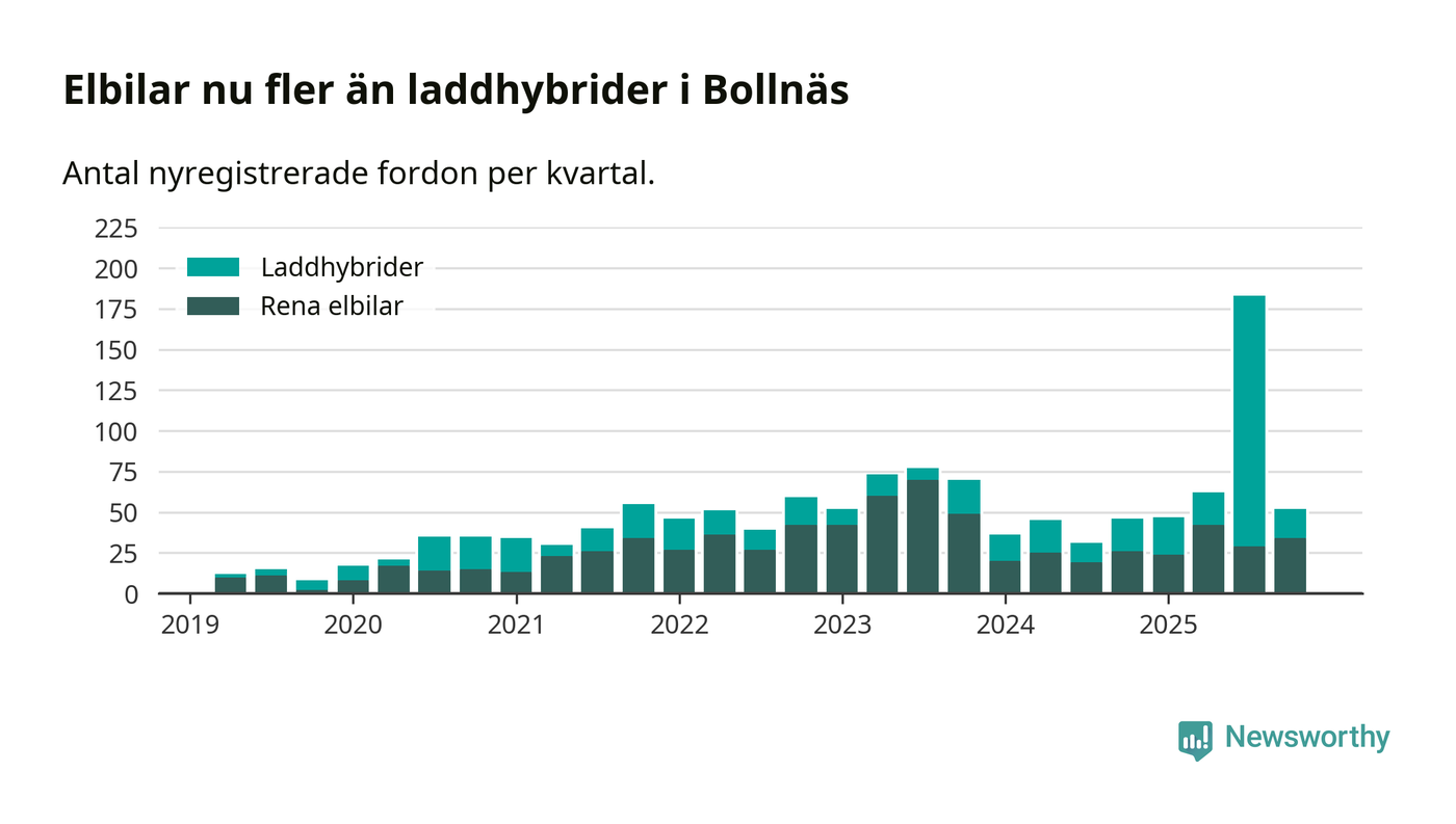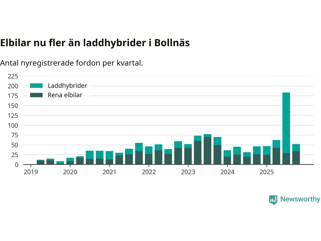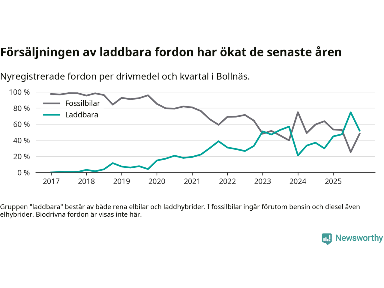 Under fjärde kvartalet 2025 var 52 procent av alla nyregistrerade personbilar i Bollnäs laddbara (sammanlagt registrerades 100 nya bilar). Merparten av de laddbara bilarna var rena elbilar (34 procent av alla).