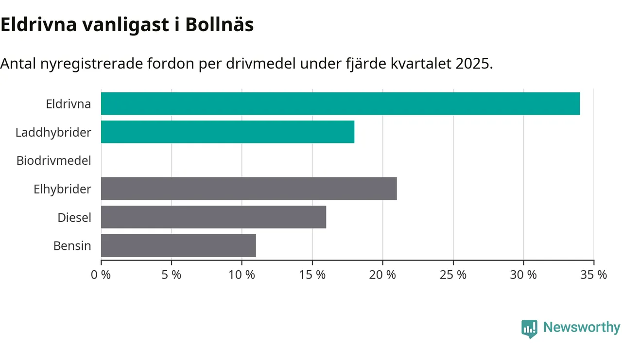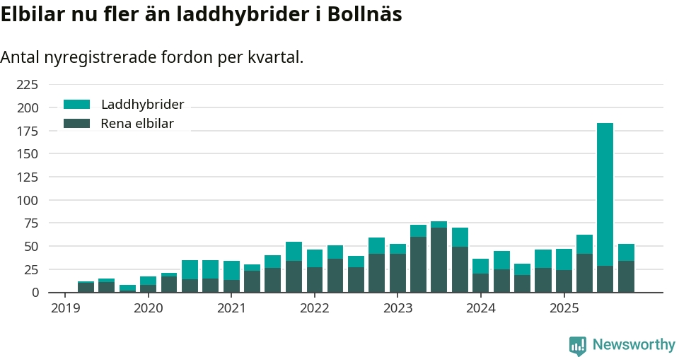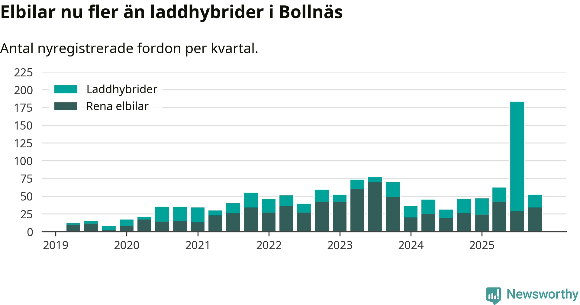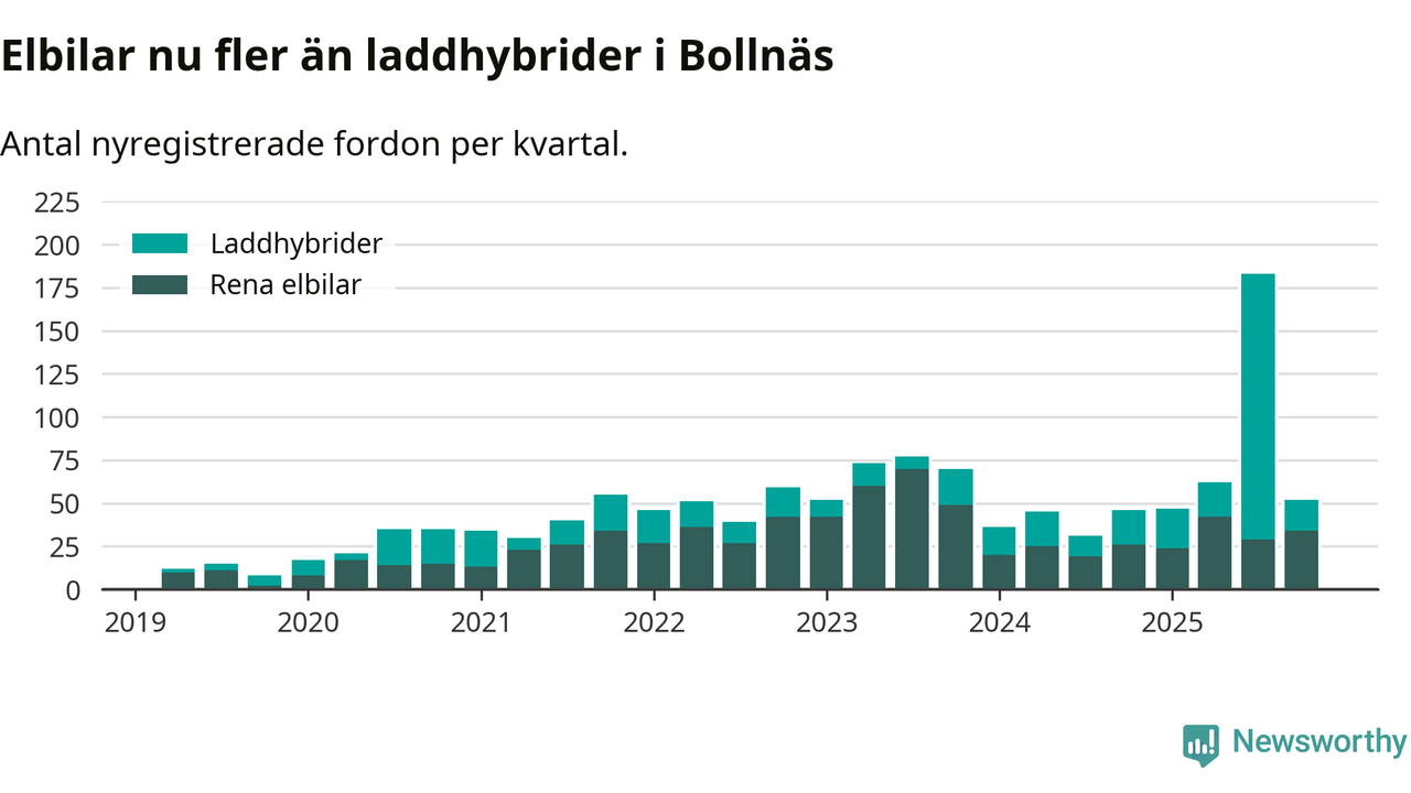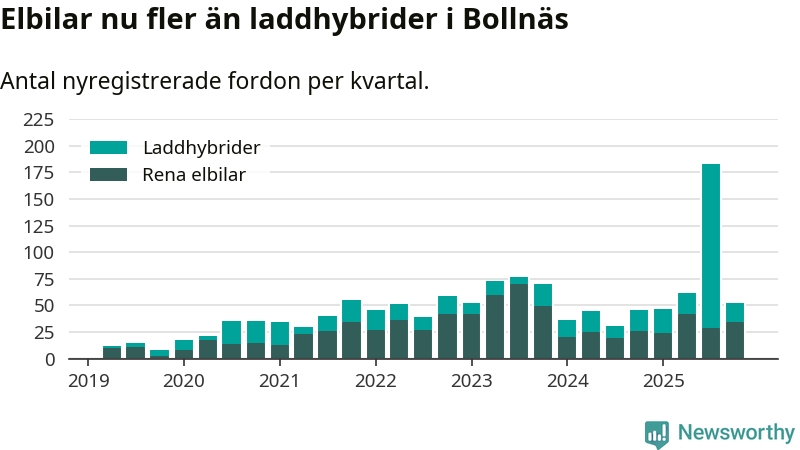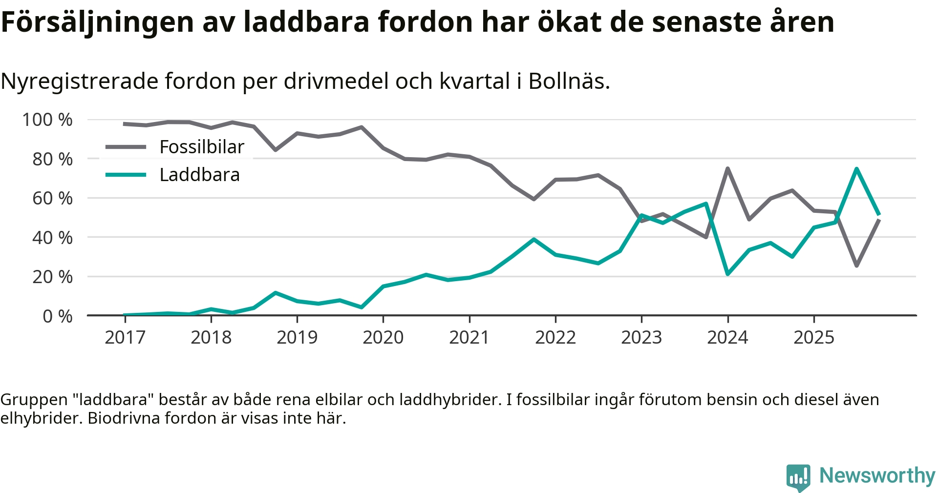 Under fjärde kvartalet 2025 var 52 procent av alla nyregistrerade personbilar i Bollnäs laddbara (sammanlagt registrerades 100 nya bilar). Merparten av de laddbara bilarna var rena elbilar (34 procent av alla).