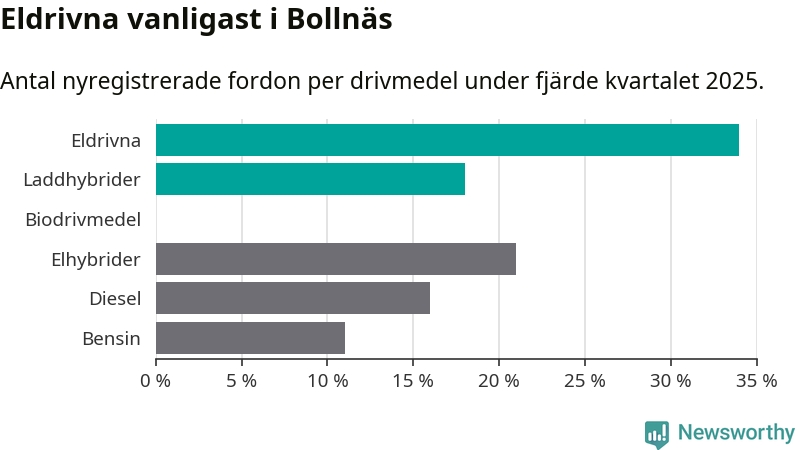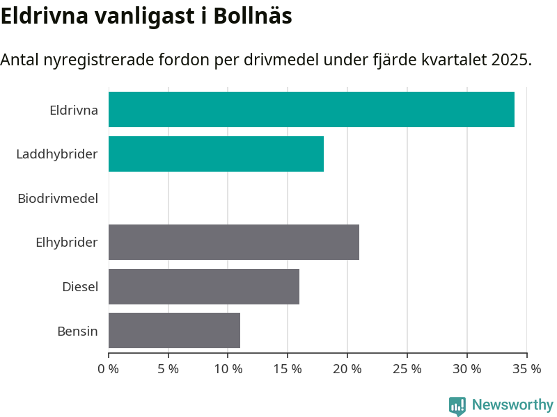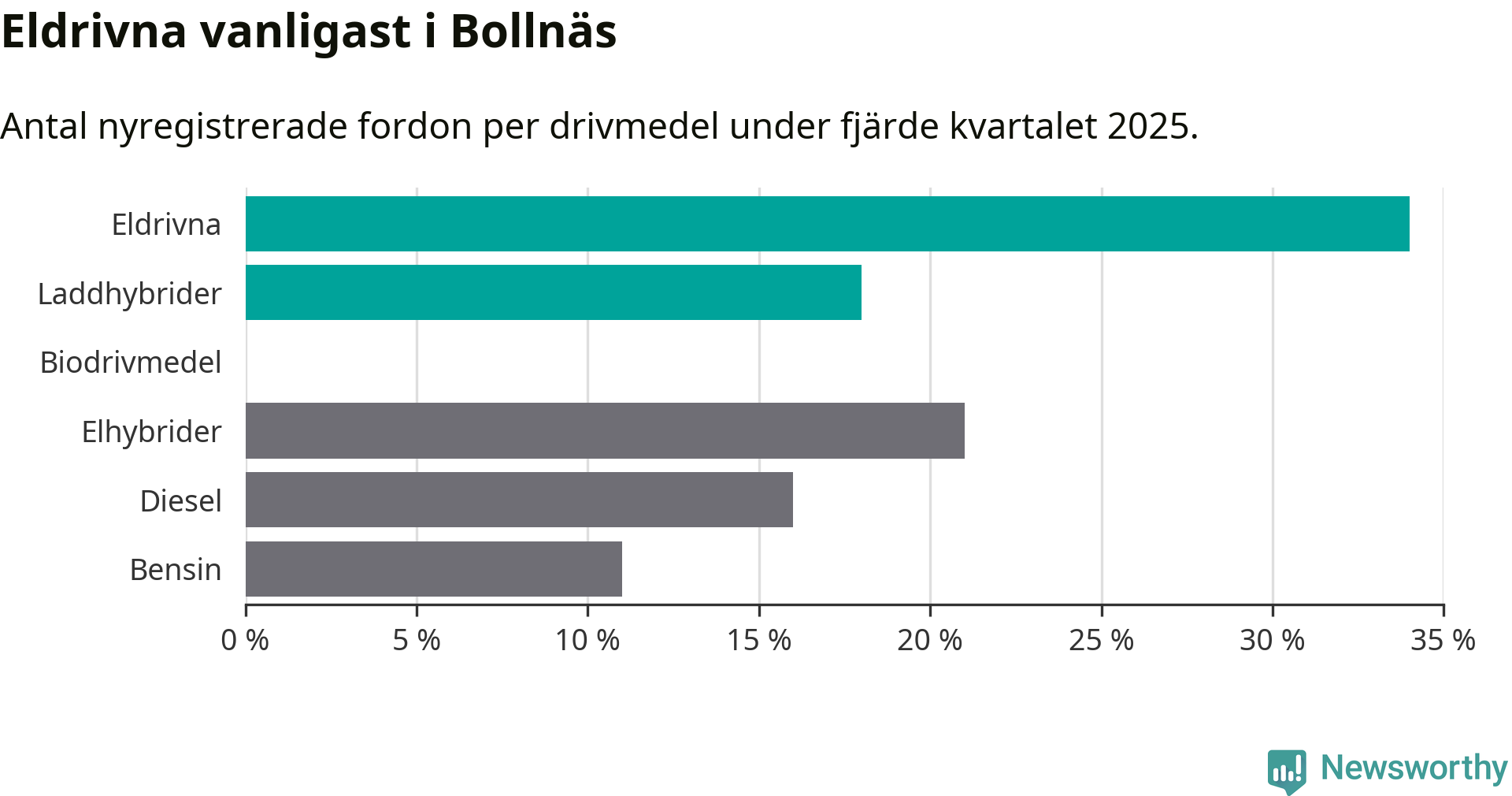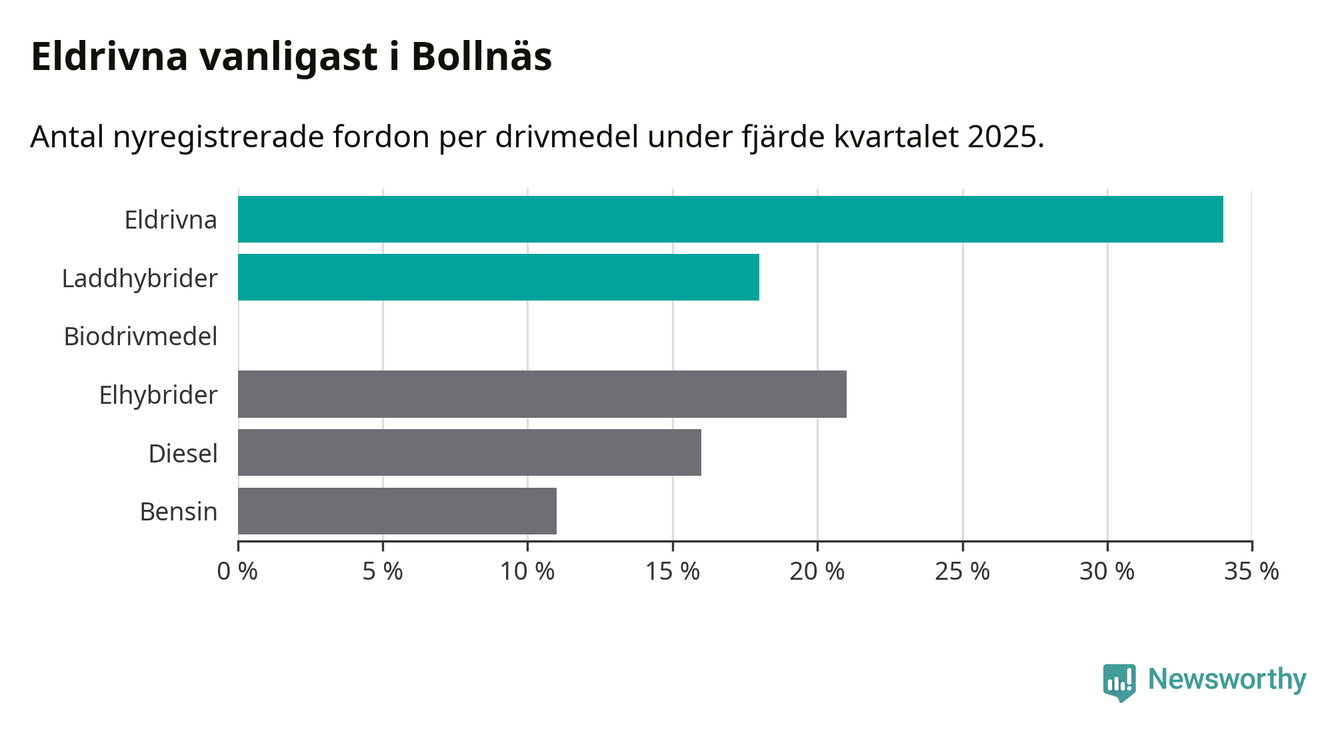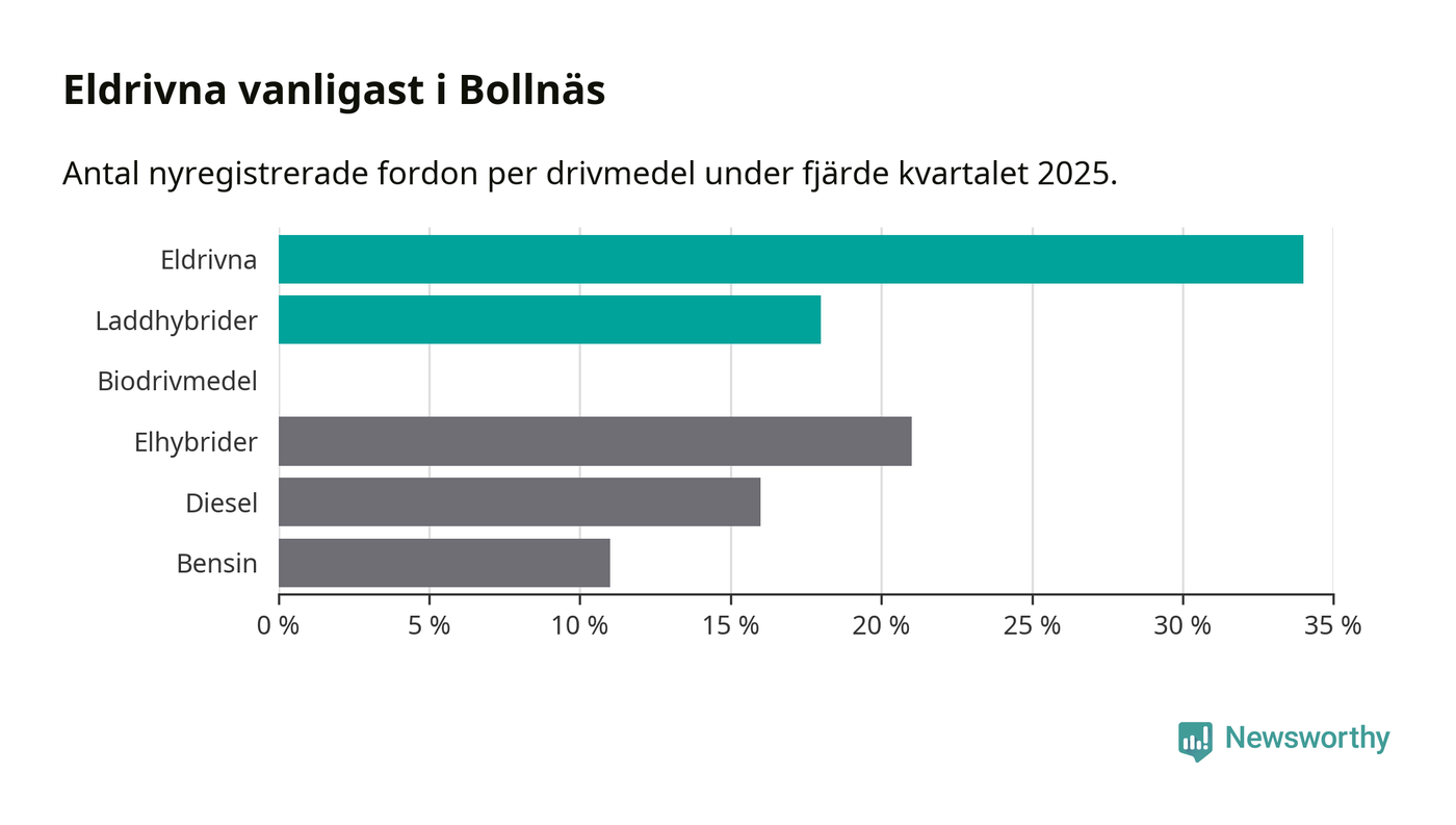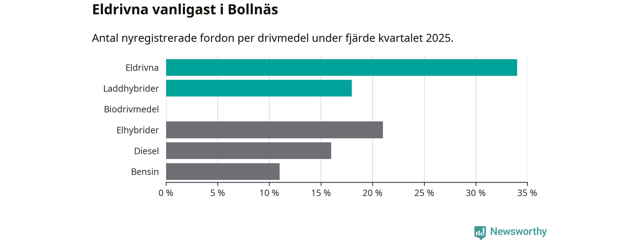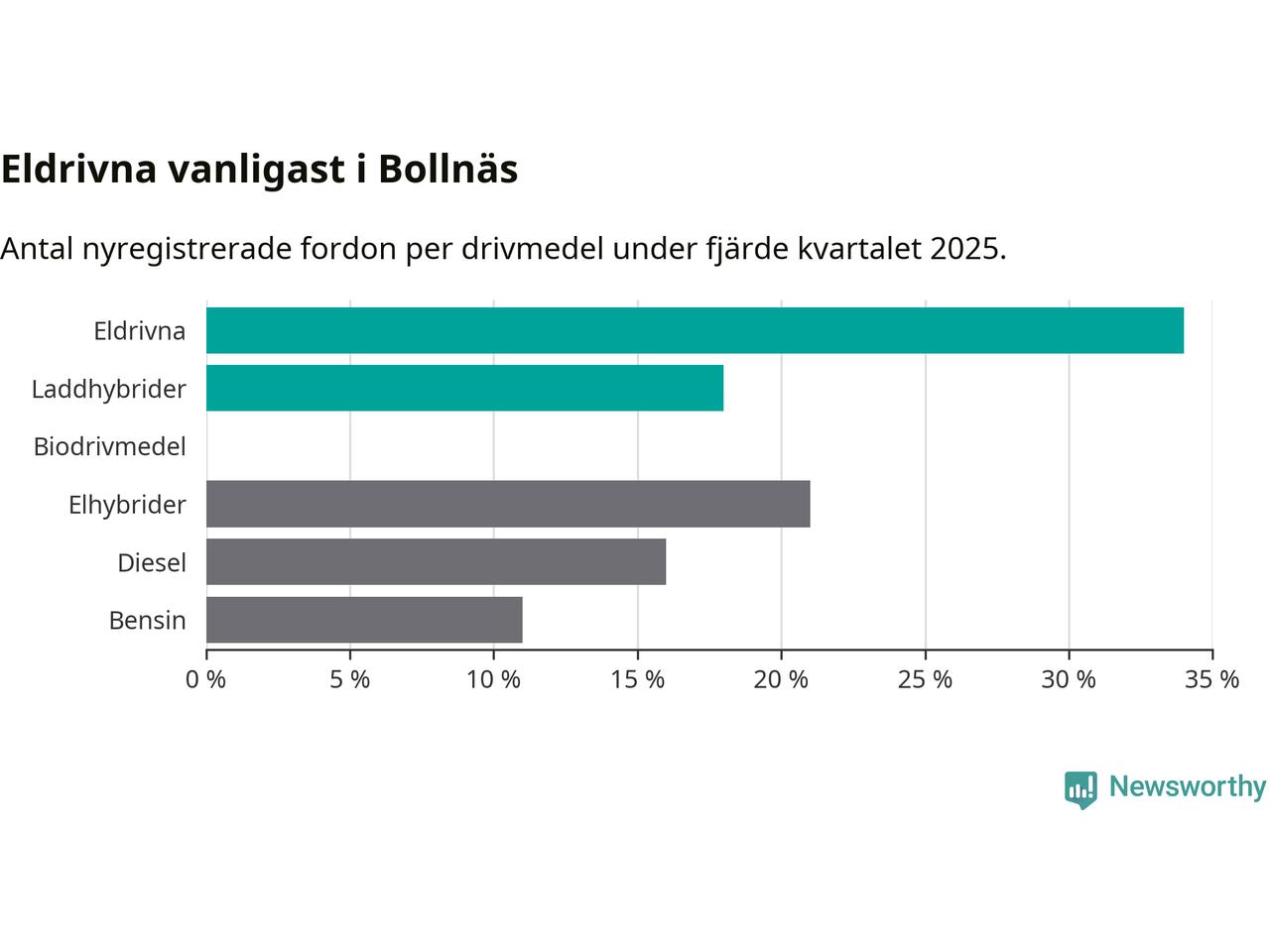 Under fjärde kvartalet 2025 var 52 procent av alla nyregistrerade personbilar i Bollnäs laddbara (sammanlagt registrerades 100 nya bilar). Merparten av de laddbara bilarna var rena elbilar (34 procent av alla).