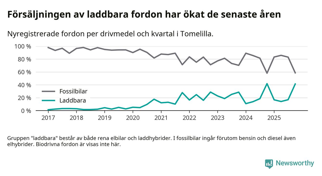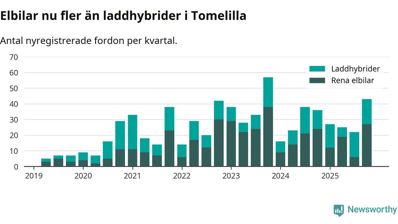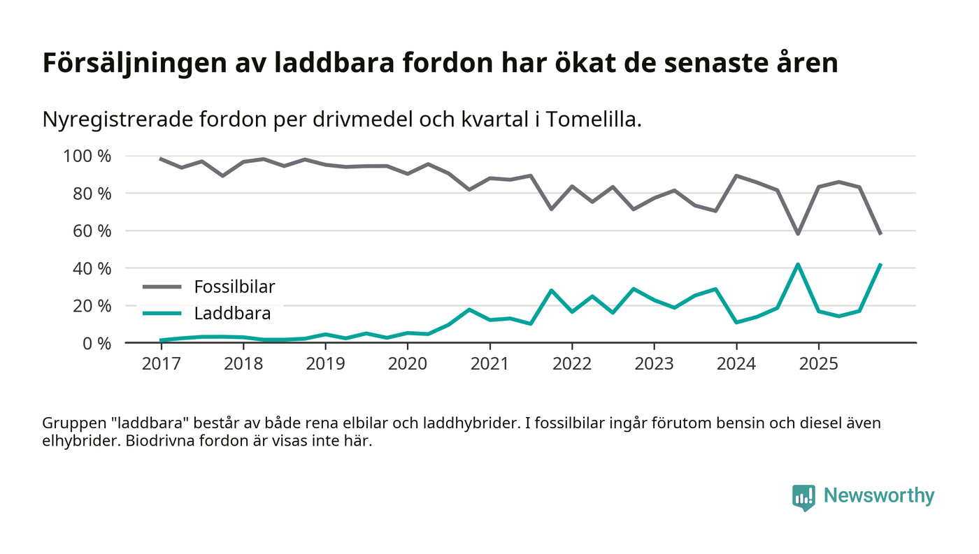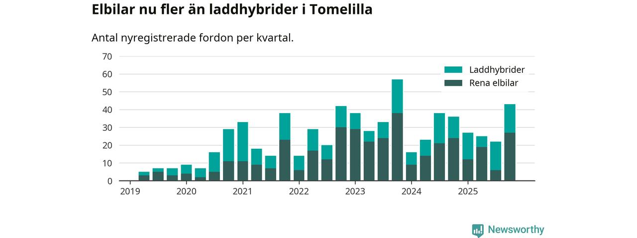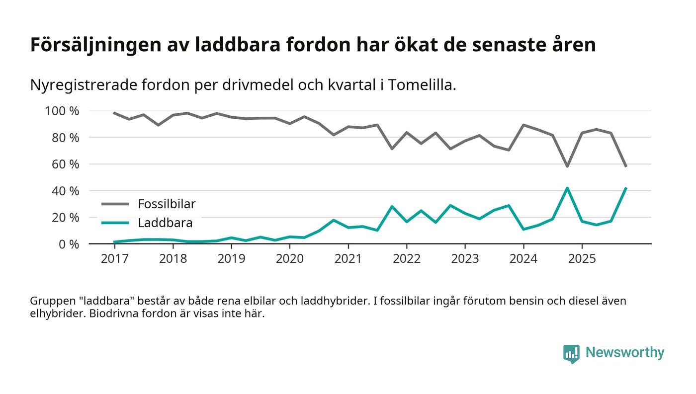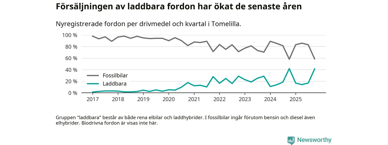 Under fjärde kvartalet 2025 var 41 procent av alla nyregistrerade personbilar i Tomelilla laddbara (sammanlagt registrerades 104 nya bilar). Merparten av de laddbara bilarna var rena elbilar (26 procent av alla).