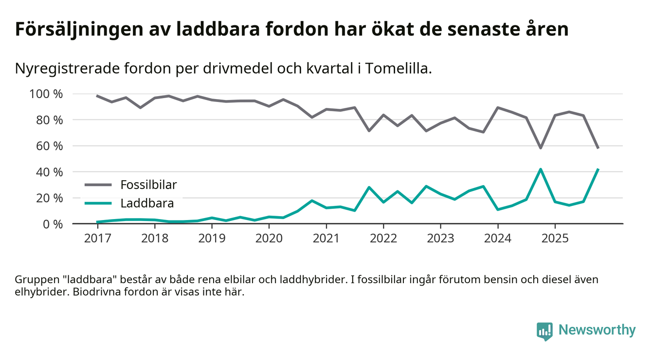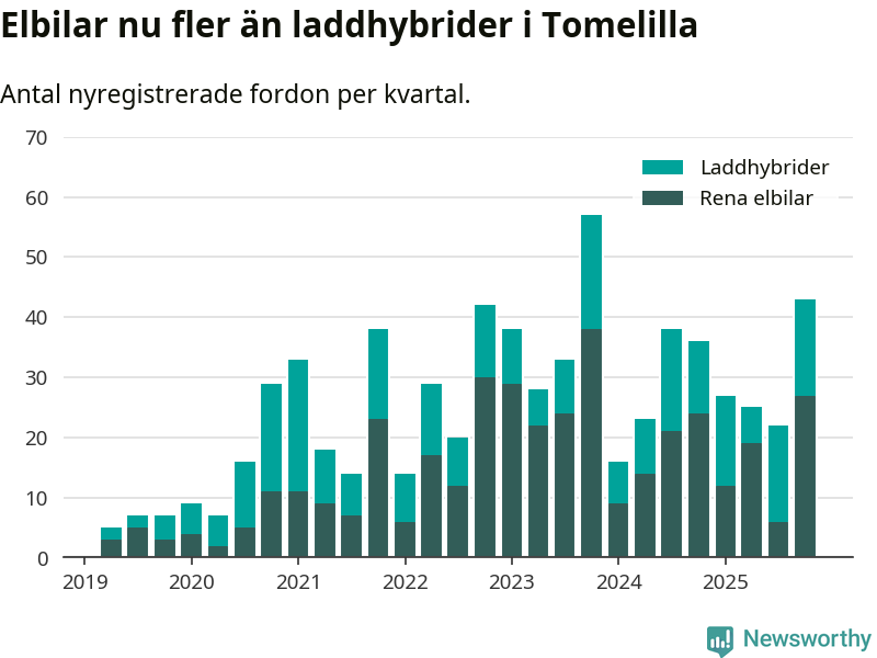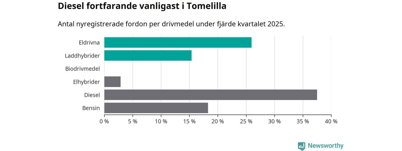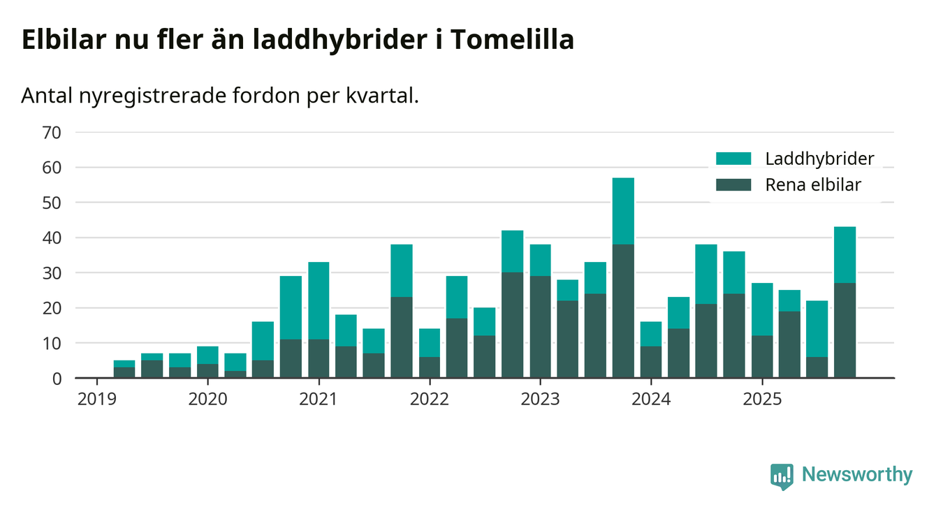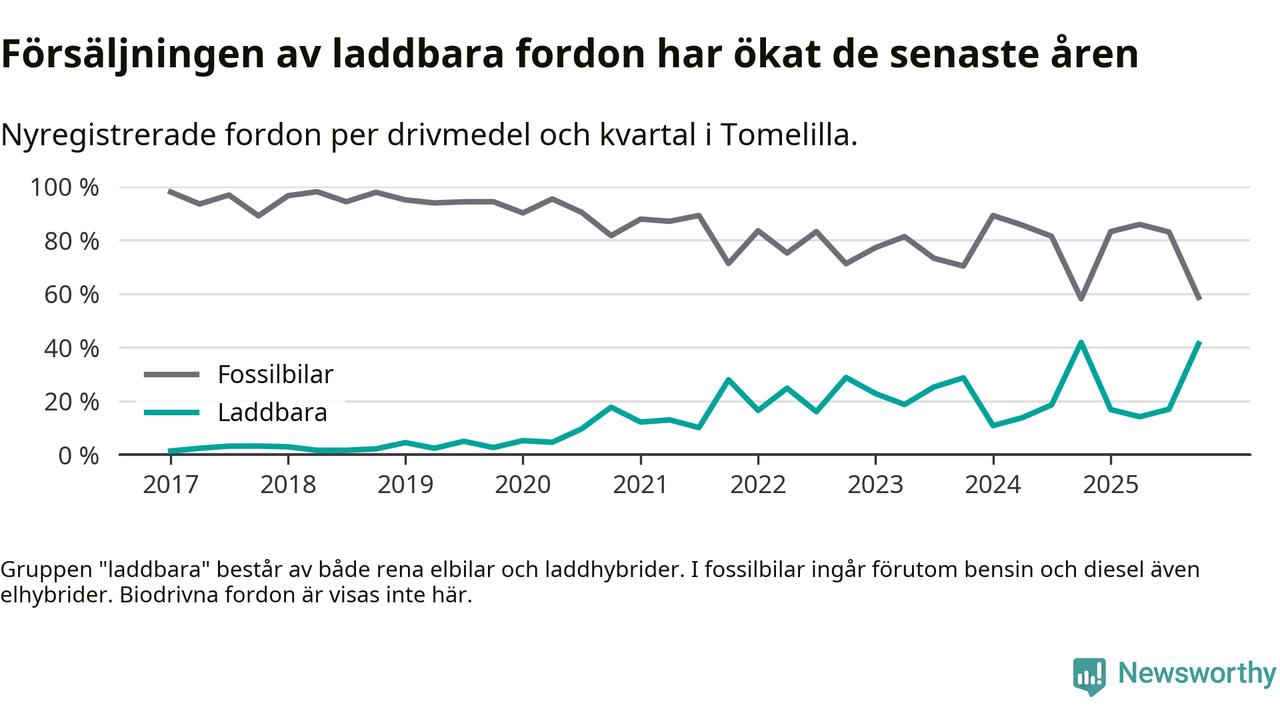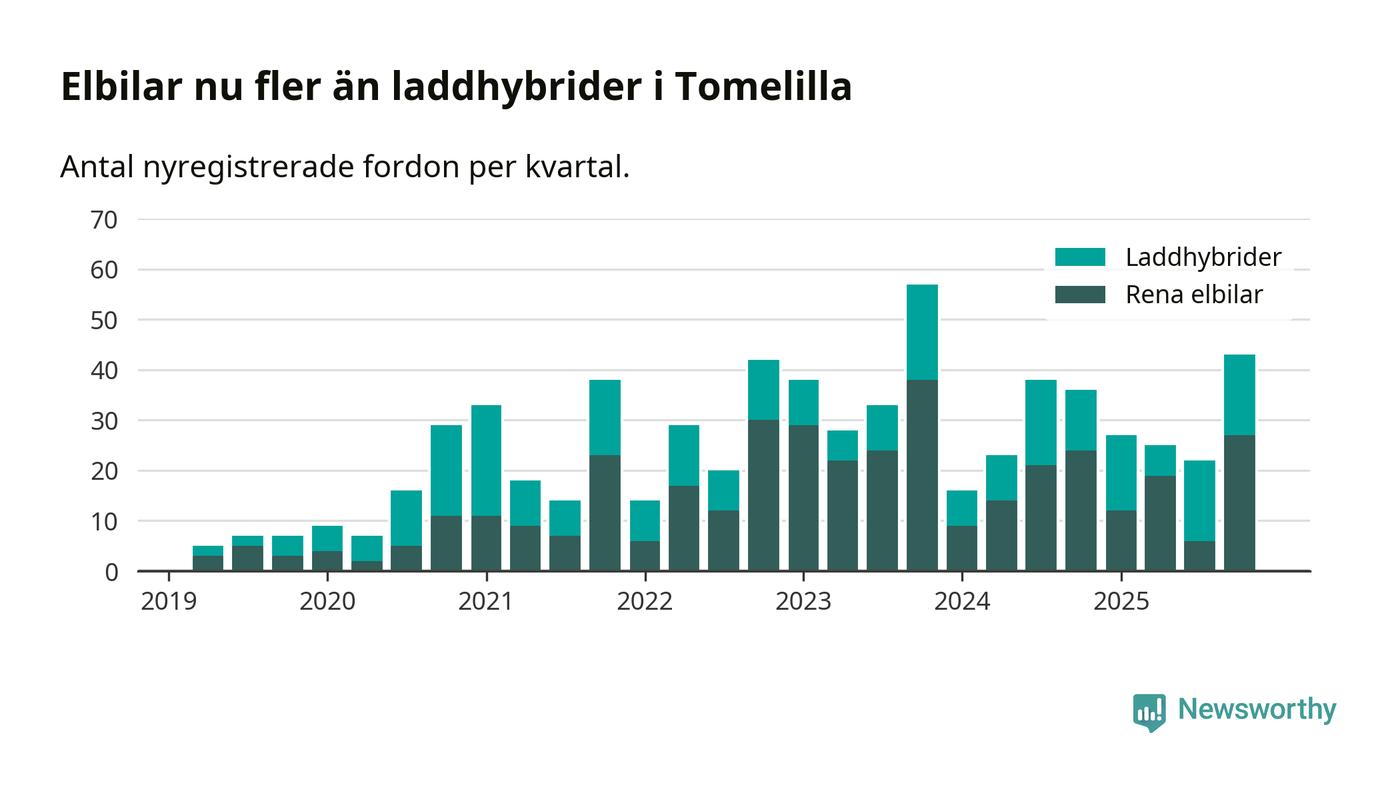 Under fjärde kvartalet 2025 var 41 procent av alla nyregistrerade personbilar i Tomelilla laddbara (sammanlagt registrerades 104 nya bilar). Merparten av de laddbara bilarna var rena elbilar (26 procent av alla).