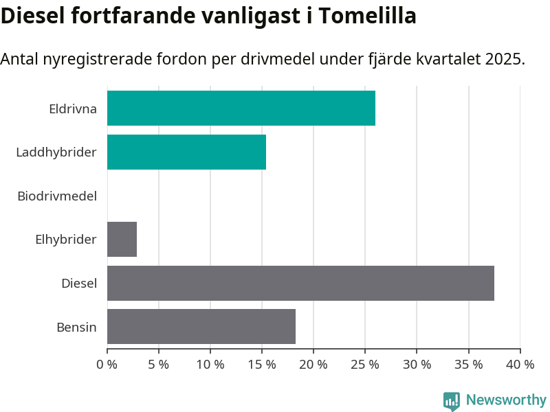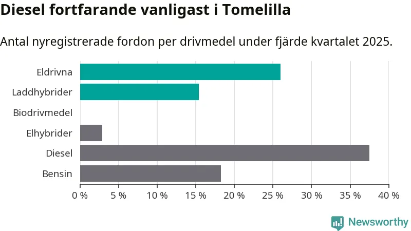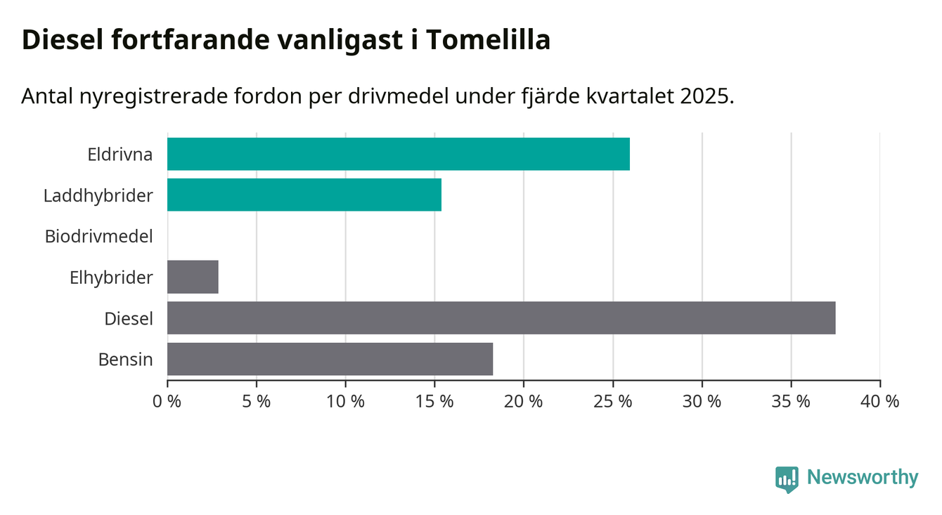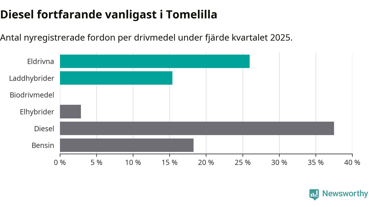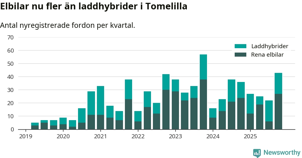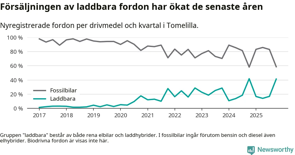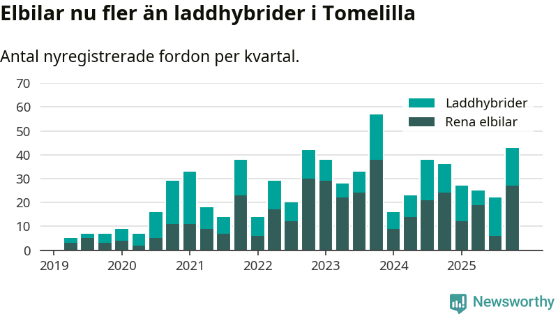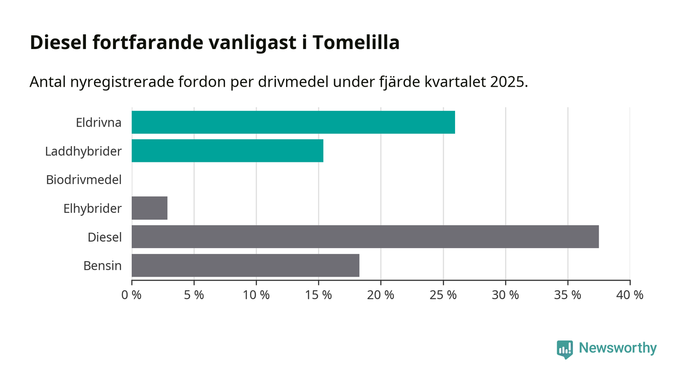 Under fjärde kvartalet 2025 var 41 procent av alla nyregistrerade personbilar i Tomelilla laddbara (sammanlagt registrerades 104 nya bilar). Merparten av de laddbara bilarna var rena elbilar (26 procent av alla).