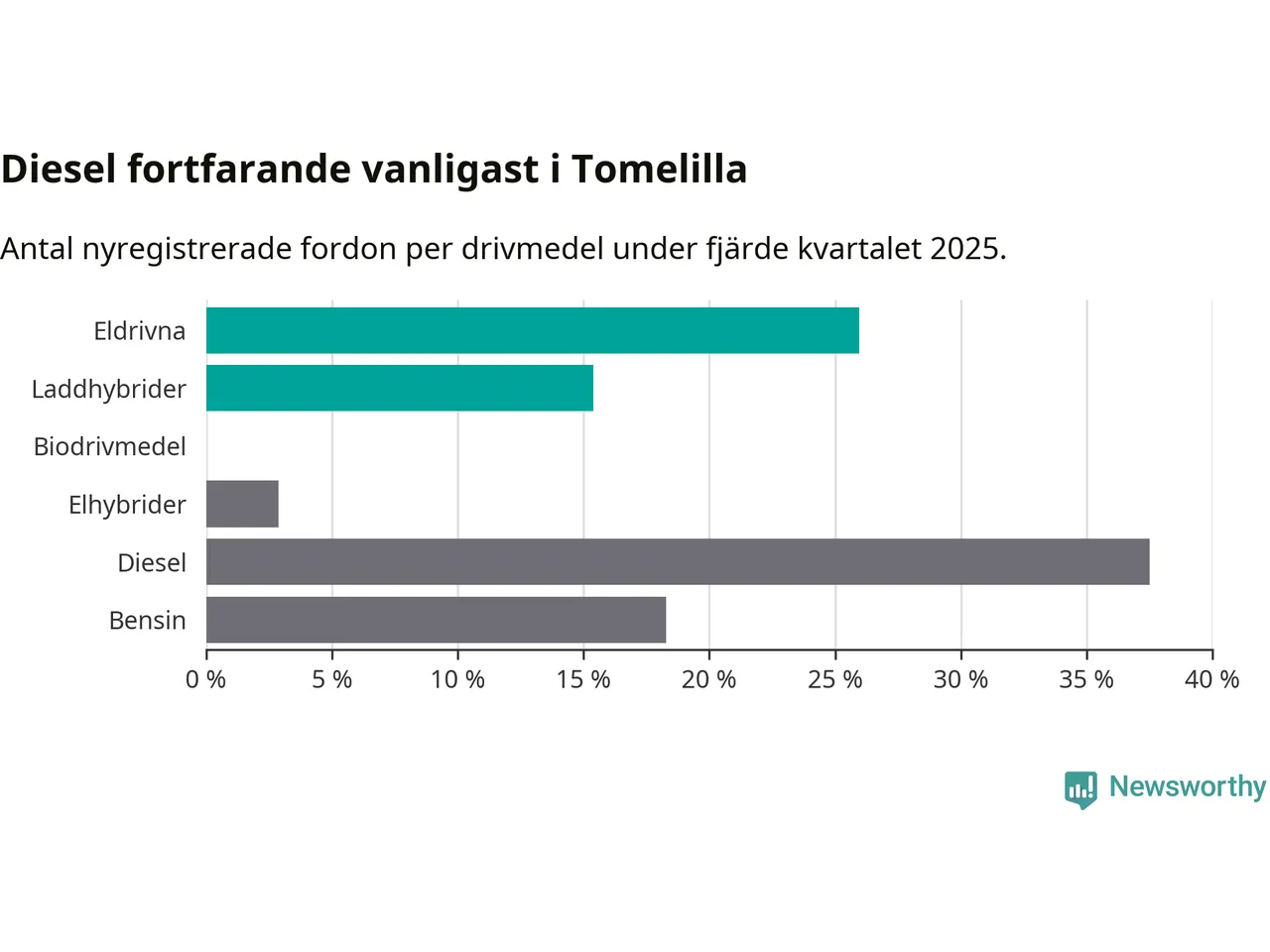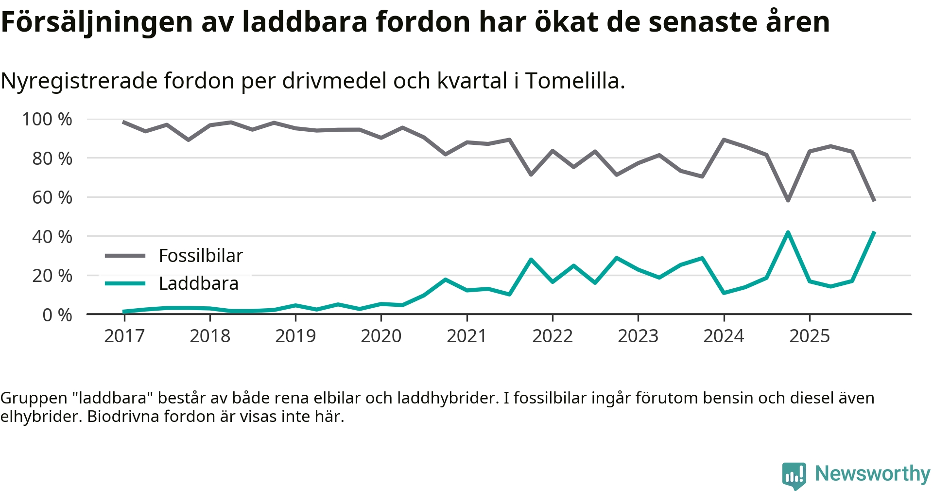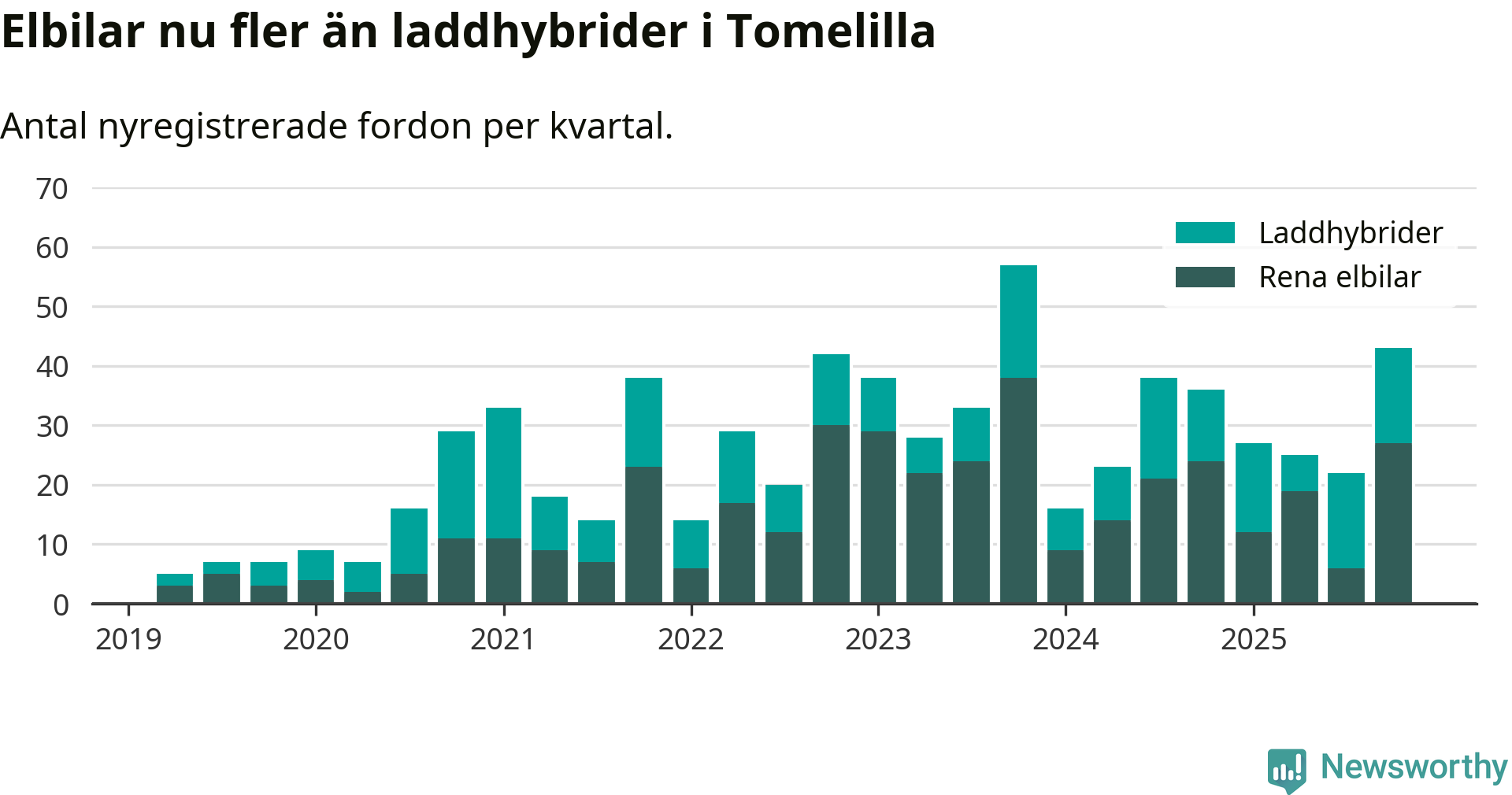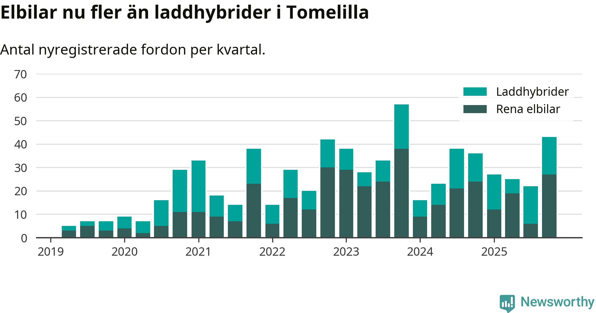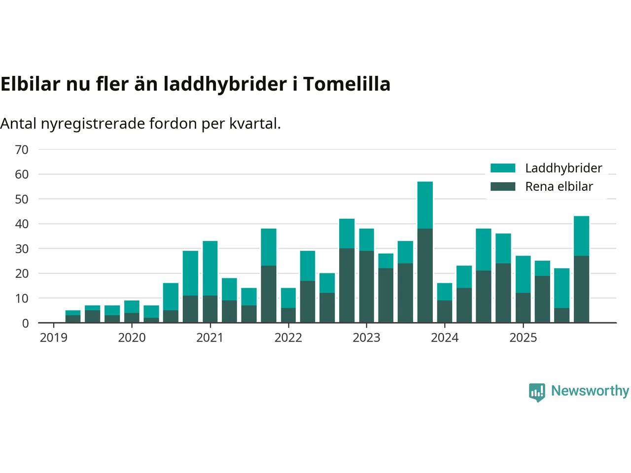 Under fjärde kvartalet 2025 var 41 procent av alla nyregistrerade personbilar i Tomelilla laddbara (sammanlagt registrerades 104 nya bilar). Merparten av de laddbara bilarna var rena elbilar (26 procent av alla).